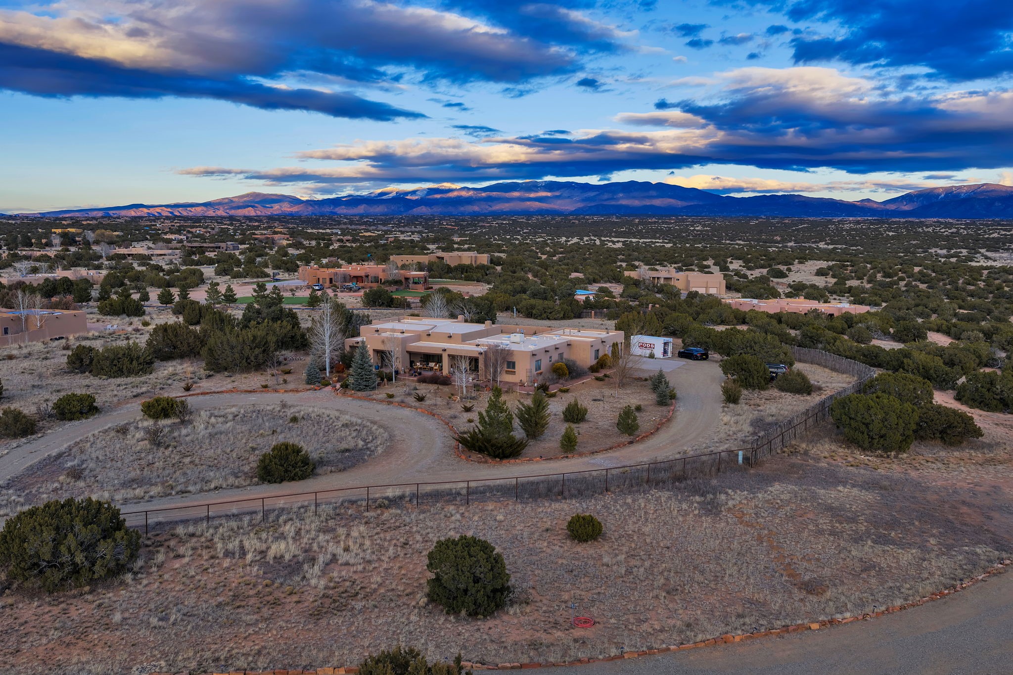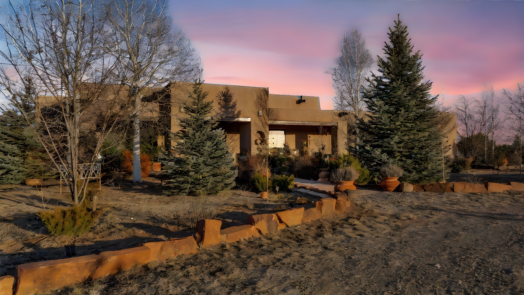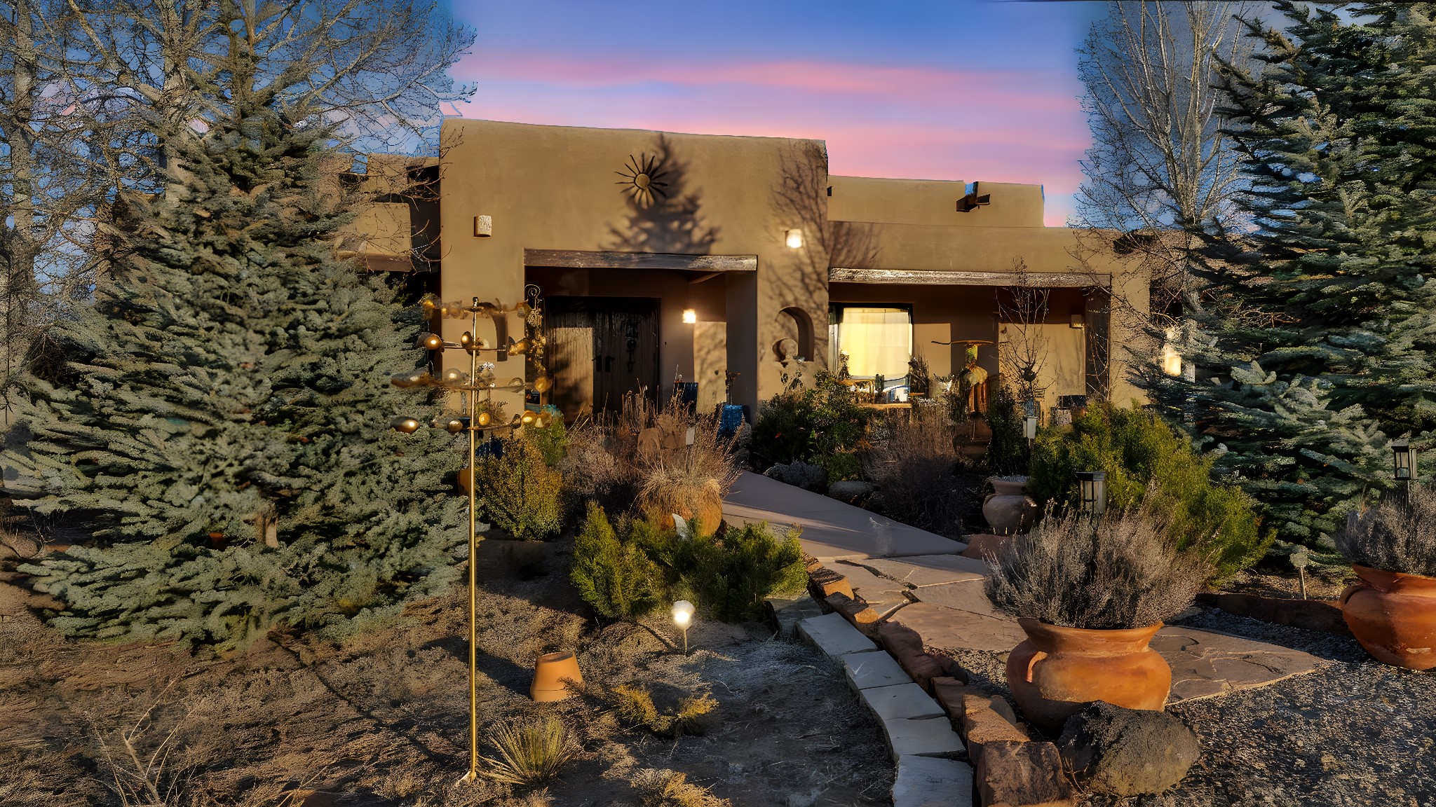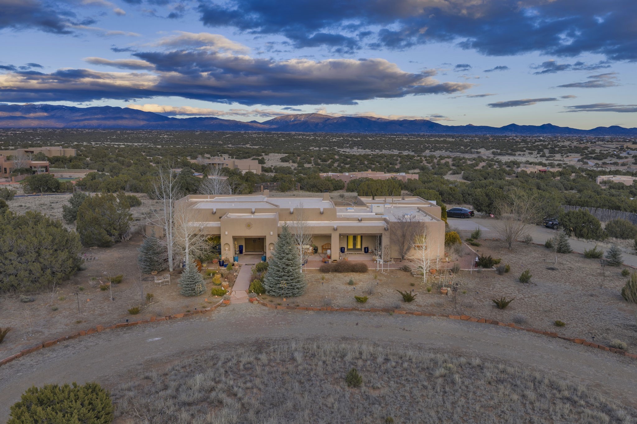 Experience the magic of Santa Fe in this stunning 3,000+ sq. ft. custom-built home featuring 4 bedrooms and 2.5 baths on 2.5 private acres -- with space and potential to add a casita.Designed with timeless Southwestern character, this home showcases diamond plaster walls, exposed viga cedar wood ceilings, beautiful skylights, rich African hardwood flooring, and two wood-burning kiva fireplaces. The open-concept floor plan flows effortlessly into a beautifully upgraded kitchen with granite countertops, custom cabinetry, and newer appliances -- perfect for entertaining.Enjoy radiant floor heating throughout the home and insulated garage. Beautiful Pella windows that frame incredible mountain, sunset, and city views, filling the home with natural light.Outdoor living shines with covered front and back portals, a walled and landscaped backyard, and a serene custom pond with waterfall -- creating a private retreat ideal for relaxing or hosting guests. The spacious primary suite opens directly to a portal and features a large walk-in closet and spa-like feel.Additional highlights include a 2023 TPO roof with transferable warranty and proximity to Marty Sanchez Golf Course.Privacy, charm, breathtaking views, and true Santa Fe style -- this is the luxury retreat buyers have been waiting for.