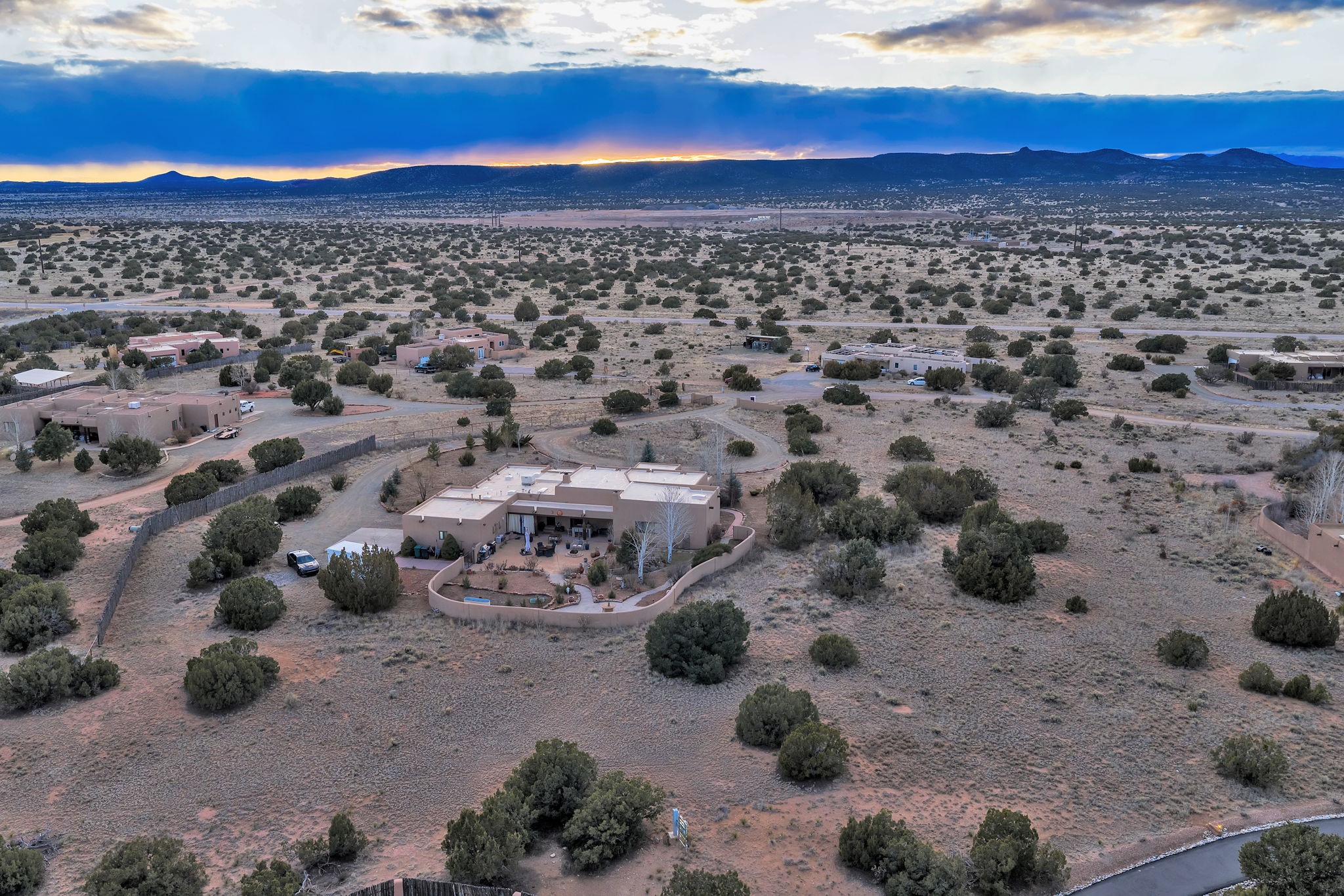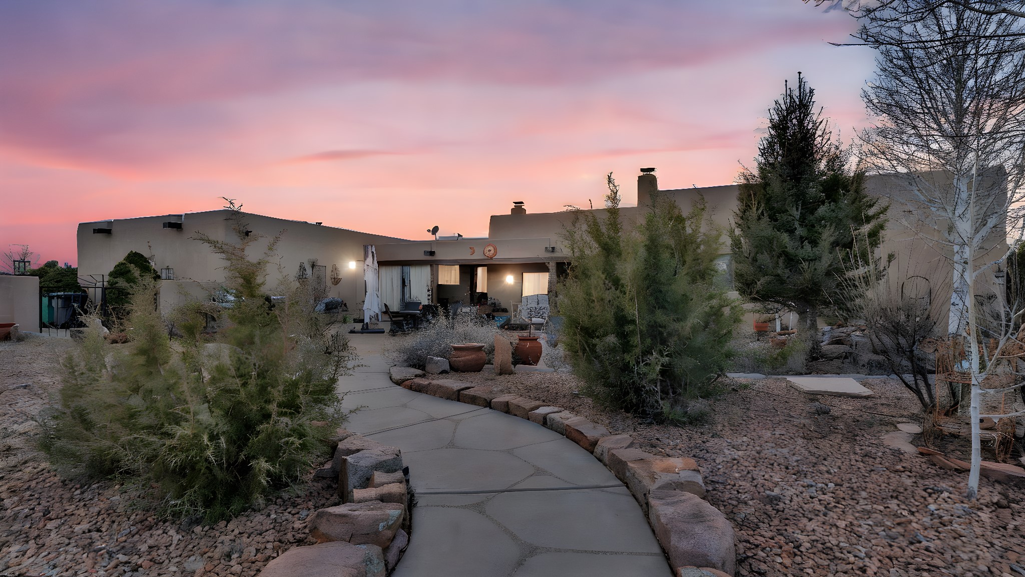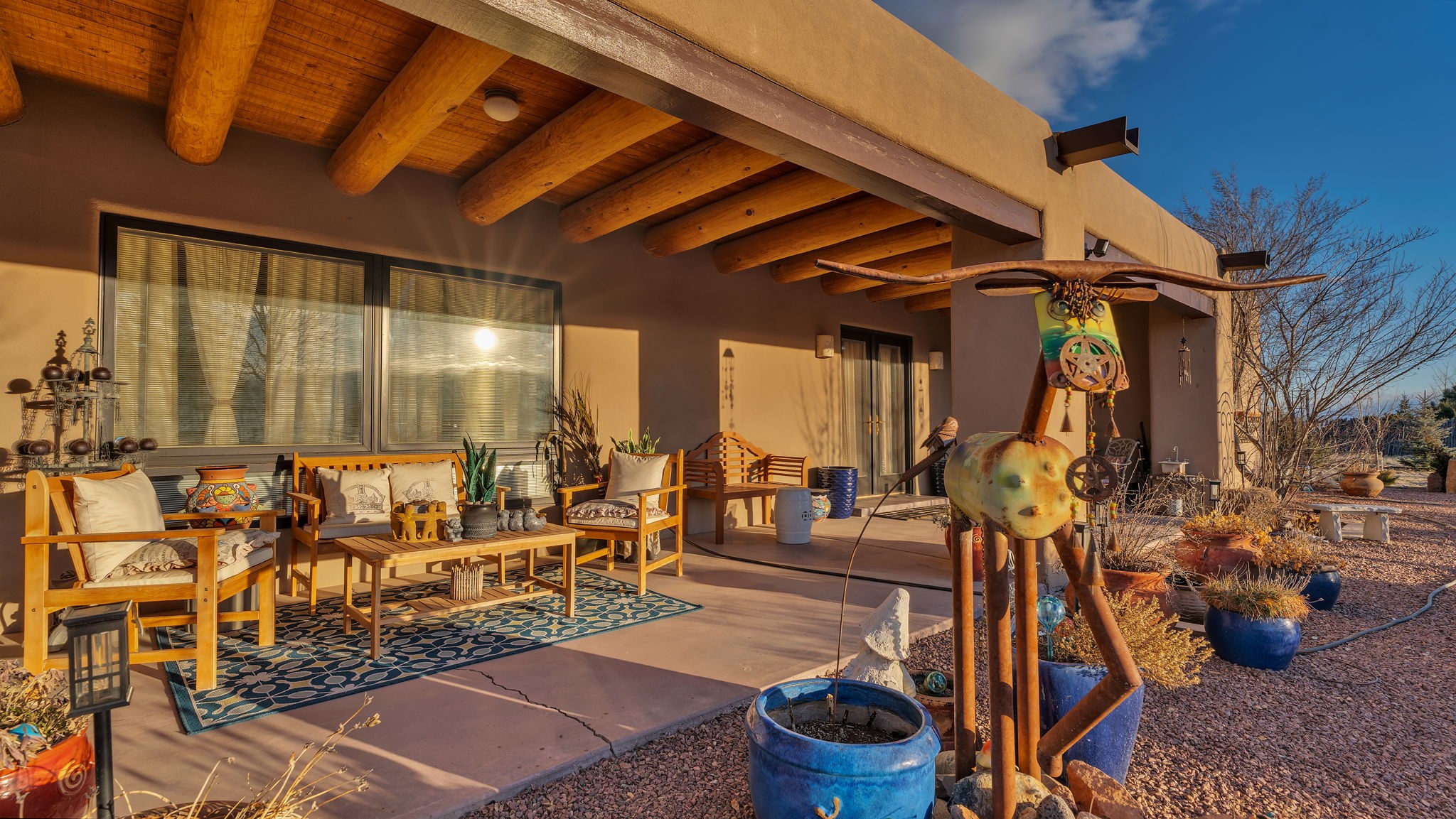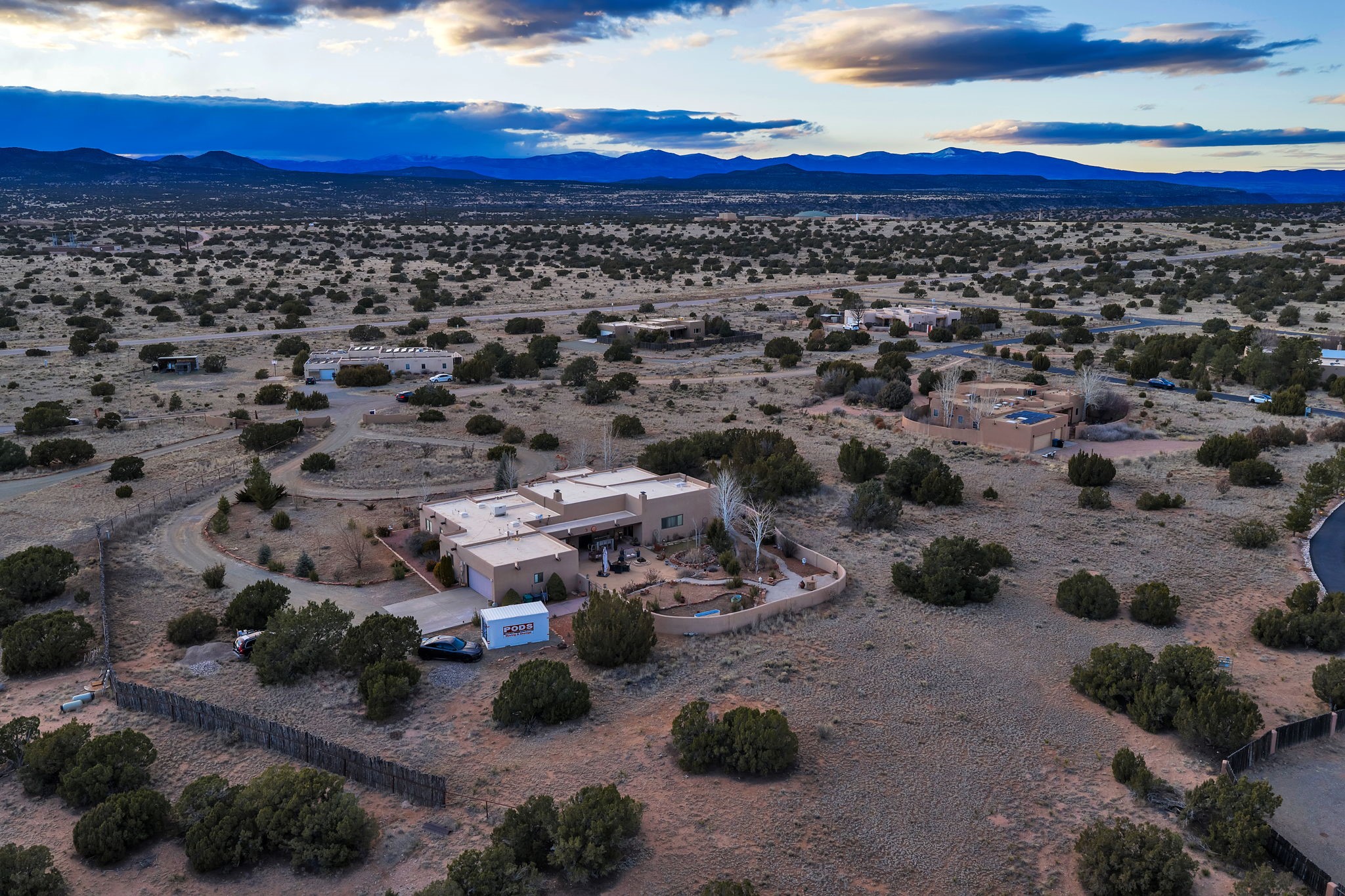 Experience the magic of Santa Fe in this stunning 3,000+ sq. ft. custom-built home featuring 4 bedrooms and 2.5 baths on 2.5 private acres -- with space and potential to add a casita.Designed with timeless Southwestern character, this home showcases diamond plaster walls, exposed viga cedar wood ceilings, beautiful skylights, rich African hardwood flooring, and two wood-burning kiva fireplaces. The open-concept floor plan flows effortlessly into a beautifully upgraded kitchen with granite countertops, custom cabinetry, and newer appliances -- perfect for entertaining.Enjoy radiant floor heating throughout the home and insulated garage. Beautiful Pella windows that frame incredible mountain, sunset, and city views, filling the home with natural light.Outdoor living shines with covered front and back portals, a walled and landscaped backyard, and a serene custom pond with waterfall -- creating a private retreat ideal for relaxing or hosting guests. The spacious primary suite opens directly to a portal and features a large walk-in closet and spa-like feel.Additional highlights include a 2023 TPO roof with transferable warranty and proximity to Marty Sanchez Golf Course.Privacy, charm, breathtaking views, and true Santa Fe style -- this is the luxury retreat buyers have been waiting for.