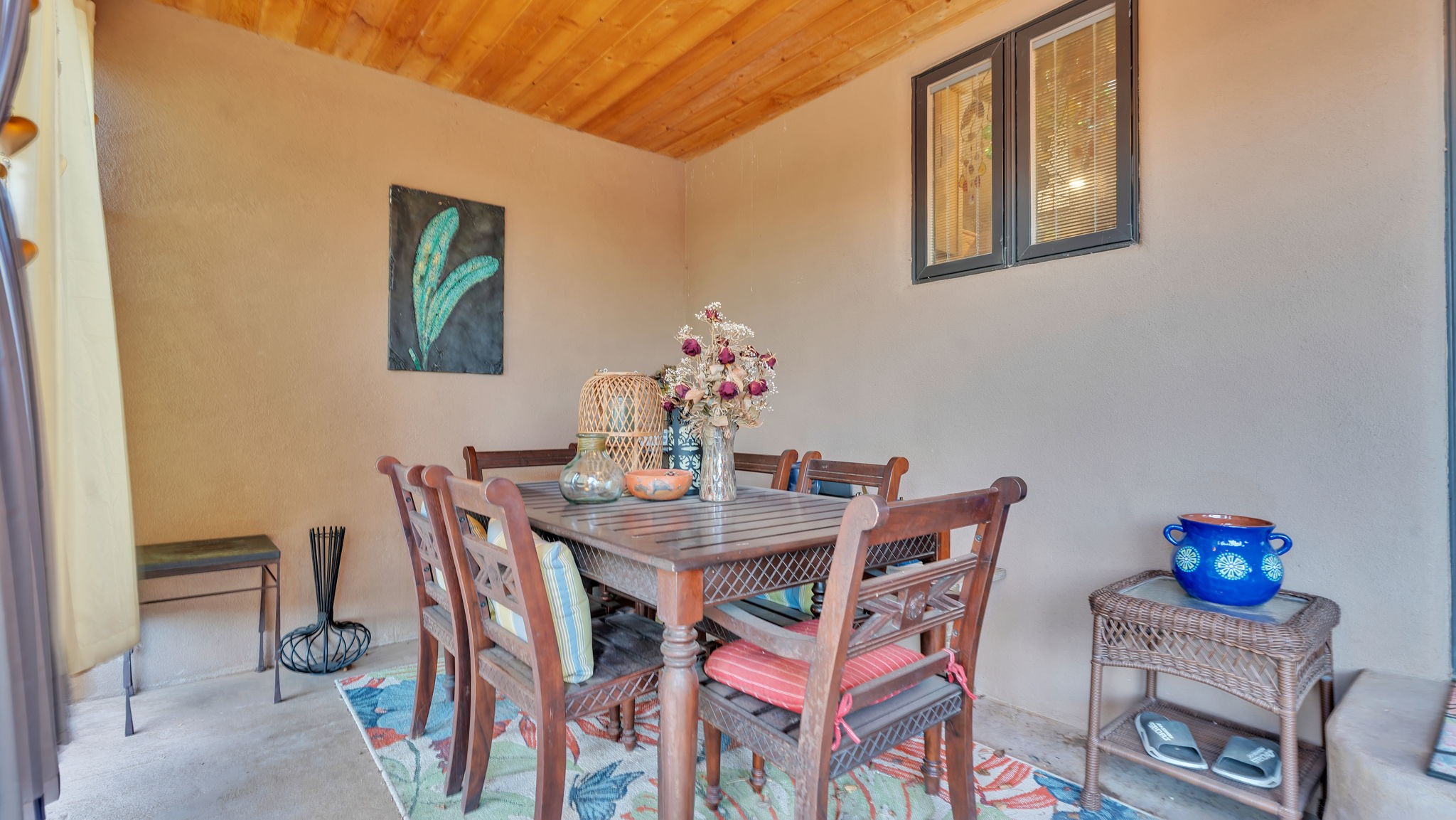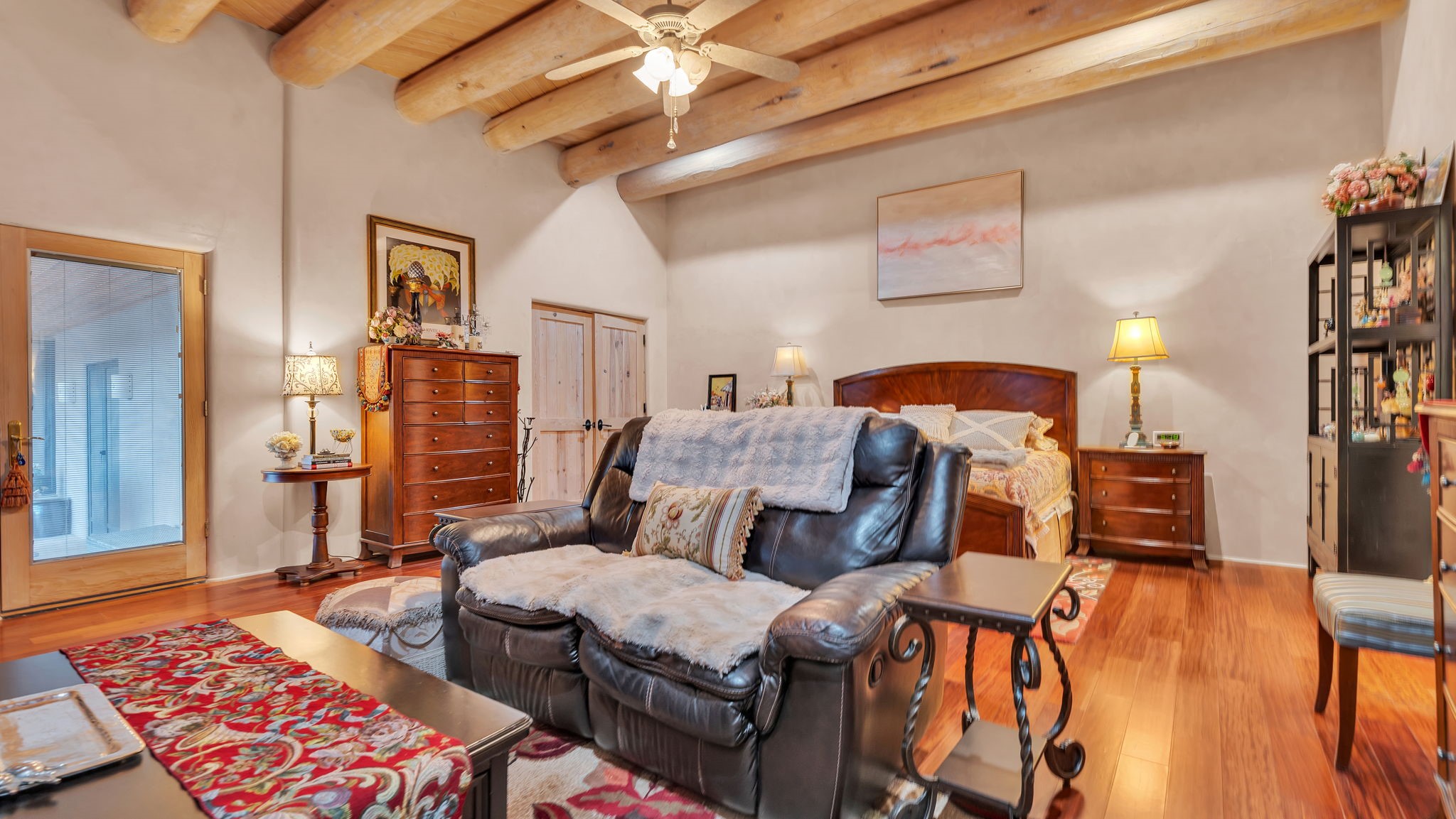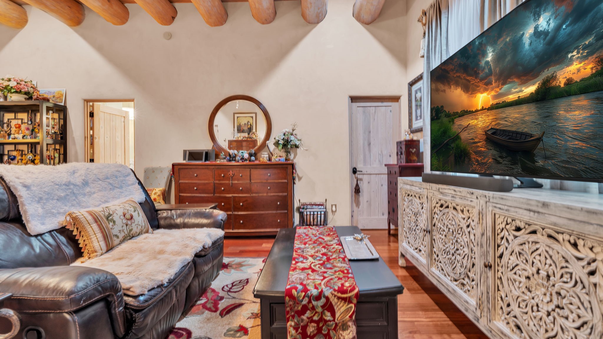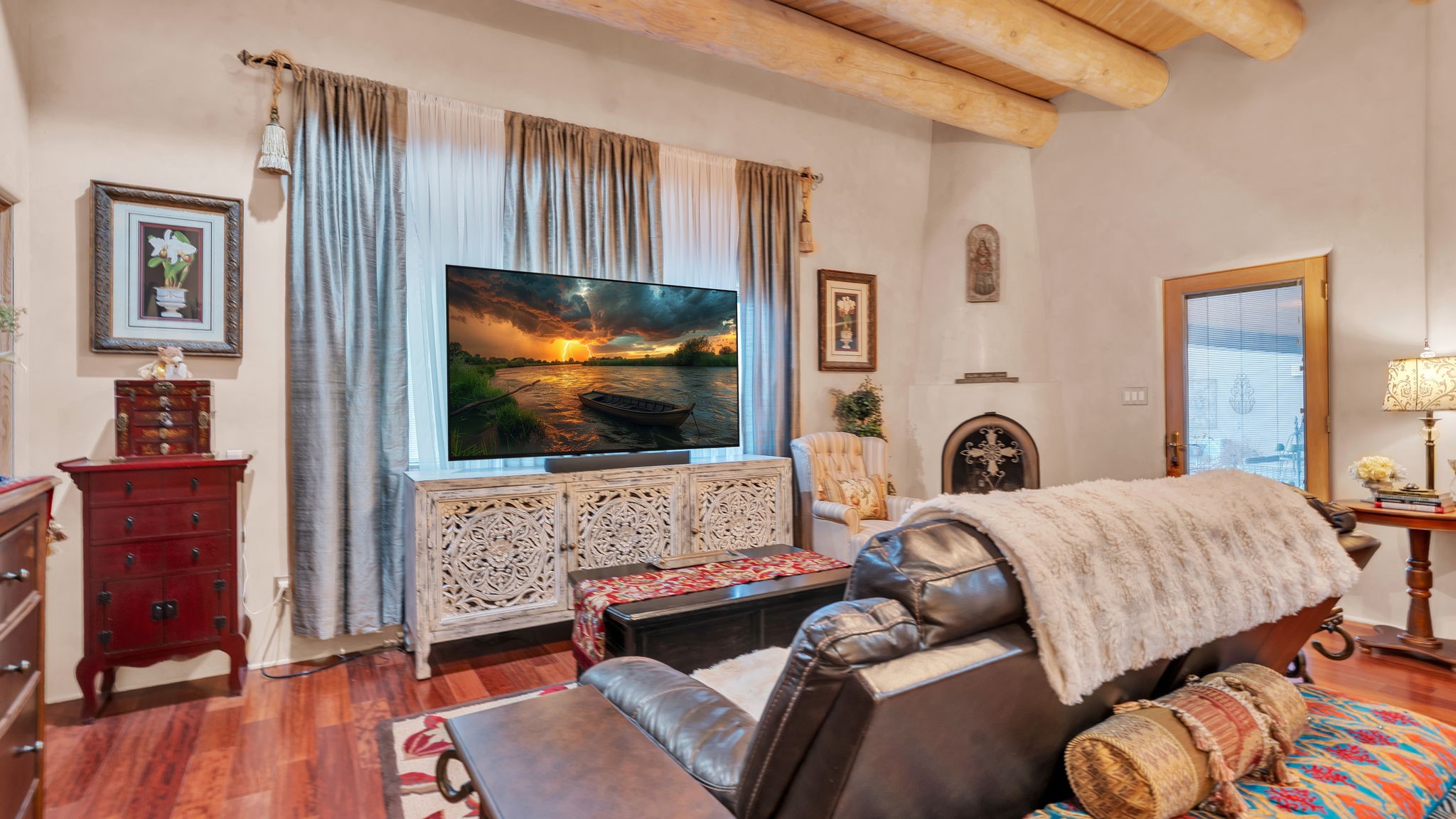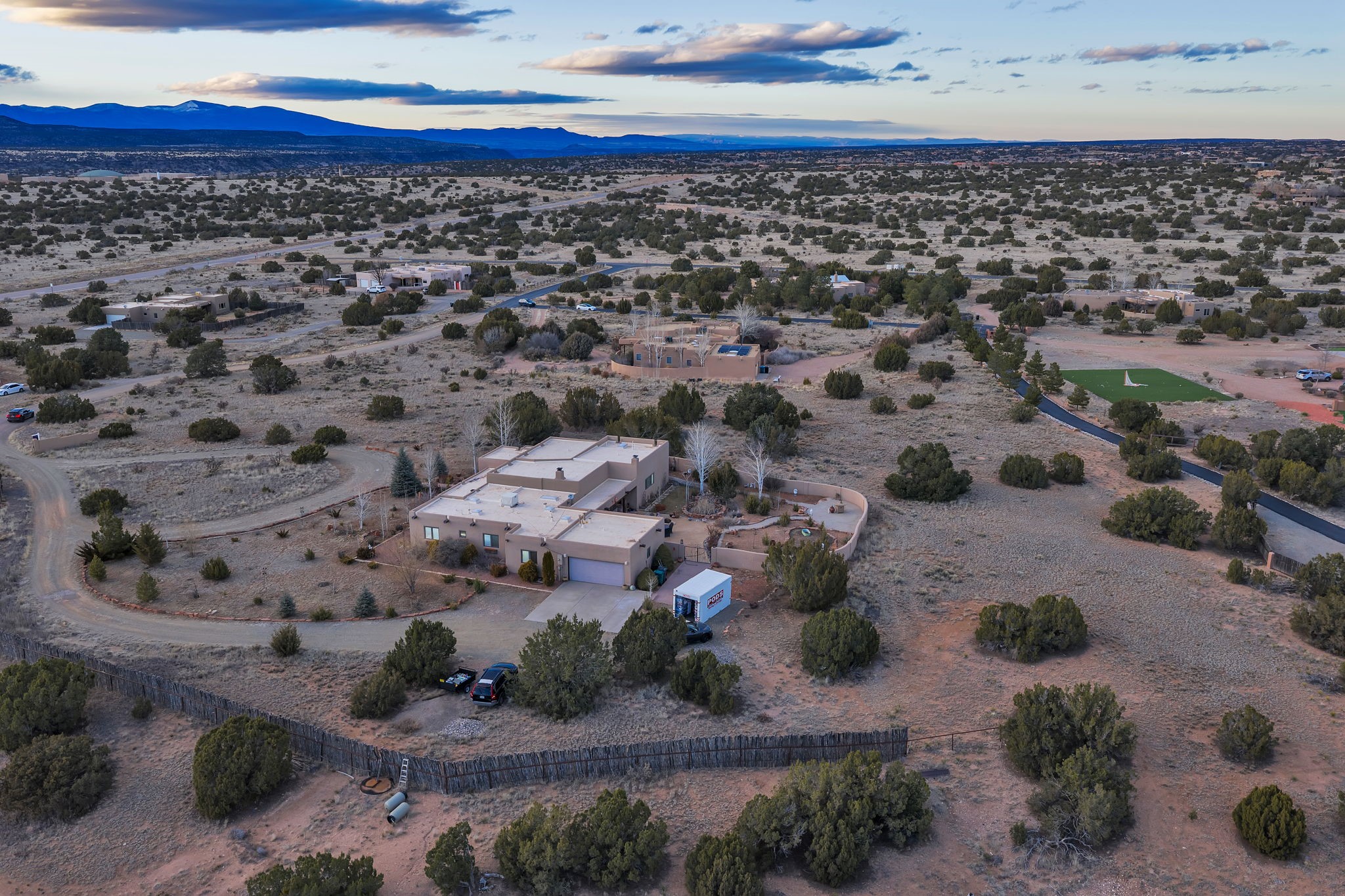 Experience the magic of Santa Fe in this stunning 3,000+ sq. ft. custom-built home featuring 4 bedrooms and 2.5 baths on 2.5 private acres -- with space and potential to add a casita.Designed with timeless Southwestern character, this home showcases diamond plaster walls, exposed viga cedar wood ceilings, beautiful skylights, rich African hardwood flooring, and two wood-burning kiva fireplaces. The open-concept floor plan flows effortlessly into a beautifully upgraded kitchen with granite countertops, custom cabinetry, and newer appliances -- perfect for entertaining.Enjoy radiant floor heating throughout the home and insulated garage. Beautiful Pella windows that frame incredible mountain, sunset, and city views, filling the home with natural light.Outdoor living shines with covered front and back portals, a walled and landscaped backyard, and a serene custom pond with waterfall -- creating a private retreat ideal for relaxing or hosting guests. The spacious primary suite opens directly to a portal and features a large walk-in closet and spa-like feel.Additional highlights include a 2023 TPO roof with transferable warranty and proximity to Marty Sanchez Golf Course.Privacy, charm, breathtaking views, and true Santa Fe style -- this is the luxury retreat buyers have been waiting for.