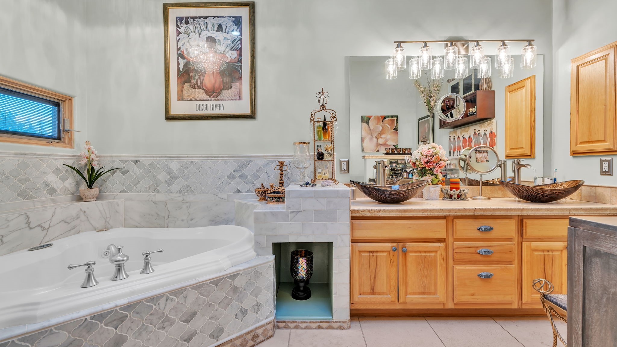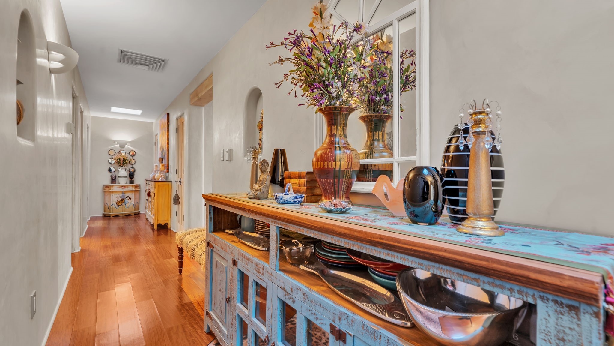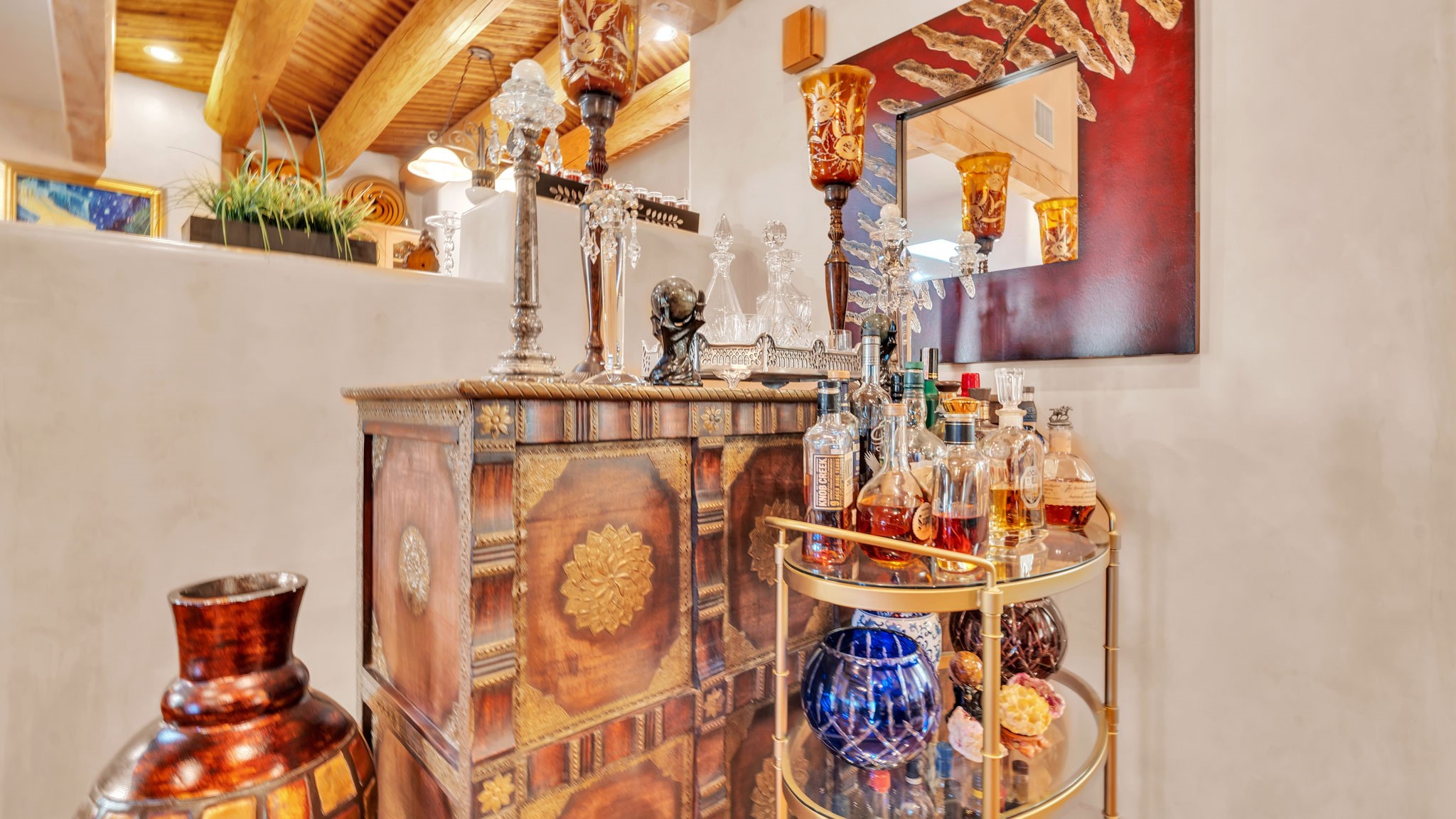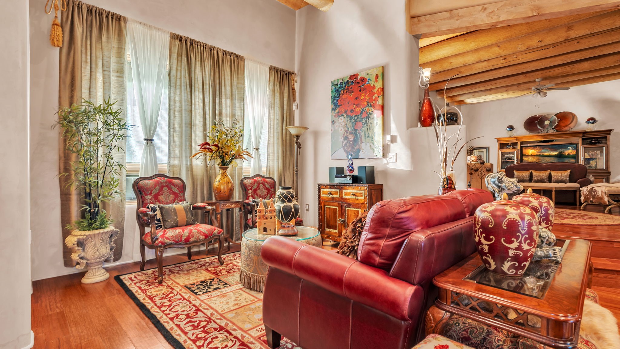Experience the magic of Santa Fe in this stunning 3,000+ sq. ft. custom-built home featuring 4 bedrooms and 2.5 baths on 2.5 private acres -- with space and potential to add a casita.Designed with timeless Southwestern character, this home showcases diamond plaster walls, exposed viga cedar wood ceilings, beautiful skylights, rich African hardwood flooring, and two wood-burning kiva fireplaces. The open-concept floor plan flows effortlessly into a beautifully upgraded kitchen with granite countertops, custom cabinetry, and newer appliances -- perfect for entertaining.Enjoy radiant floor heating throughout the home and insulated garage. Beautiful Pella windows that frame incredible mountain, sunset, and city views, filling the home with natural light.Outdoor living shines with covered front and back portals, a walled and landscaped backyard, and a serene custom pond with waterfall -- creating a private retreat ideal for relaxing or hosting guests. The spacious primary suite opens directly to a portal and features a large walk-in closet and spa-like feel.Additional highlights include a 2023 TPO roof with transferable warranty and proximity to Marty Sanchez Golf Course.Privacy, charm, breathtaking views, and true Santa Fe style -- this is the luxury retreat buyers have been waiting for.