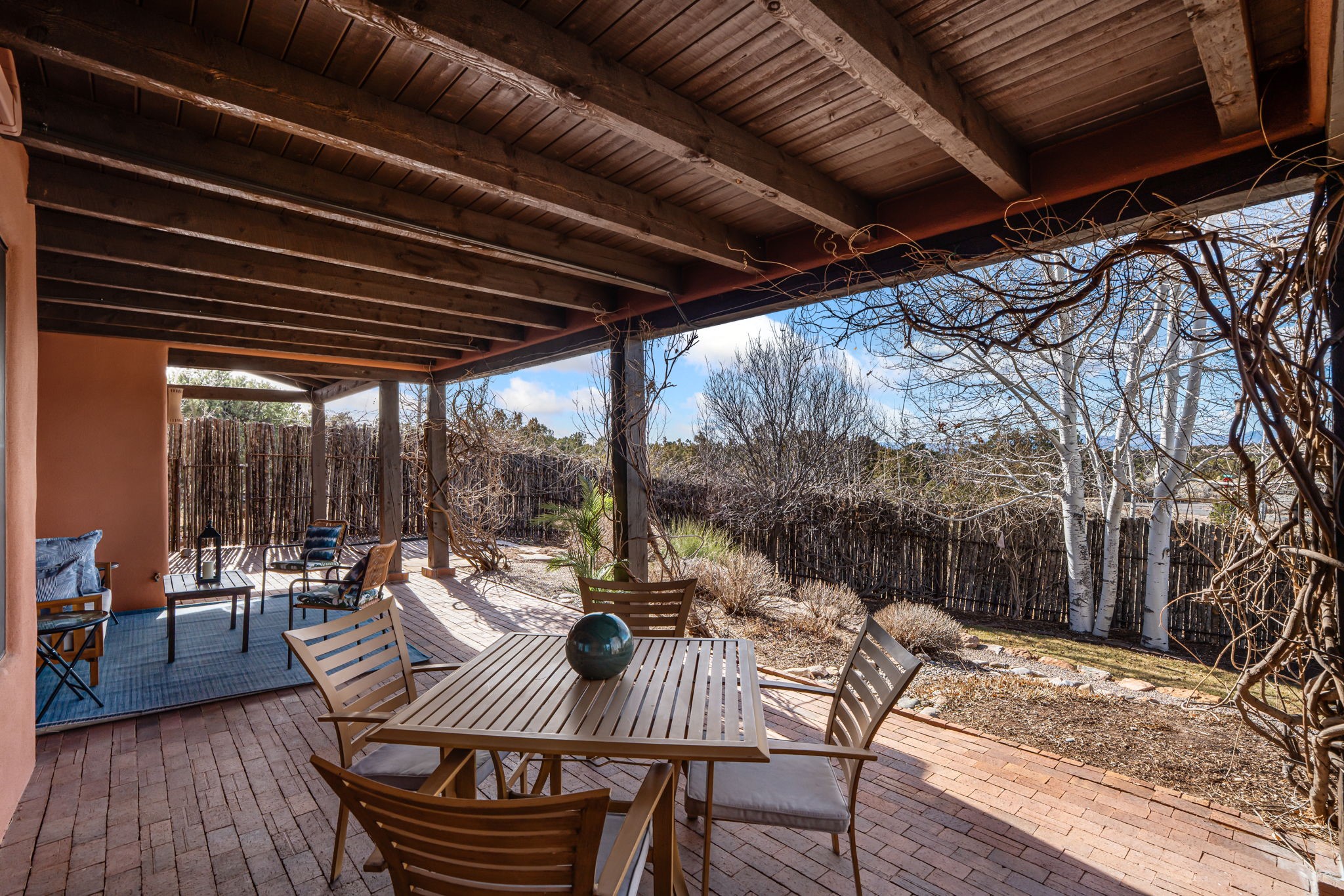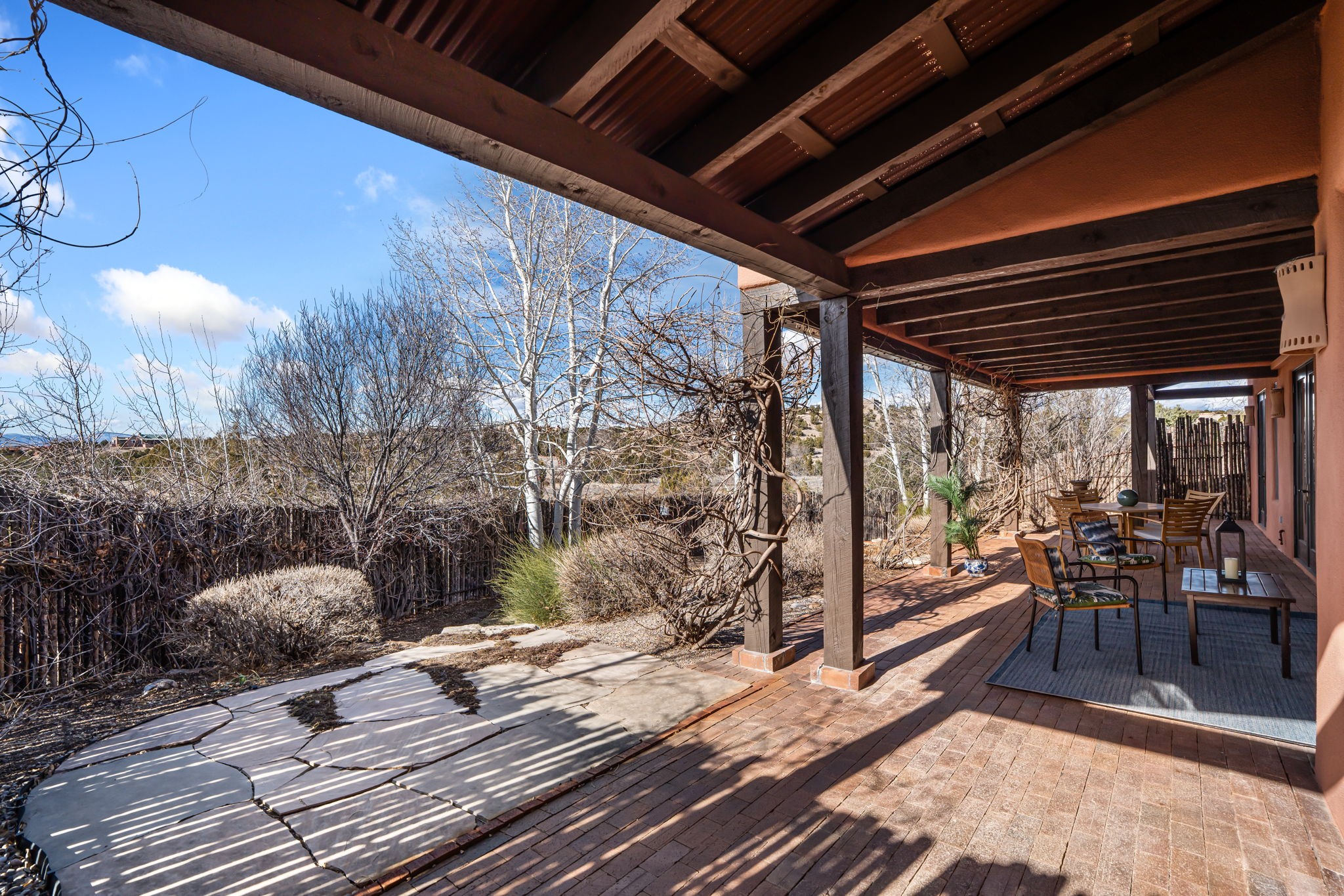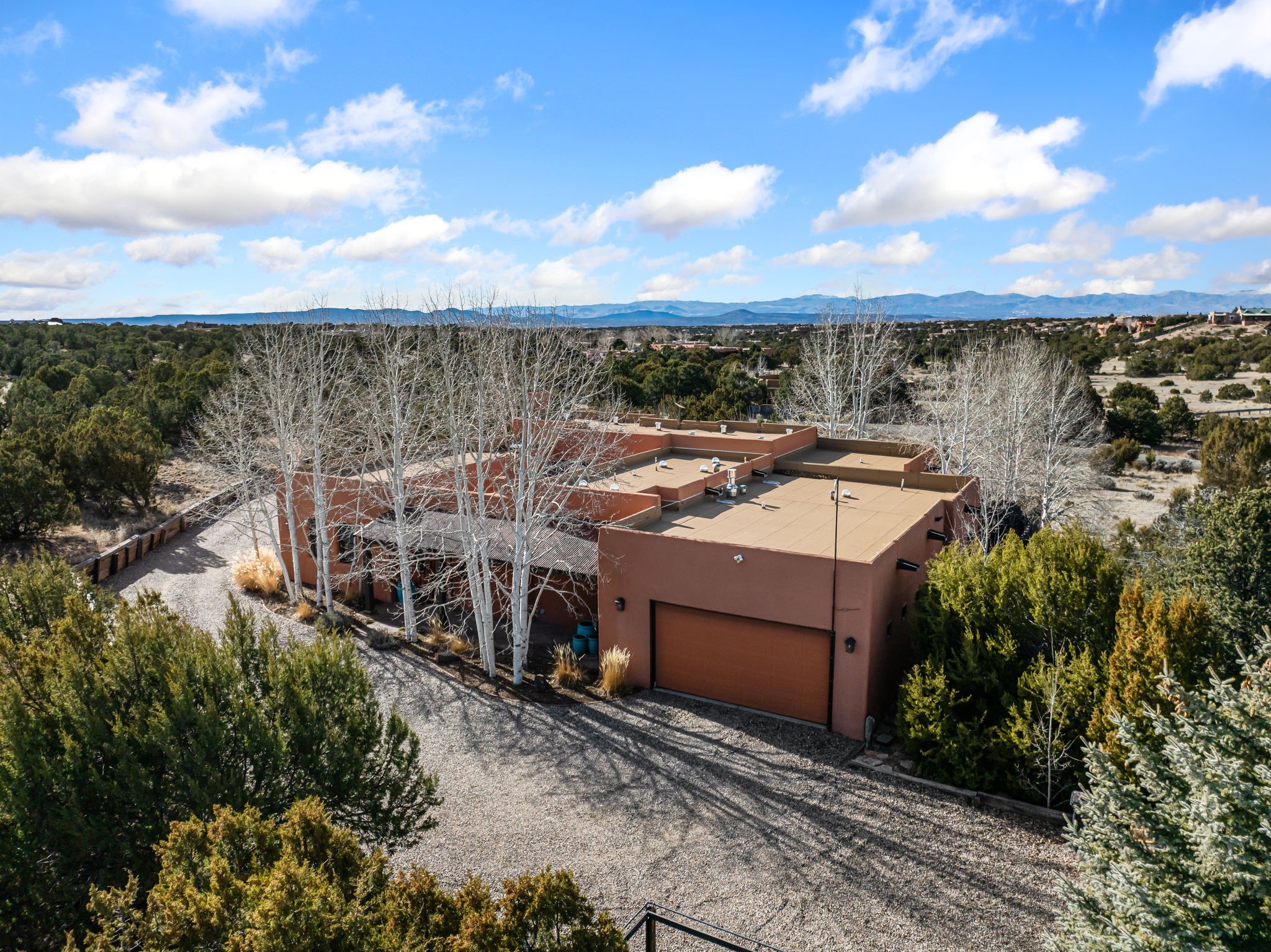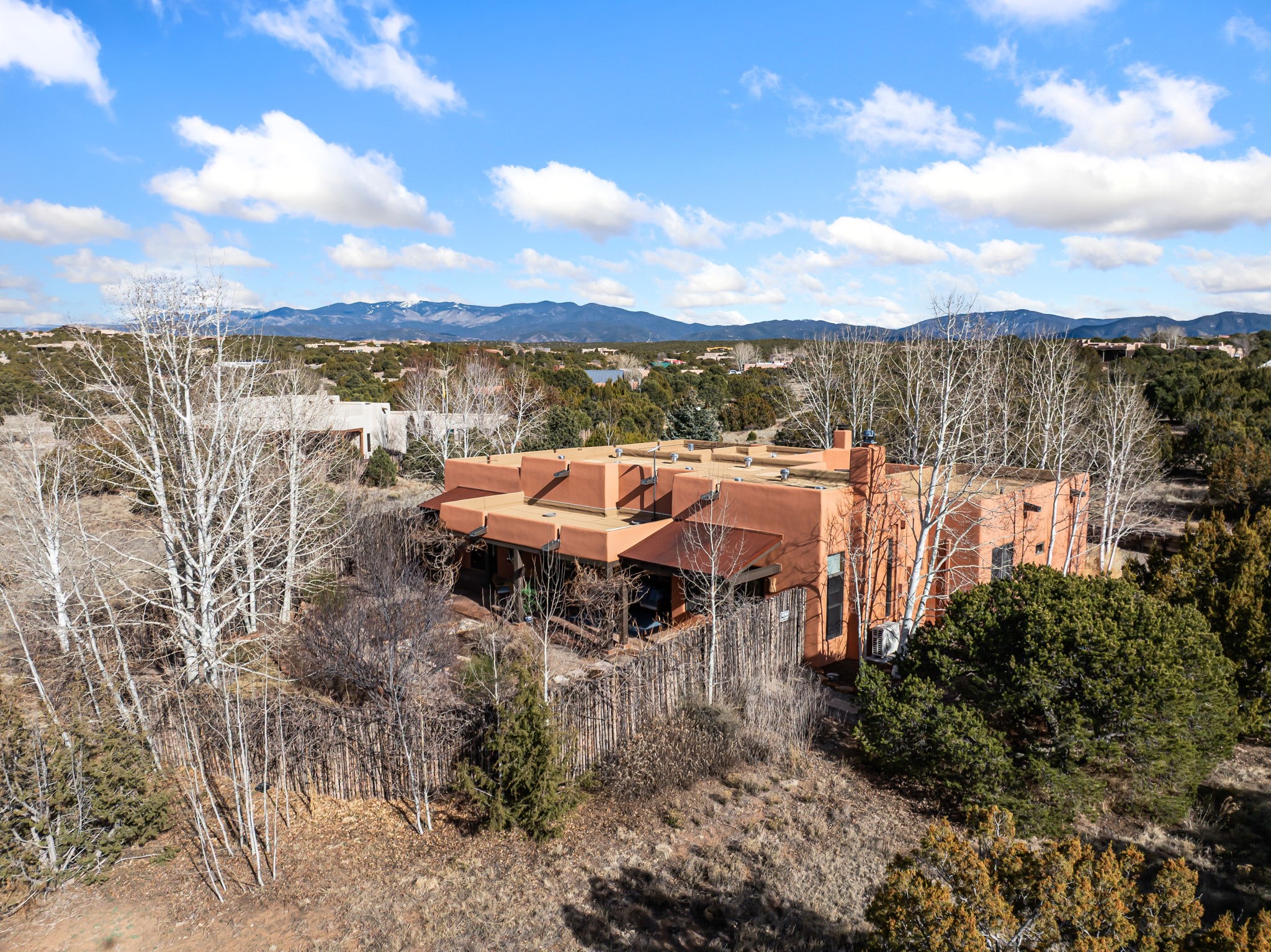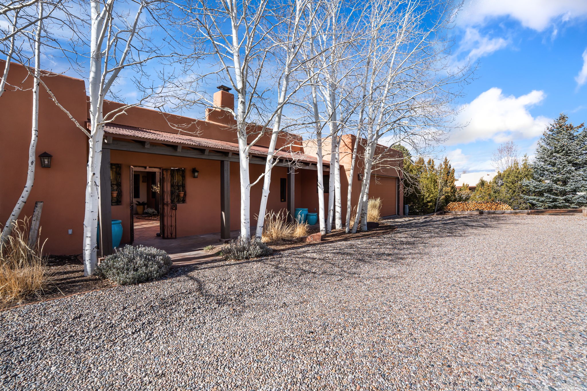 Welcome to the perfect blend of privacy, elegance, and convenience in this stunning Santa Fe style home, nestled on a spacious 2.5-acre lot, located just under 15 minutes to the Historic Santa Fe Plaza. The property features an enclosed hacienda-style patio entrance complete with wrought iron gates, high walls and an outdoor fireplace with flagstone boncos, perfect for cozy high desert year round outdoor living. Step inside and experience the chef's dream kitchen, fully equipped with a Wolf range, Sub-Zero refrigerator/ freezer, granite countertops, and large island kitchen table that offers both style and functionality for culinary enthusiasts and guests. Tall ceilings with wooden beams, plaster walls and tile throughout, give a timeless feel to the interior. The spacious primary bedroom with private outdoor access, boasts his and her closets, walk in shower and deep soaking tub. Enjoy evening cocktails with breathtaking western sunsets views, silhouetting the Jemez Mountains from the expansive portal. It's ideal for alfresco dining, entertaining or just relaxing after an adventurous day playing in Santa Fe. The beautifully landscaped yard includes an enclosed and private garden, home to mature aspen trees, and lush greenery. The property also includes an oversized two-car garage, ensuring plenty of space for your vehicles and toys for your outdoor lifestyle. With easy access to Los Alamos National Labs, Las Campanas and the Santa Fe Opera, the property is ideal as it's NOT in a HOA, yet boasts a strong community with CCR's to protect value and peace of mind. Don't forget the La Tierra mountain biking/hiking trails are just around the corner, not to mention all of the fabulous Santa Fe shopping, restaurants and art galleries that make Santa Fe so special. RECENT UPGRADES: a new roof in 2024, new stucco in 2022, new boiler, water heater, and 6 new mini-splits for AC/Heating 2024. Call today for your private showing!