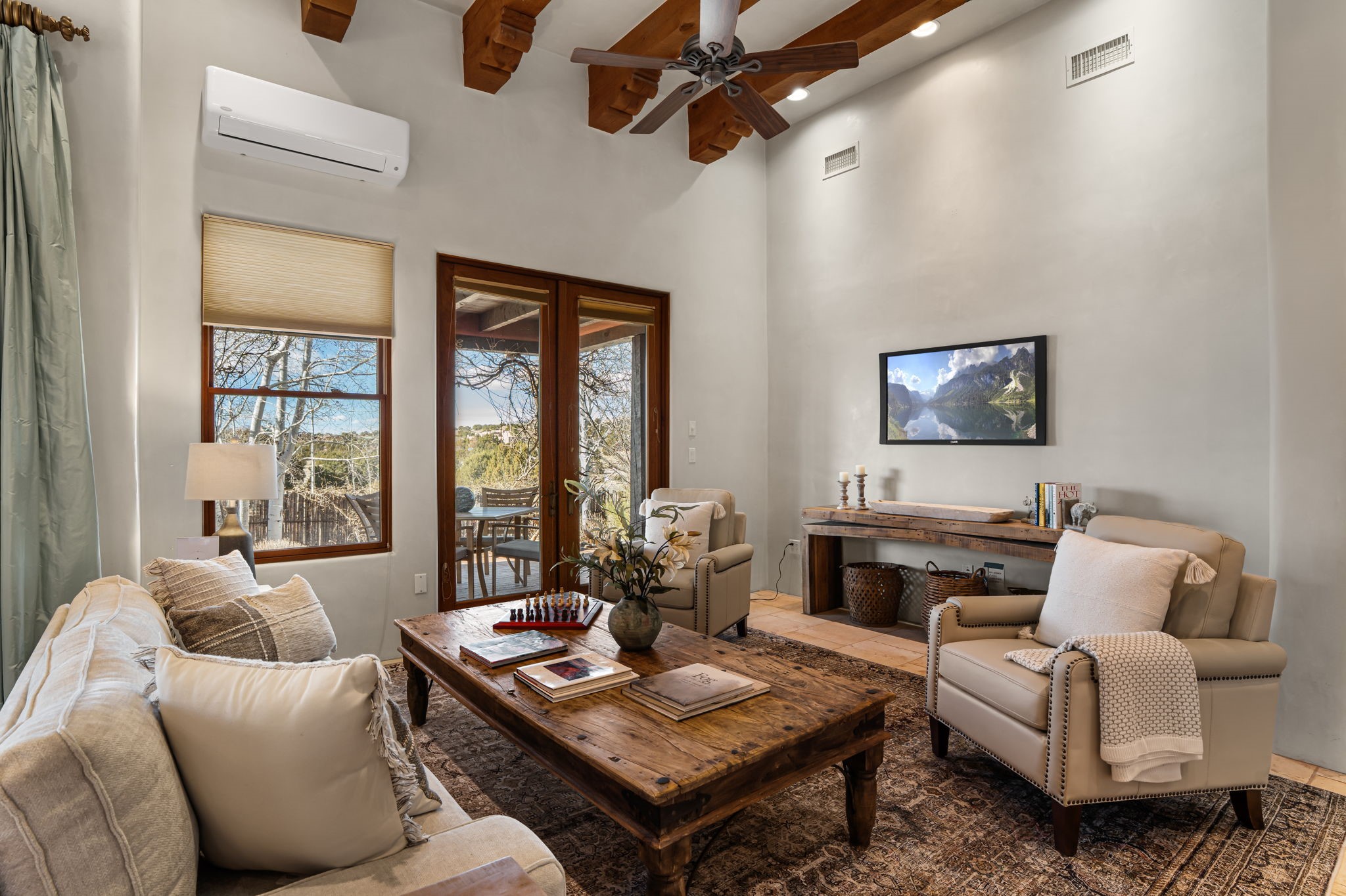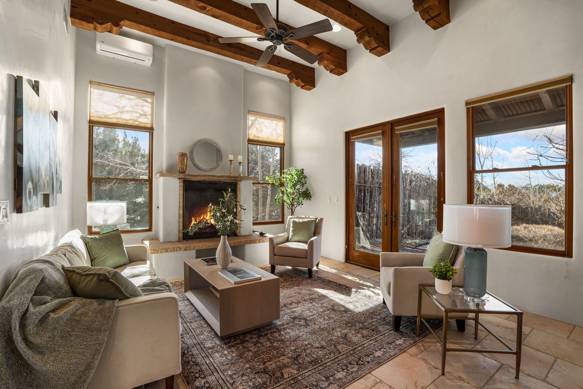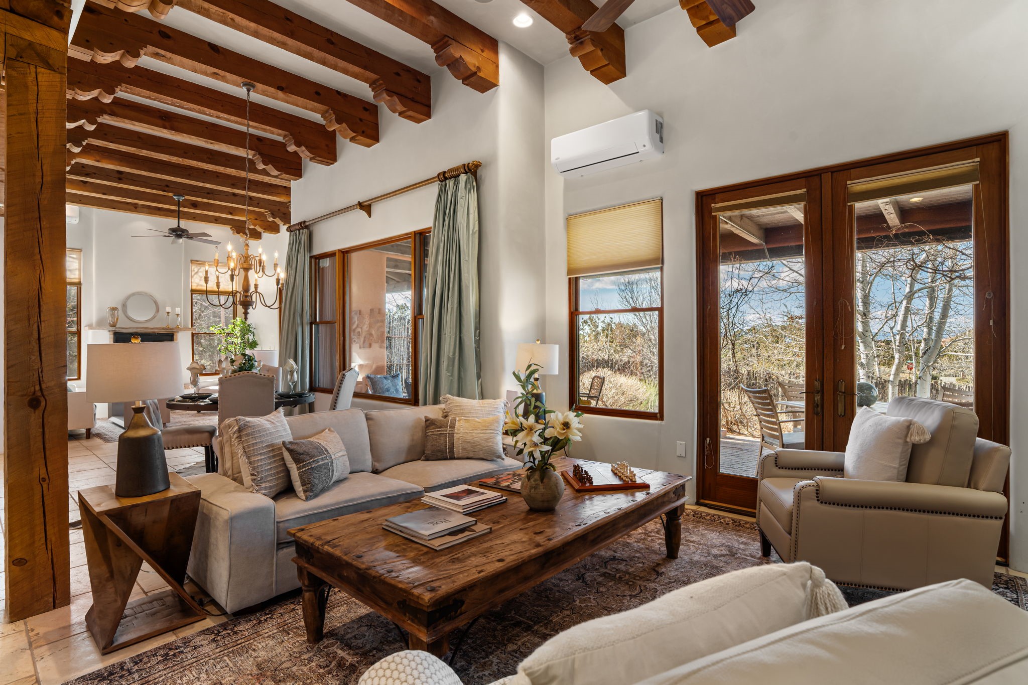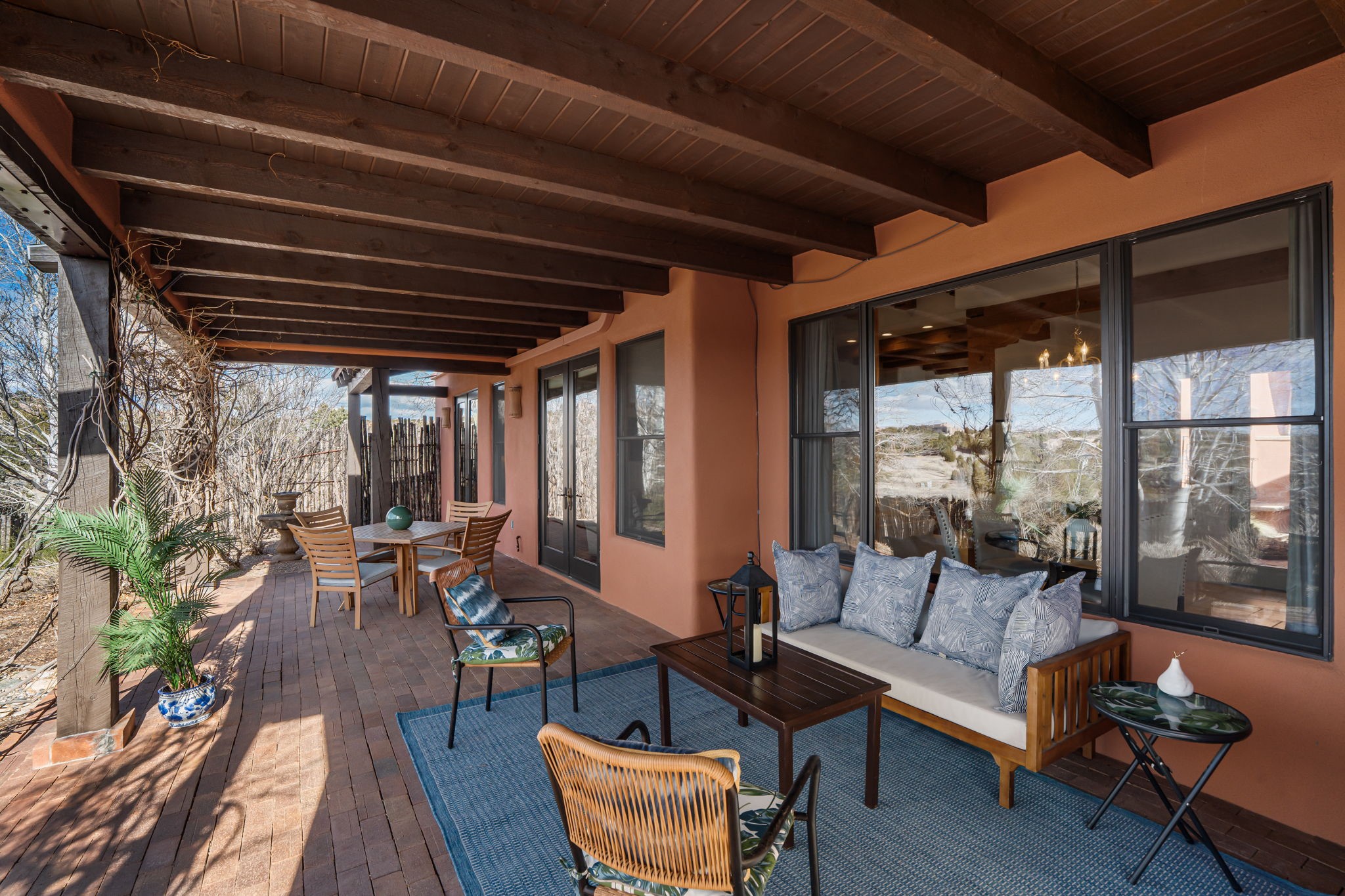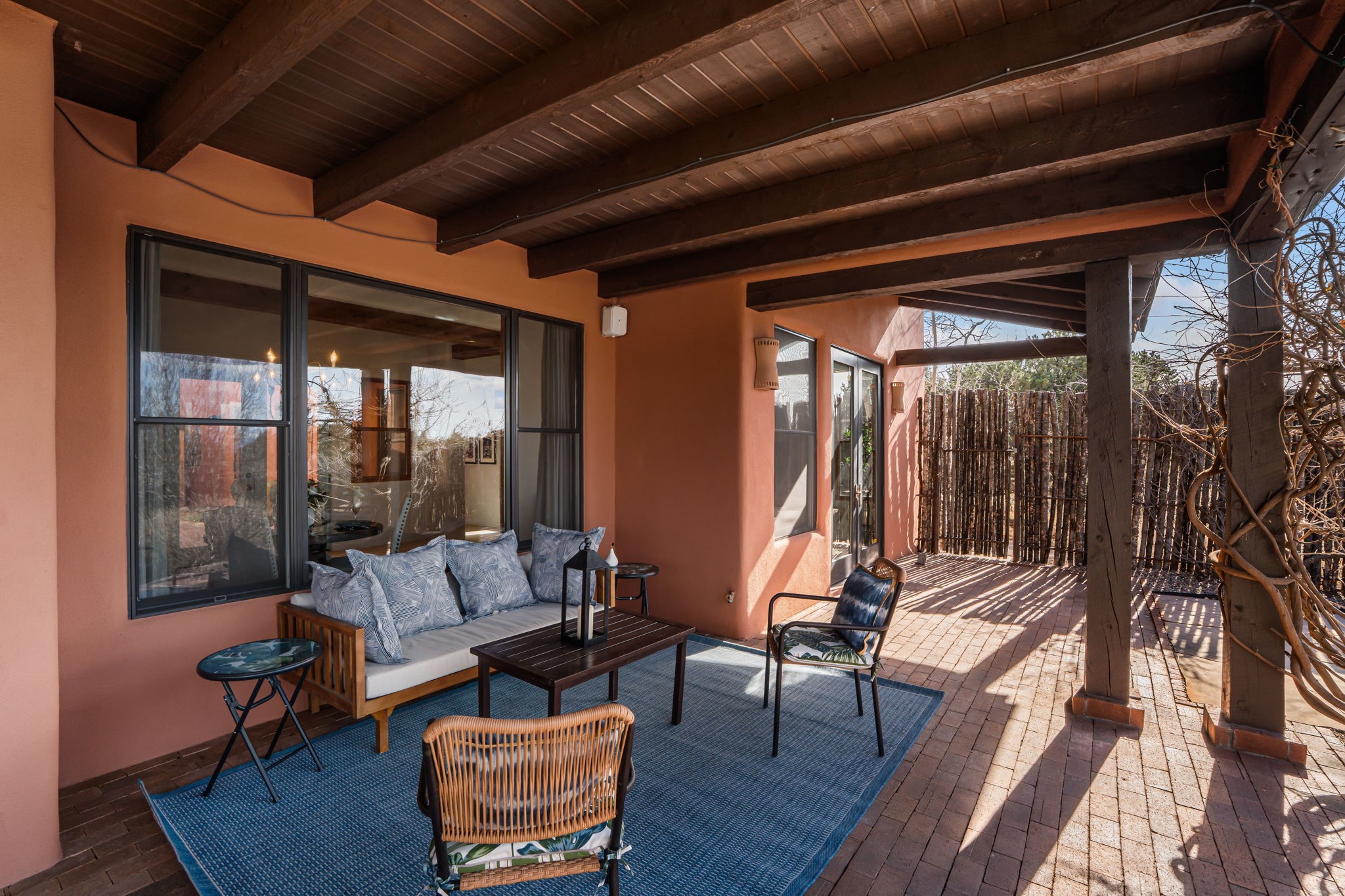 Welcome to the perfect blend of privacy, elegance, and convenience in this stunning Santa Fe style home, nestled on a spacious 2.5-acre lot, located just under 15 minutes to the Historic Santa Fe Plaza. The property features an enclosed hacienda-style patio entrance complete with wrought iron gates, high walls and an outdoor fireplace with flagstone boncos, perfect for cozy high desert year round outdoor living. Step inside and experience the chef's dream kitchen, fully equipped with a Wolf range, Sub-Zero refrigerator/ freezer, granite countertops, and large island kitchen table that offers both style and functionality for culinary enthusiasts and guests. Tall ceilings with wooden beams, plaster walls and tile throughout, give a timeless feel to the interior. The spacious primary bedroom with private outdoor access, boasts his and her closets, walk in shower and deep soaking tub. Enjoy evening cocktails with breathtaking western sunsets views, silhouetting the Jemez Mountains from the expansive portal. It's ideal for alfresco dining, entertaining or just relaxing after an adventurous day playing in Santa Fe. The beautifully landscaped yard includes an enclosed and private garden, home to mature aspen trees, and lush greenery. The property also includes an oversized two-car garage, ensuring plenty of space for your vehicles and toys for your outdoor lifestyle. With easy access to Los Alamos National Labs, Las Campanas and the Santa Fe Opera, the property is ideal as it's NOT in a HOA, yet boasts a strong community with CCR's to protect value and peace of mind. Don't forget the La Tierra mountain biking/hiking trails are just around the corner, not to mention all of the fabulous Santa Fe shopping, restaurants and art galleries that make Santa Fe so special. RECENT UPGRADES: a new roof in 2024, new stucco in 2022, new boiler, water heater, and 6 new mini-splits for AC/Heating 2024. Call today for your private showing!