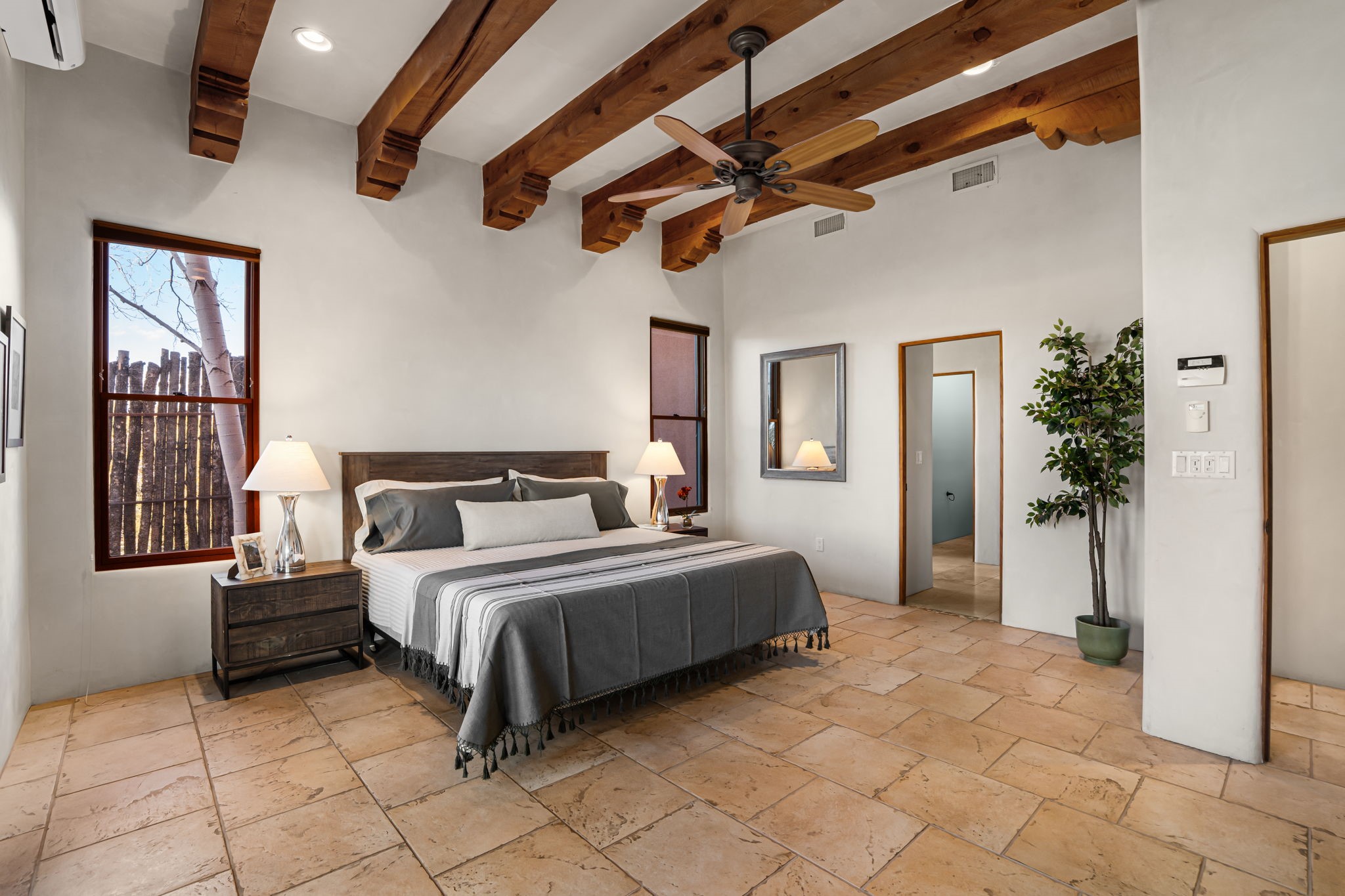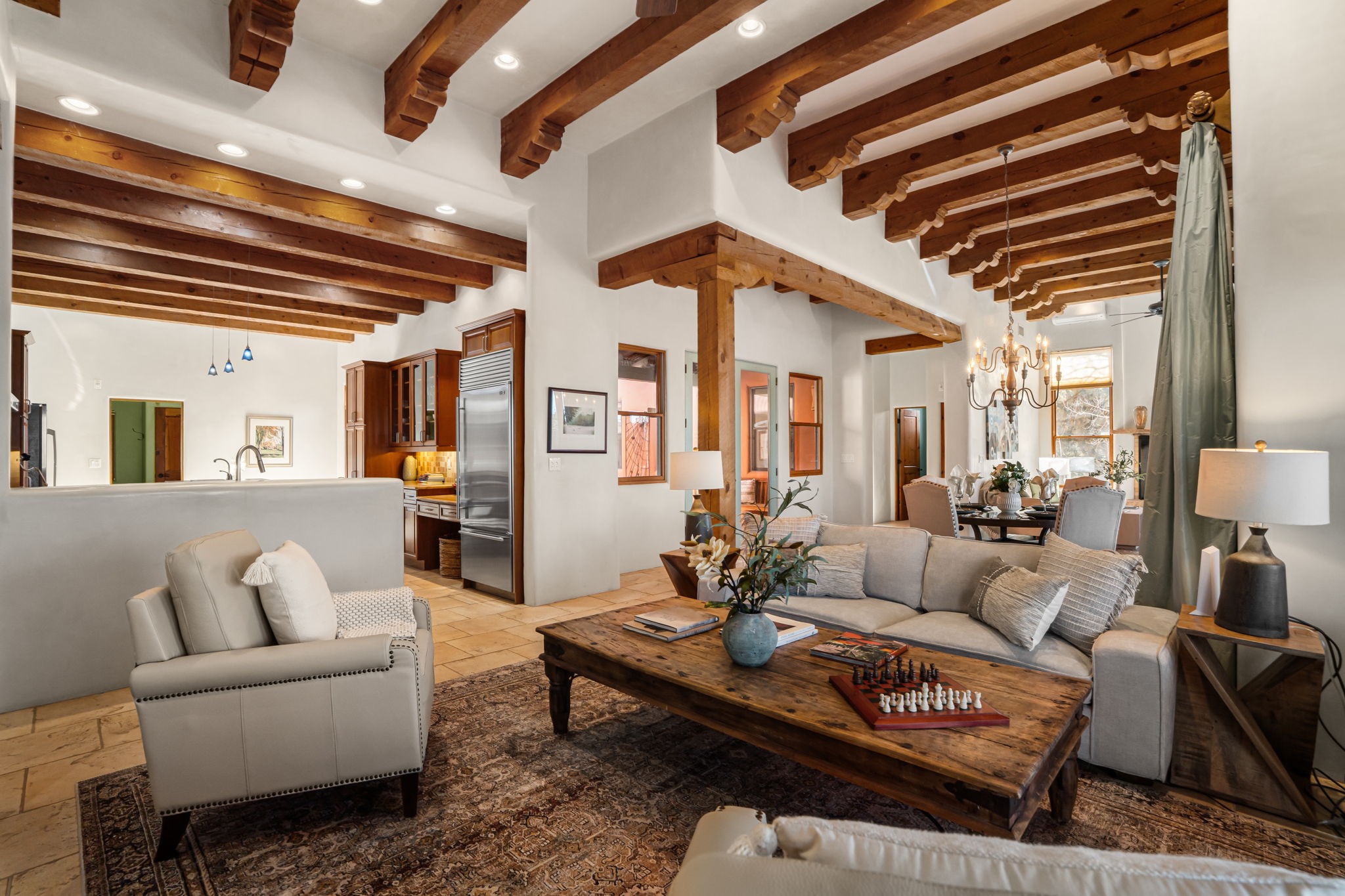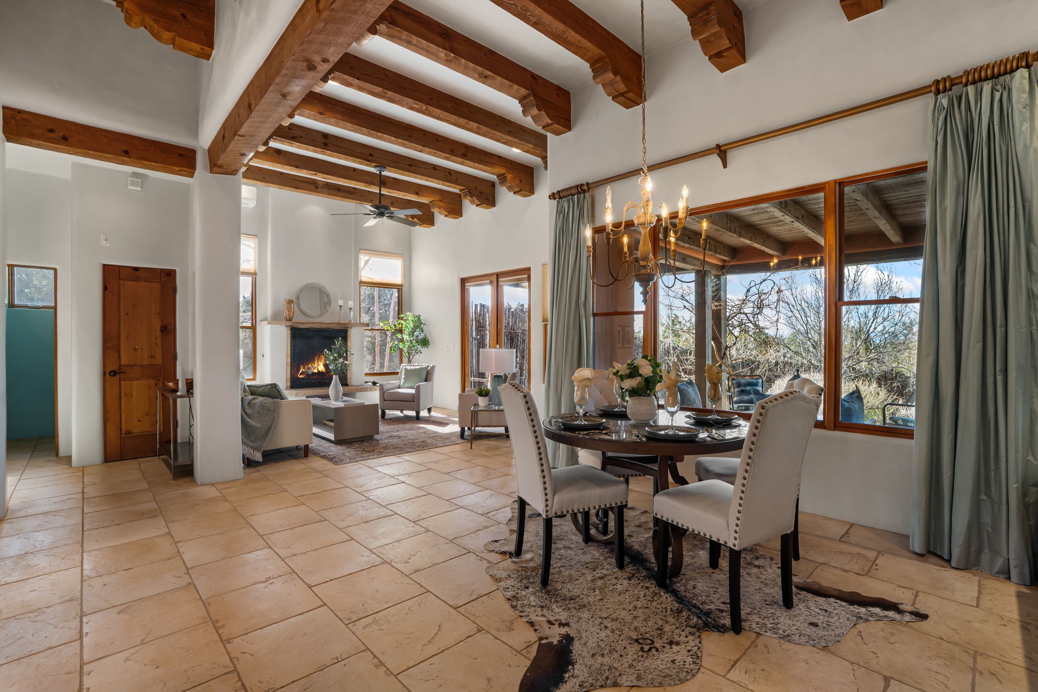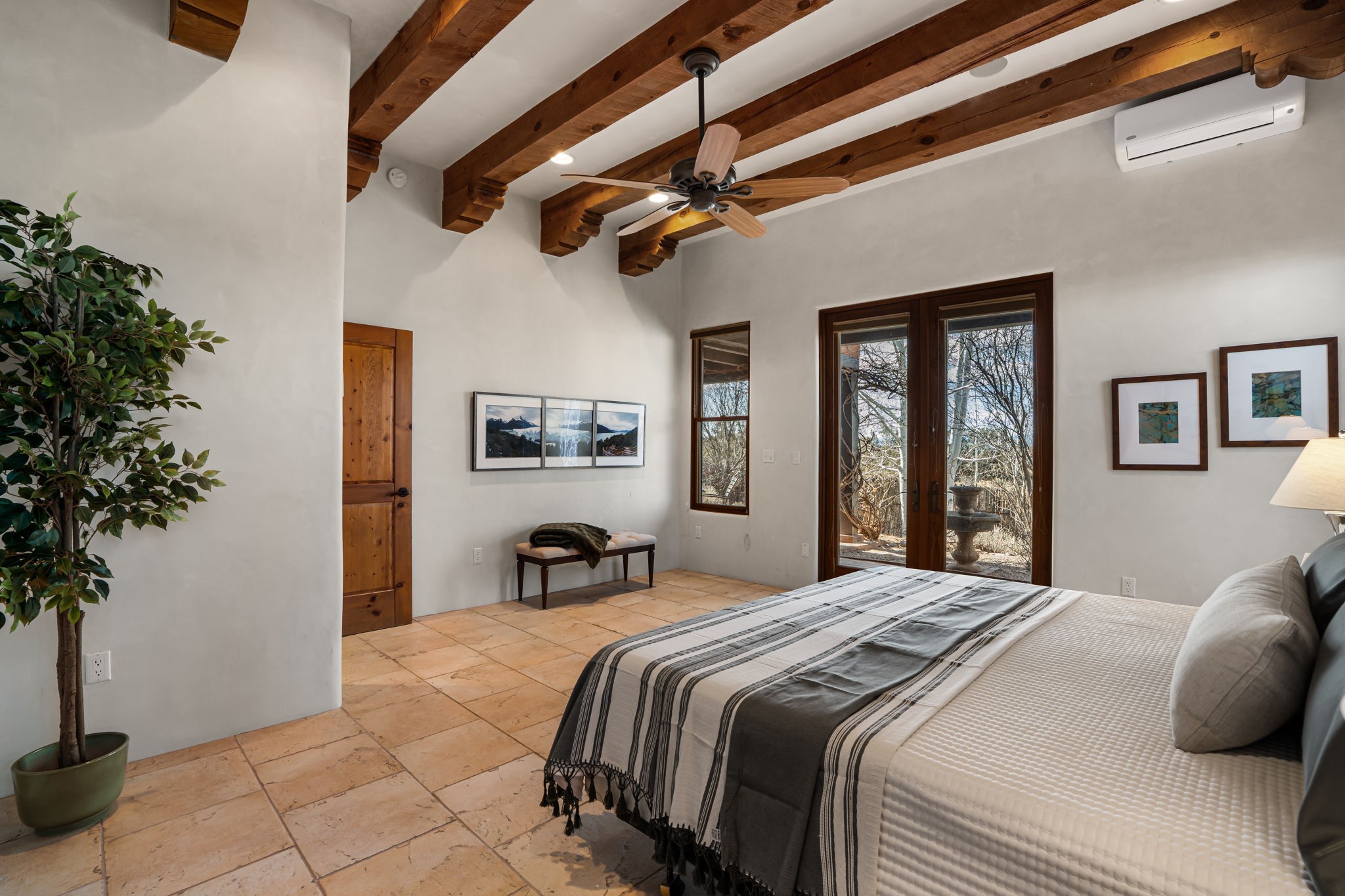 Welcome to the perfect blend of privacy, elegance, and convenience in this stunning Santa Fe style home, nestled on a spacious 2.5-acre lot, located just under 15 minutes to the Historic Santa Fe Plaza. The property features an enclosed hacienda-style patio entrance complete with wrought iron gates, high walls and an outdoor fireplace with flagstone boncos, perfect for cozy high desert year round outdoor living. Step inside and experience the chef's dream kitchen, fully equipped with a Wolf range, Sub-Zero refrigerator/ freezer, granite countertops, and large island kitchen table that offers both style and functionality for culinary enthusiasts and guests. Tall ceilings with wooden beams, plaster walls and tile throughout, give a timeless feel to the interior. The spacious primary bedroom with private outdoor access, boasts his and her closets, walk in shower and deep soaking tub. Enjoy evening cocktails with breathtaking western sunsets views, silhouetting the Jemez Mountains from the expansive portal. It's ideal for alfresco dining, entertaining or just relaxing after an adventurous day playing in Santa Fe. The beautifully landscaped yard includes an enclosed and private garden, home to mature aspen trees, and lush greenery. The property also includes an oversized two-car garage, ensuring plenty of space for your vehicles and toys for your outdoor lifestyle. With easy access to Los Alamos National Labs, Las Campanas and the Santa Fe Opera, the property is ideal as it's NOT in a HOA, yet boasts a strong community with CCR's to protect value and peace of mind. Don't forget the La Tierra mountain biking/hiking trails are just around the corner, not to mention all of the fabulous Santa Fe shopping, restaurants and art galleries that make Santa Fe so special. RECENT UPGRADES: a new roof in 2024, new stucco in 2022, new boiler, water heater, and 6 new mini-splits for AC/Heating 2024. Call today for your private showing!