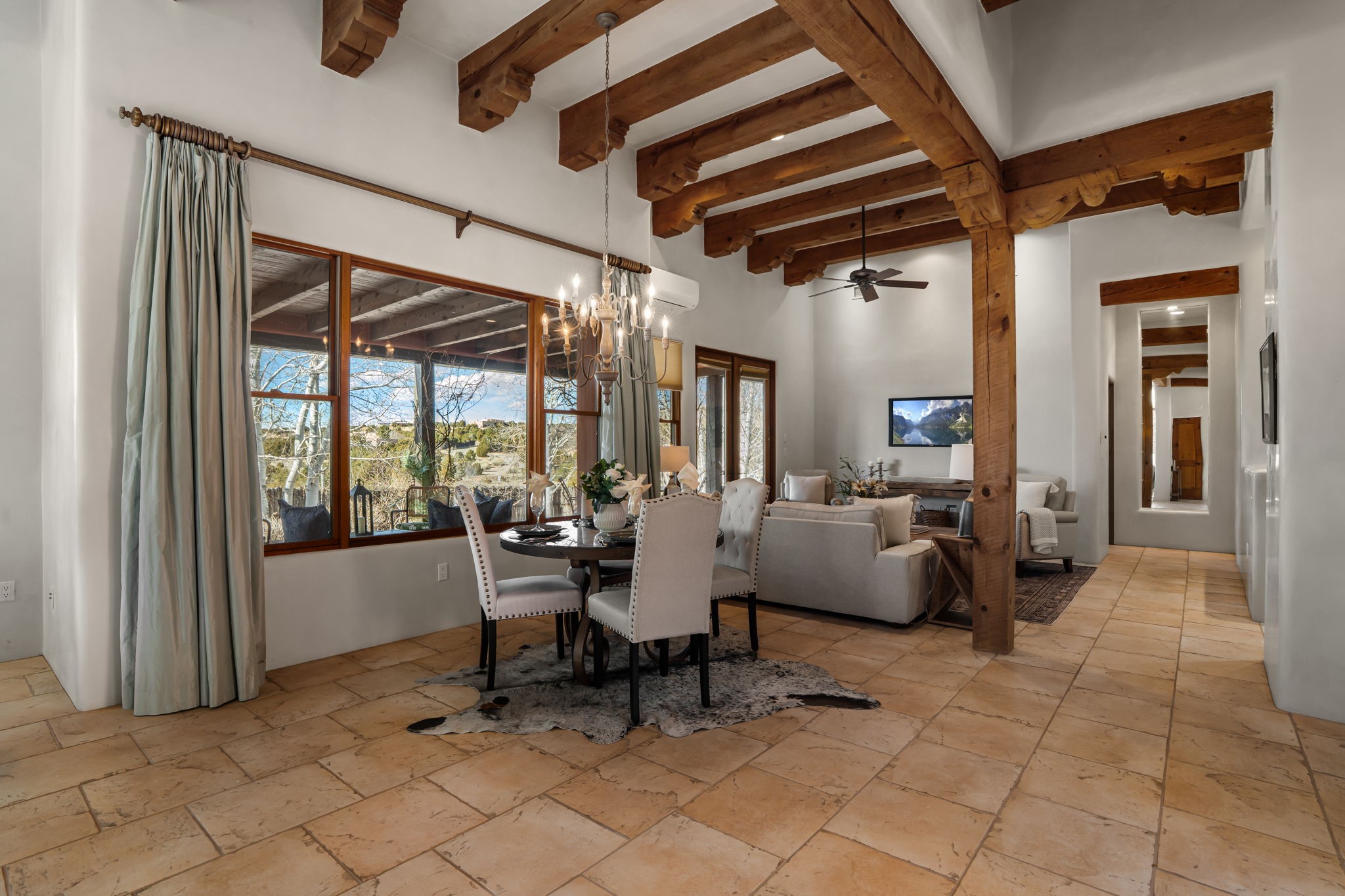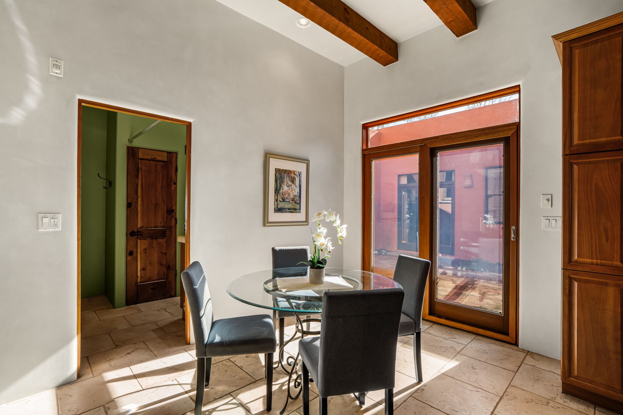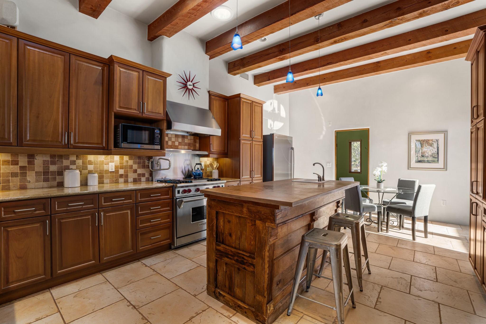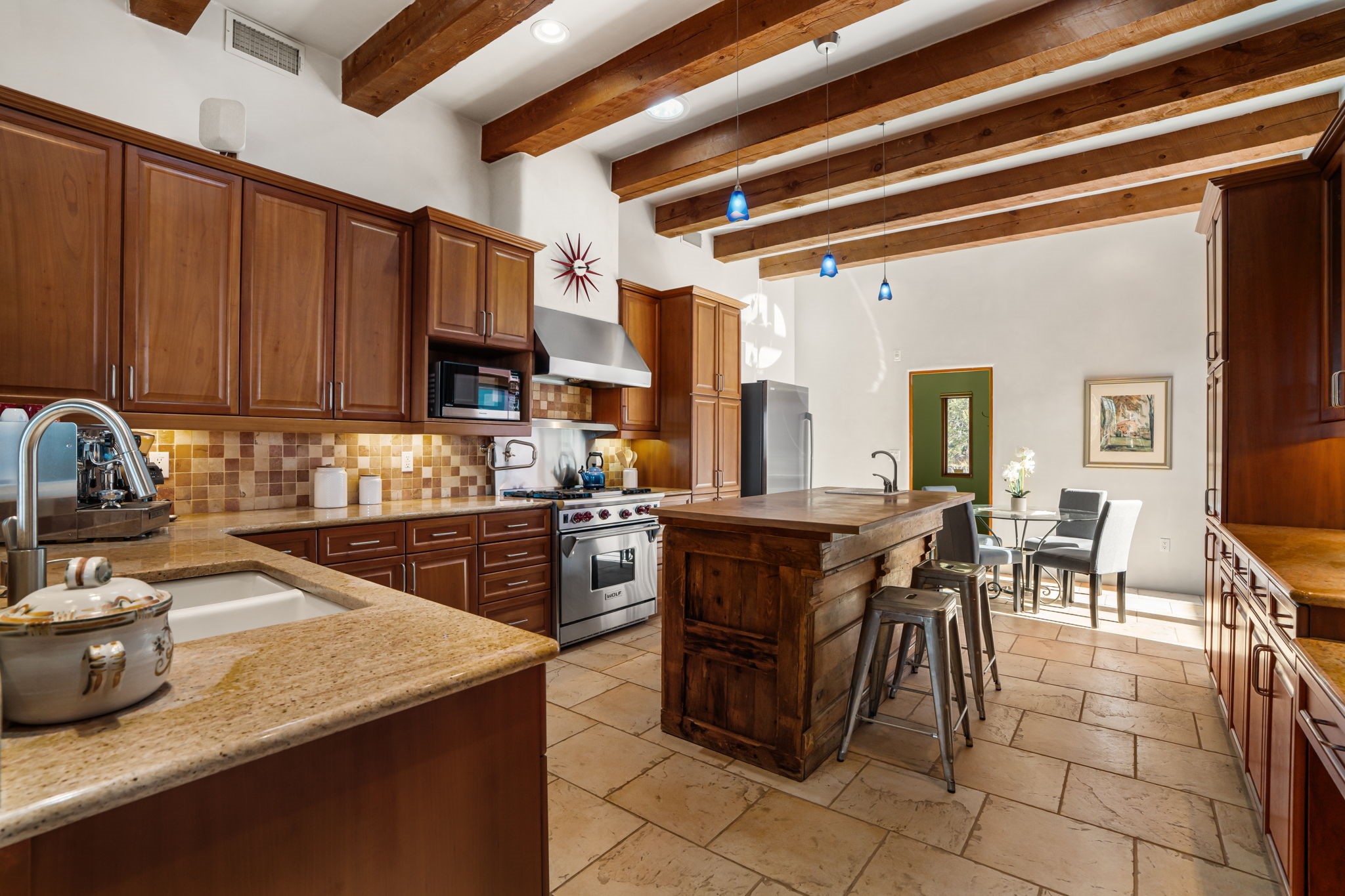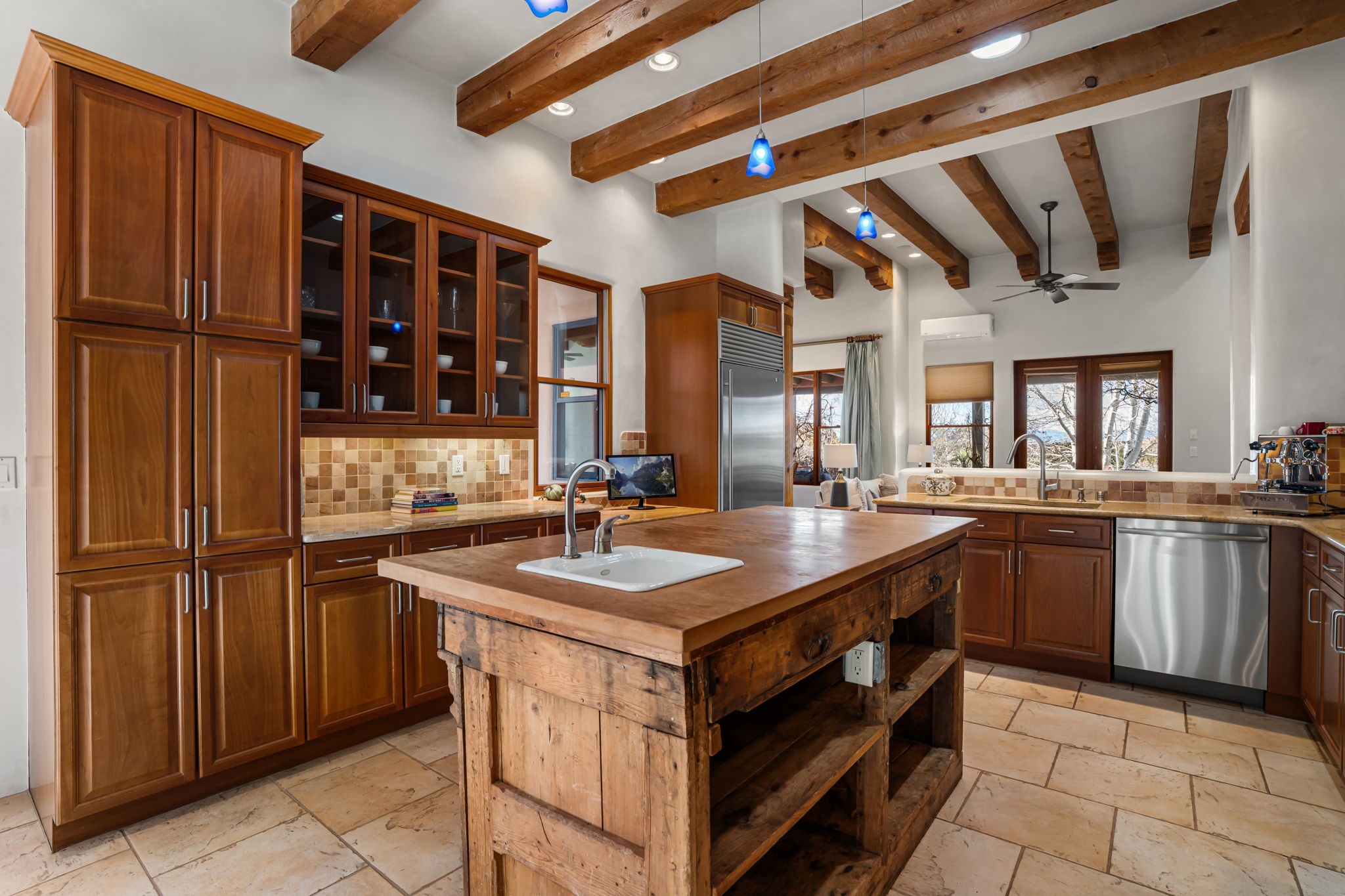 Welcome to the perfect blend of privacy, elegance, and convenience in this stunning Santa Fe style home, nestled on a spacious 2.5-acre lot, located just under 15 minutes to the Historic Santa Fe Plaza. The property features an enclosed hacienda-style patio entrance complete with wrought iron gates, high walls and an outdoor fireplace with flagstone boncos, perfect for cozy high desert year round outdoor living. Step inside and experience the chef's dream kitchen, fully equipped with a Wolf range, Sub-Zero refrigerator/ freezer, granite countertops, and large island kitchen table that offers both style and functionality for culinary enthusiasts and guests. Tall ceilings with wooden beams, plaster walls and tile throughout, give a timeless feel to the interior. The spacious primary bedroom with private outdoor access, boasts his and her closets, walk in shower and deep soaking tub. Enjoy evening cocktails with breathtaking western sunsets views, silhouetting the Jemez Mountains from the expansive portal. It's ideal for alfresco dining, entertaining or just relaxing after an adventurous day playing in Santa Fe. The beautifully landscaped yard includes an enclosed and private garden, home to mature aspen trees, and lush greenery. The property also includes an oversized two-car garage, ensuring plenty of space for your vehicles and toys for your outdoor lifestyle. With easy access to Los Alamos National Labs, Las Campanas and the Santa Fe Opera, the property is ideal as it's NOT in a HOA, yet boasts a strong community with CCR's to protect value and peace of mind. Don't forget the La Tierra mountain biking/hiking trails are just around the corner, not to mention all of the fabulous Santa Fe shopping, restaurants and art galleries that make Santa Fe so special. RECENT UPGRADES: a new roof in 2024, new stucco in 2022, new boiler, water heater, and 6 new mini-splits for AC/Heating 2024. Call today for your private showing!