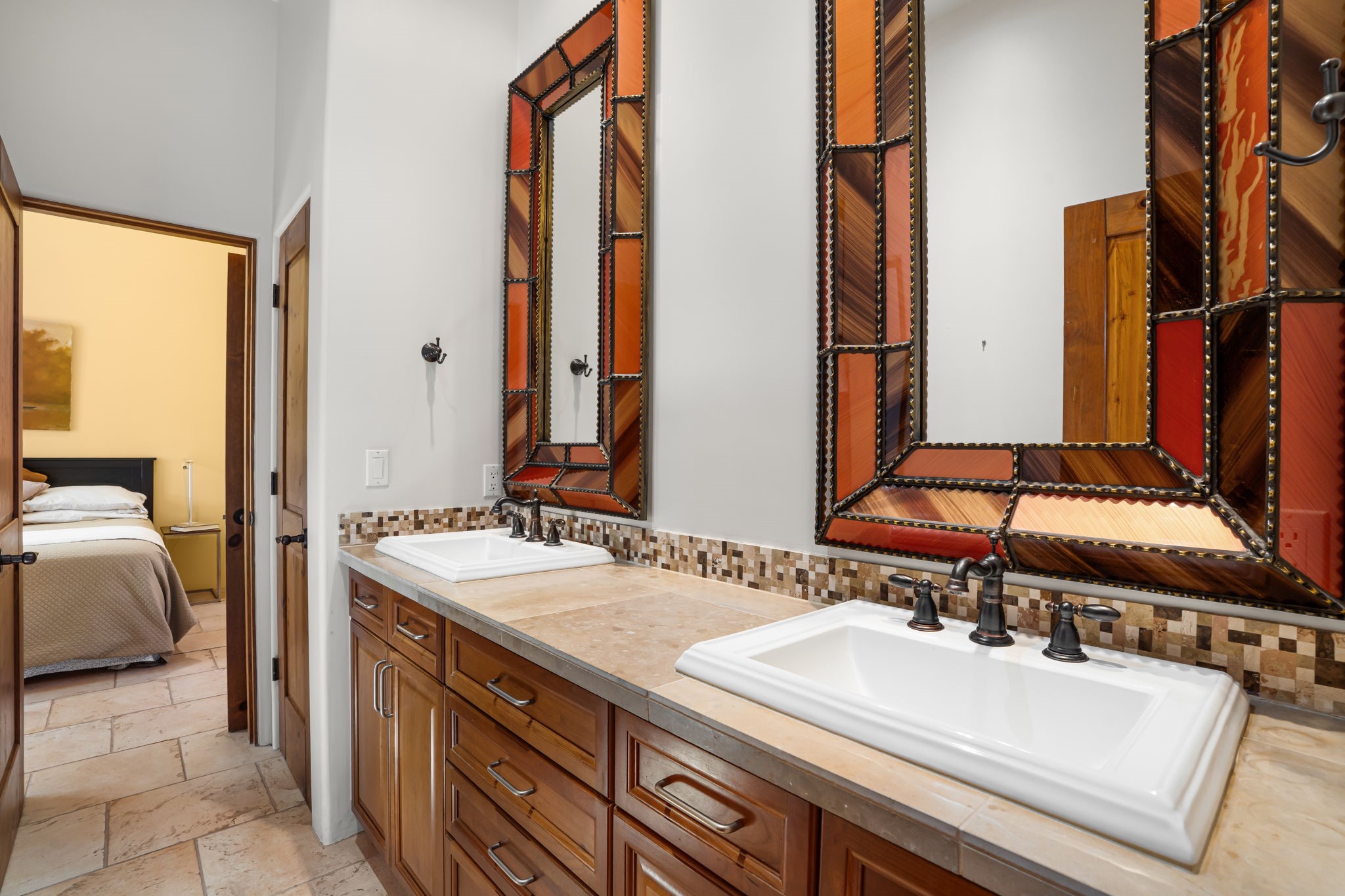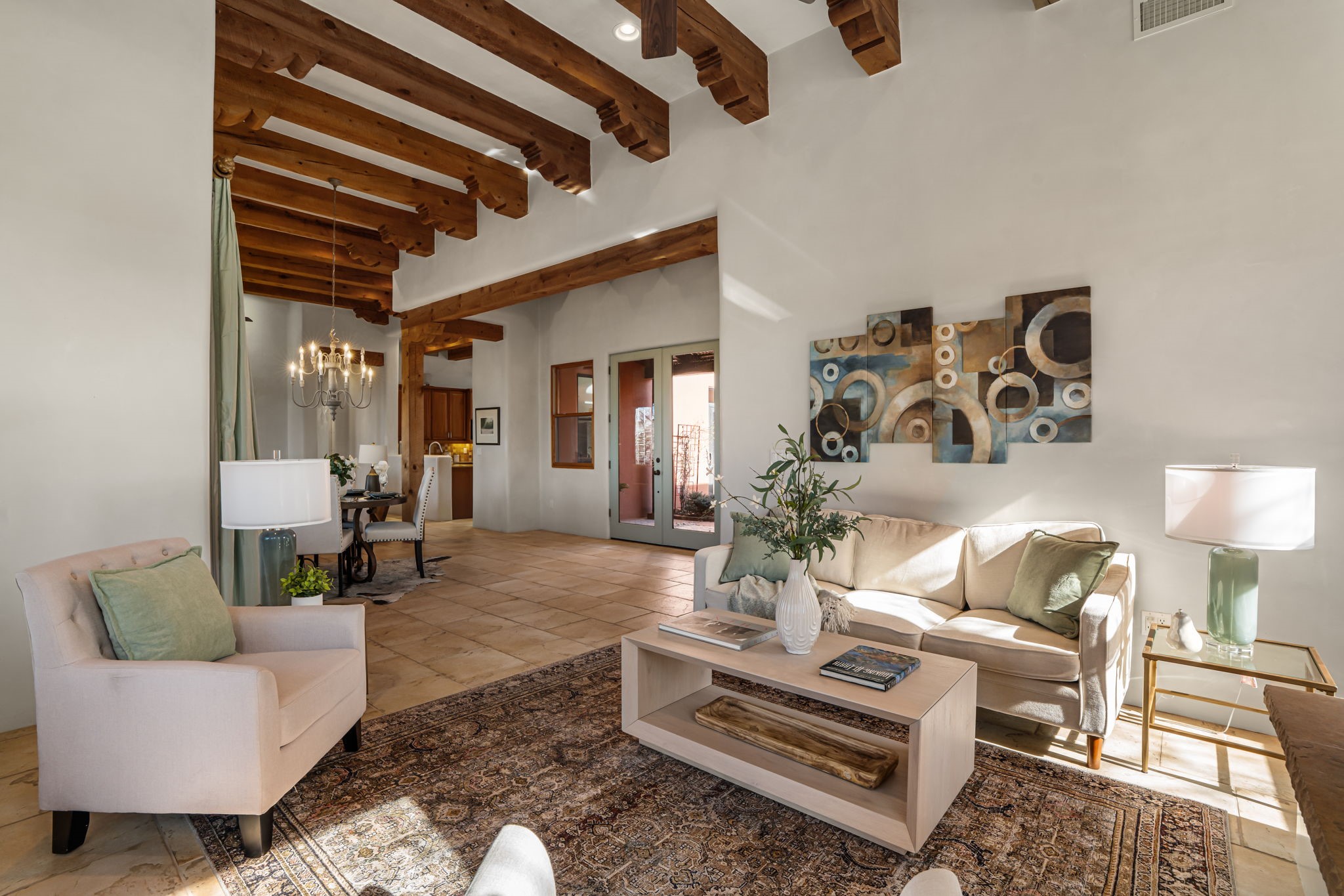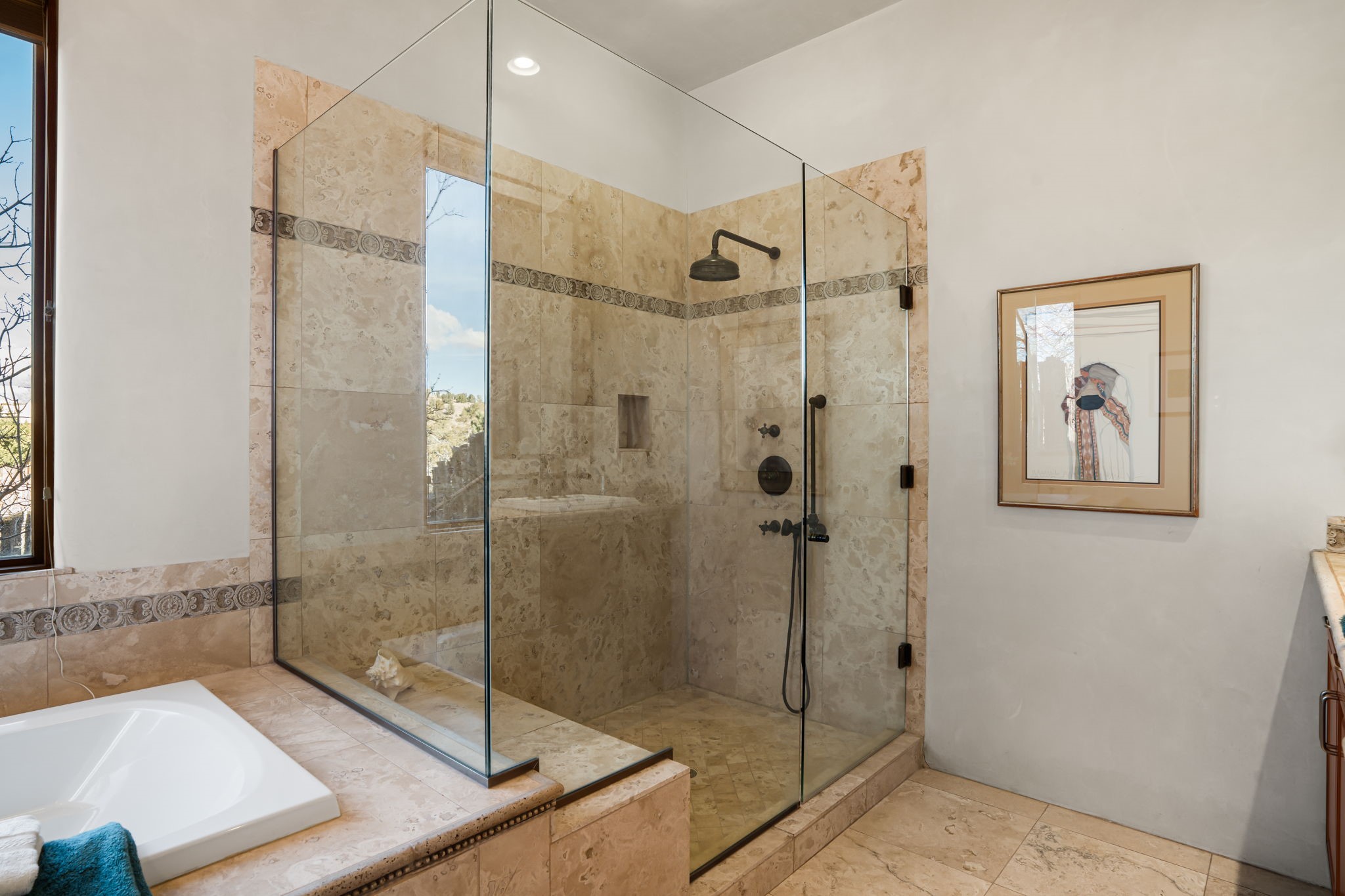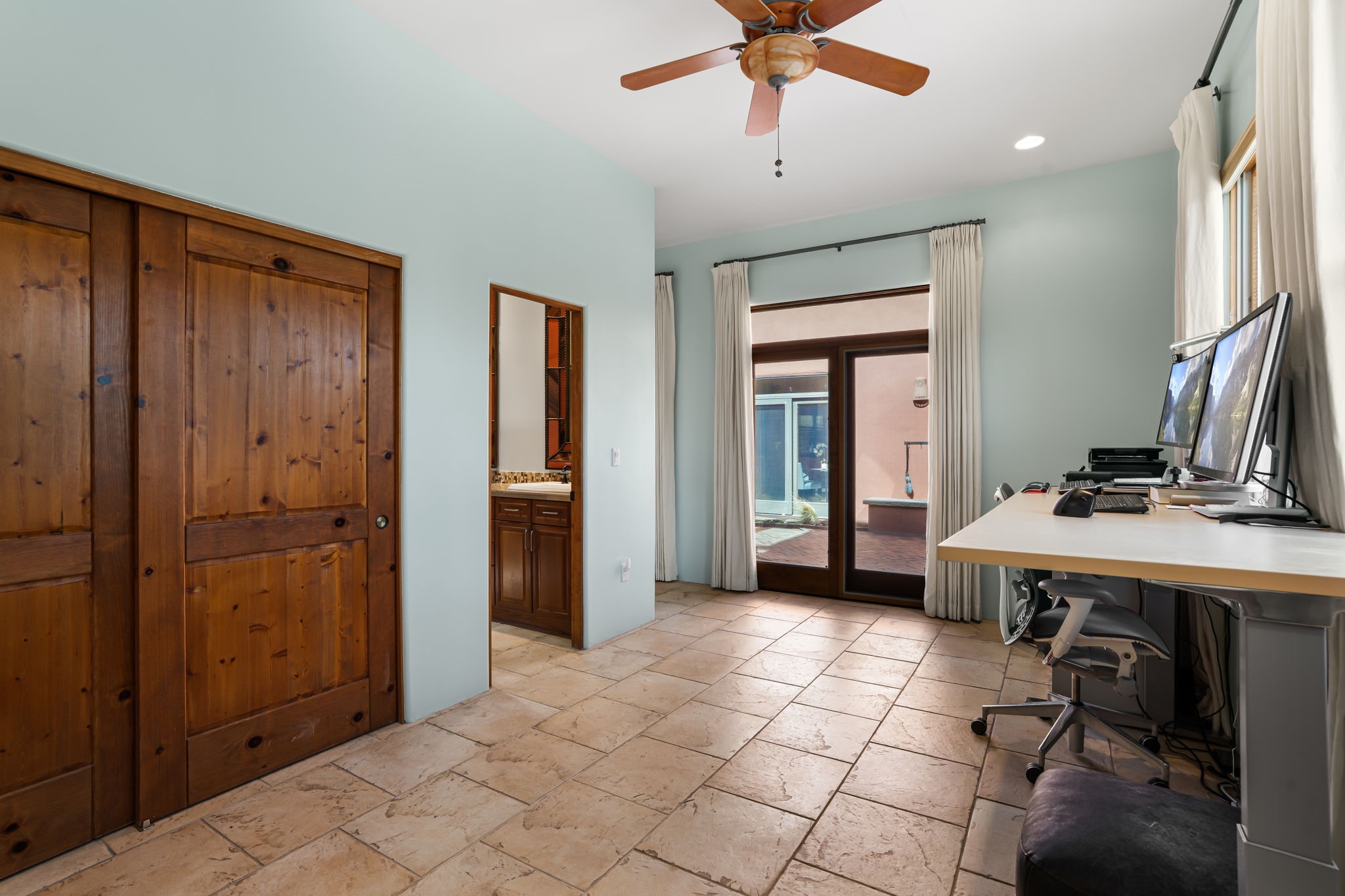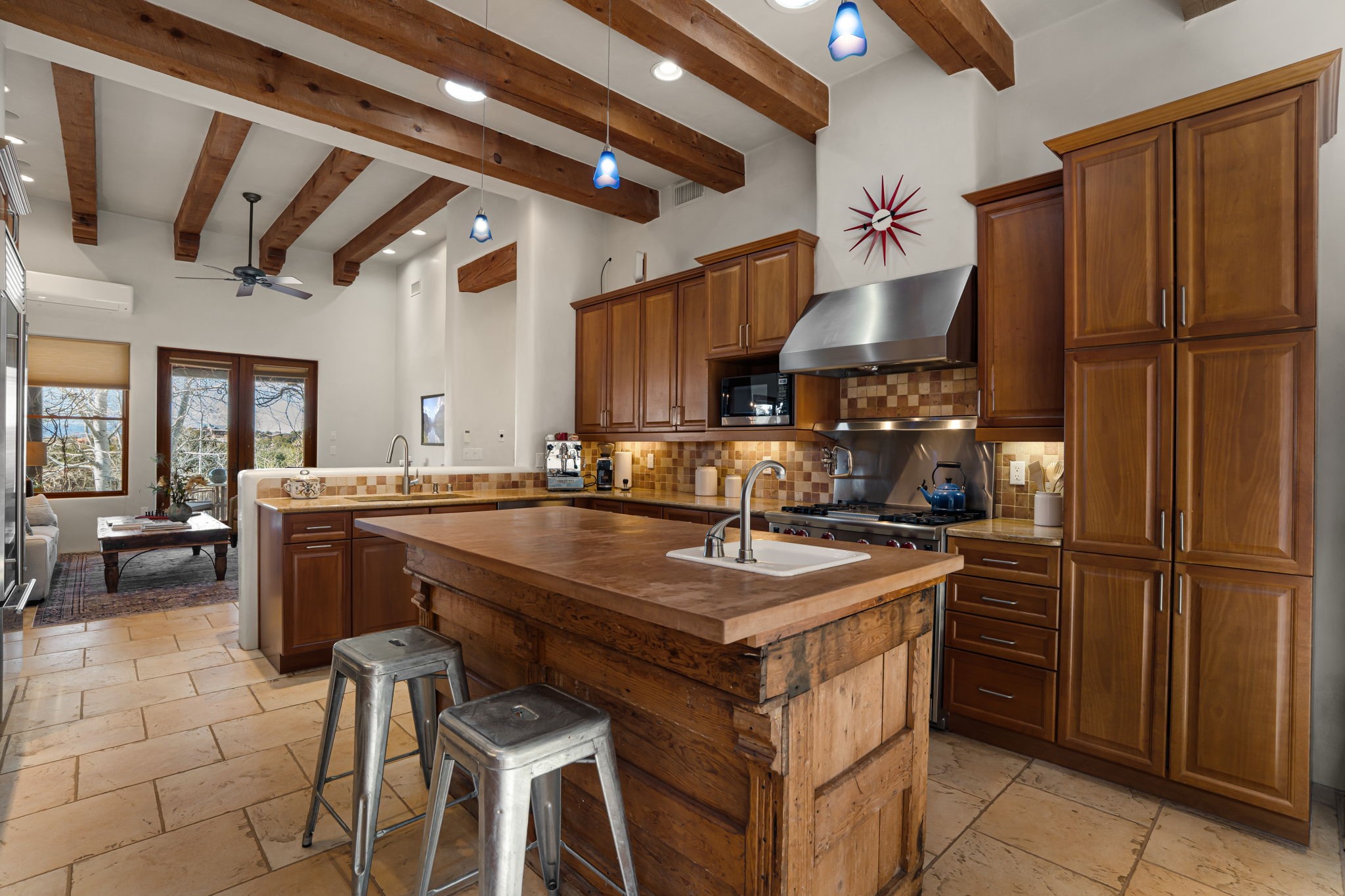 Welcome to the perfect blend of privacy, elegance, and convenience in this stunning Santa Fe style home, nestled on a spacious 2.5-acre lot, located just under 15 minutes to the Historic Santa Fe Plaza. The property features an enclosed hacienda-style patio entrance complete with wrought iron gates, high walls and an outdoor fireplace with flagstone boncos, perfect for cozy high desert year round outdoor living. Step inside and experience the chef's dream kitchen, fully equipped with a Wolf range, Sub-Zero refrigerator/ freezer, granite countertops, and large island kitchen table that offers both style and functionality for culinary enthusiasts and guests. Tall ceilings with wooden beams, plaster walls and tile throughout, give a timeless feel to the interior. The spacious primary bedroom with private outdoor access, boasts his and her closets, walk in shower and deep soaking tub. Enjoy evening cocktails with breathtaking western sunsets views, silhouetting the Jemez Mountains from the expansive portal. It's ideal for alfresco dining, entertaining or just relaxing after an adventurous day playing in Santa Fe. The beautifully landscaped yard includes an enclosed and private garden, home to mature aspen trees, and lush greenery. The property also includes an oversized two-car garage, ensuring plenty of space for your vehicles and toys for your outdoor lifestyle. With easy access to Los Alamos National Labs, Las Campanas and the Santa Fe Opera, the property is ideal as it's NOT in a HOA, yet boasts a strong community with CCR's to protect value and peace of mind. Don't forget the La Tierra mountain biking/hiking trails are just around the corner, not to mention all of the fabulous Santa Fe shopping, restaurants and art galleries that make Santa Fe so special. RECENT UPGRADES: a new roof in 2024, new stucco in 2022, new boiler, water heater, and 6 new mini-splits for AC/Heating 2024. Call today for your private showing!