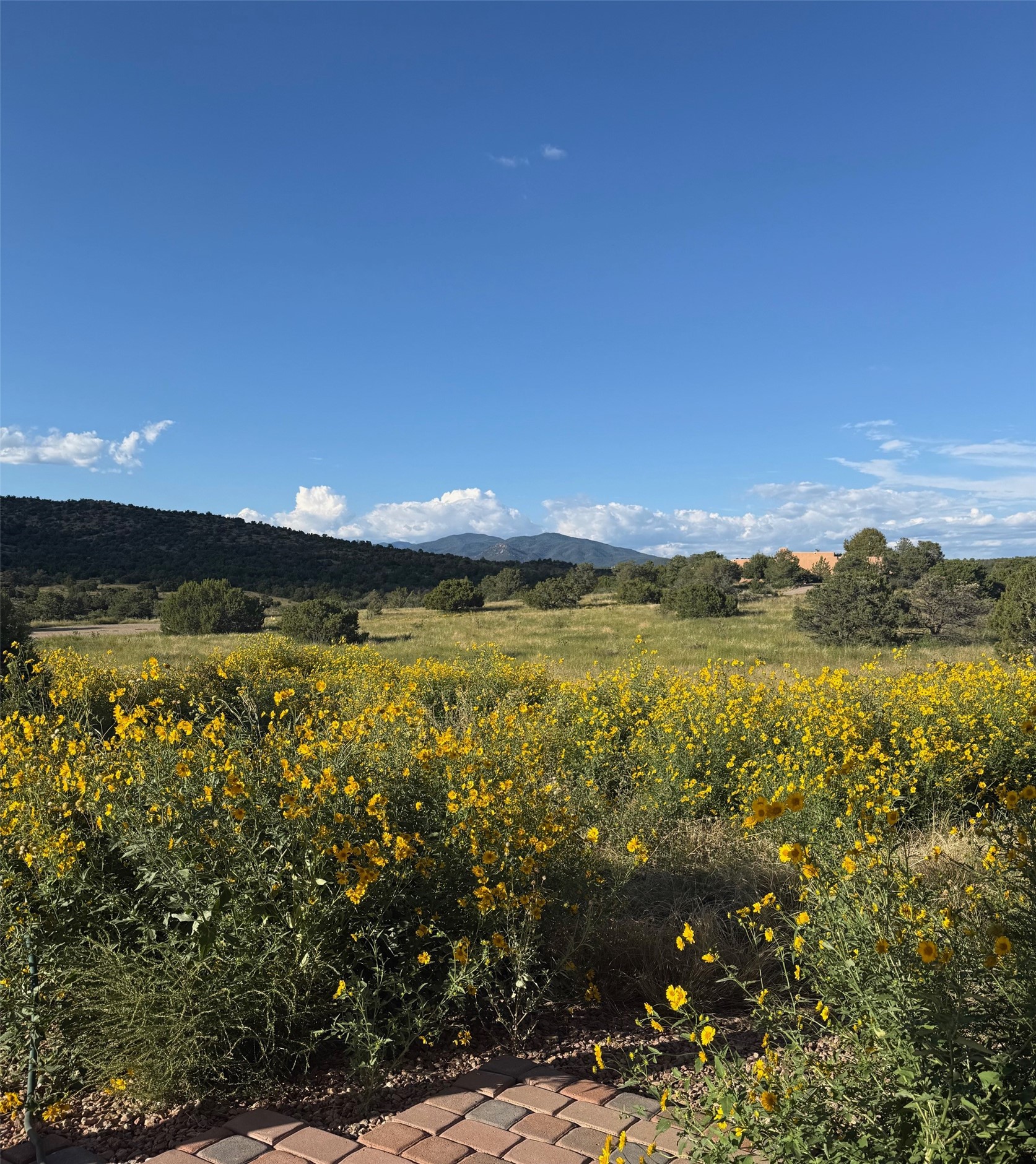 Completed in 2023 and gracefully set on nearly three pristine acres in The Ridges, this exceptional soft-contemporary residence captures the essence of refined New Mexico living. Designed to embrace expansive views, privacy, and serenity, the property offers a rare combination of architectural sophistication and natural beauty -- with ample space to accommodate a future guest house or casita. The home's light-filled interior is defined by soaring 12-foot ceilings in the great room, creating a dramatic yet welcoming atmosphere. An open-concept design enhances both everyday living and elegant entertaining, while three well-appointed bedrooms (or two bedrooms plus an office) and two luxurious full baths provide comfort and style in equal measure. The spacious and inviting primary suite serves as a private retreat, featuring a charming sitting area with French doors that open to the garden patio and framed expansive views. The en suite bath is a true showpiece, highlighted by a luxurious slipper tub illuminated by an overhanging crystal chandelier and dramatically appointed with dual rustic log cabin vanities, blending refined elegance with warm Southwestern character. The chef's kitchen serves as a striking focal point, outfitted with premium Caf appliances, including a six-burner gas cooktop and oven, Caf refrigerator, Bosch dishwasher, and exquisite level 5 granite countertops. Clean lines, quality craftsmanship, and thoughtful finishes throughout contribute to the home's bright, airy ambiance. Seamless indoor-outdoor living unfolds beneath covered portals ideal for year-round enjoyment. Landscaped garden beds await curated plantings, and a beautifully positioned fountain serves as a serene focal point, adding both movement and calming ambiance to the expansive back patio. Modern conveniences include an electric vehicle charging hookup, a comprehensive whole-house alarm system, water filtration, a bidet in the primary bathroom, and a gas fireplace. Located within The Ridges subdivision, known for its quiet surroundings, breathtaking vistas, and reasonable HOA guidelines, this nearly new residence represents a rare opportunity to enjoy privacy, luxury, and timeless Southwestern beauty. Select furnishings are available for purchase separately, offering the possibility of a refined, turnkey acquisition.