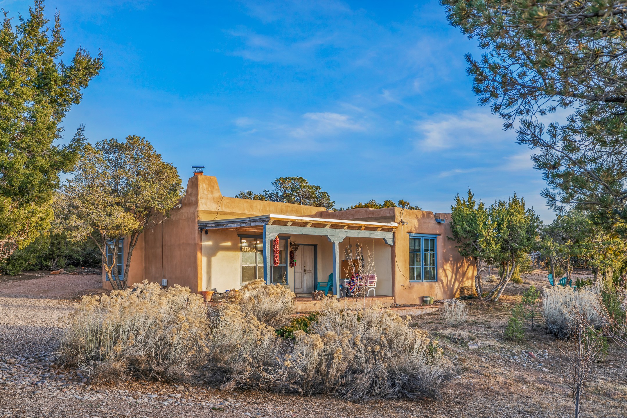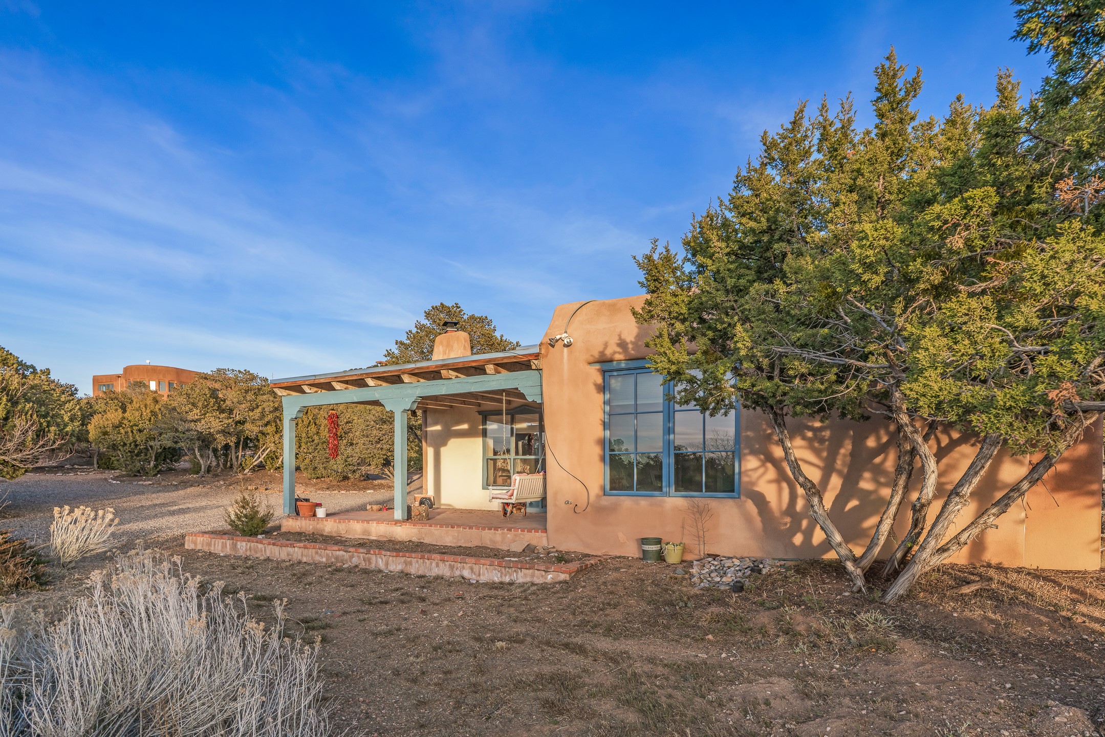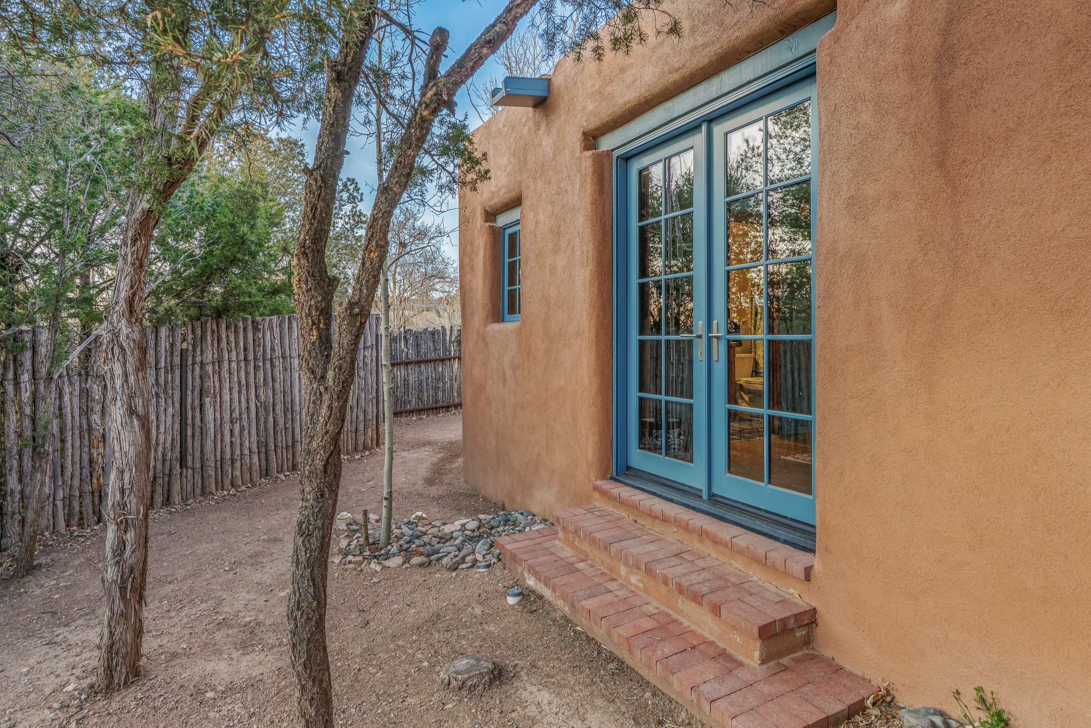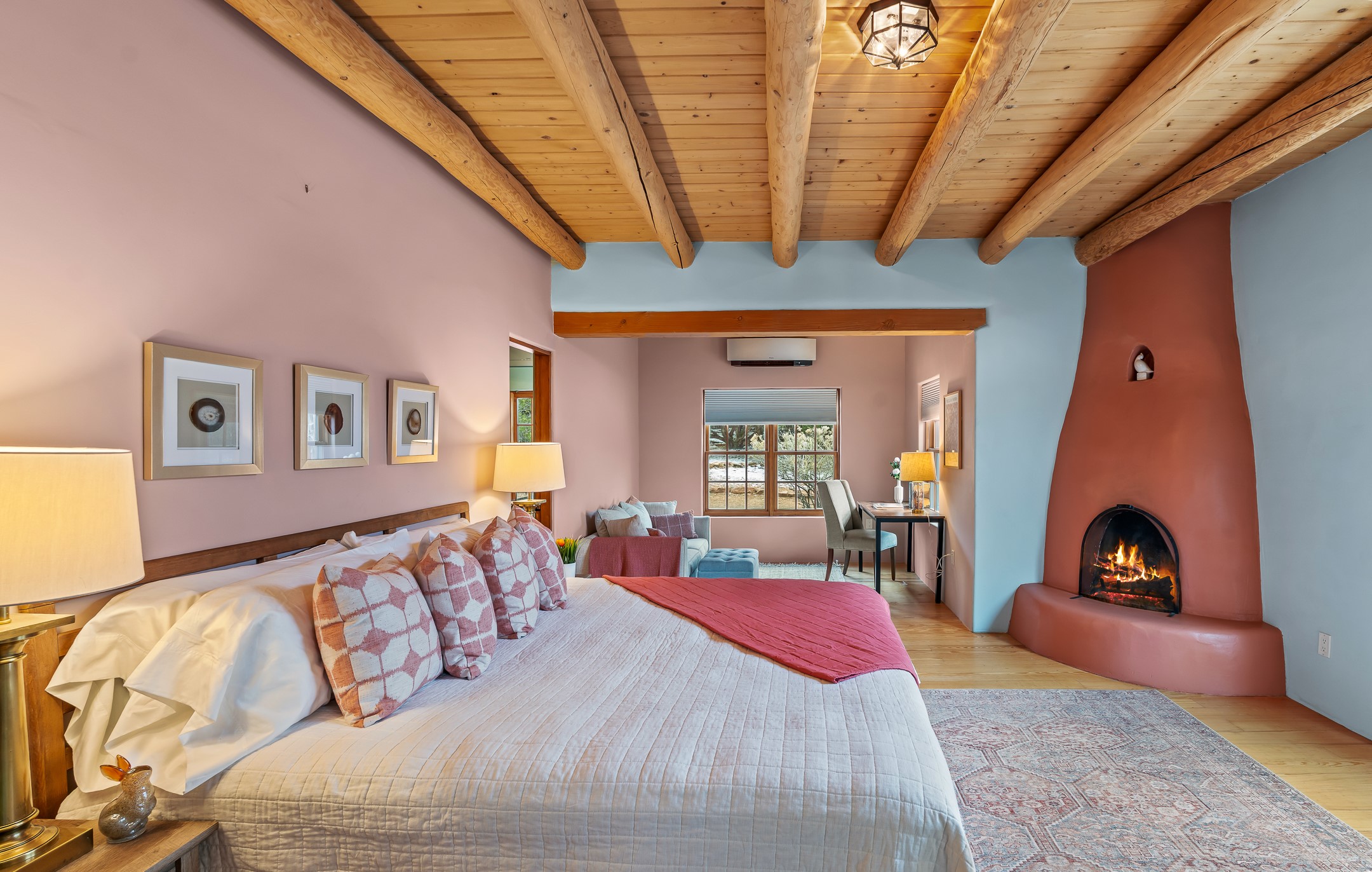1300 Lejano Lane is a timeless Santa Fe retreat blending classic adobe charm with exceptional indoor-outdoor living. The 2,904-square-foot main residence, constructed of adobe and frame, showcases rich architectural detail and inviting spaces designed for both relaxation and entertaining. The spacious living room features knotty pine wood floors, exposed vigas, and a dramatic kiva fireplace, opening seamlessly to the kitchen. Just beyond, an outdoor deck overlooks the heated pool and hot tub, creating an effortless flow for gatherings. A separate dining room connects to the private guest wing and a light-filled sunroom with brick floors, beamed ceiling, kiva fireplace, and French doors leading to a bricked patio. The primary suite is a true sanctuary, complete with its own Owner's Lounge and kiva fireplace, Douglas fir floors, French doors to an enclosed patio, walk-in closet, double-sink vanity, walk-in shower, and mini-split for year-round comfort. The ensuite guest bedroom also offers a kiva fireplace and French doors to the back patio, near an exterior spiral staircase leading to a rooftop deck. A heated art studio/bonus room with cabinetry, utility sink and private entrance connects to the oversized two-car garage, offering ideal flex space for a gym or creative studio. The beautifully landscaped grounds include brick and natural landscaping, an orchard with apple, pear, apricot, cherry, and a jujube tree, plus two 2,500-gallon water catchment systems irrigating aspens and fruit trees. The heated pool (approx. 15' x 33') ranges from 3.5 to 8.5 feet deep. A charming teepee adds character. A separate all-adobe guesthouse, with it's own private gated entry, features vigas, Saltillo tile, kiva fireplace, full kitchen, dedicated laundry, one bedroom, and a full bath, perfect for guests or rental potential.