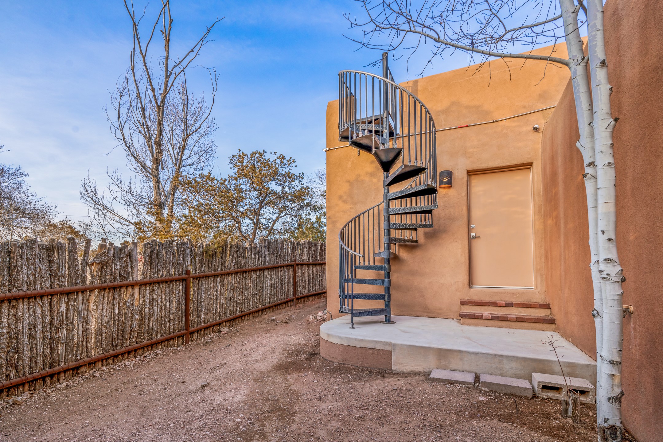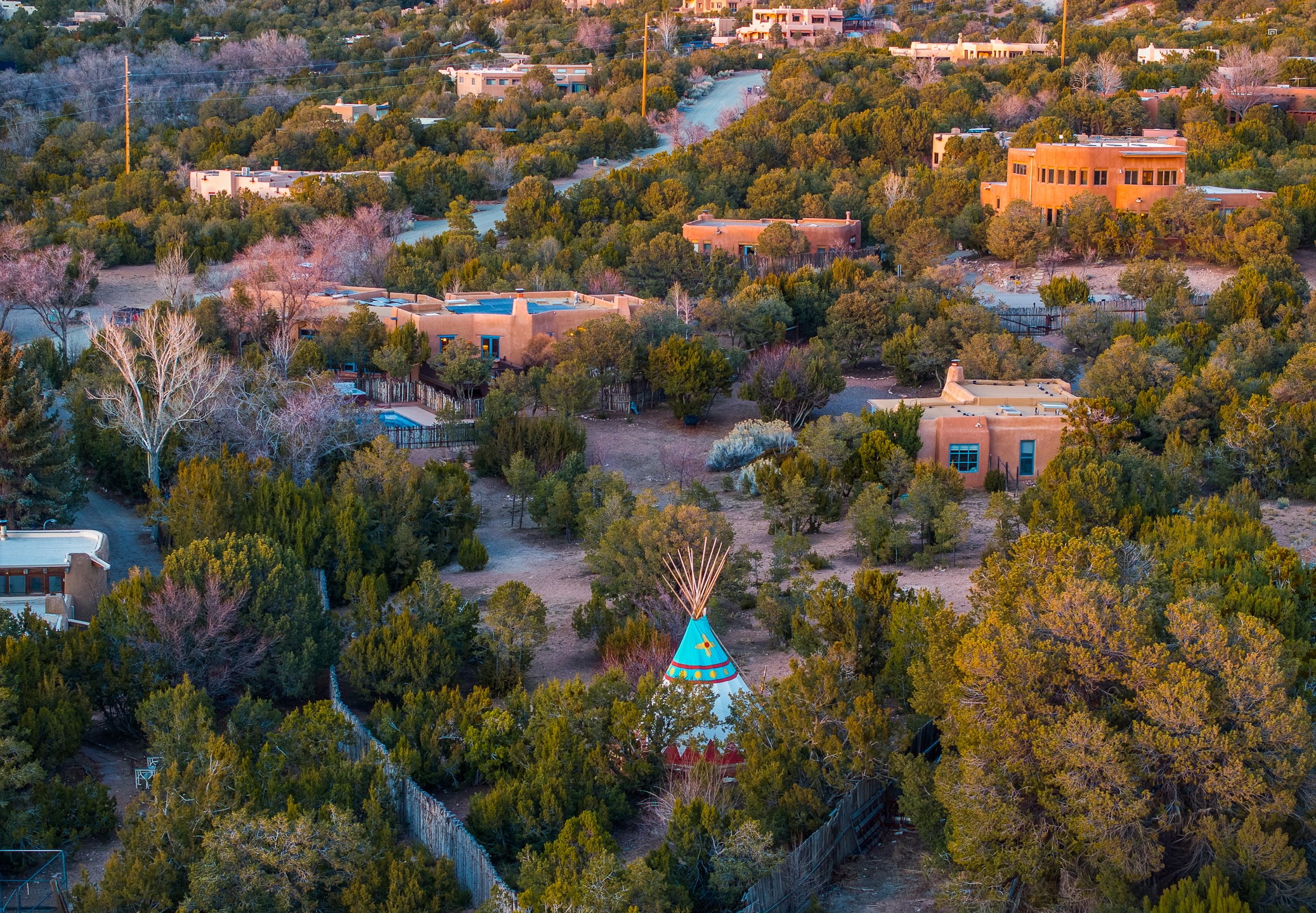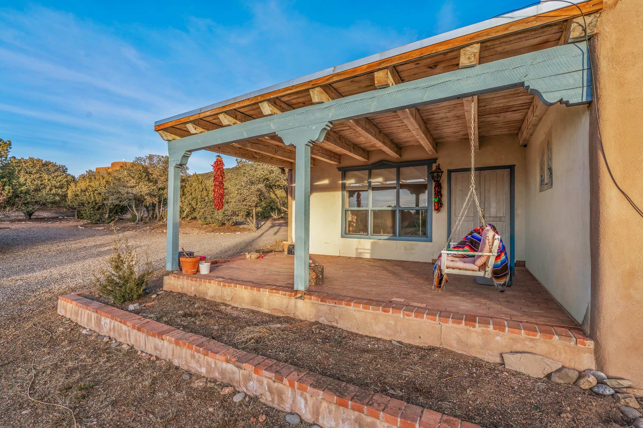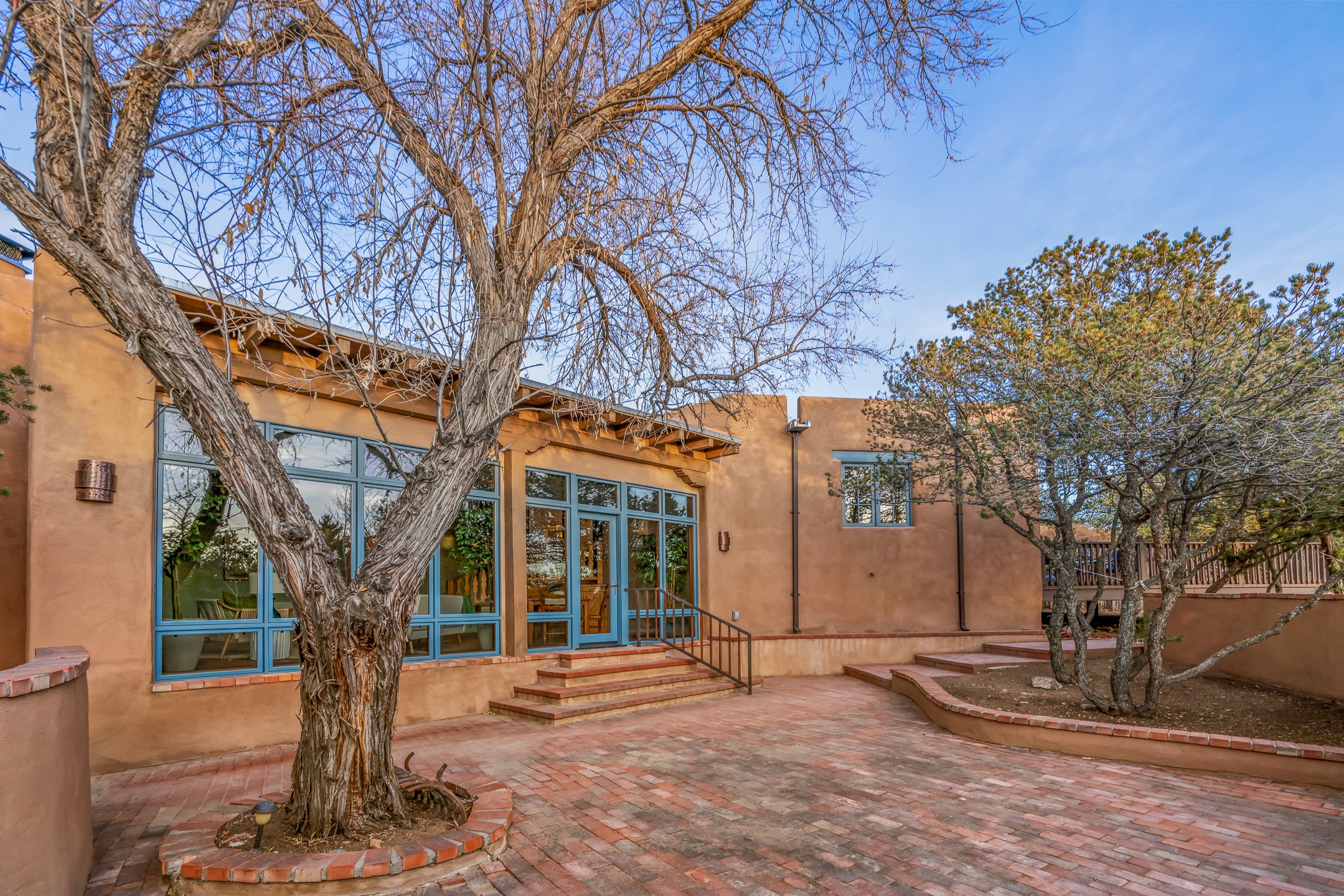 1300 Lejano Lane is a timeless Santa Fe retreat blending classic adobe charm with exceptional indoor-outdoor living. The 2,904-square-foot main residence, constructed of adobe and frame, showcases rich architectural detail and inviting spaces designed for both relaxation and entertaining. The spacious living room features knotty pine wood floors, exposed vigas, and a dramatic kiva fireplace, opening seamlessly to the kitchen. Just beyond, an outdoor deck overlooks the heated pool and hot tub, creating an effortless flow for gatherings. A separate dining room connects to the private guest wing and a light-filled sunroom with brick floors, beamed ceiling, kiva fireplace, and French doors leading to a bricked patio. The primary suite is a true sanctuary, complete with its own Owner's Lounge and kiva fireplace, Douglas fir floors, French doors to an enclosed patio, walk-in closet, double-sink vanity, walk-in shower, and mini-split for year-round comfort. The ensuite guest bedroom also offers a kiva fireplace and French doors to the back patio, near an exterior spiral staircase leading to a rooftop deck. A heated art studio/bonus room with cabinetry, utility sink and private entrance connects to the oversized two-car garage, offering ideal flex space for a gym or creative studio. The beautifully landscaped grounds include brick and natural landscaping, an orchard with apple, pear, apricot, cherry, and a jujube tree, plus two 2,500-gallon water catchment systems irrigating aspens and fruit trees. The heated pool (approx. 15' x 33') ranges from 3.5 to 8.5 feet deep. A charming teepee adds character. A separate all-adobe guesthouse, with it's own private gated entry, features vigas, Saltillo tile, kiva fireplace, full kitchen, dedicated laundry, one bedroom, and a full bath, perfect for guests or rental potential.