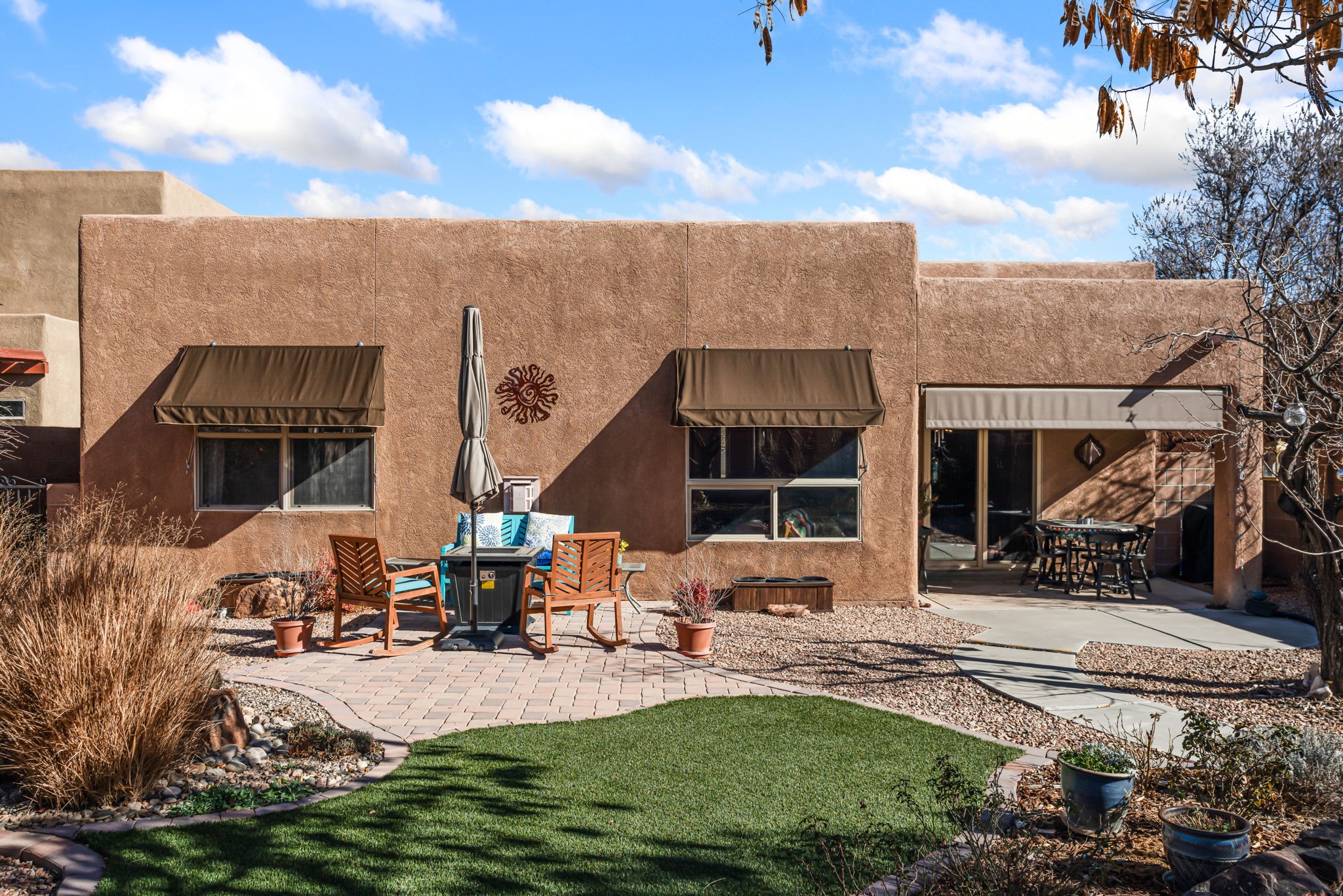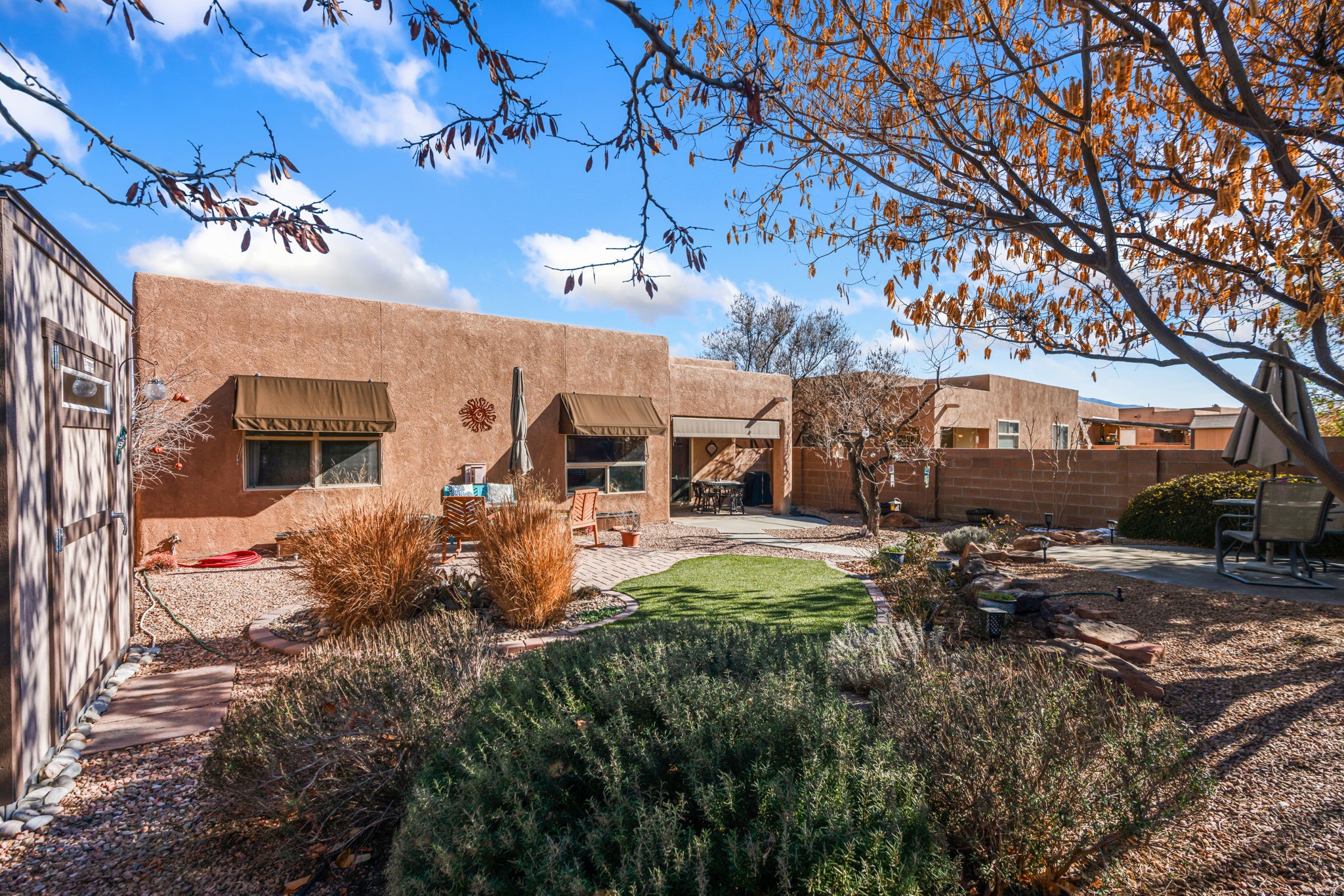 Welcome to this beautifully maintained single-story home in the sought after Vista Del Norte neighborhood offering 4 spacious bedrooms and an ideal floor plan with wonderful bedroom separation for added privacy and comfort. Luxury vinyl flooring flows throughout the main living areas and berooms, combining durability with a modern, upscale feel. The heart of the home is the gorgeous kitchen, featuring rich granite countertops, abundant cabinetry, and upgraded stainless steel appliances -- including the refrigerator. It's a space designed for both everyday living and effortless entertaining. The inviting great room is anchored by a cozy gas fireplace, creating a warm and welcoming atmosphere for relaxing evenings at home. Natural light pours in through the Pella sliding door, which opens seamlessly to a beautifully landscaped backyard. Step outside to enjoy a private outdoor retreat complete with mature landscaping, a convenient storage shed, stylish window awnings, and roll-down sunshades for added comfort and energy efficiency -- perfect for enjoying New Mexico's sunny days. Major systems have been thoughtfully updated, including a new HVAC system with smart thermostat and a new water heater installed in 2022, giving you peace of mind and modern efficiency.