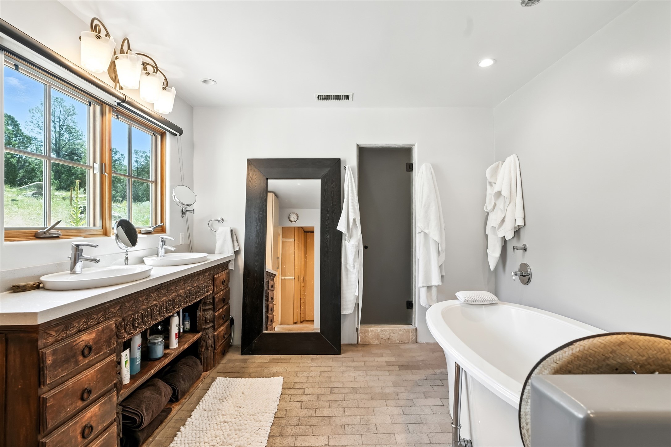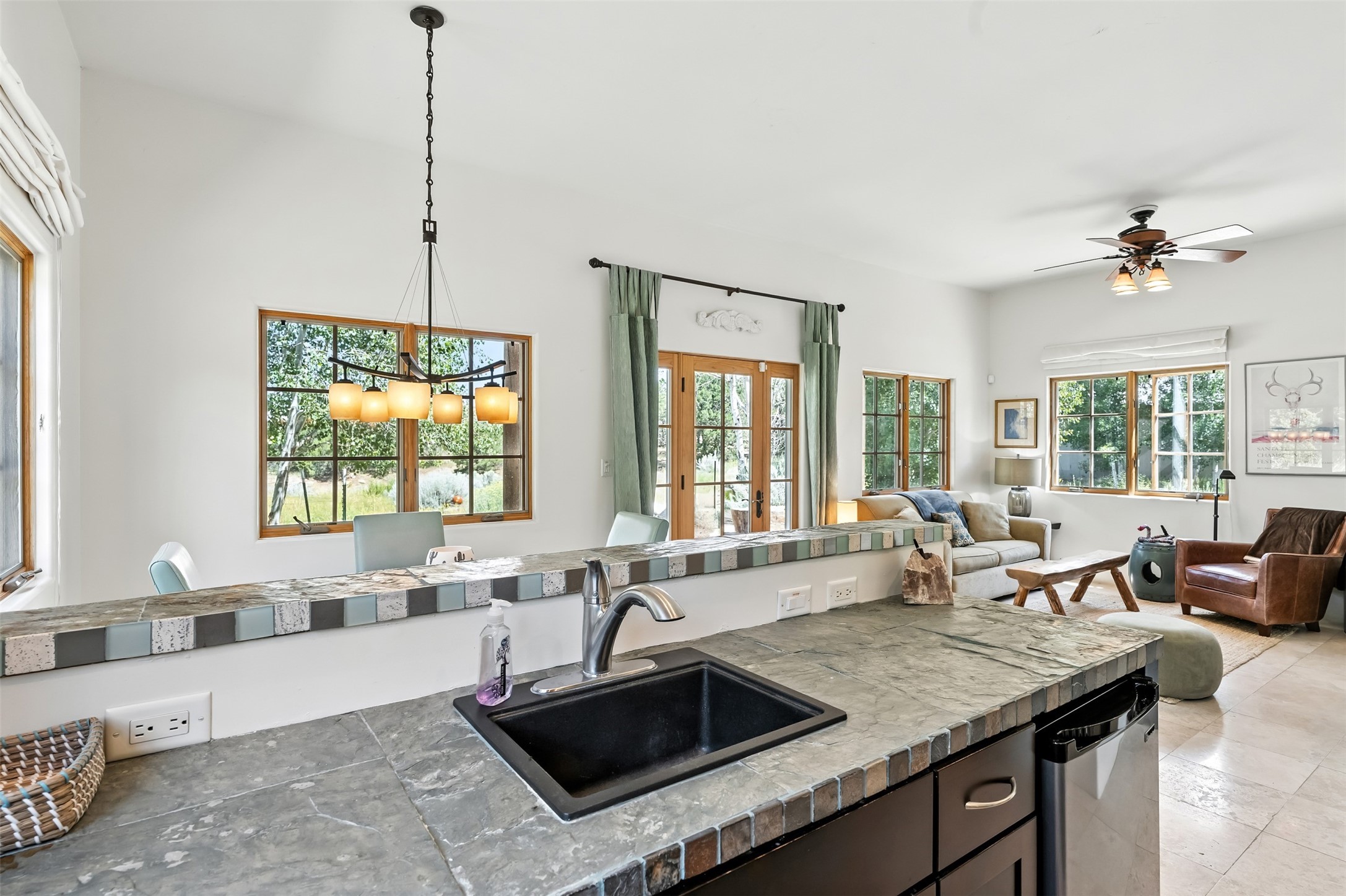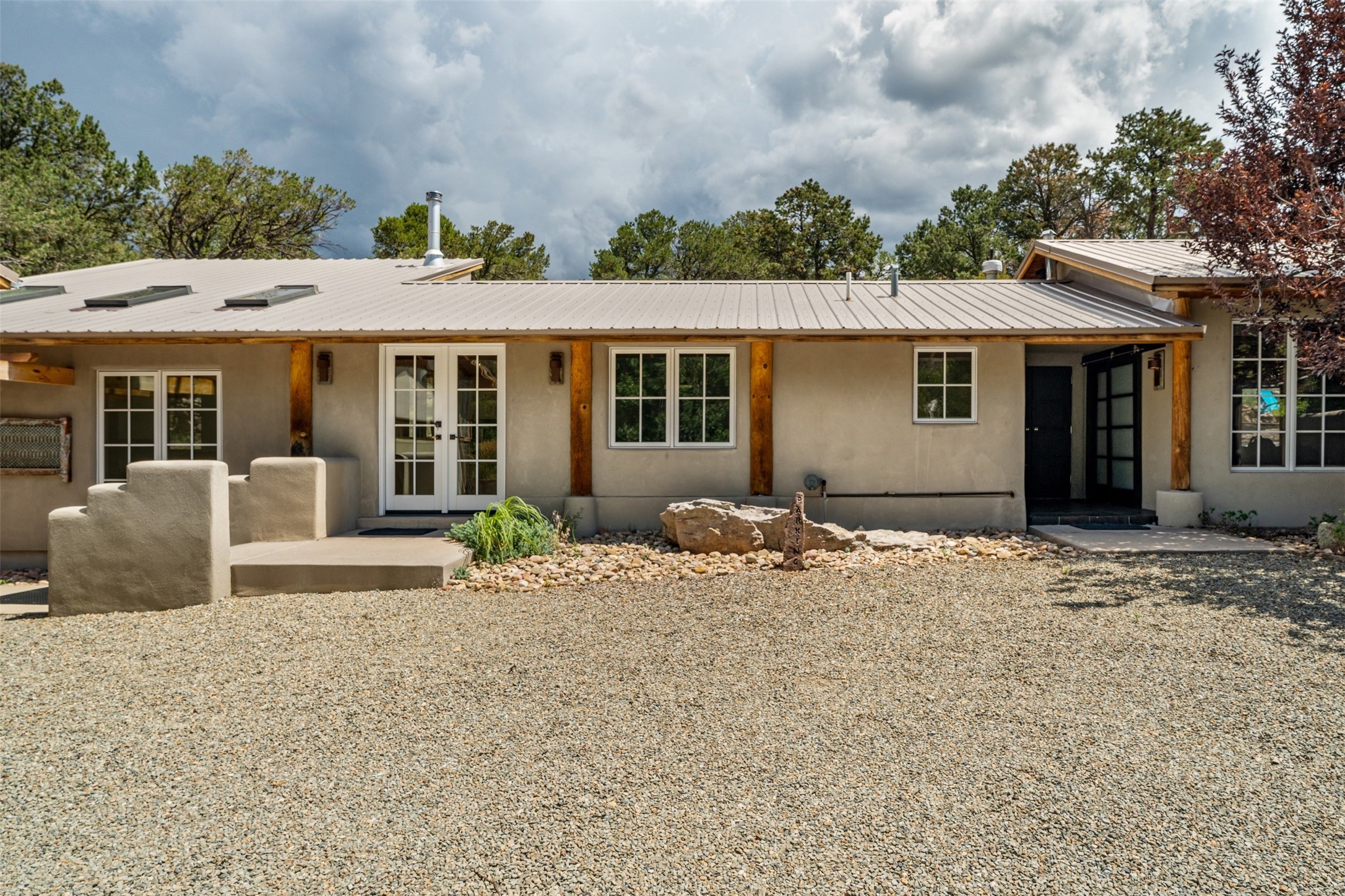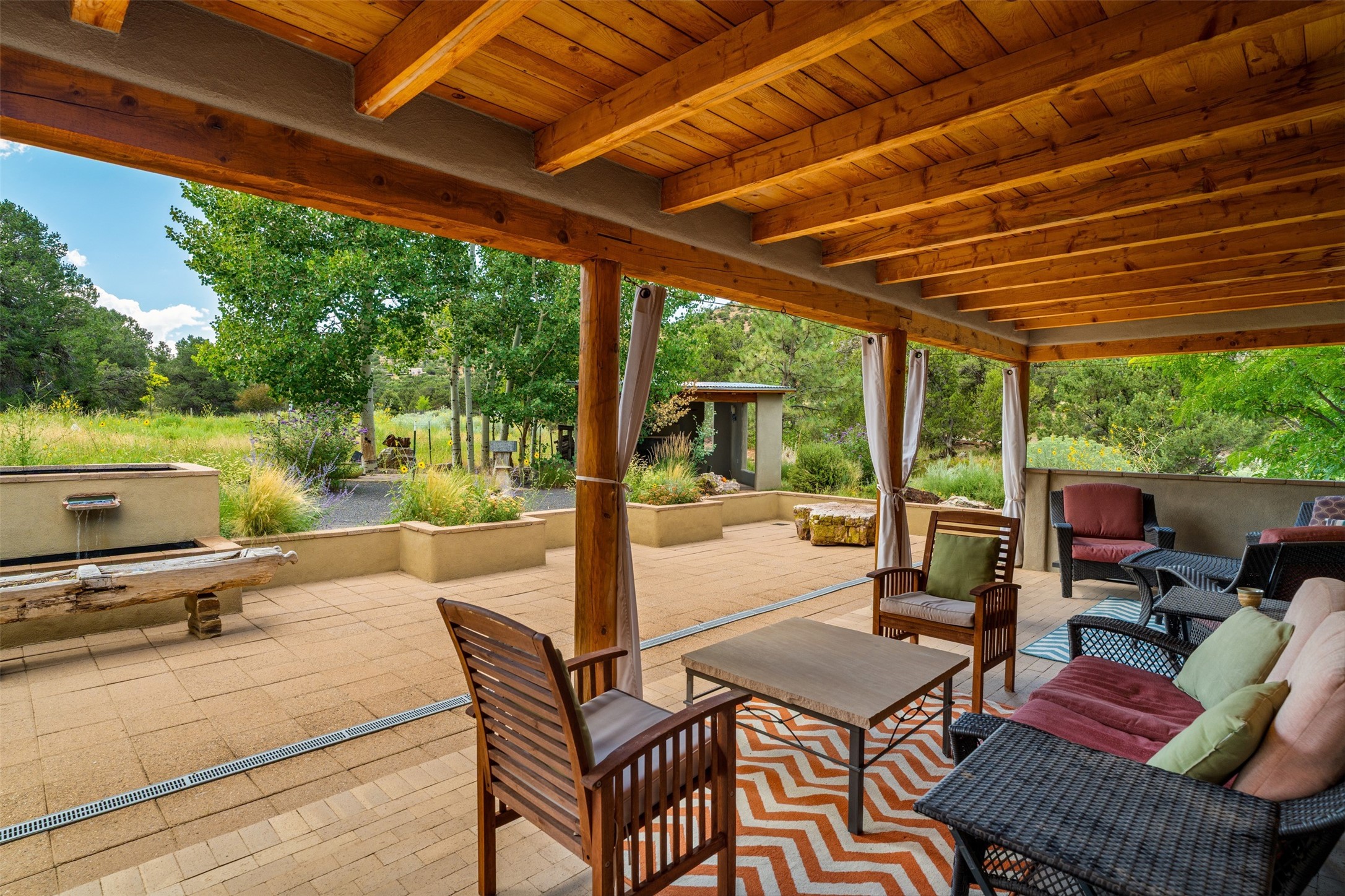 LIVE, WORK, ENTERTAIN, in your own secluded sanctuary located on 7.08 Sunlit Hills acres. 10 Sabina Lane is a sophisticated & contemporary COMPOUND offering a wide variety of living & working spaces in a stunning pastoral setting, 15 minutes from Santa Fe. MAIN HOUSE - 2,187sqft open concept Great Room w/beamed cathedral ceiling, fireplace, Chef's kitchen w/granite counters, high end appliances, 2 spacious bedrooms w/en suite bathrooms, laundry area, 5 sets of French door leading to 58 foot long covered portal. GUEST SUITE - 530sqft is steps from the main house & offers an inviting bedroom, spa inspired bathroom, custom tiles, soaking tub, is adjoined by a private tranquil terrace. STUDIO/OFFICE - 994sqft amazing work space with vaulted ceiling, view windows, areas for an office, art or other work related spaces, powder room & covered portal entry. One would never need to leave the property to conduct all their business or artistic work. CASITA - 683sqft Set apart from the main house, the casita has a full kitchen w/stone counters, kiva fireplace, covered portal, stackable washer/dryer. The casita has produced additional income as an Air B&B GARAGE - 60 sqft Fully finished, 2car capacity, storage areas. GAZEBO -196sqft An inviting space away from the home for meditation & relaxation. PAVILION -241sqft Wonderful retreat area w/fireplace, banco seating, ceiling fan, designer lighting. The property is accessed through a gated entry, a graveled driveway w/recently added retaining wall. Many additional aspects - electric convection stove top, extensive & significant landscaping,10 zone irrigation system,2 owned propane tanks (500 and 250 gallons), 5 fireplaces, an amazing flower filled meadow, healthy pinon, aspen and juniper trees, eclectic river rock pylons, antique wooden bathroom cabinet, a wealth of ceiling fans & mini split in the primary bedroom. For folks seeking a destination, full time live/work situation, please consider 10 Sabina Lane.