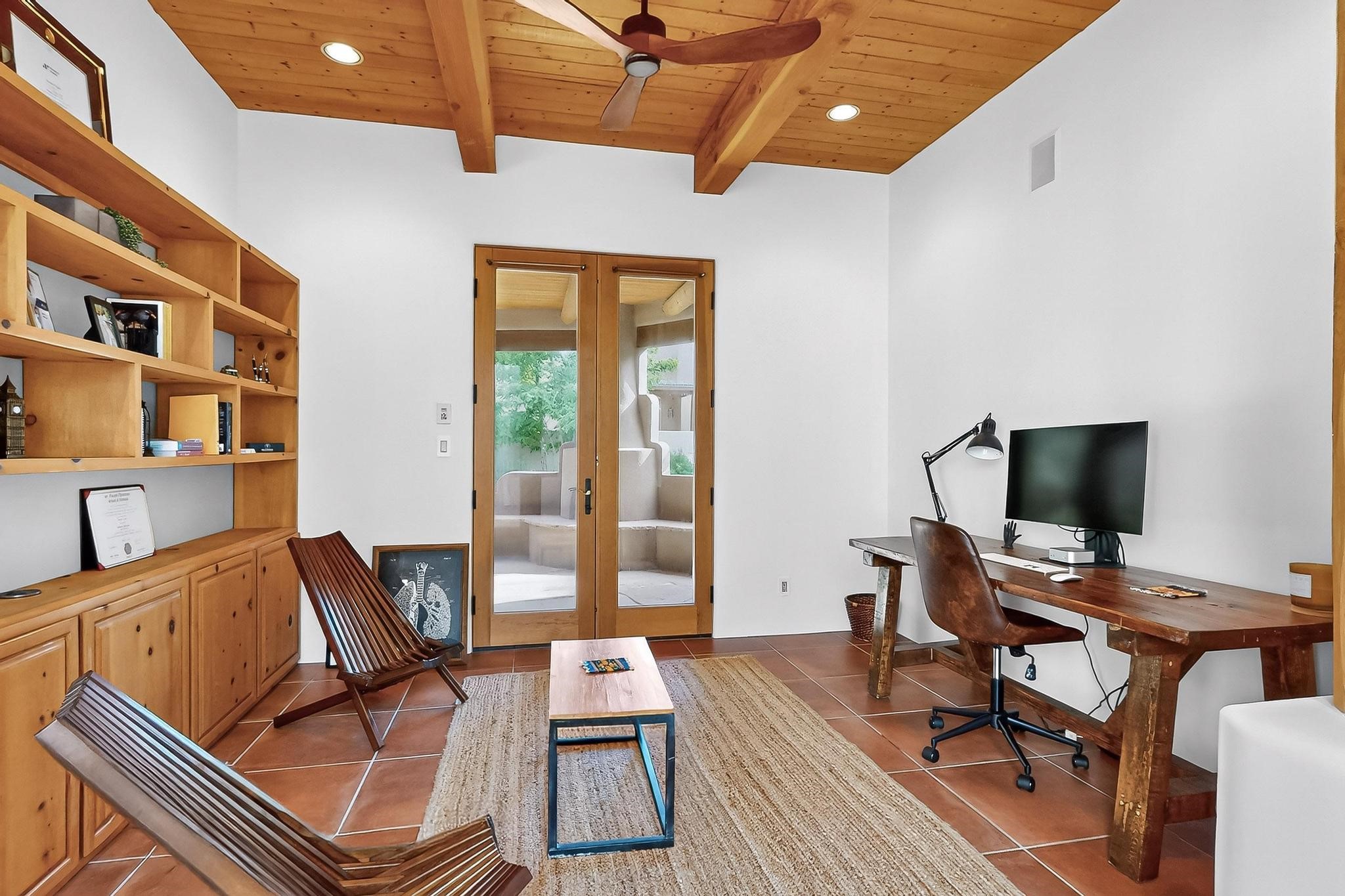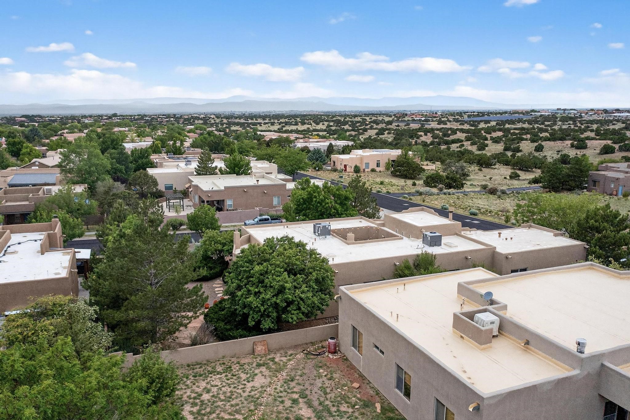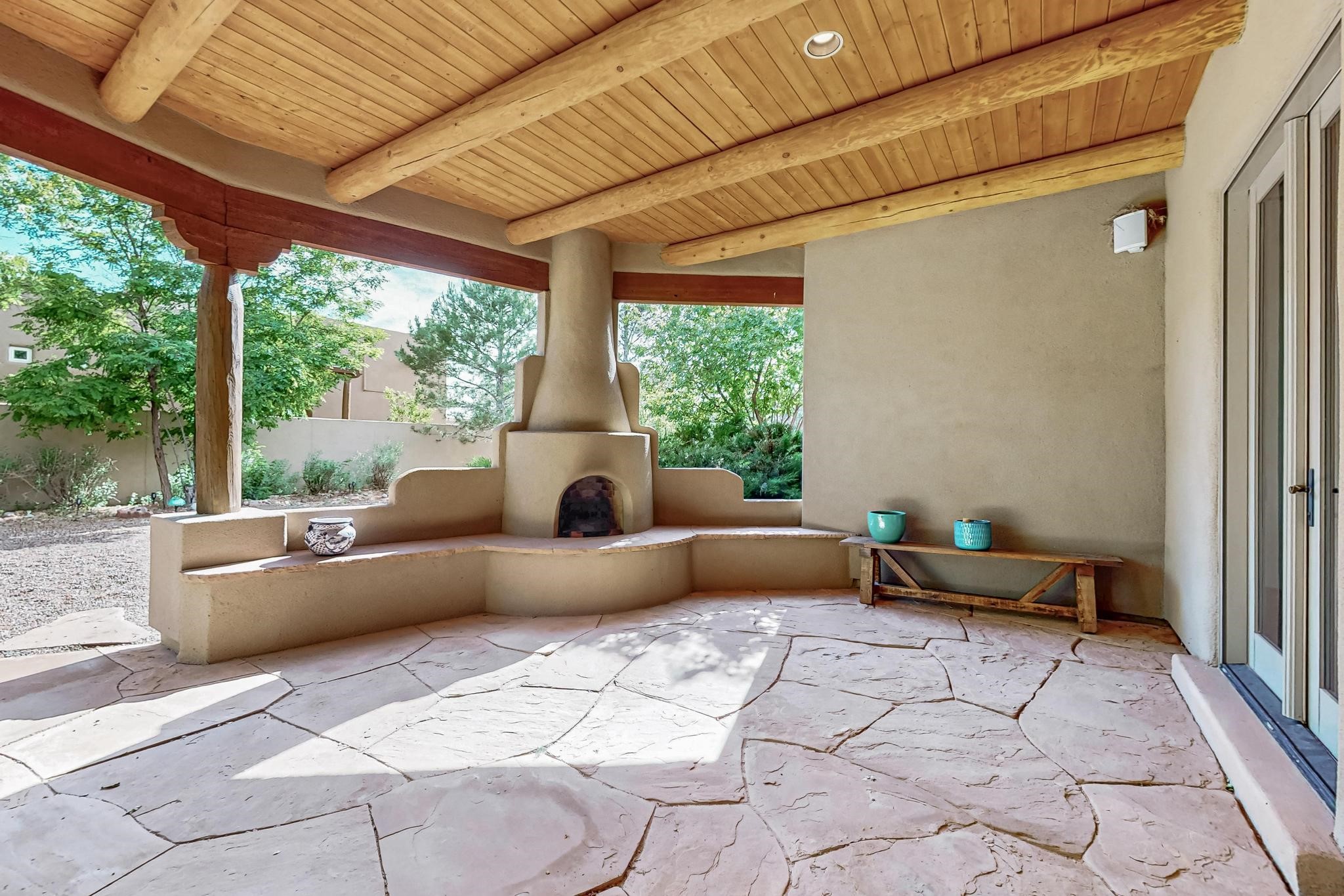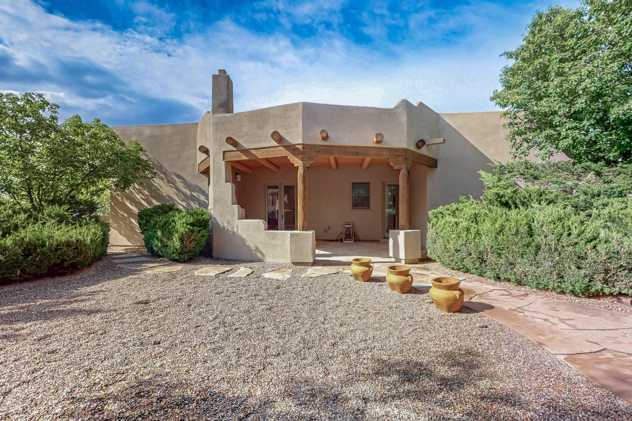 This stunning home in the highly desirable Rancho Viejo community is truly something special! Formerly a Parade of Homes model, this unique floor plan is one of only a few in the neighborhood. From the moment you walk in, you're welcomed by a warm foyer with carved vigas that opens into a breathtaking living space. Soaring 14-foot tongue-and-groove ceilings, exposed beams, a built-in bookcase, and a classic kiva fireplace create an inviting atmosphere filled with natural light from expansive windows. The entire interior was freshly painted in 2023, giving the home a clean, updated feel. The chef's kitchen is as functional as it is beautiful, featuring high-end appliances, dual convection ovens, and easy access to outdoor living spaces--perfect for entertaining. At the center of the home, you'll find a peaceful flagstone patio with its own kiva fireplace, accessible from four different doors. It's the perfect setup for gatherings, relaxing evenings, or simply enjoying the New Mexico sunshine. Comfort and efficiency shine here, too. Two zoned combo heating and cooling systems (installed in 2023), smart thermostats, and radiant heated floors throughout the entire home ensure year-round comfort. You'll also love the whole-house built-in audio system, Tesla charging station, and custom solid wood doors that add warmth and authenticity to every space. The exterior stucco was replaced in 2021, bedroom flooring has been recently upgraded, and the home features a built-in rainwater collection system with an underground cistern, water pump, and spout--thoughtfully designed for sustainability.A private office tucked away near the primary suite offers built-in cabinetry and shelving, making it ideal for remote work or creative projects. And don't miss the rear patio--complete with a kiva fireplace, gas line ready for your grill, and beautiful viga-accented tongue-and-groove ceilings--extending the home's Southwestern charm outdoors.