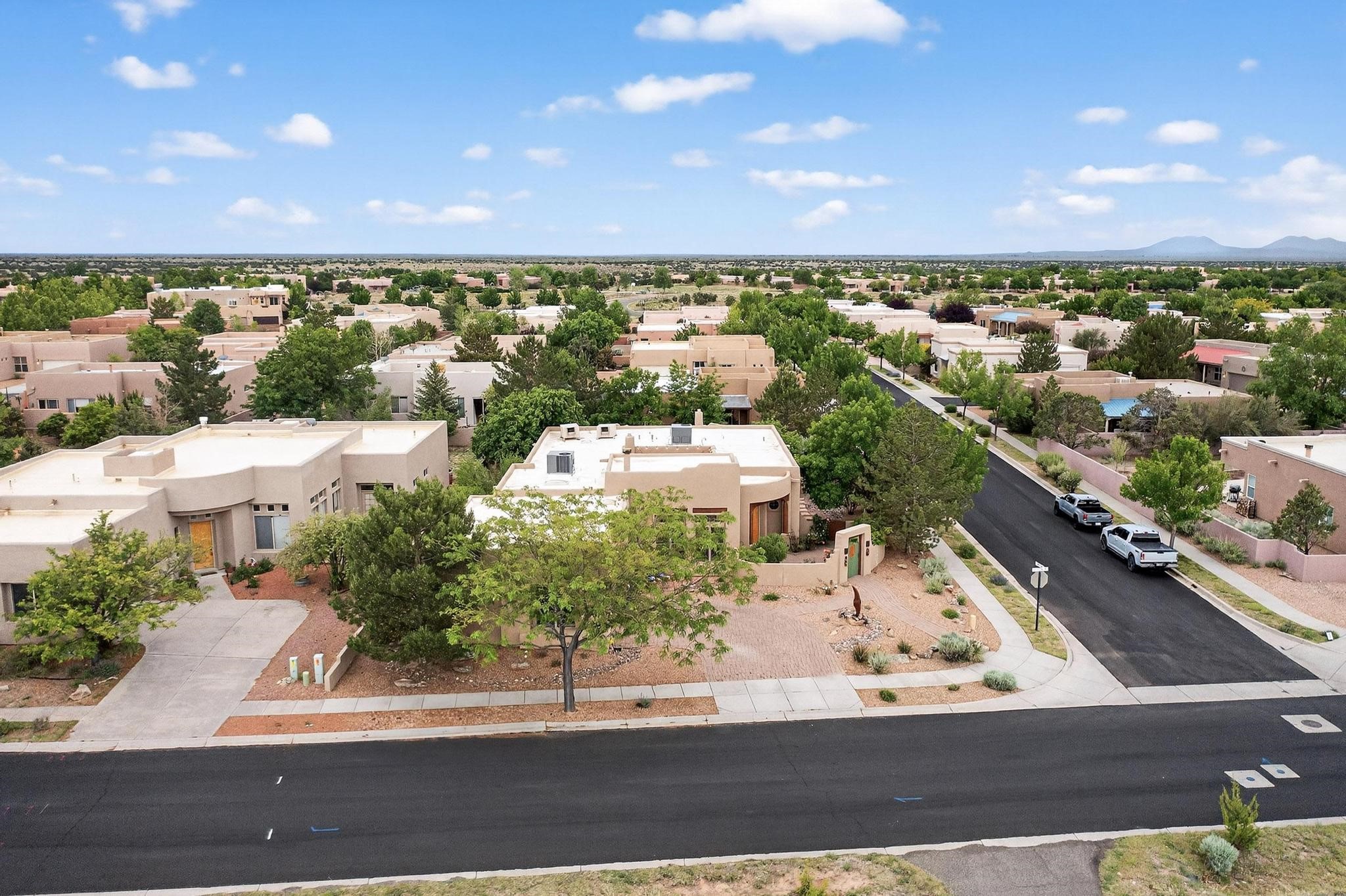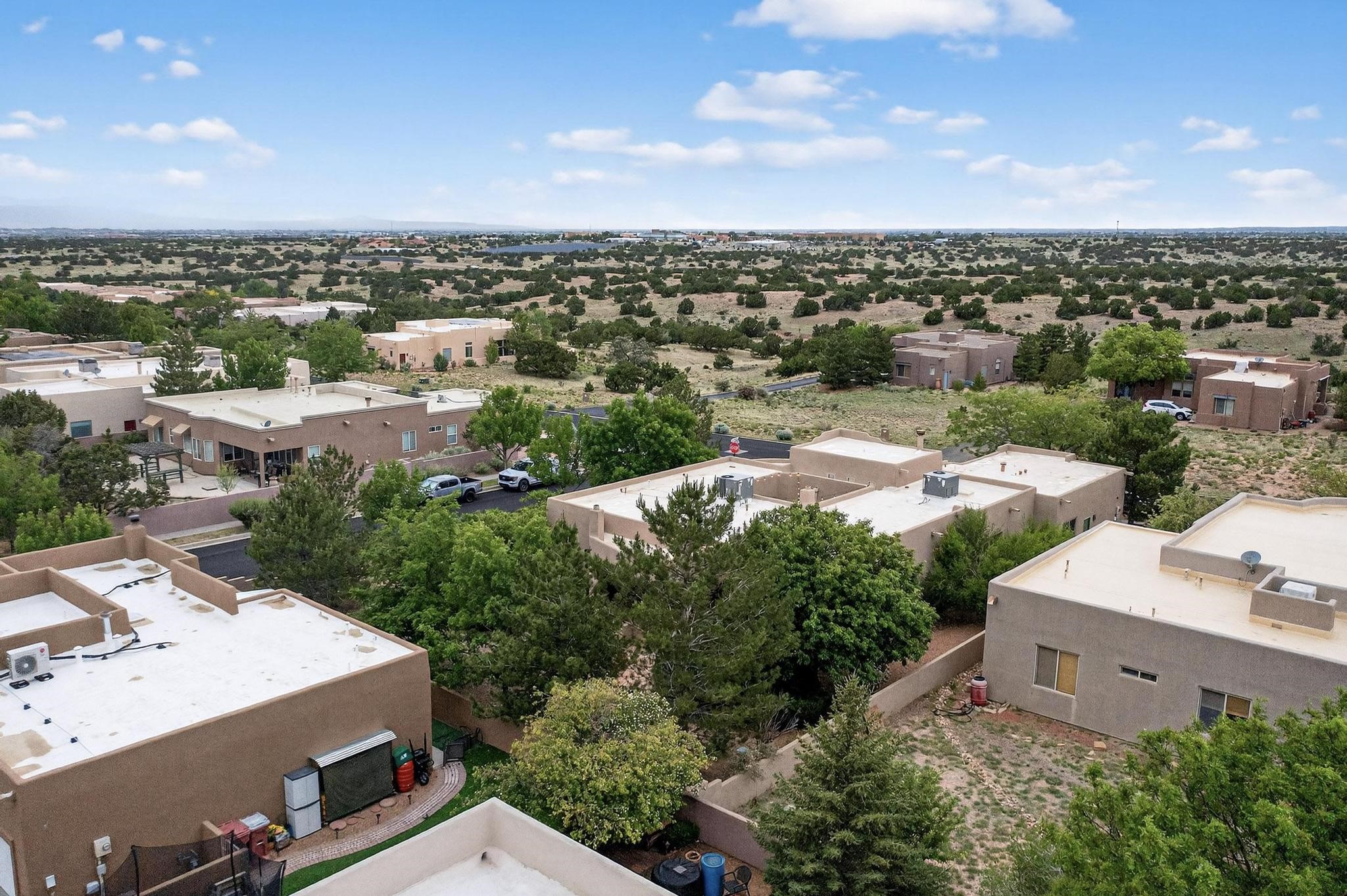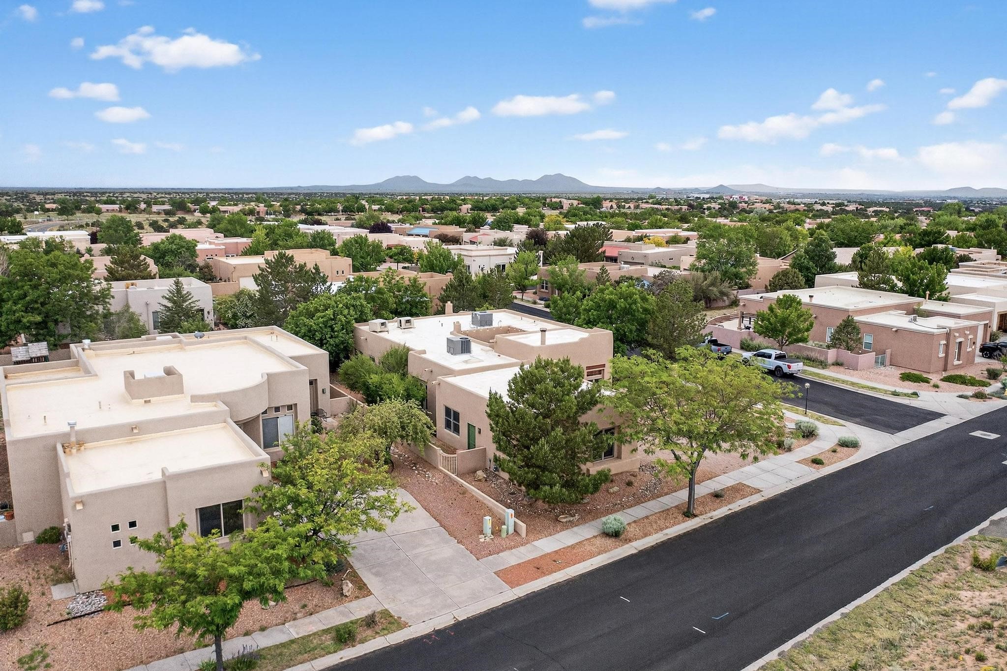 This stunning home in the highly desirable Rancho Viejo community is truly something special! Formerly a Parade of Homes model, this unique floor plan is one of only a few in the neighborhood. From the moment you walk in, you're welcomed by a warm foyer with carved vigas that opens into a breathtaking living space. Soaring 14-foot tongue-and-groove ceilings, exposed beams, a built-in bookcase, and a classic kiva fireplace create an inviting atmosphere filled with natural light from expansive windows. The entire interior was freshly painted in 2023, giving the home a clean, updated feel. The chef's kitchen is as functional as it is beautiful, featuring high-end appliances, dual convection ovens, and easy access to outdoor living spaces--perfect for entertaining. At the center of the home, you'll find a peaceful flagstone patio with its own kiva fireplace, accessible from four different doors. It's the perfect setup for gatherings, relaxing evenings, or simply enjoying the New Mexico sunshine. Comfort and efficiency shine here, too. Two zoned combo heating and cooling systems (installed in 2023), smart thermostats, and radiant heated floors throughout the entire home ensure year-round comfort. You'll also love the whole-house built-in audio system, Tesla charging station, and custom solid wood doors that add warmth and authenticity to every space. The exterior stucco was replaced in 2021, bedroom flooring has been recently upgraded, and the home features a built-in rainwater collection system with an underground cistern, water pump, and spout--thoughtfully designed for sustainability.A private office tucked away near the primary suite offers built-in cabinetry and shelving, making it ideal for remote work or creative projects. And don't miss the rear patio--complete with a kiva fireplace, gas line ready for your grill, and beautiful viga-accented tongue-and-groove ceilings--extending the home's Southwestern charm outdoors.