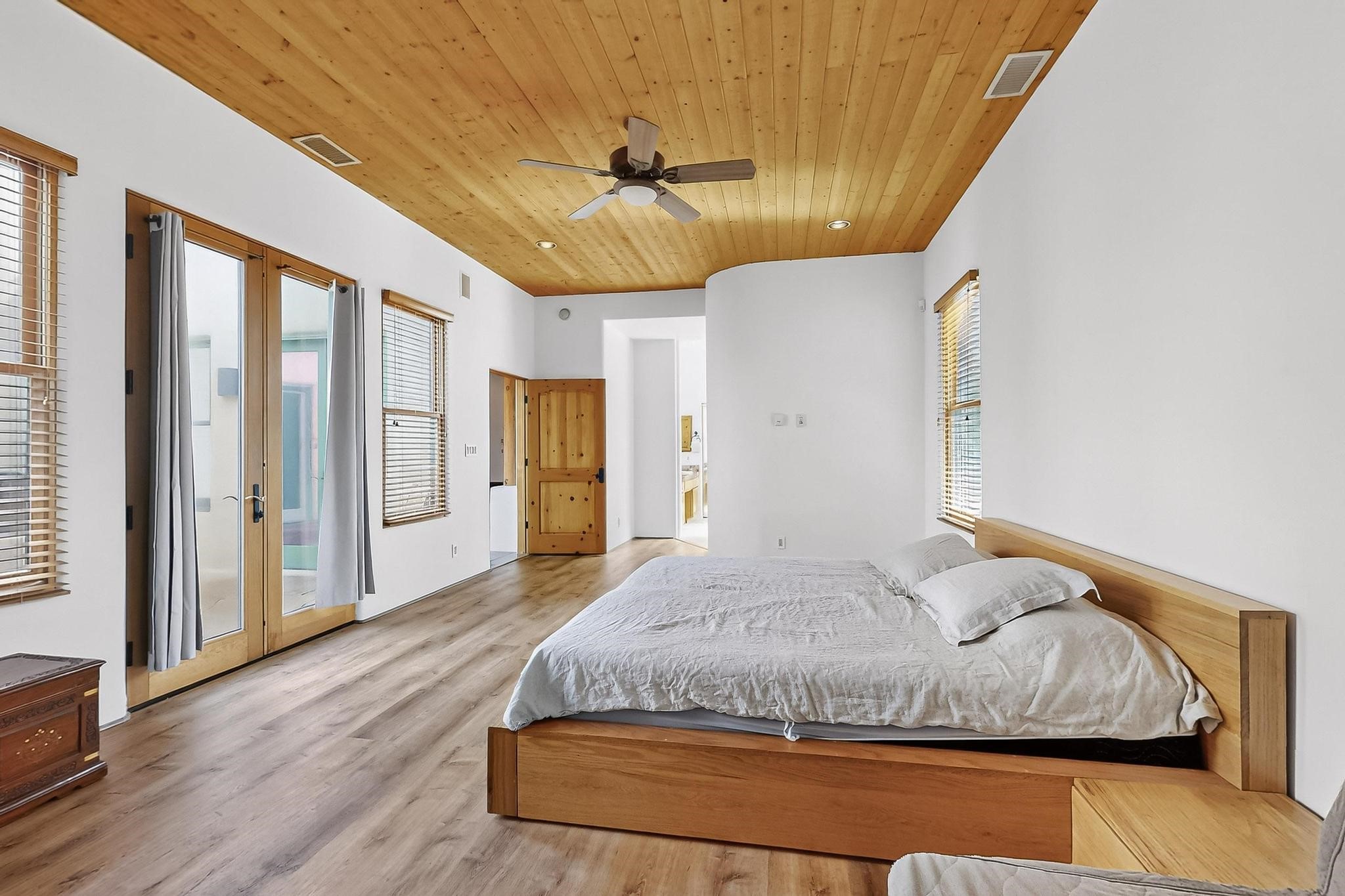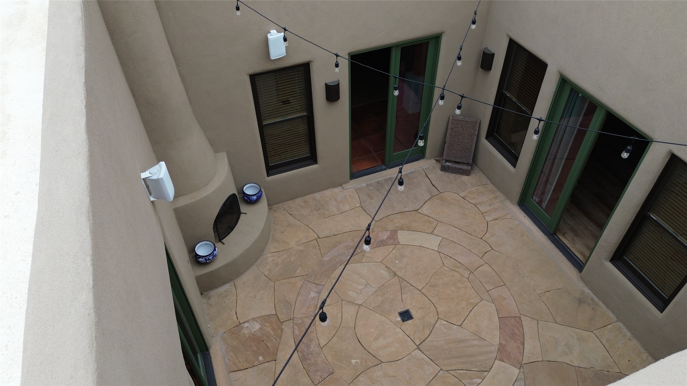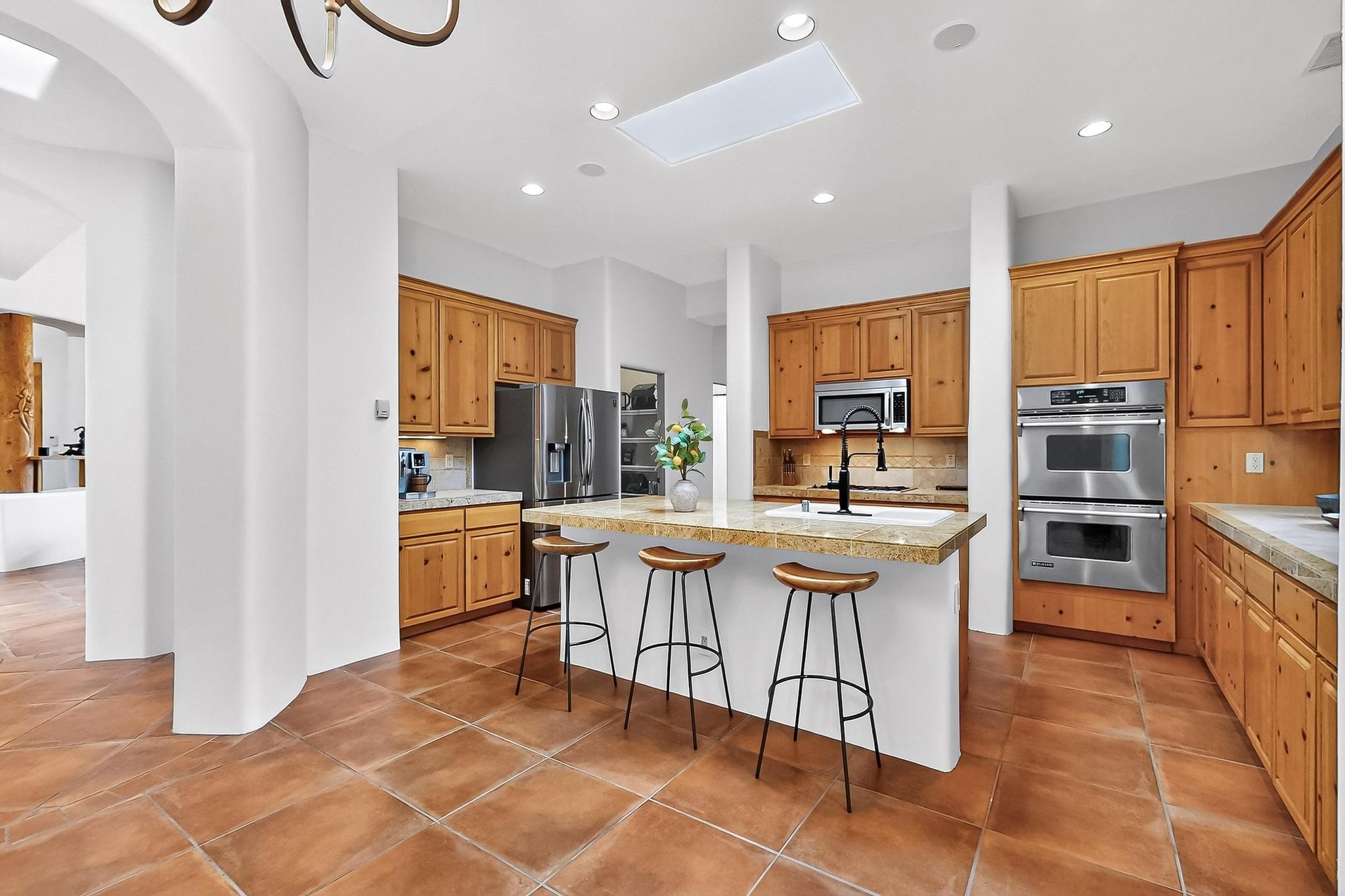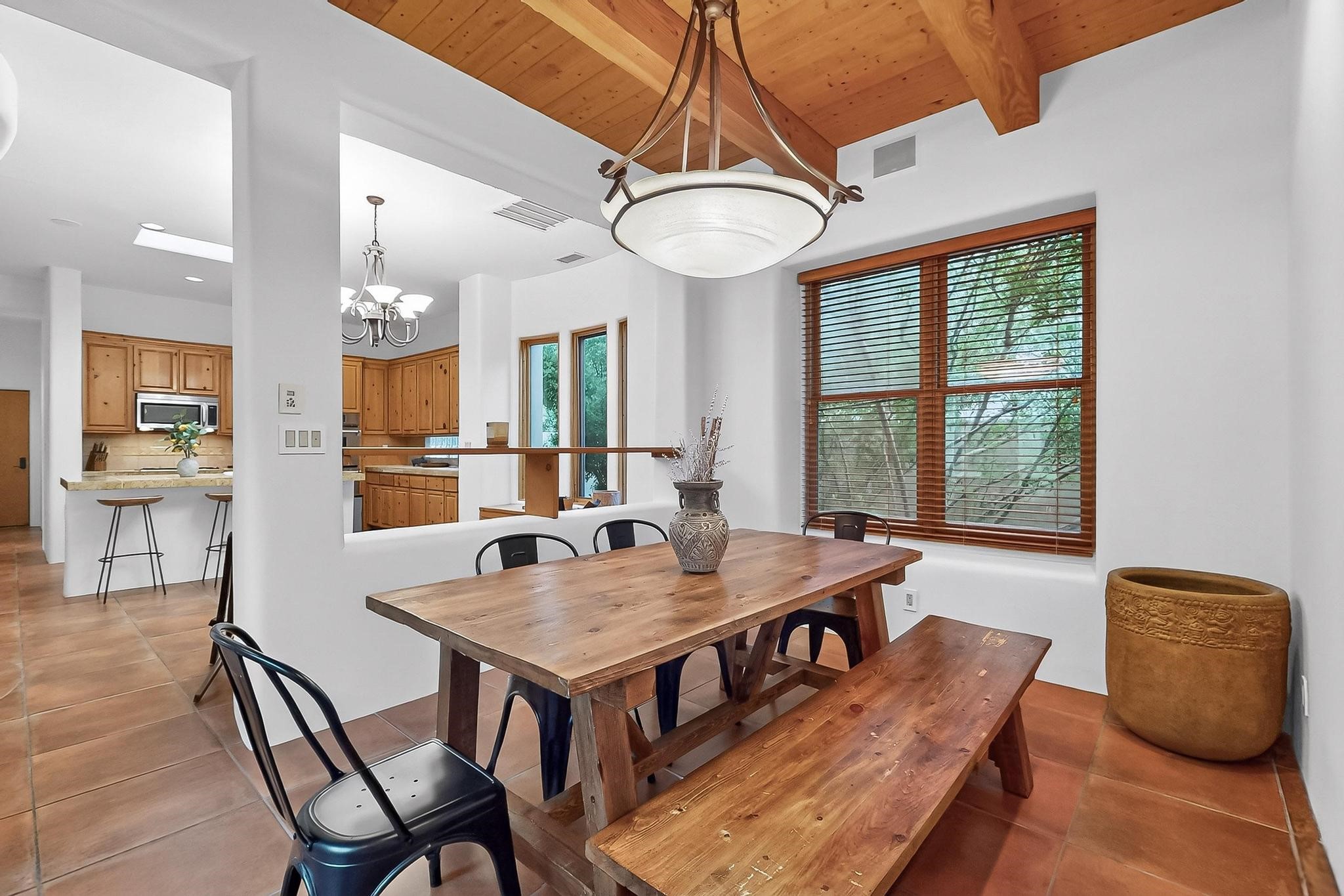 This stunning home in the highly desirable Rancho Viejo community is truly something special! Formerly a Parade of Homes model, this unique floor plan is one of only a few in the neighborhood. From the moment you walk in, you're welcomed by a warm foyer with carved vigas that opens into a breathtaking living space. Soaring 14-foot tongue-and-groove ceilings, exposed beams, a built-in bookcase, and a classic kiva fireplace create an inviting atmosphere filled with natural light from expansive windows. The entire interior was freshly painted in 2023, giving the home a clean, updated feel. The chef's kitchen is as functional as it is beautiful, featuring high-end appliances, dual convection ovens, and easy access to outdoor living spaces--perfect for entertaining. At the center of the home, you'll find a peaceful flagstone patio with its own kiva fireplace, accessible from four different doors. It's the perfect setup for gatherings, relaxing evenings, or simply enjoying the New Mexico sunshine. Comfort and efficiency shine here, too. Two zoned combo heating and cooling systems (installed in 2023), smart thermostats, and radiant heated floors throughout the entire home ensure year-round comfort. You'll also love the whole-house built-in audio system, Tesla charging station, and custom solid wood doors that add warmth and authenticity to every space. The exterior stucco was replaced in 2021, bedroom flooring has been recently upgraded, and the home features a built-in rainwater collection system with an underground cistern, water pump, and spout--thoughtfully designed for sustainability.A private office tucked away near the primary suite offers built-in cabinetry and shelving, making it ideal for remote work or creative projects. And don't miss the rear patio--complete with a kiva fireplace, gas line ready for your grill, and beautiful viga-accented tongue-and-groove ceilings--extending the home's Southwestern charm outdoors.