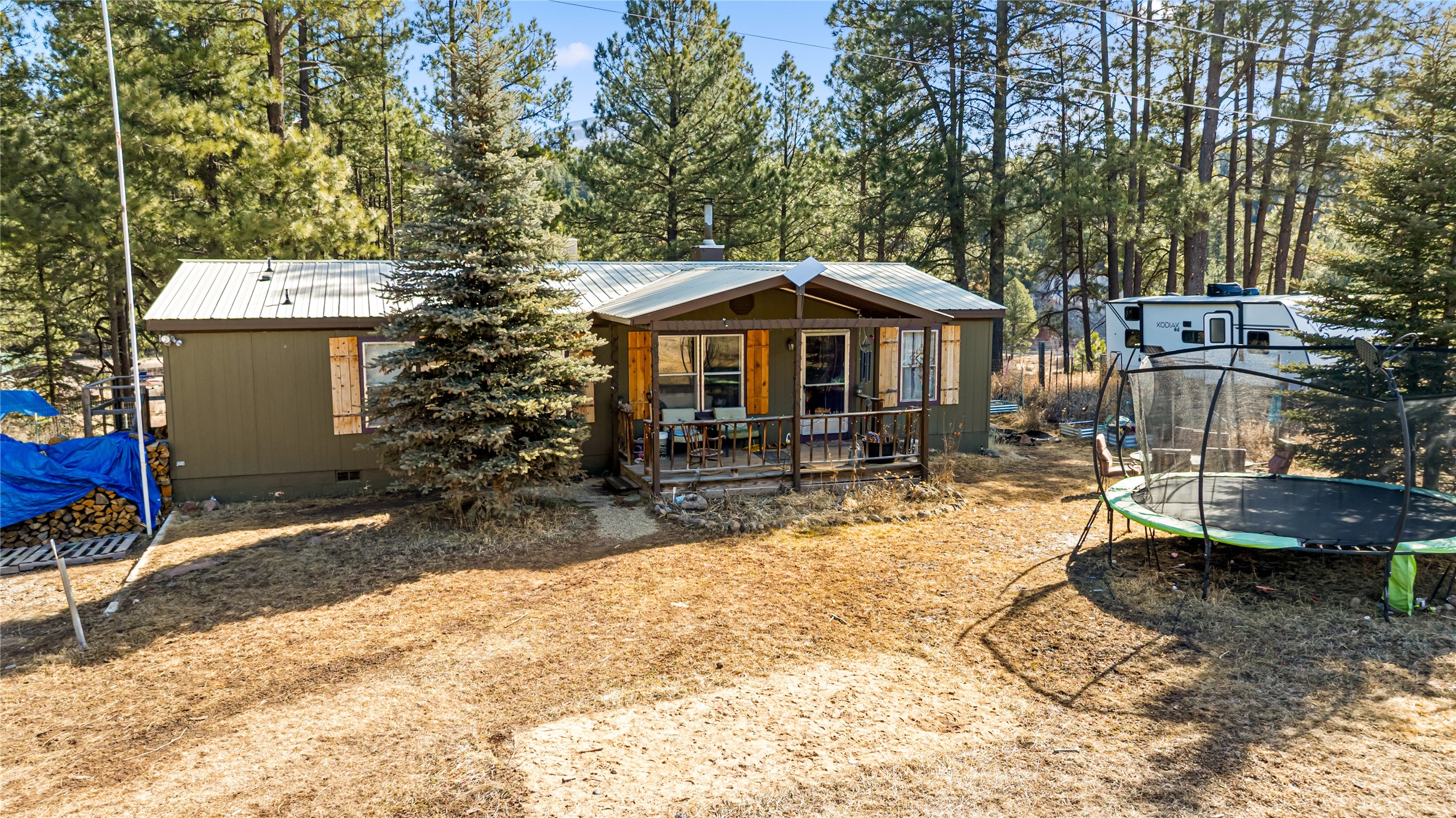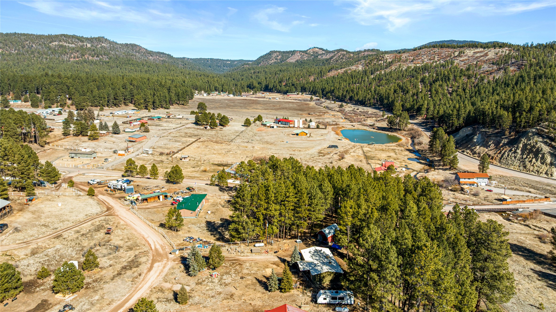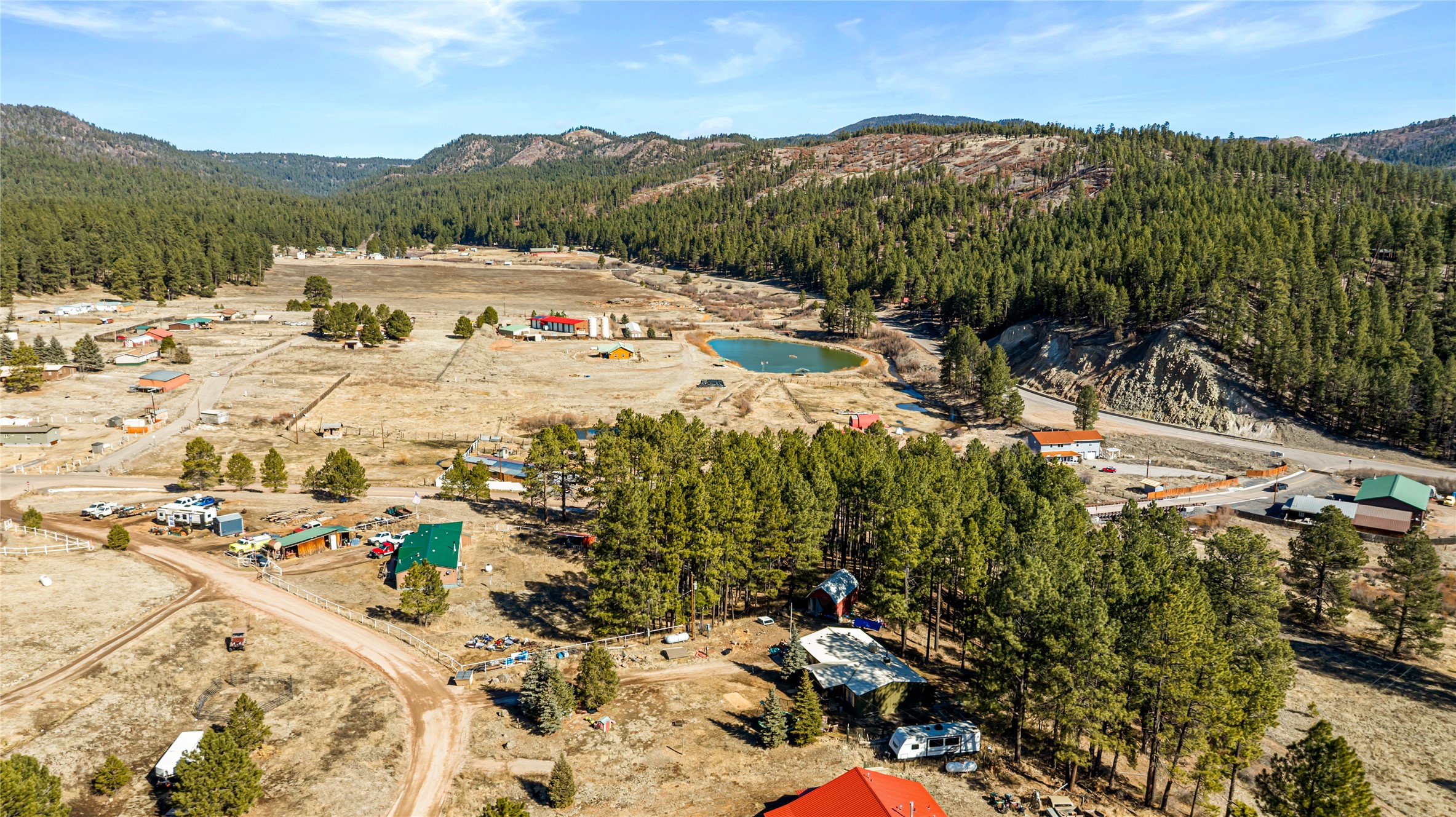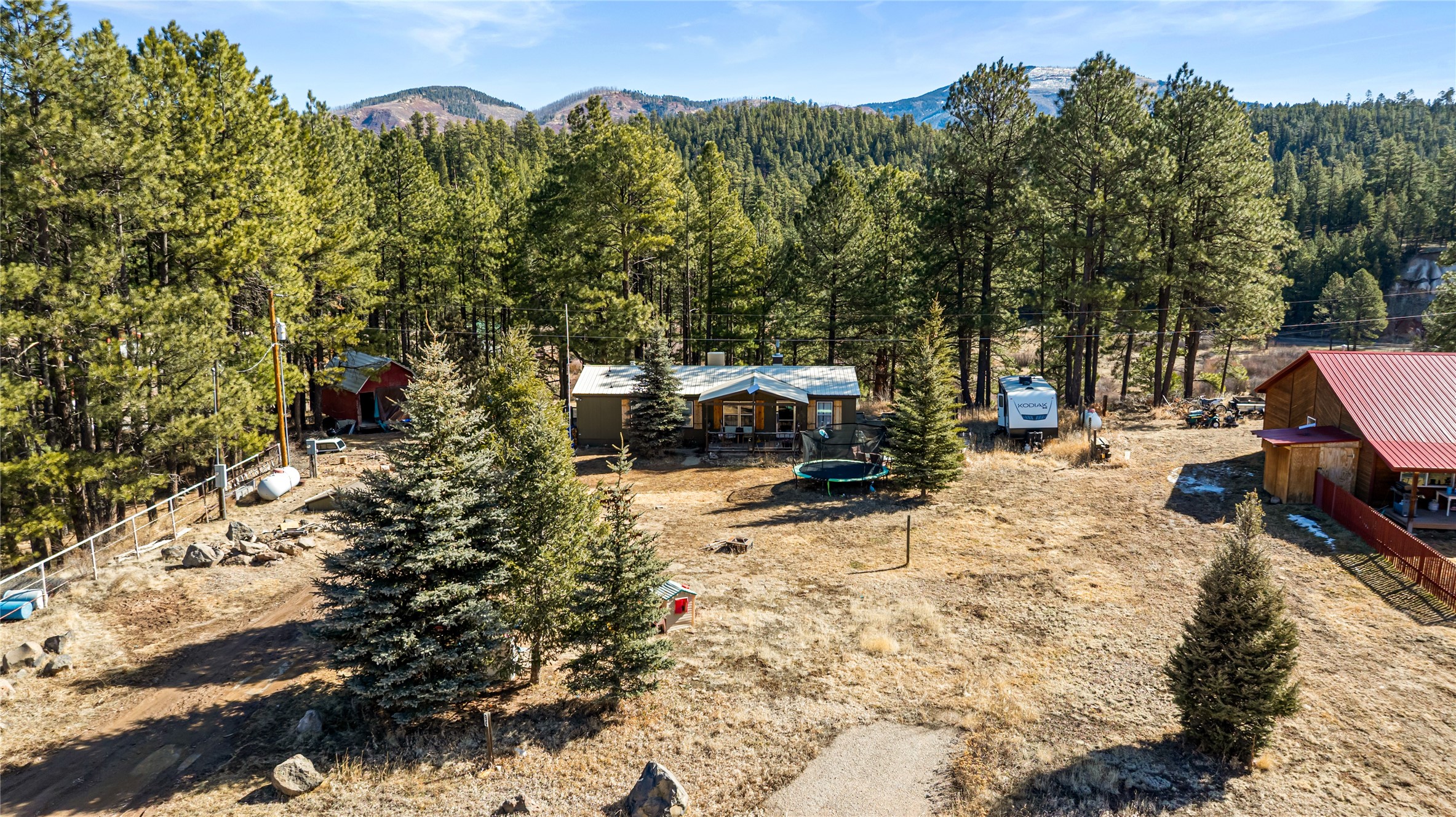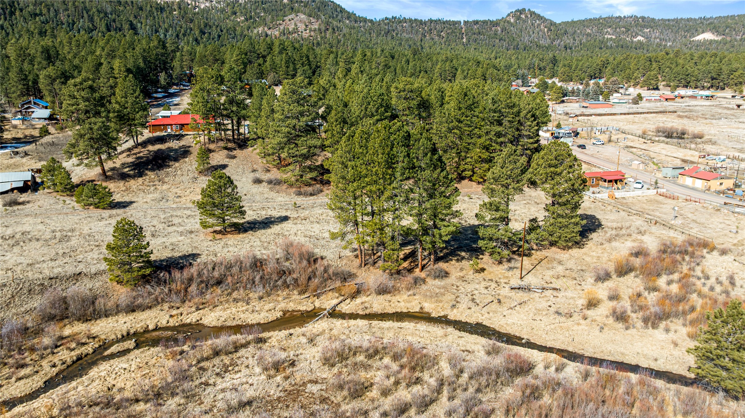 Fabulous Views, Easy Access, and a Great Location! Nestled in the tight-knit community of La Cueva, this home sits on a .84-acre lot overlooking the San Antonio Creek, surrounded by pine trees and nature. The east side of the property backs National Forest. The master bedroom is situated on one side of the home, with two additional bedrooms on the opposite end. Two full baths, including a relaxing garden tub. Open concept living with an efficient fireplace for cozy evenings at home. Country kitchen with plenty of counter space and an attached laundry room/pantry. Fishing and hiking right out your back door! Easy year-round access on a county-maintained road and a reasonable 40-minute commute to Los Alamos.