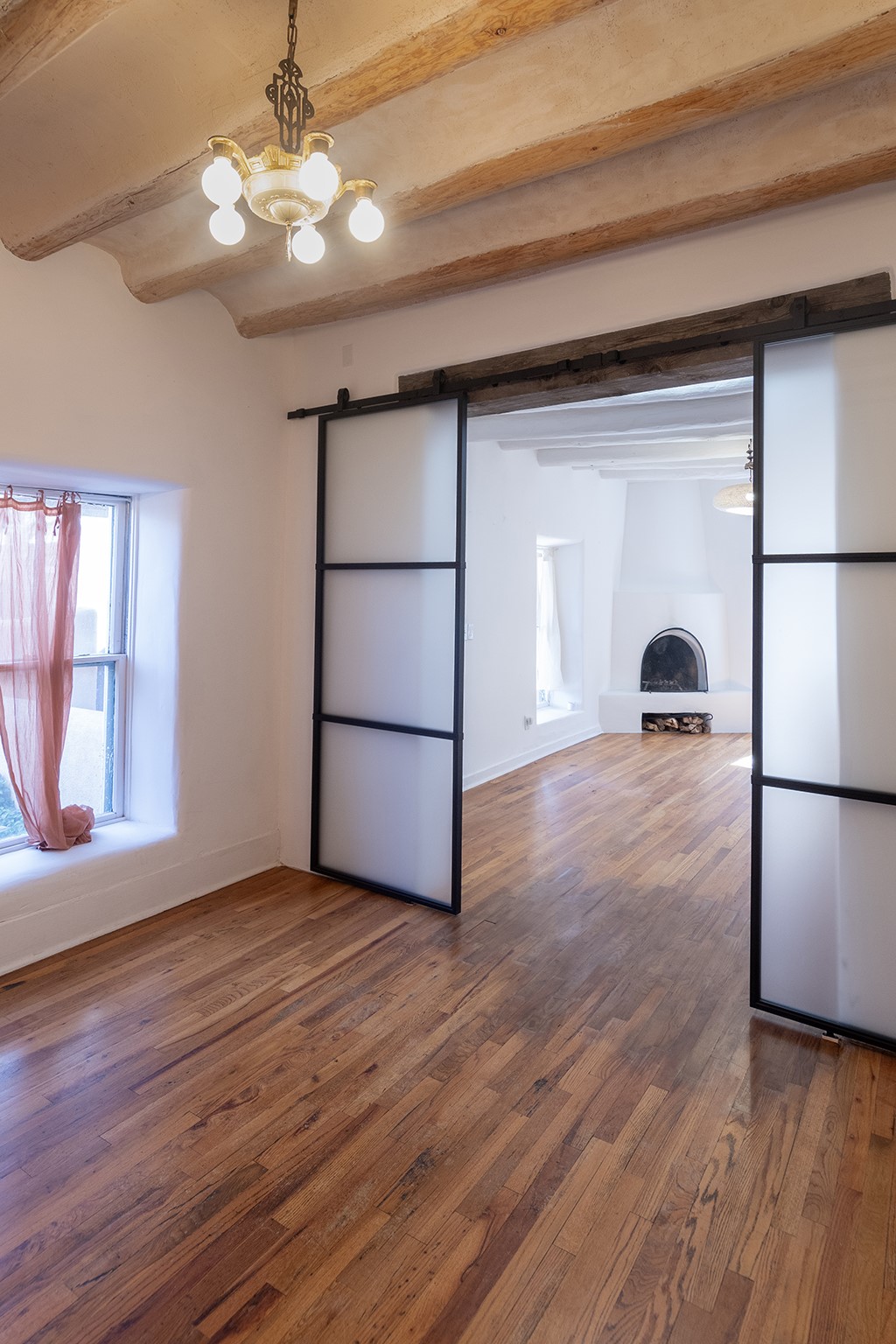 Historic two-bedroom 1.5 bath single level home with true Santa Fe touches, original vigas, coved ceilings, adobe walls and original wood floors. A large sunny living room includes a new skylight and a completely rebuilt kiva fireplace and an efficient gas stove for cozy winter nights. Two spacious bedrooms, one with beautiful sliding doors that allow the space to double as an office or den. The hall bath with Saltillo tile includes a new skylight and glass enclosure. The eat-in kitchen, also with Saltillo tile floors, has new counters, sink and refrigerator. The washer, dryer and tankless hot water heater are new as well. The property includes a front porch, a private shady seating area for dining and relaxing, and a beautiful, large-shared patio. Whether you are looking for a full-time residence or an investment property, this home checks all the boxes. Located in the desirable South Capitol neighborhood close to the Railyard, Plaza, shopping and restaurants. The unit comes with two designated off -street parking spaces and an outdoor closet provides extra storage space.