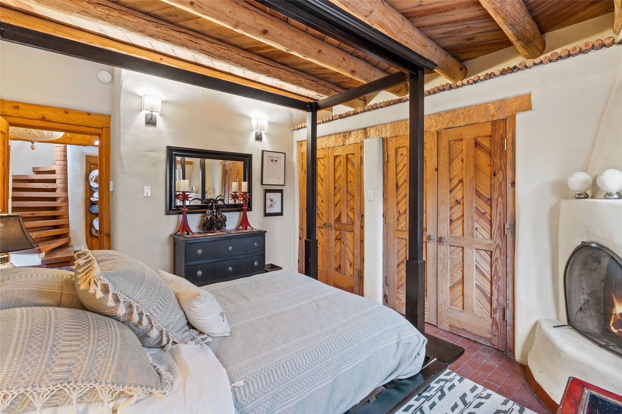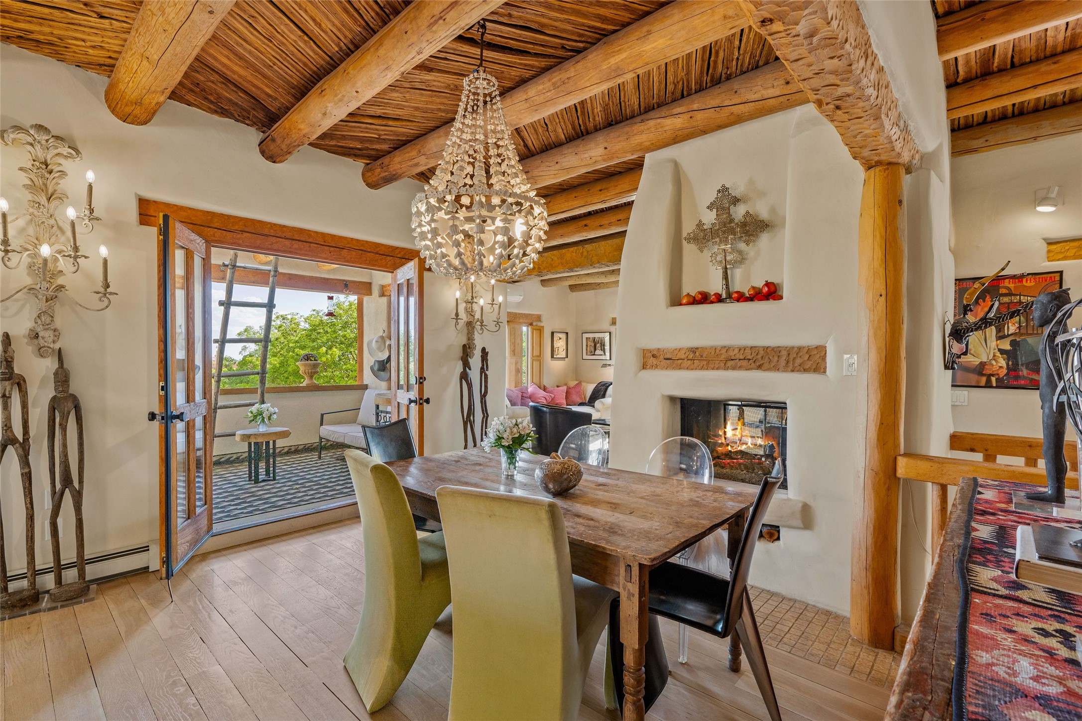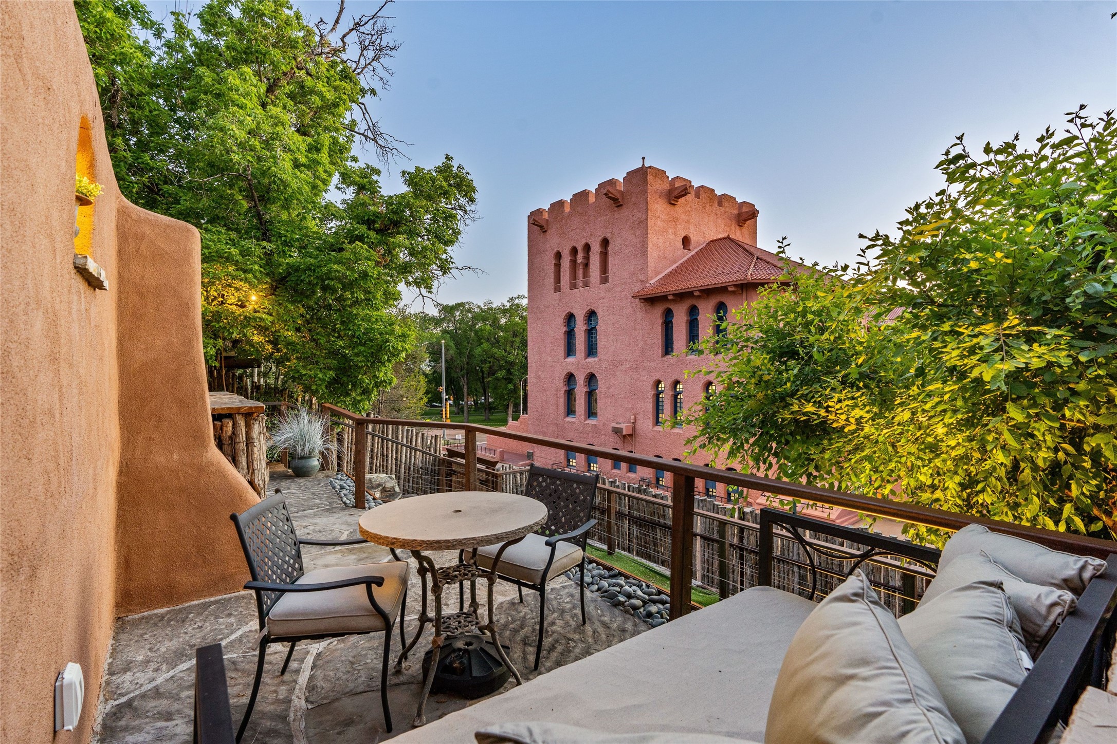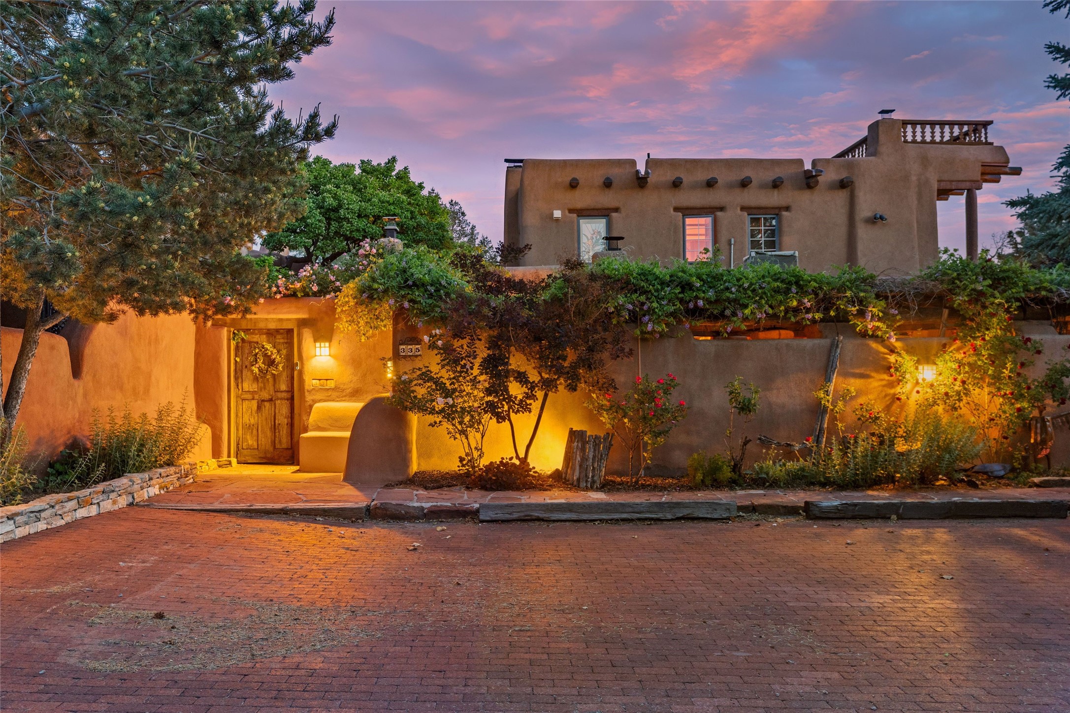 Historic District 2-bedroom 2.5 bath home located 2 blocks from The Plaza with city lights and mountain views. Gorgeous old-world details reimagined with contemporary updates and artistic flair. Iconic Santa Fe style with hard wood and brick floors, hand carved doors, beams and lintels, 3 kiva fireplaces, coved ceilings, split cedar latillas, vigas, nichos, plaster, antique sconces, and Talavera tiles. The foyer opens to a 22 ft atrium and a wooden carved staircase. The open-concept living/dining space is anchored by a double-sided wood-burning fireplace that connects the dining and living rooms. In the living room, romantic shuttered windows frame a scenic picture of the city with views of the Ortiz, Sun and Moon, and the Jemez mountains. The renovated chef's kitchen is appointed with embedded shell limestone honed countertops, a chiseled brick cream limestone backsplash, custom cream cabinetry, and state-of-the-art AGA appliances, including a $15,000 AGA Elise gas stove with a wok burner The primary bedroom has French doors that open to a private patio, where tiered terraces and lush landscaping offer expansive Jemez Mountain views and Santa Fe sunsets while the primary bath is a serene retreat with floor-to-ceiling river rock walls and a 4" deep white onyx double vanity lit from below, allowing the onyx geode sinks to glow. In addition to a second guestroom, there is a bonus office/study. Multiple portals offer impressions of the rose gleam of the hallmark Scottish Rite Temple as well as plentiful areas for entertaining and enjoying the incredible New Mexico weather. A curved stone stairway lined with 10 ft stone walls leads down to antique Indian elephant doors and a secret, storybook passage to The Plaza. A prime location where culinary enthusiasts will enjoy the short distance to SantaCaf, Market Street Steakhouse and other noteworthy restaurants.