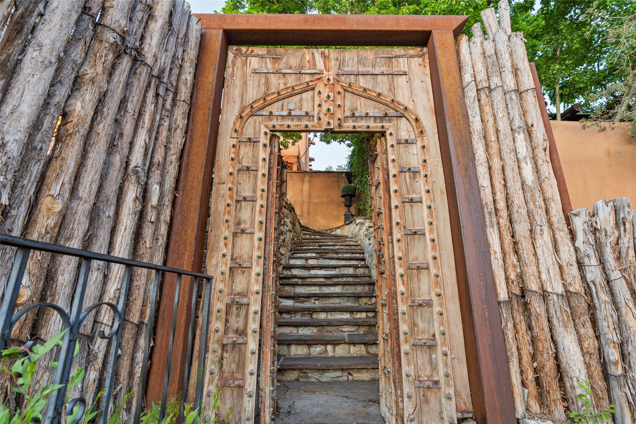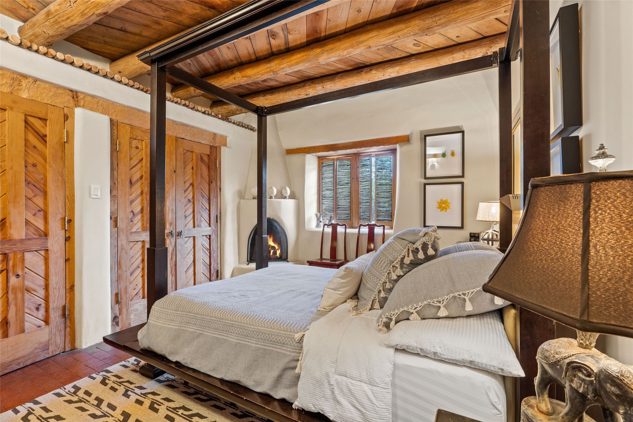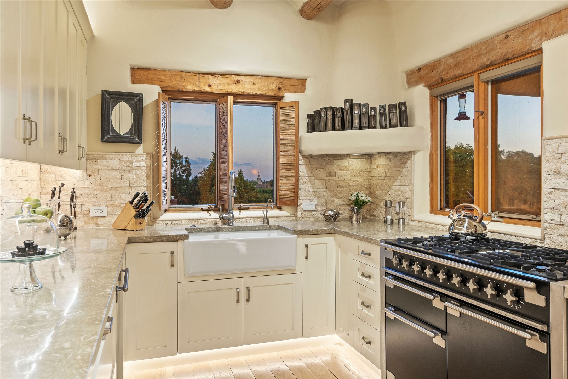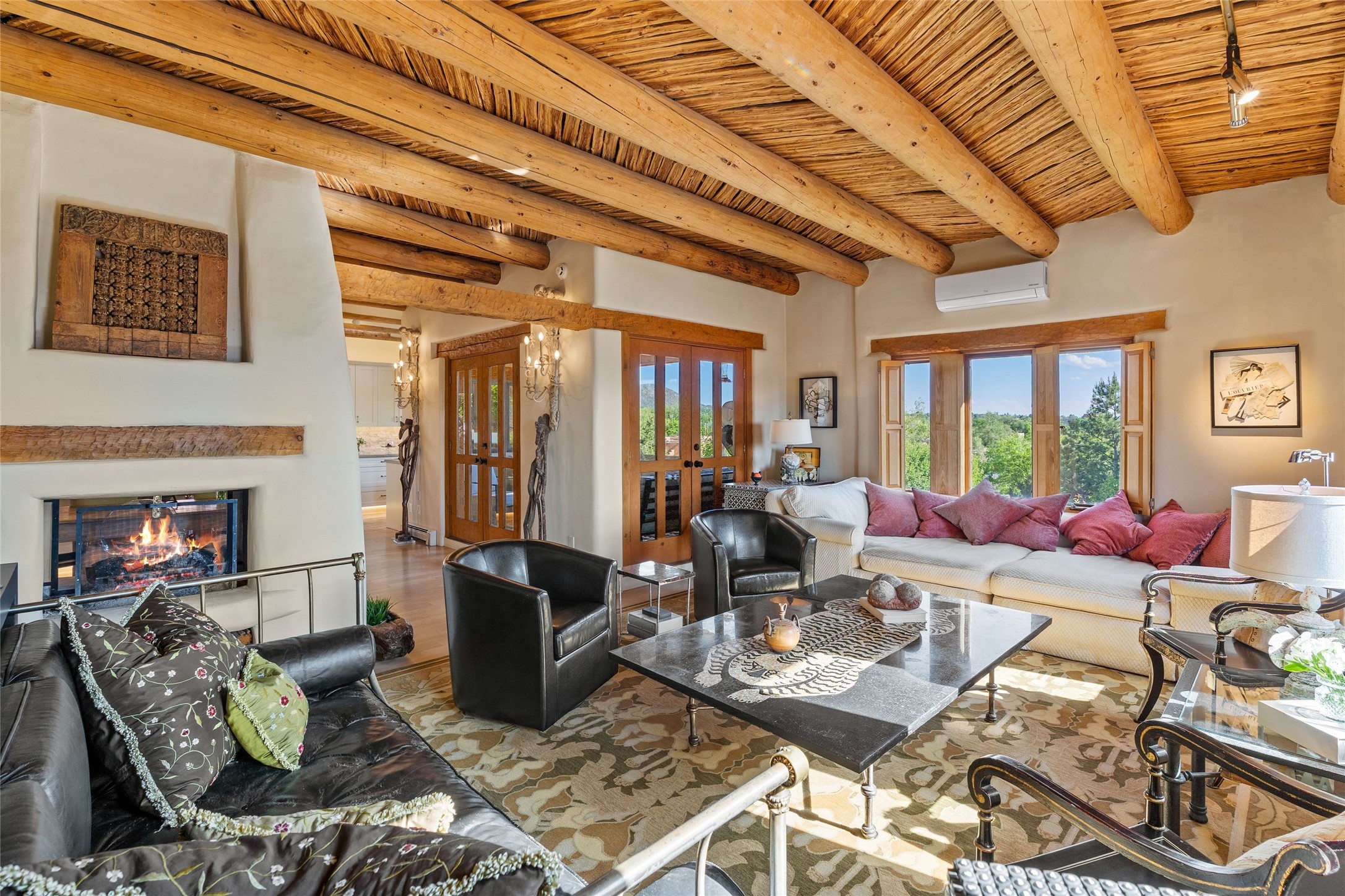 Historic District 2-bedroom 2.5 bath home located 2 blocks from The Plaza with city lights and mountain views. Gorgeous old-world details reimagined with contemporary updates and artistic flair. Iconic Santa Fe style with hard wood and brick floors, hand carved doors, beams and lintels, 3 kiva fireplaces, coved ceilings, split cedar latillas, vigas, nichos, plaster, antique sconces, and Talavera tiles. The foyer opens to a 22 ft atrium and a wooden carved staircase. The open-concept living/dining space is anchored by a double-sided wood-burning fireplace that connects the dining and living rooms. In the living room, romantic shuttered windows frame a scenic picture of the city with views of the Ortiz, Sun and Moon, and the Jemez mountains. The renovated chef's kitchen is appointed with embedded shell limestone honed countertops, a chiseled brick cream limestone backsplash, custom cream cabinetry, and state-of-the-art AGA appliances, including a $15,000 AGA Elise gas stove with a wok burner The primary bedroom has French doors that open to a private patio, where tiered terraces and lush landscaping offer expansive Jemez Mountain views and Santa Fe sunsets while the primary bath is a serene retreat with floor-to-ceiling river rock walls and a 4" deep white onyx double vanity lit from below, allowing the onyx geode sinks to glow. In addition to a second guestroom, there is a bonus office/study. Multiple portals offer impressions of the rose gleam of the hallmark Scottish Rite Temple as well as plentiful areas for entertaining and enjoying the incredible New Mexico weather. A curved stone stairway lined with 10 ft stone walls leads down to antique Indian elephant doors and a secret, storybook passage to The Plaza. A prime location where culinary enthusiasts will enjoy the short distance to SantaCaf, Market Street Steakhouse and other noteworthy restaurants.