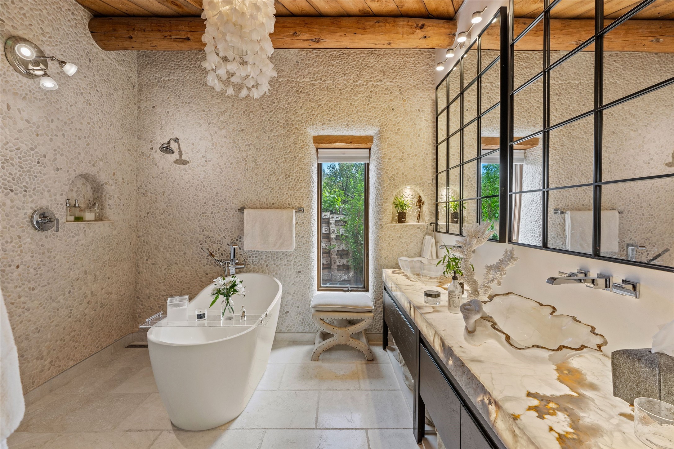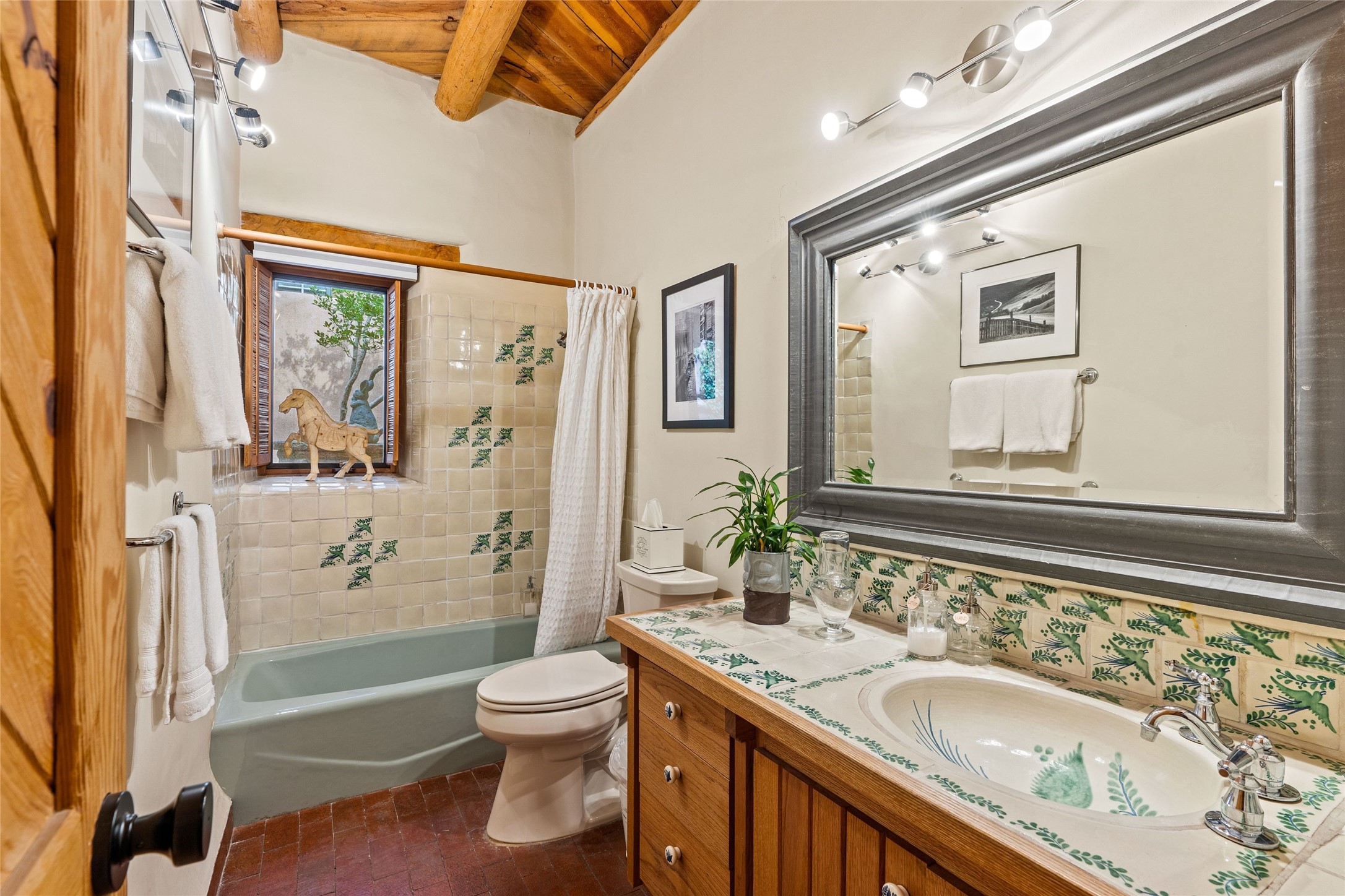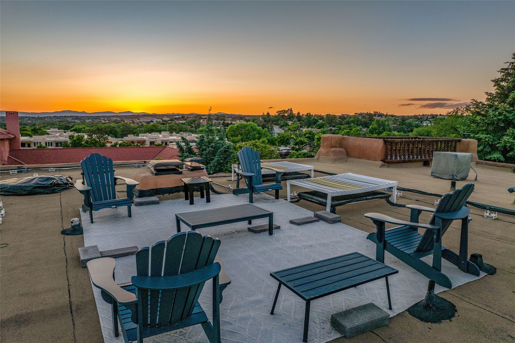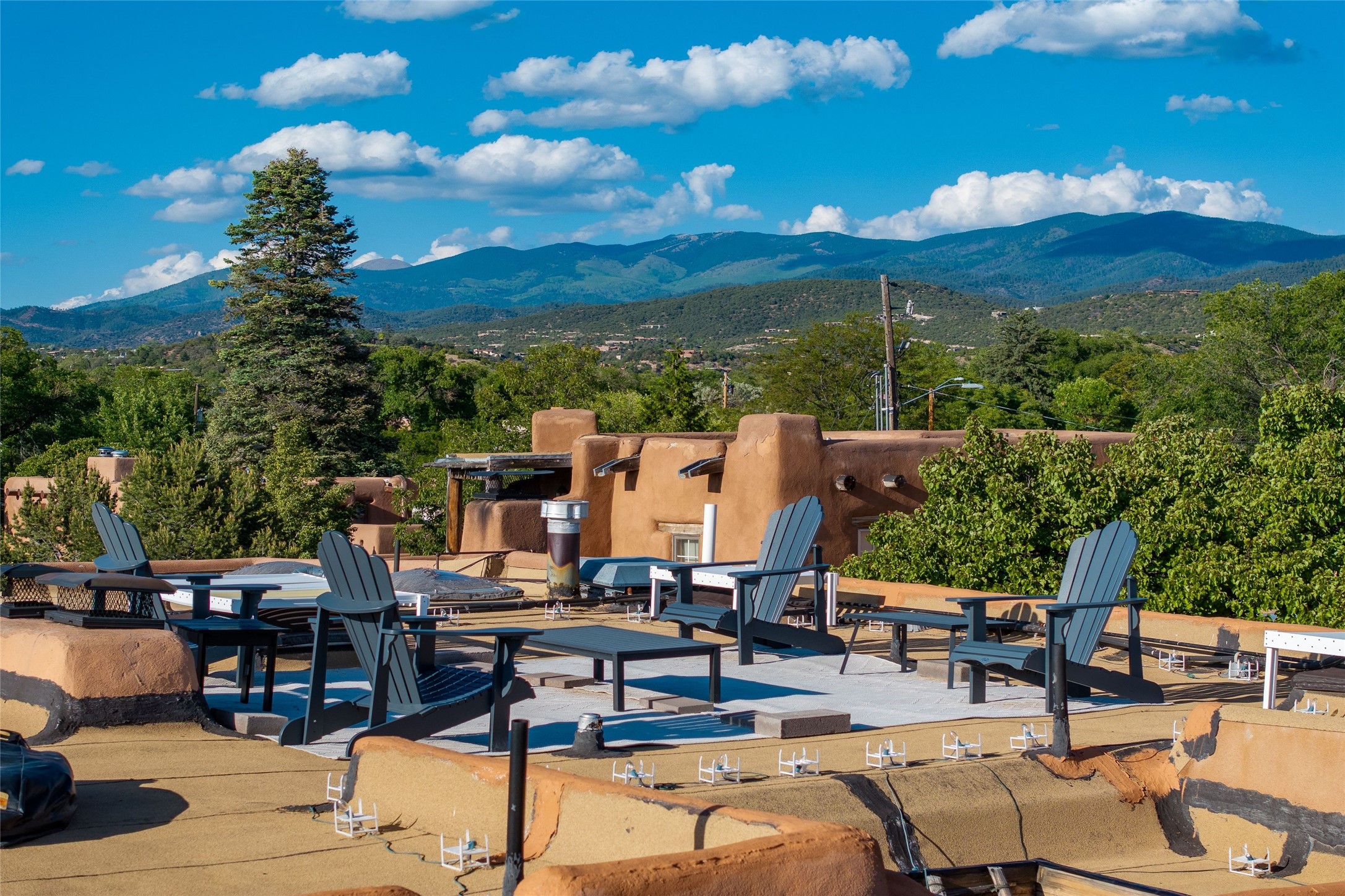 Historic District 2-bedroom 2.5 bath home located 2 blocks from The Plaza with city lights and mountain views. Gorgeous old-world details reimagined with contemporary updates and artistic flair. Iconic Santa Fe style with hard wood and brick floors, hand carved doors, beams and lintels, 3 kiva fireplaces, coved ceilings, split cedar latillas, vigas, nichos, plaster, antique sconces, and Talavera tiles. The foyer opens to a 22 ft atrium and a wooden carved staircase. The open-concept living/dining space is anchored by a double-sided wood-burning fireplace that connects the dining and living rooms. In the living room, romantic shuttered windows frame a scenic picture of the city with views of the Ortiz, Sun and Moon, and the Jemez mountains. The renovated chef's kitchen is appointed with embedded shell limestone honed countertops, a chiseled brick cream limestone backsplash, custom cream cabinetry, and state-of-the-art AGA appliances, including a $15,000 AGA Elise gas stove with a wok burner The primary bedroom has French doors that open to a private patio, where tiered terraces and lush landscaping offer expansive Jemez Mountain views and Santa Fe sunsets while the primary bath is a serene retreat with floor-to-ceiling river rock walls and a 4" deep white onyx double vanity lit from below, allowing the onyx geode sinks to glow. In addition to a second guestroom, there is a bonus office/study. Multiple portals offer impressions of the rose gleam of the hallmark Scottish Rite Temple as well as plentiful areas for entertaining and enjoying the incredible New Mexico weather. A curved stone stairway lined with 10 ft stone walls leads down to antique Indian elephant doors and a secret, storybook passage to The Plaza. A prime location where culinary enthusiasts will enjoy the short distance to SantaCaf, Market Street Steakhouse and other noteworthy restaurants.