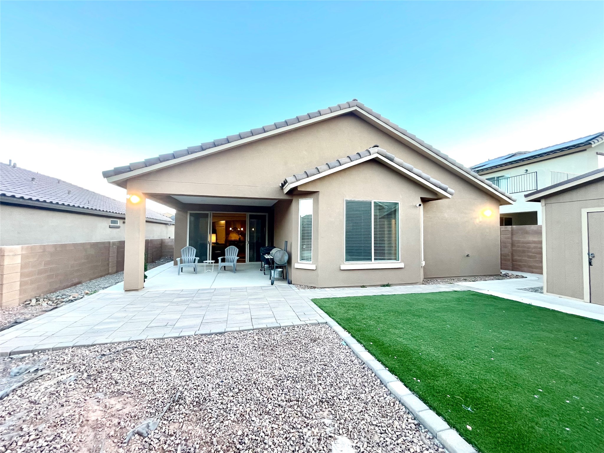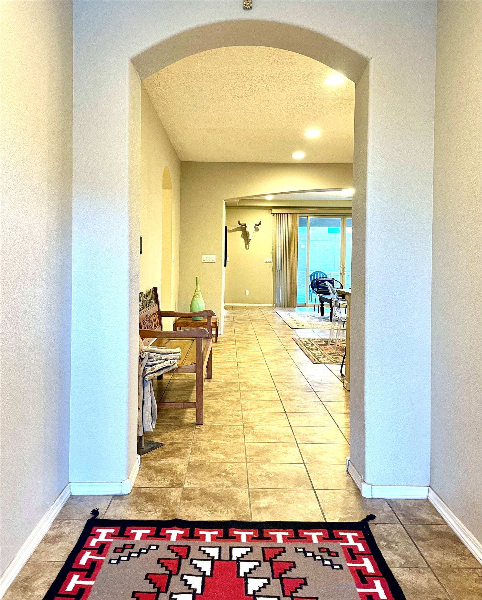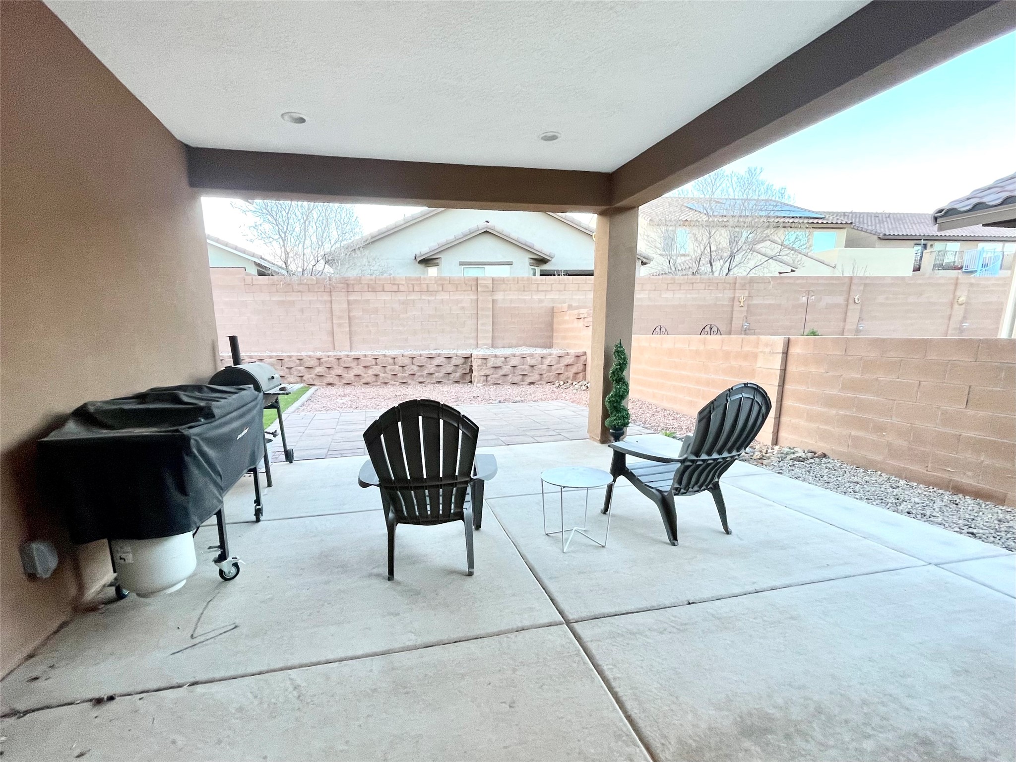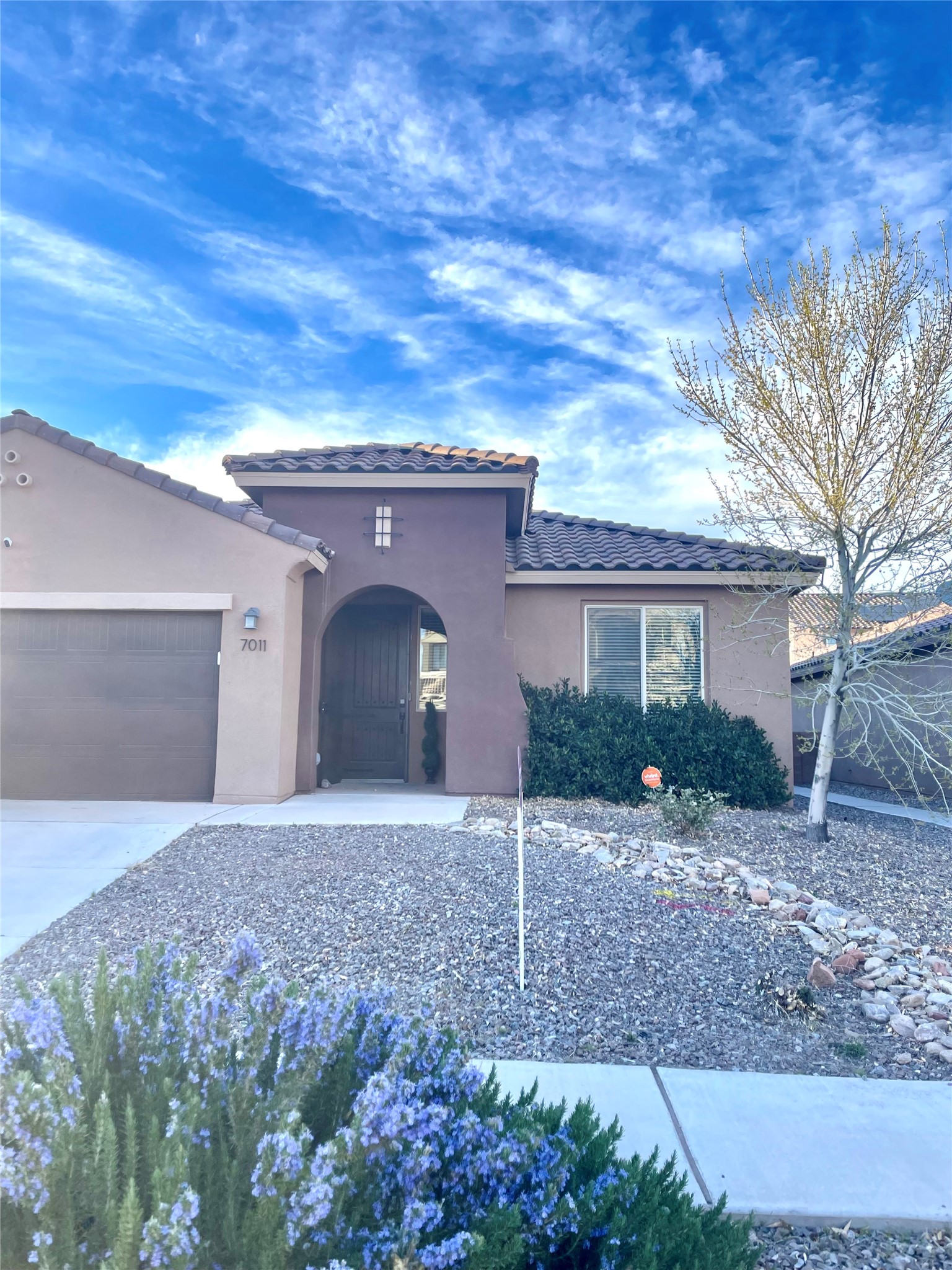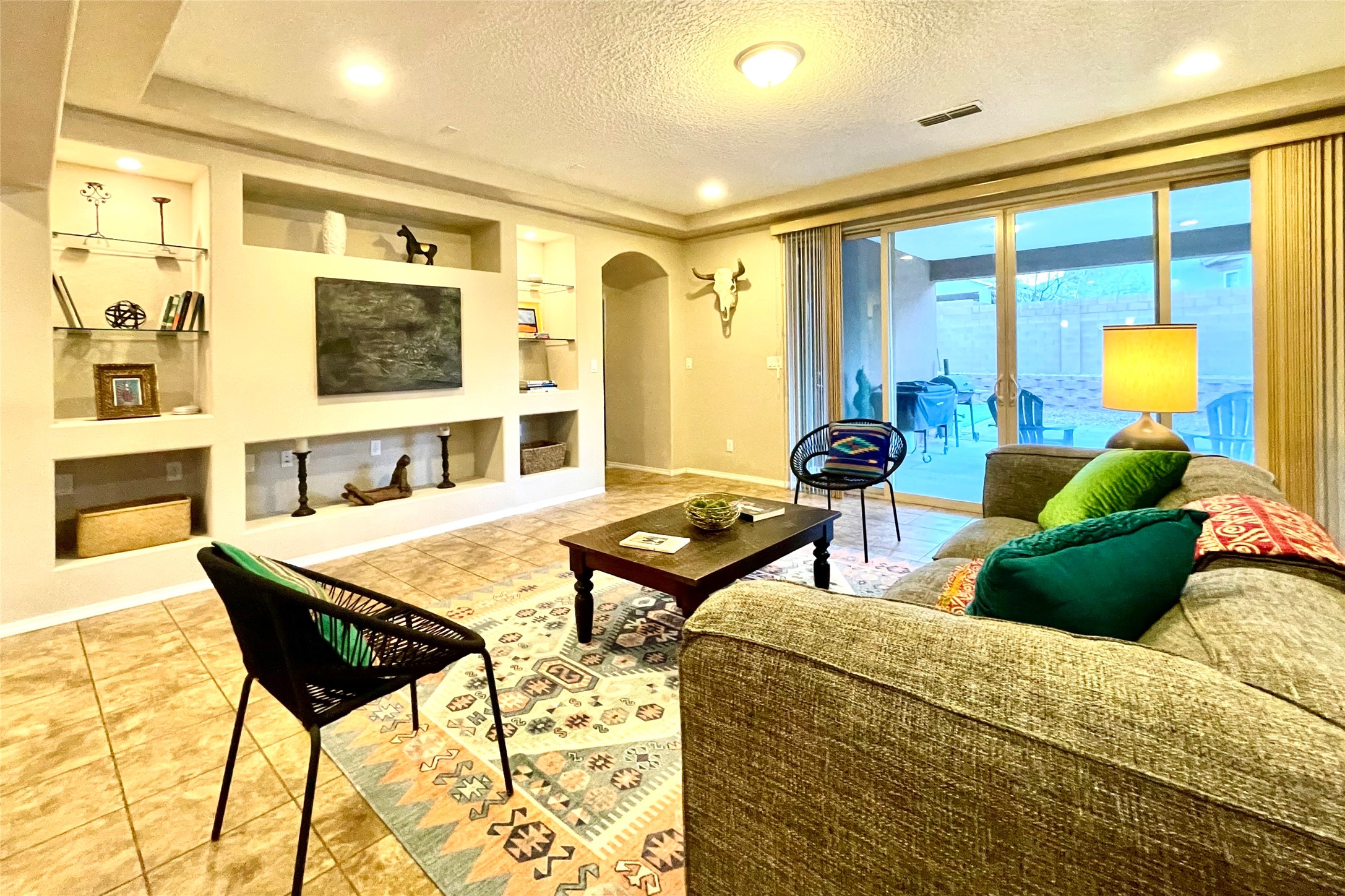 This well appointed single level light filled home in the desirable Lomas Encantadas neighborhood in Rio Rancho is ready to enjoy. Spacious 4 bedrooms, 2 bathrooms, plus den/office, open concept living room, dining room, kitchen, 2 car garage, fenced yard, and large laundry room. Primary suite is located away from the other 3 bedrooms for privacy, and has a large walk in closet and en suite bathroom. Elegance and sophistication abounds with arched doorways, high ceilings, recessed lighting, tray ceilings, French doors, custom wood window blinds, and artistic Norteo mosaic tile floor in the main bedroom suite. The kitchen has a large island with stylish pendant lighting and plenty of seating, as well as a walk in pantry. So many spaces for entertaining! Drip irrigation and xeriscaped yard means you can spend more time barbecuing on the large covered patio. Backyard storage shed for toys, brand new on demand hot water heater, granite counters, reverse osmosis water, ADA compliant throughout with large doorways and no steps at all. Parks, trails, schools and shopping all nearby. Click on video link for tour.