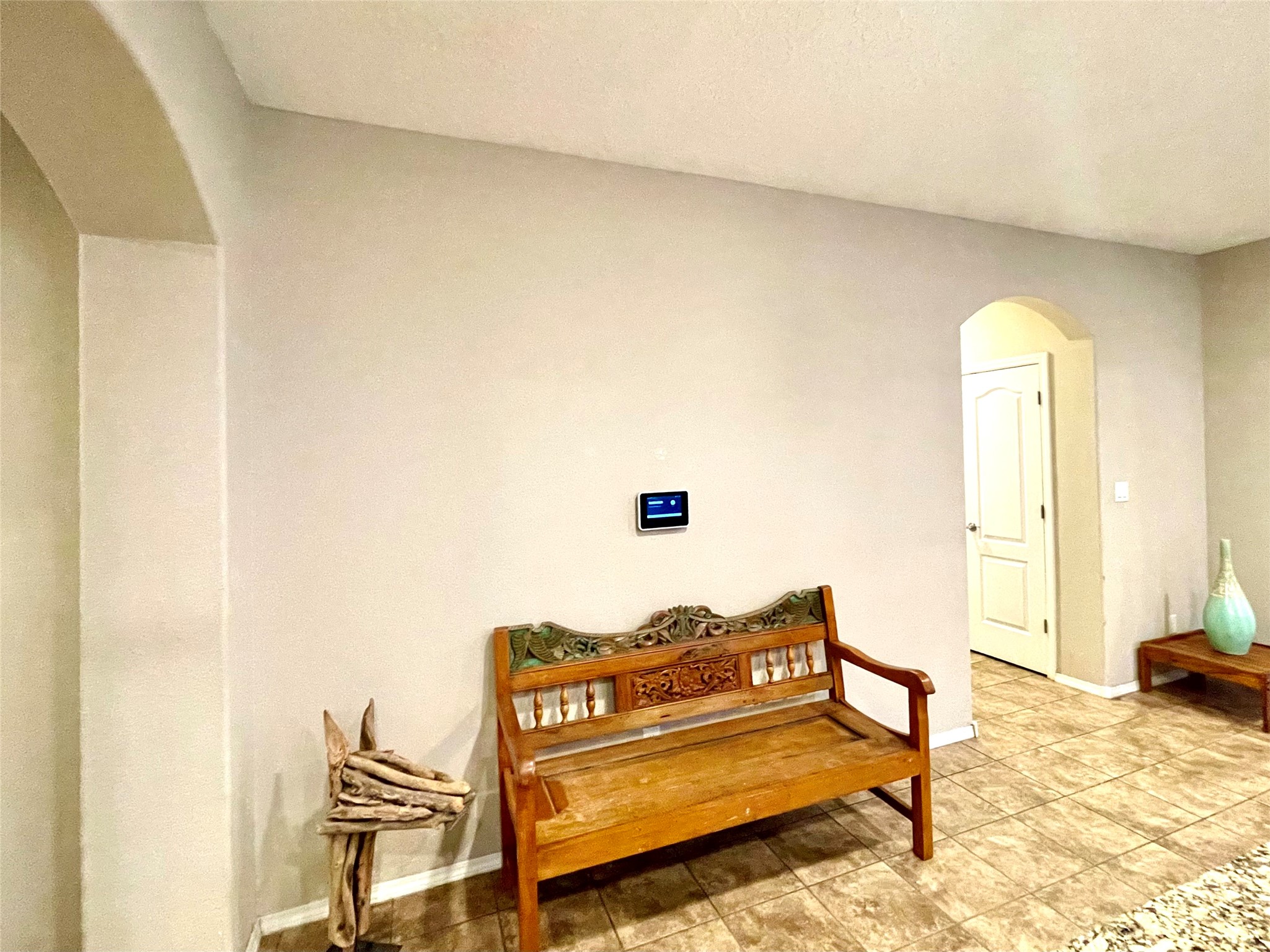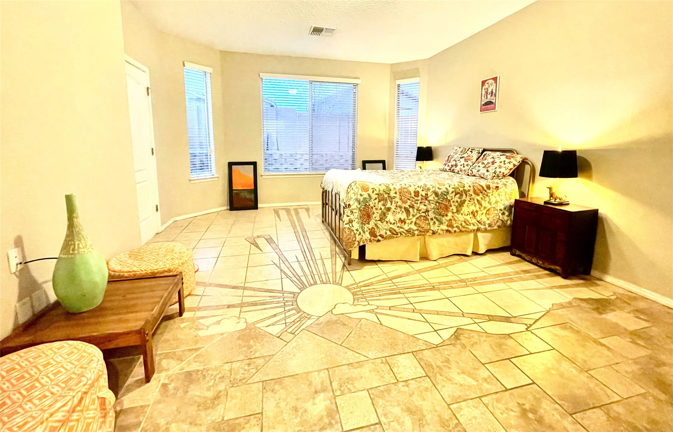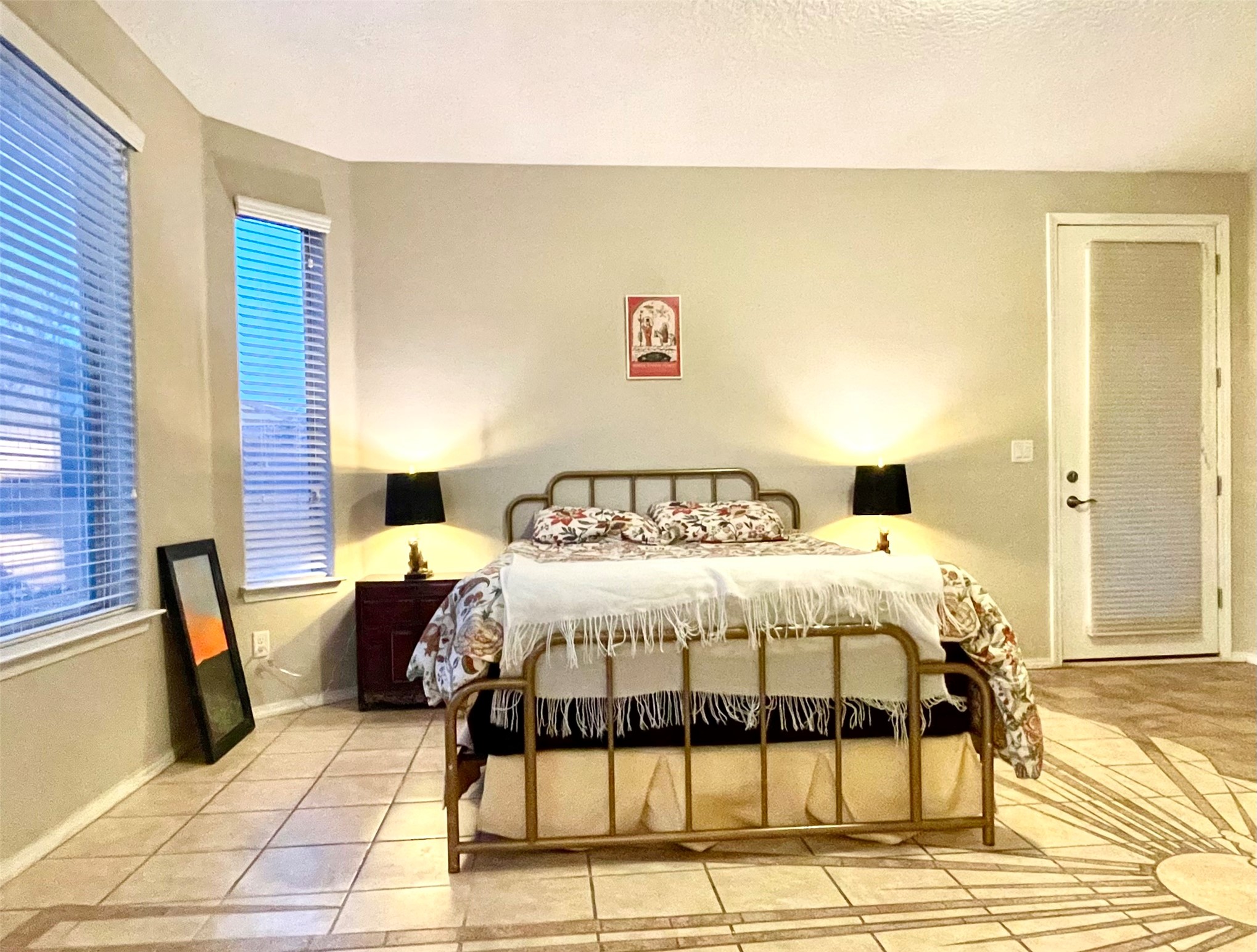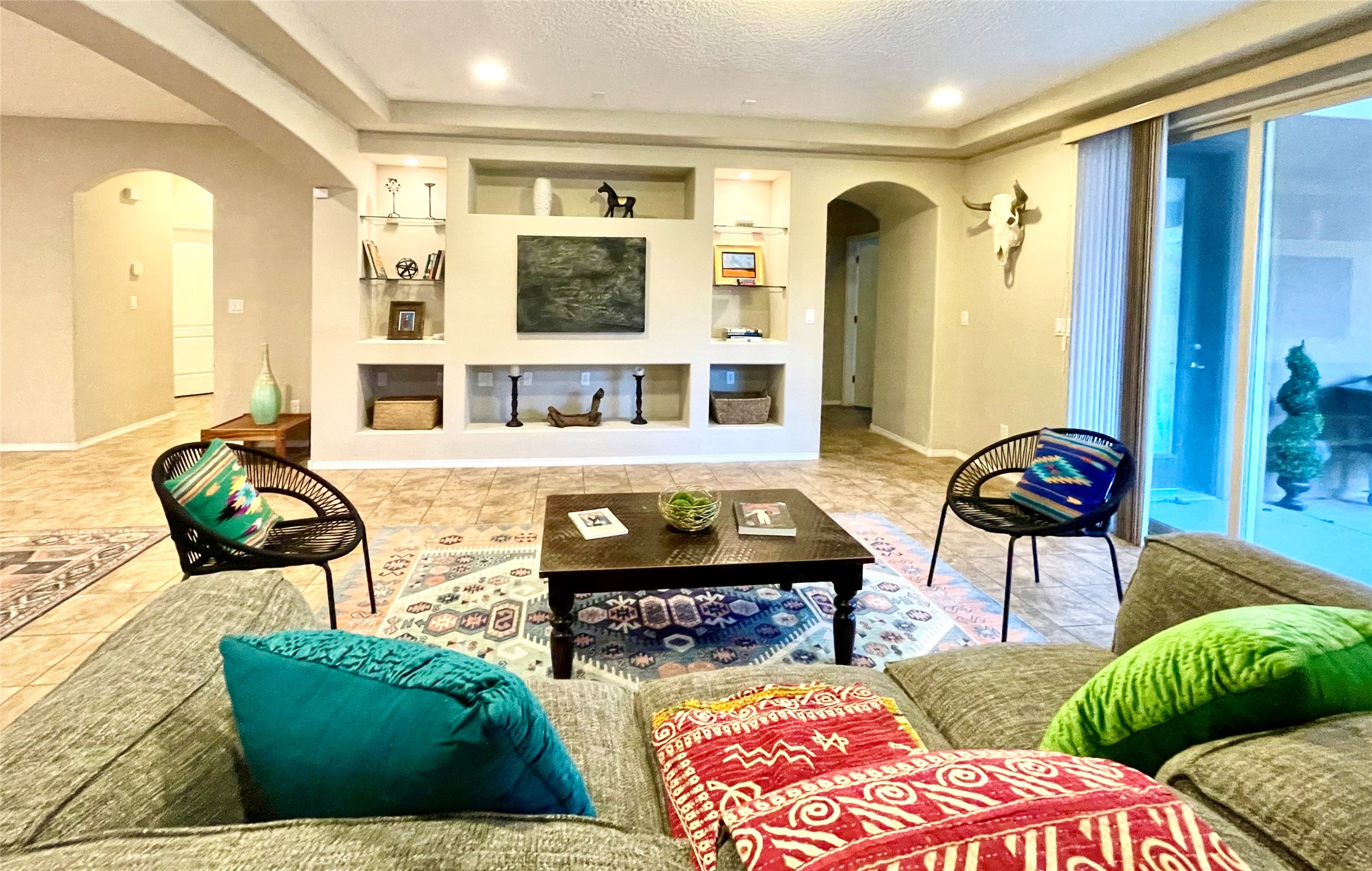 This well appointed single level light filled home in the desirable Lomas Encantadas neighborhood in Rio Rancho is ready to enjoy. Spacious 4 bedrooms, 2 bathrooms, plus den/office, open concept living room, dining room, kitchen, 2 car garage, fenced yard, and large laundry room. Primary suite is located away from the other 3 bedrooms for privacy, and has a large walk in closet and en suite bathroom. Elegance and sophistication abounds with arched doorways, high ceilings, recessed lighting, tray ceilings, French doors, custom wood window blinds, and artistic Norteo mosaic tile floor in the main bedroom suite. The kitchen has a large island with stylish pendant lighting and plenty of seating, as well as a walk in pantry. So many spaces for entertaining! Drip irrigation and xeriscaped yard means you can spend more time barbecuing on the large covered patio. Backyard storage shed for toys, brand new on demand hot water heater, granite counters, reverse osmosis water, ADA compliant throughout with large doorways and no steps at all. Parks, trails, schools and shopping all nearby. Click on video link for tour.
