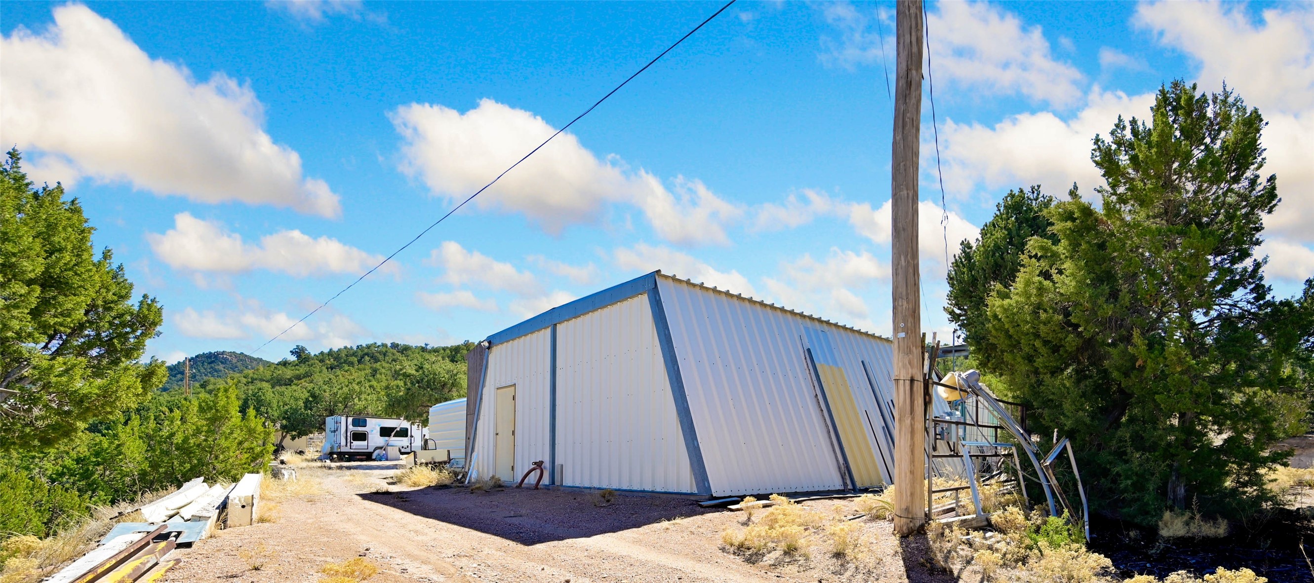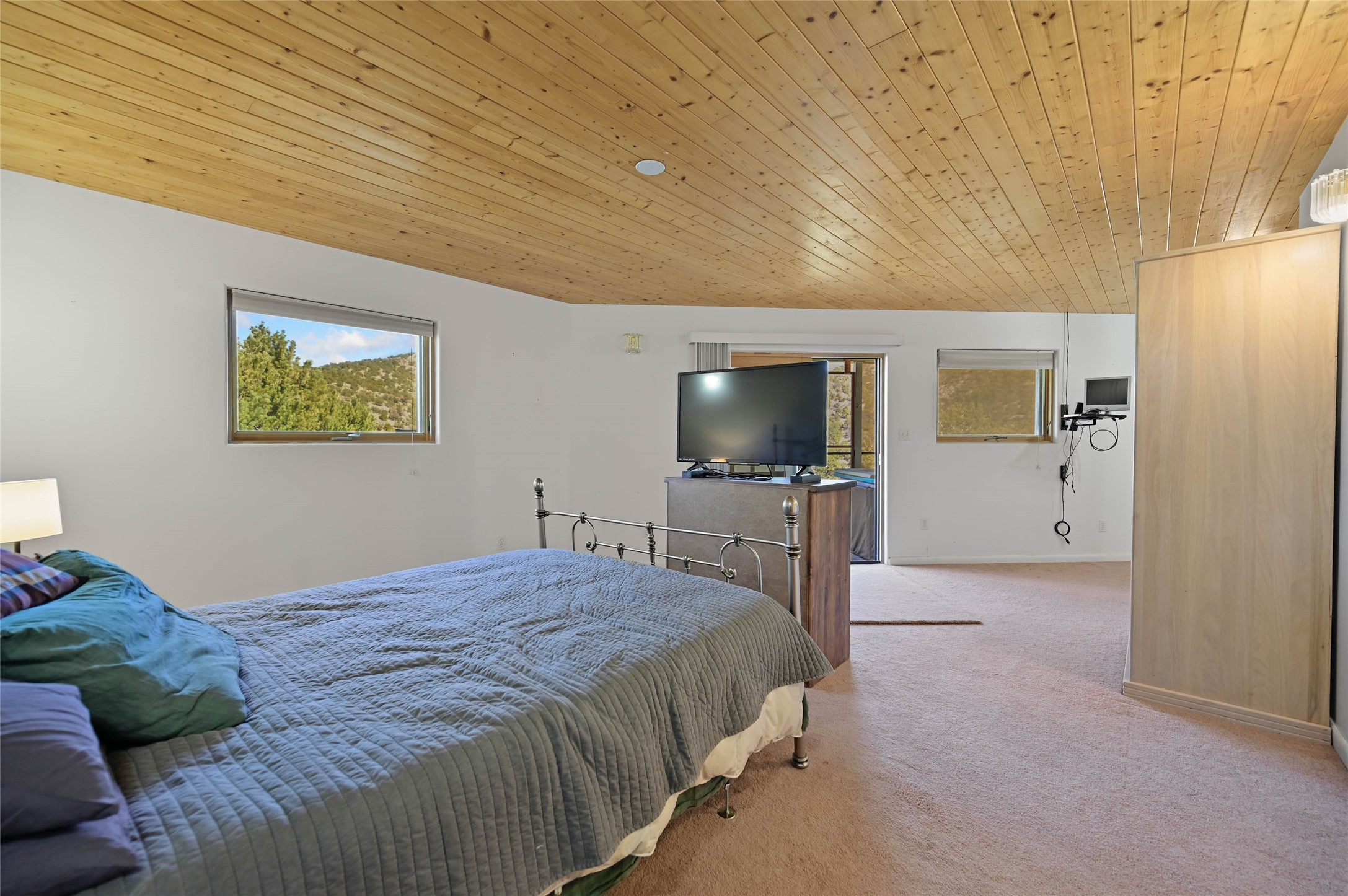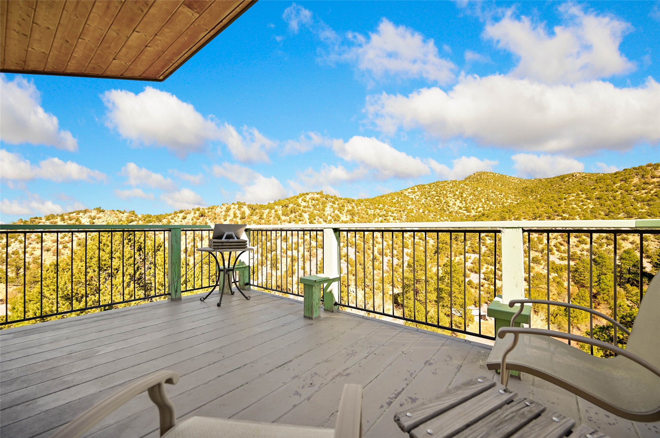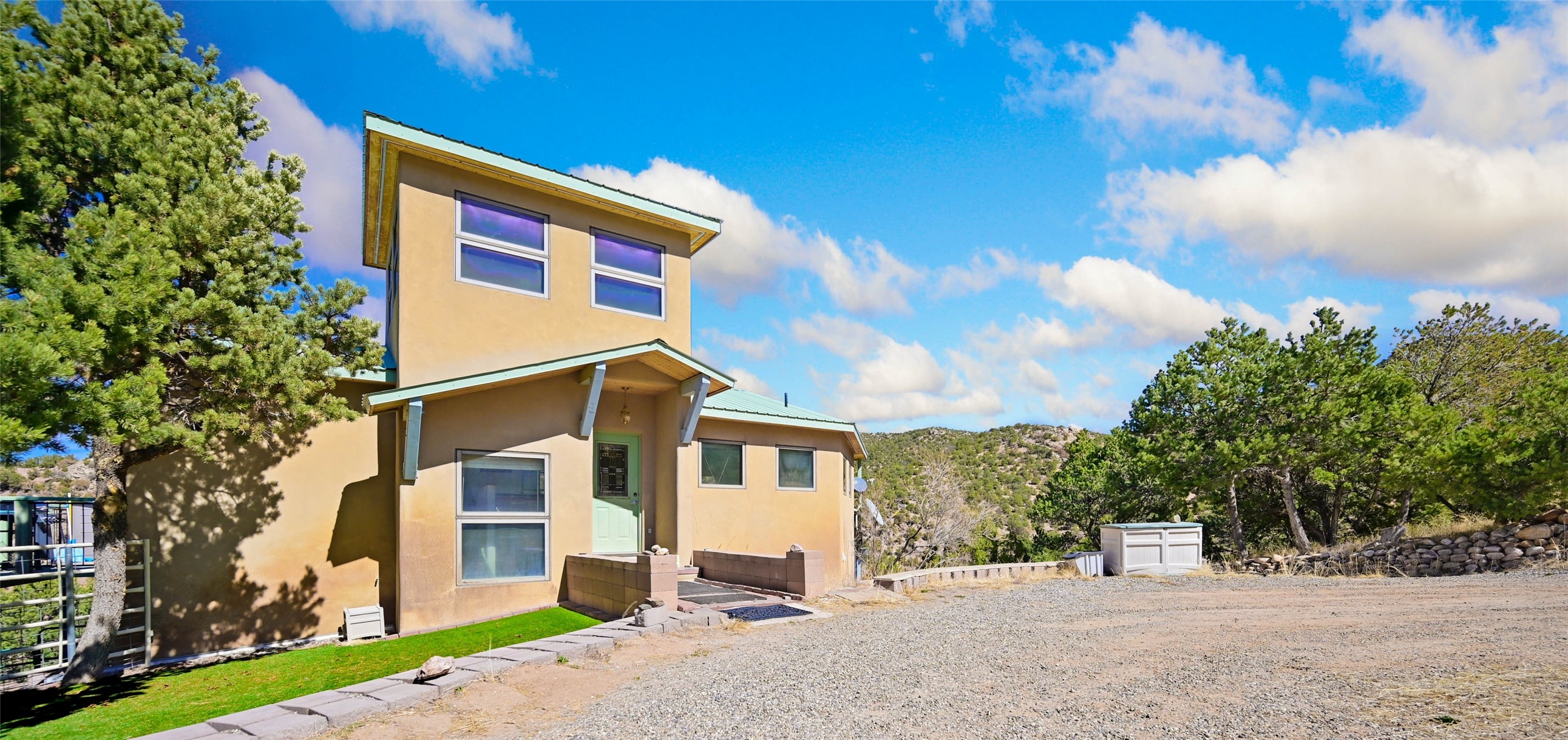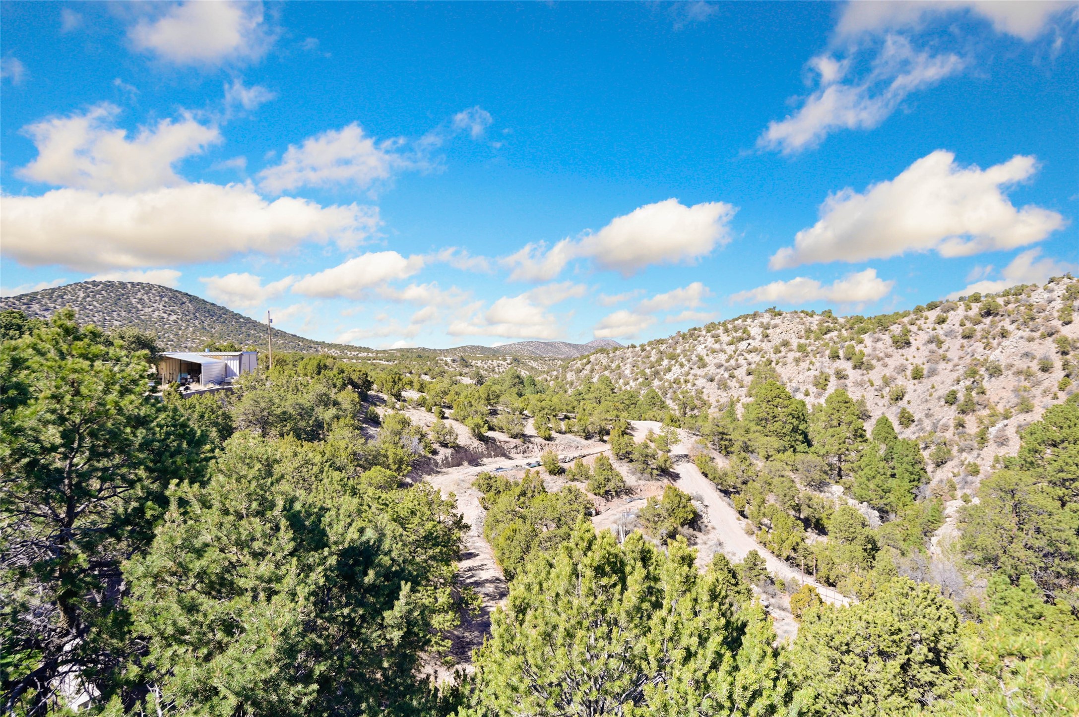 Welcome to your private mountain sanctuary! Tucked away just past Nambe and a scenic 25-minute drive from Santa Fe, this architecturally unique home offers the perfect blend of quietude and character. Whether you're drawn to the creative angles and beams, or the beautiful tongue-and-groove woodwork, this residence feels like a work of art. The thoughtful two-level layout features: Main Level: A spacious, light-filled great room designed for gathering, framed by expansive views of the surrounding landscape. Kitchen with ample counterspace and cabinet storage. A light filled Atrium, great for indoor plants, plus a powder room for convenience. Lower Level: Two comfortable bedroom suites, providing a peaceful and private retreat for family or guests. Each with a full bath. There is also a kitchenette area and laundry. Both bedrooms have direct access to the back patio Deck and Hot tub. Outdoor & Hobby Space: Situated on generous acreage with its own private well, the property includes a dedicated workshop and multiple carports--ideal for makers, collectors, or anyone needing extra room for gear and projects. If you've been looking for a home that breaks the "cookie-cutter" mold while staying close to the cultural heart of Santa Fe, this is the one.