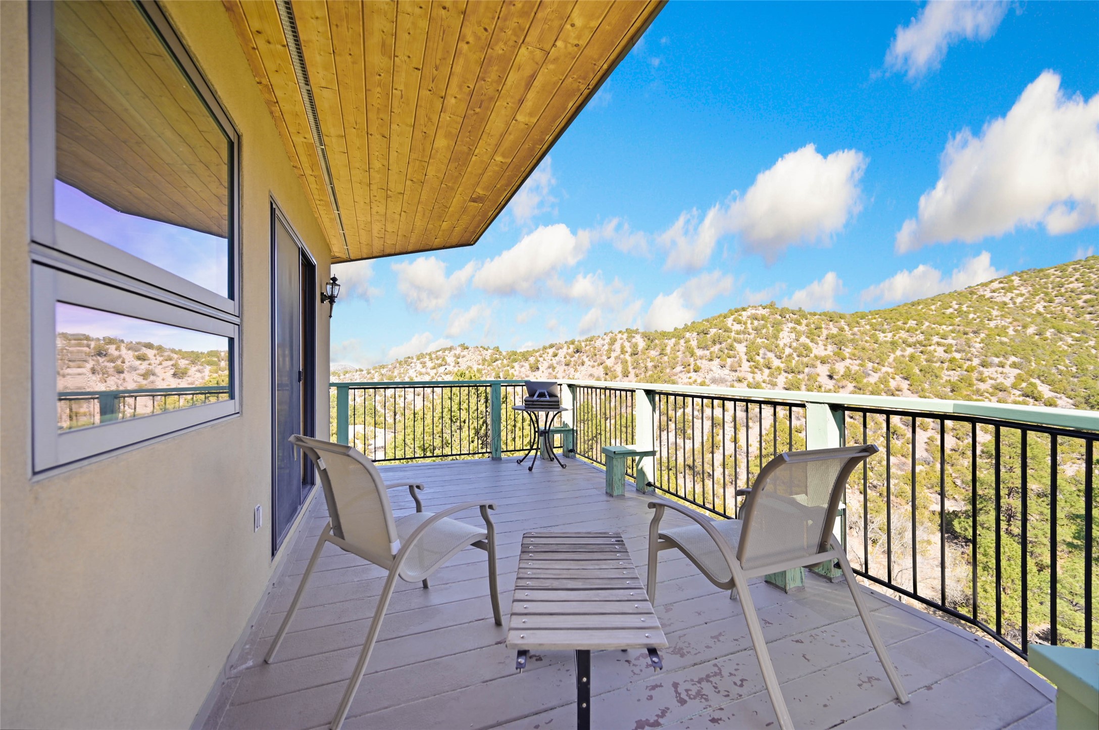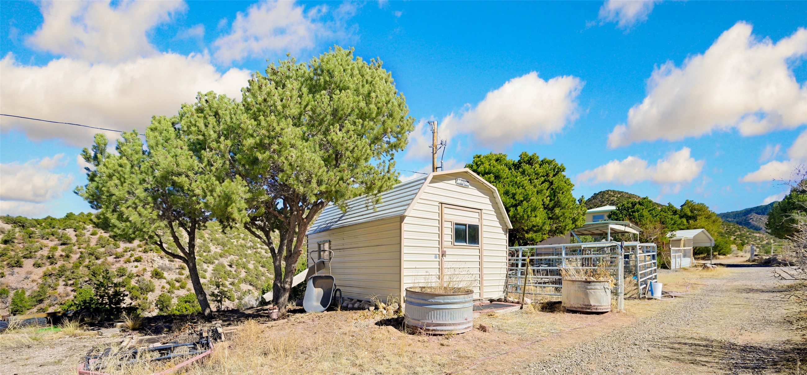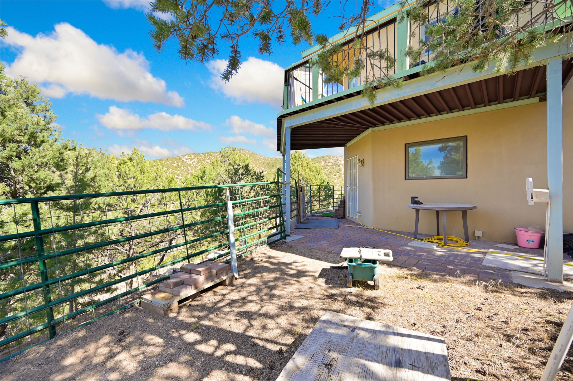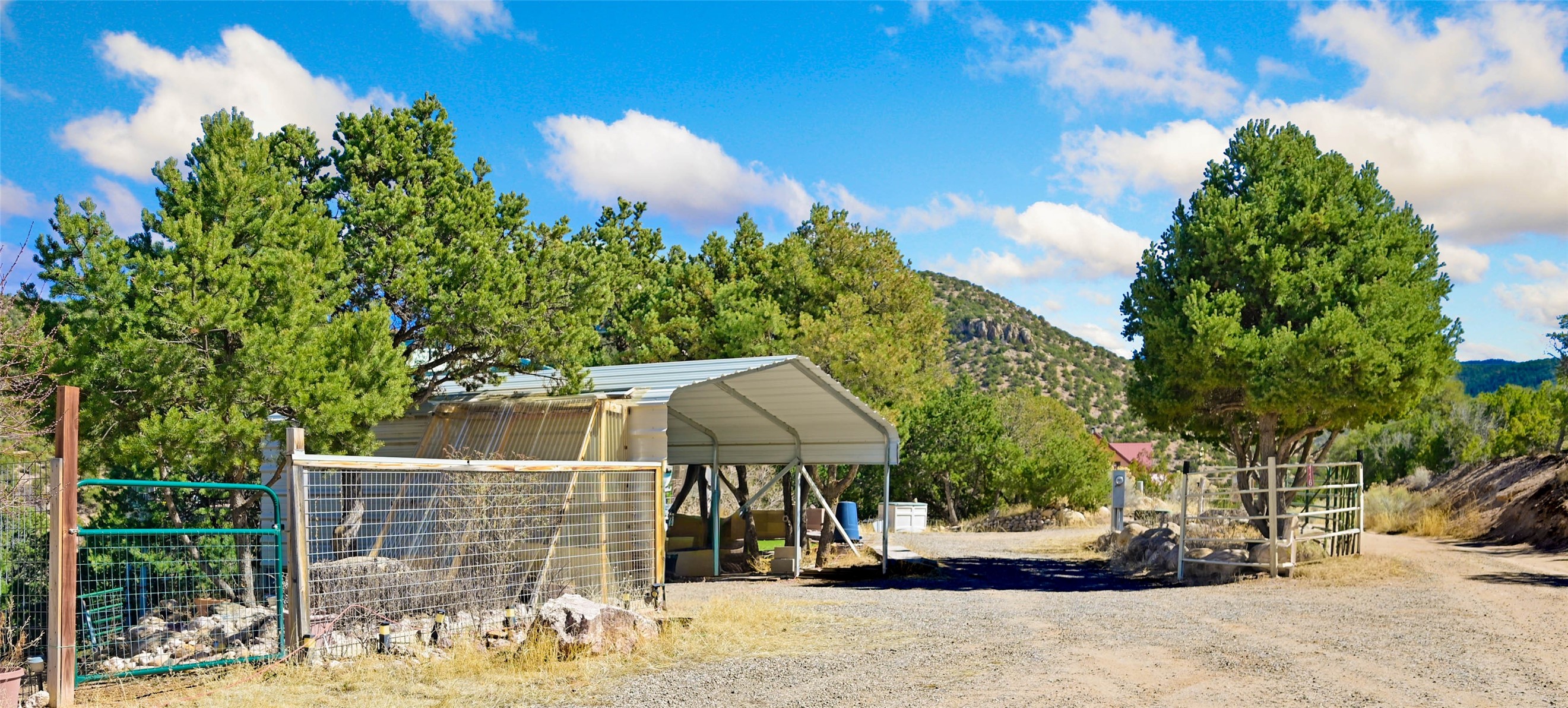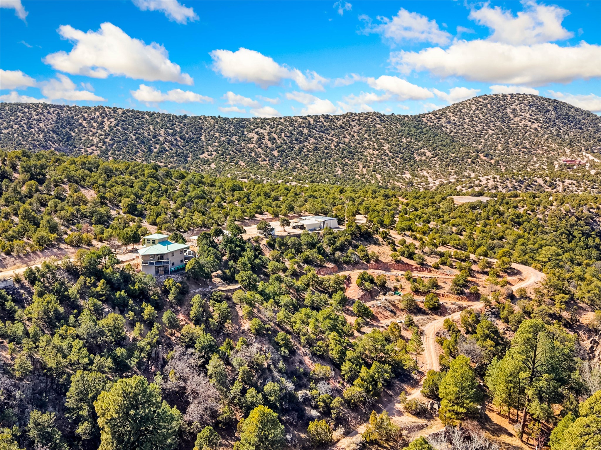 Welcome to your private mountain sanctuary! Tucked away just past Nambe and a scenic 25-minute drive from Santa Fe, this architecturally unique home offers the perfect blend of quietude and character. Whether you're drawn to the creative angles and beams, or the beautiful tongue-and-groove woodwork, this residence feels like a work of art. The thoughtful two-level layout features: Main Level: A spacious, light-filled great room designed for gathering, framed by expansive views of the surrounding landscape. Kitchen with ample counterspace and cabinet storage. A light filled Atrium, great for indoor plants, plus a powder room for convenience. Lower Level: Two comfortable bedroom suites, providing a peaceful and private retreat for family or guests. Each with a full bath. There is also a kitchenette area and laundry. Both bedrooms have direct access to the back patio Deck and Hot tub. Outdoor & Hobby Space: Situated on generous acreage with its own private well, the property includes a dedicated workshop and multiple carports--ideal for makers, collectors, or anyone needing extra room for gear and projects. If you've been looking for a home that breaks the "cookie-cutter" mold while staying close to the cultural heart of Santa Fe, this is the one.