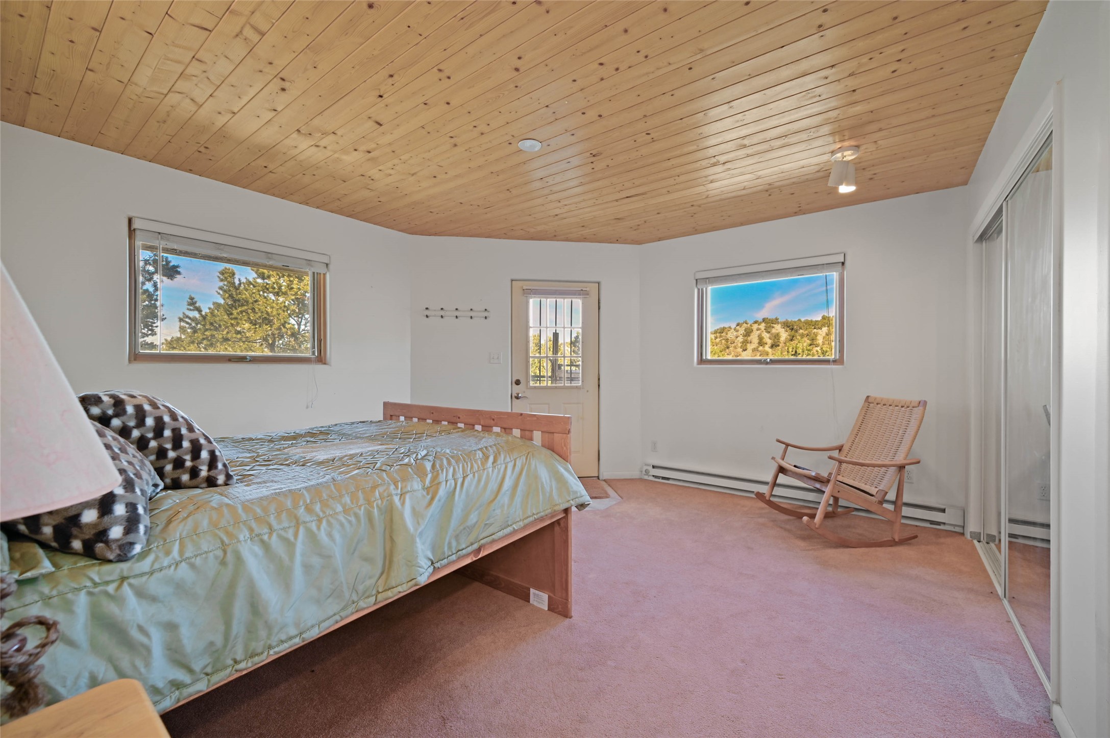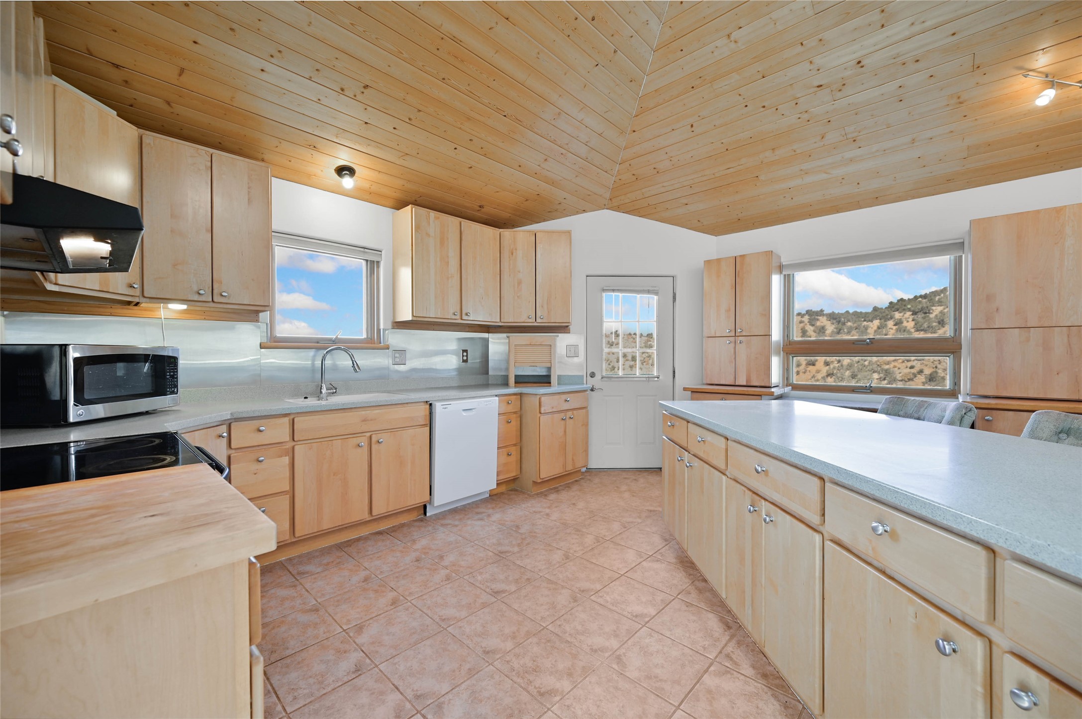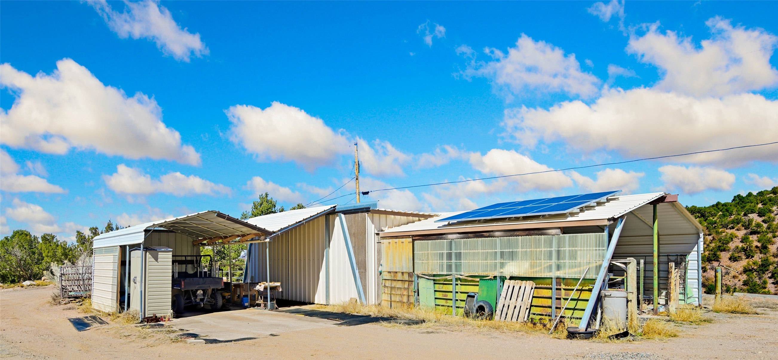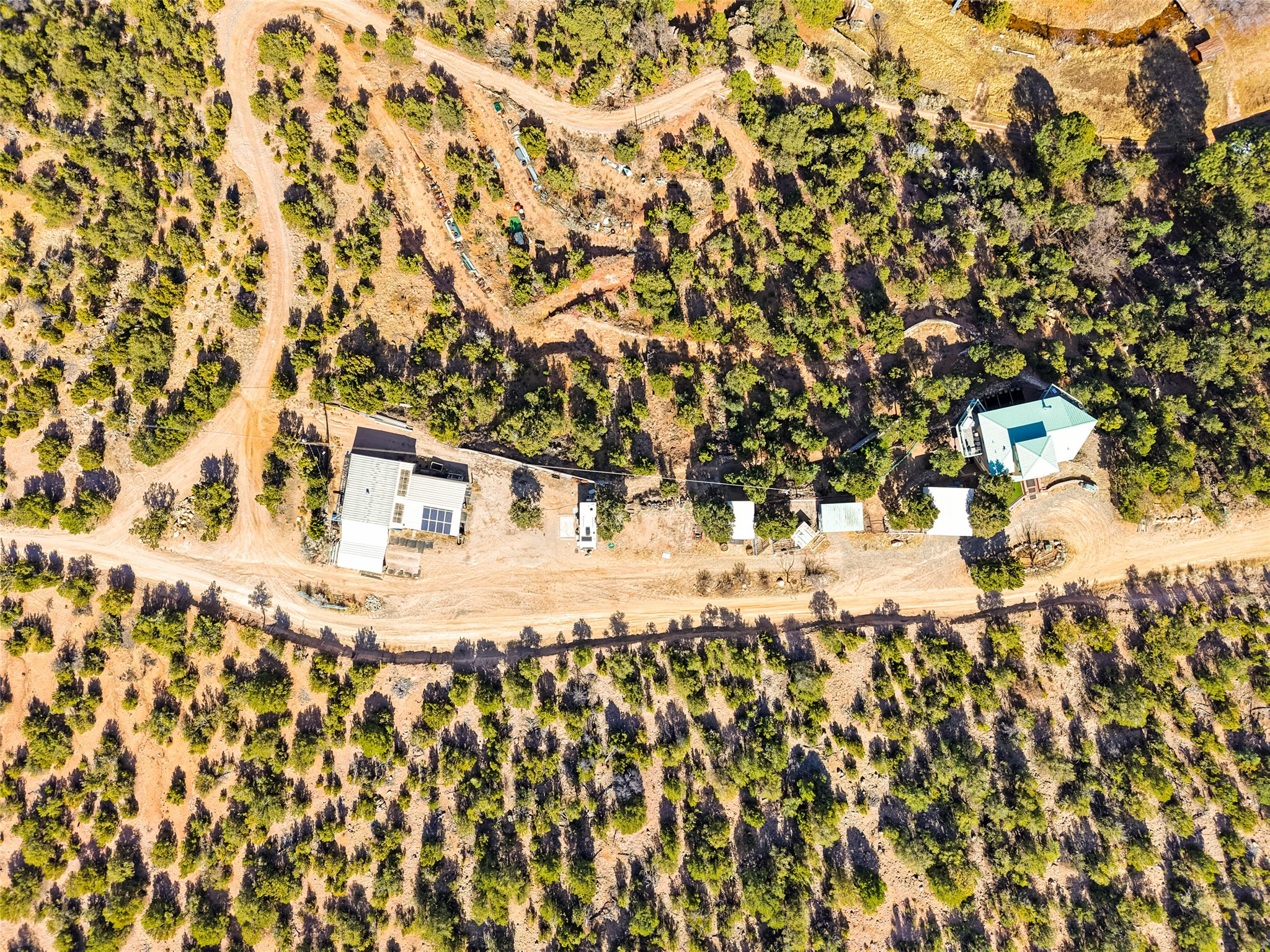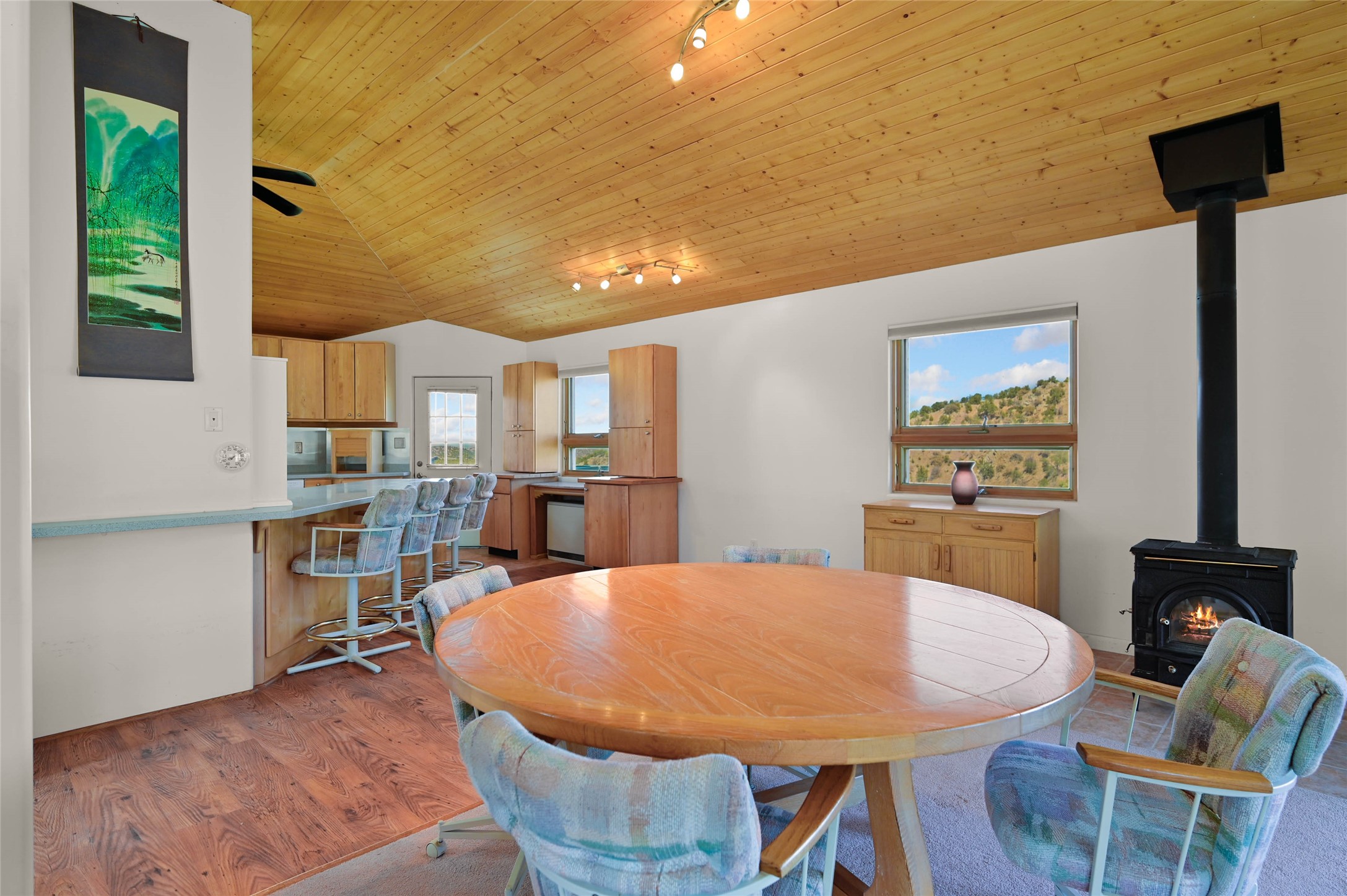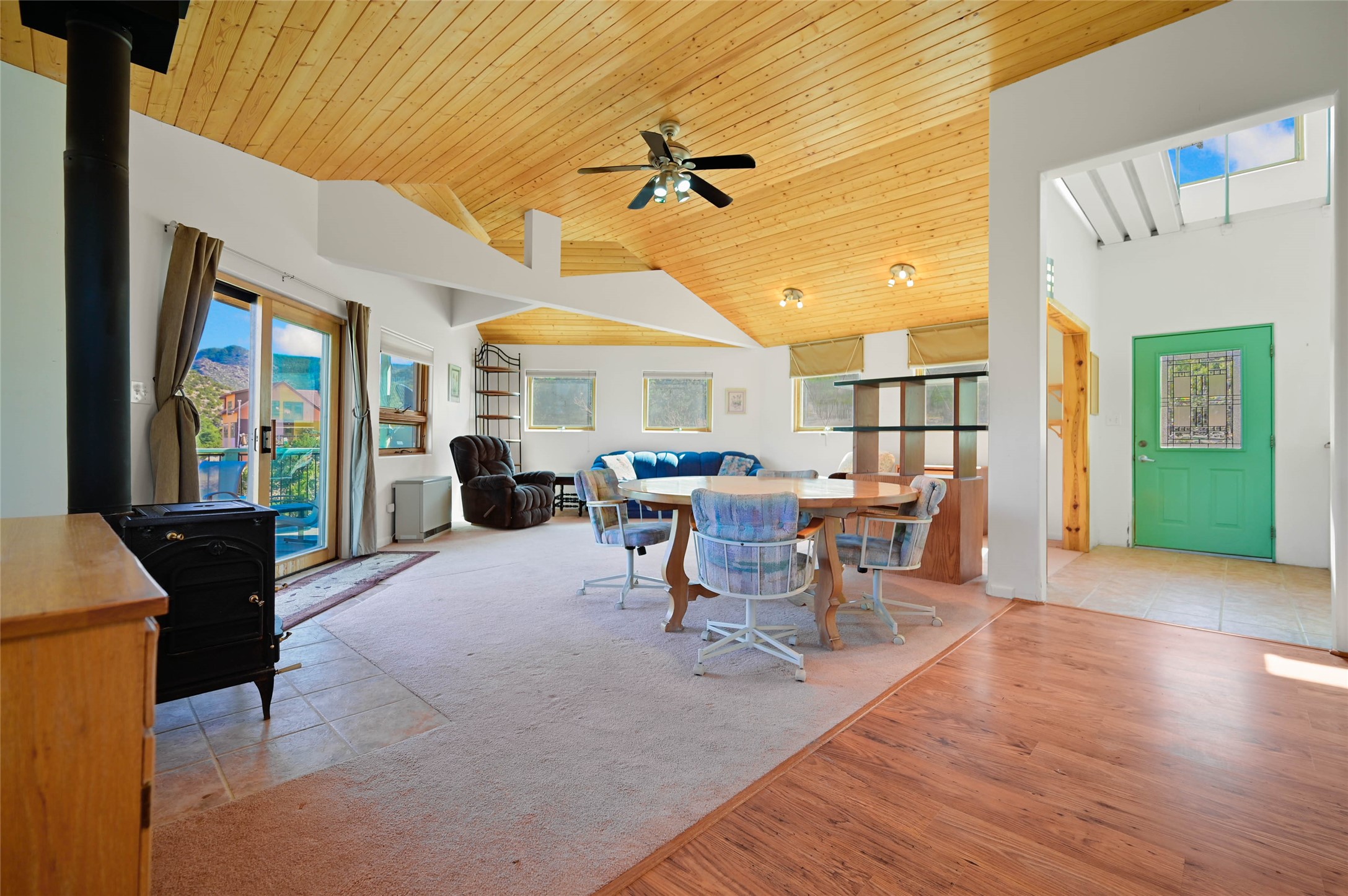 Welcome to your private mountain sanctuary! Tucked away just past Nambe and a scenic 25-minute drive from Santa Fe, this architecturally unique home offers the perfect blend of quietude and character. Whether you're drawn to the creative angles and beams, or the beautiful tongue-and-groove woodwork, this residence feels like a work of art. The thoughtful two-level layout features: Main Level: A spacious, light-filled great room designed for gathering, framed by expansive views of the surrounding landscape. Kitchen with ample counterspace and cabinet storage. A light filled Atrium, great for indoor plants, plus a powder room for convenience. Lower Level: Two comfortable bedroom suites, providing a peaceful and private retreat for family or guests. Each with a full bath. There is also a kitchenette area and laundry. Both bedrooms have direct access to the back patio Deck and Hot tub. Outdoor & Hobby Space: Situated on generous acreage with its own private well, the property includes a dedicated workshop and multiple carports--ideal for makers, collectors, or anyone needing extra room for gear and projects. If you've been looking for a home that breaks the "cookie-cutter" mold while staying close to the cultural heart of Santa Fe, this is the one.