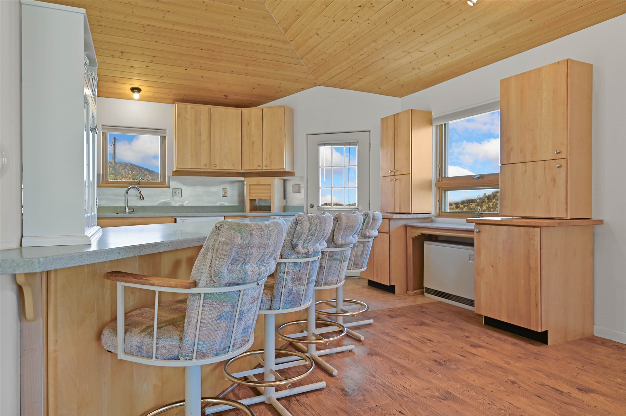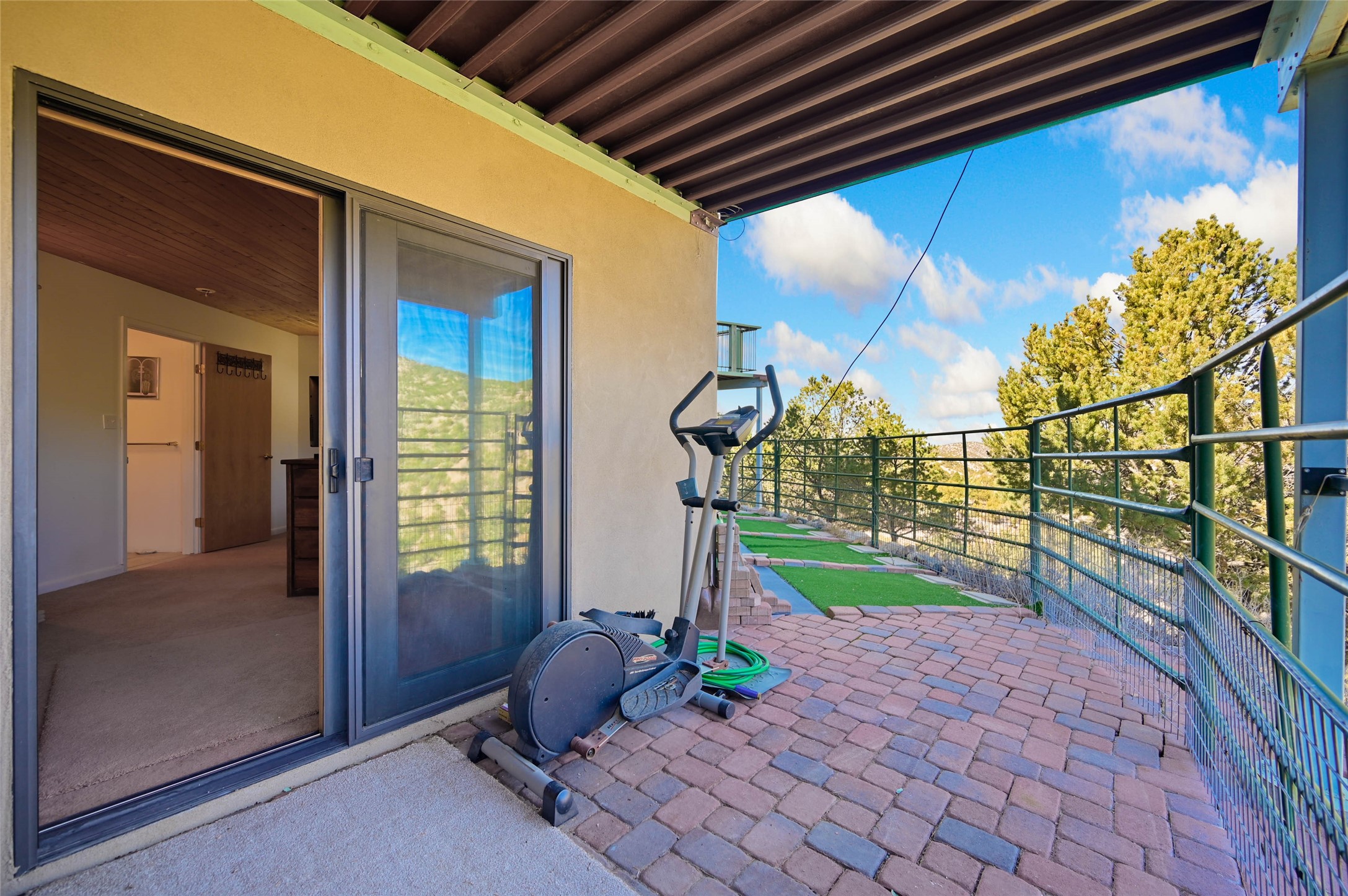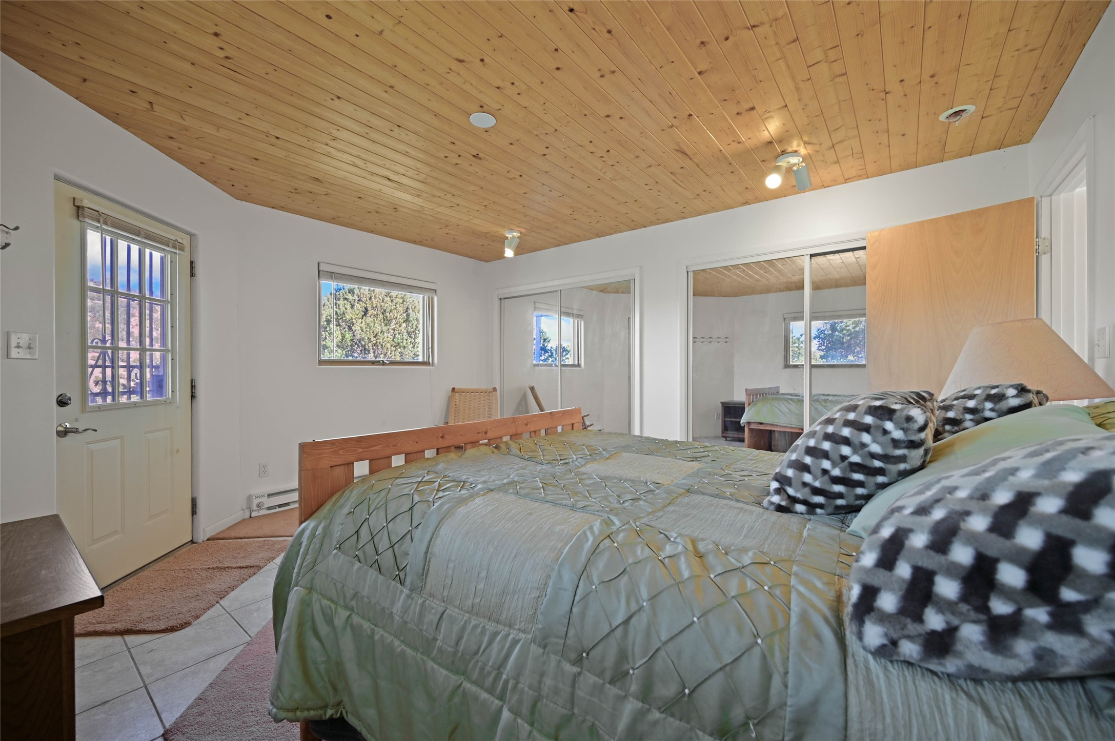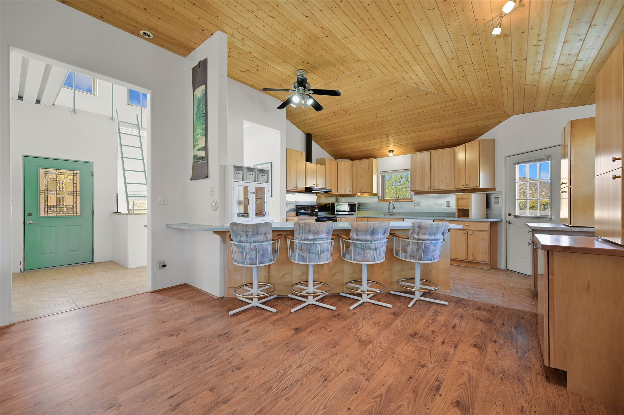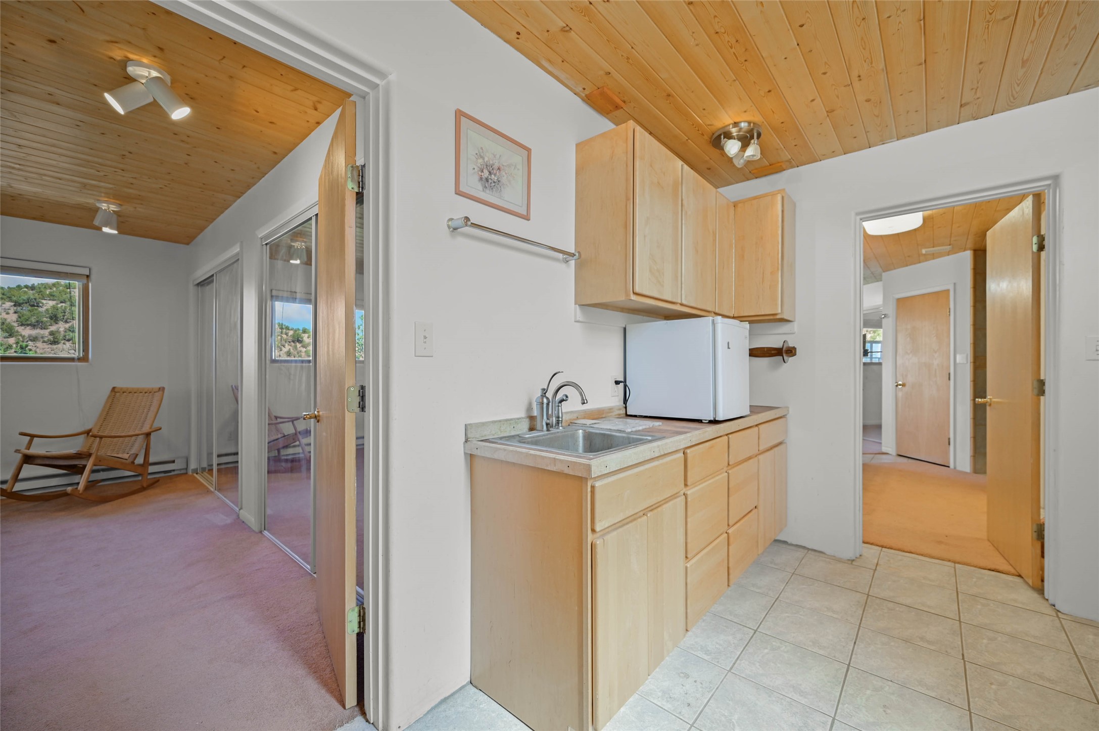 Welcome to your private mountain sanctuary! Tucked away just past Nambe and a scenic 25-minute drive from Santa Fe, this architecturally unique home offers the perfect blend of quietude and character. Whether you're drawn to the creative angles and beams, or the beautiful tongue-and-groove woodwork, this residence feels like a work of art. The thoughtful two-level layout features: Main Level: A spacious, light-filled great room designed for gathering, framed by expansive views of the surrounding landscape. Kitchen with ample counterspace and cabinet storage. A light filled Atrium, great for indoor plants, plus a powder room for convenience. Lower Level: Two comfortable bedroom suites, providing a peaceful and private retreat for family or guests. Each with a full bath. There is also a kitchenette area and laundry. Both bedrooms have direct access to the back patio Deck and Hot tub. Outdoor & Hobby Space: Situated on generous acreage with its own private well, the property includes a dedicated workshop and multiple carports--ideal for makers, collectors, or anyone needing extra room for gear and projects. If you've been looking for a home that breaks the "cookie-cutter" mold while staying close to the cultural heart of Santa Fe, this is the one.