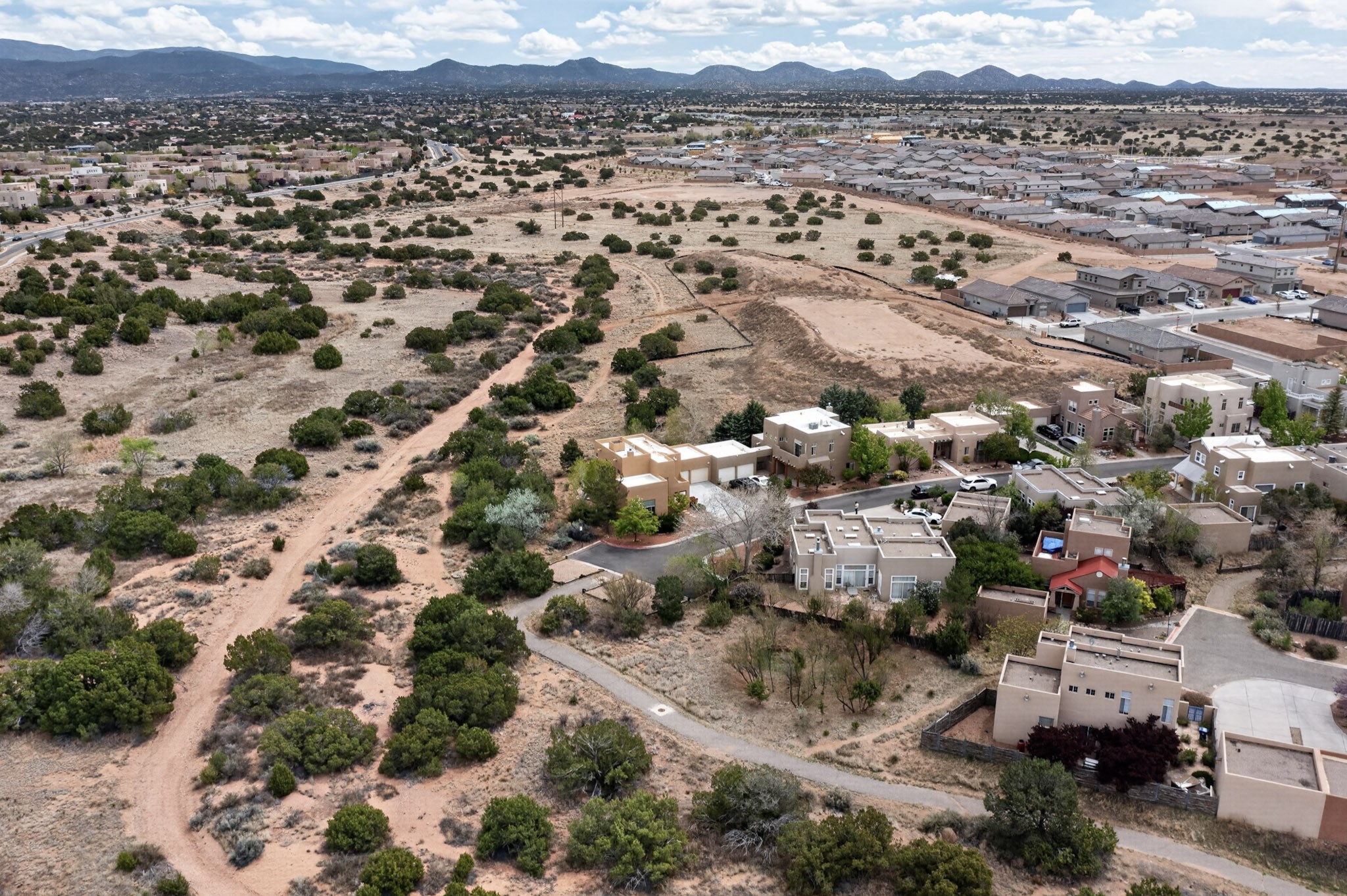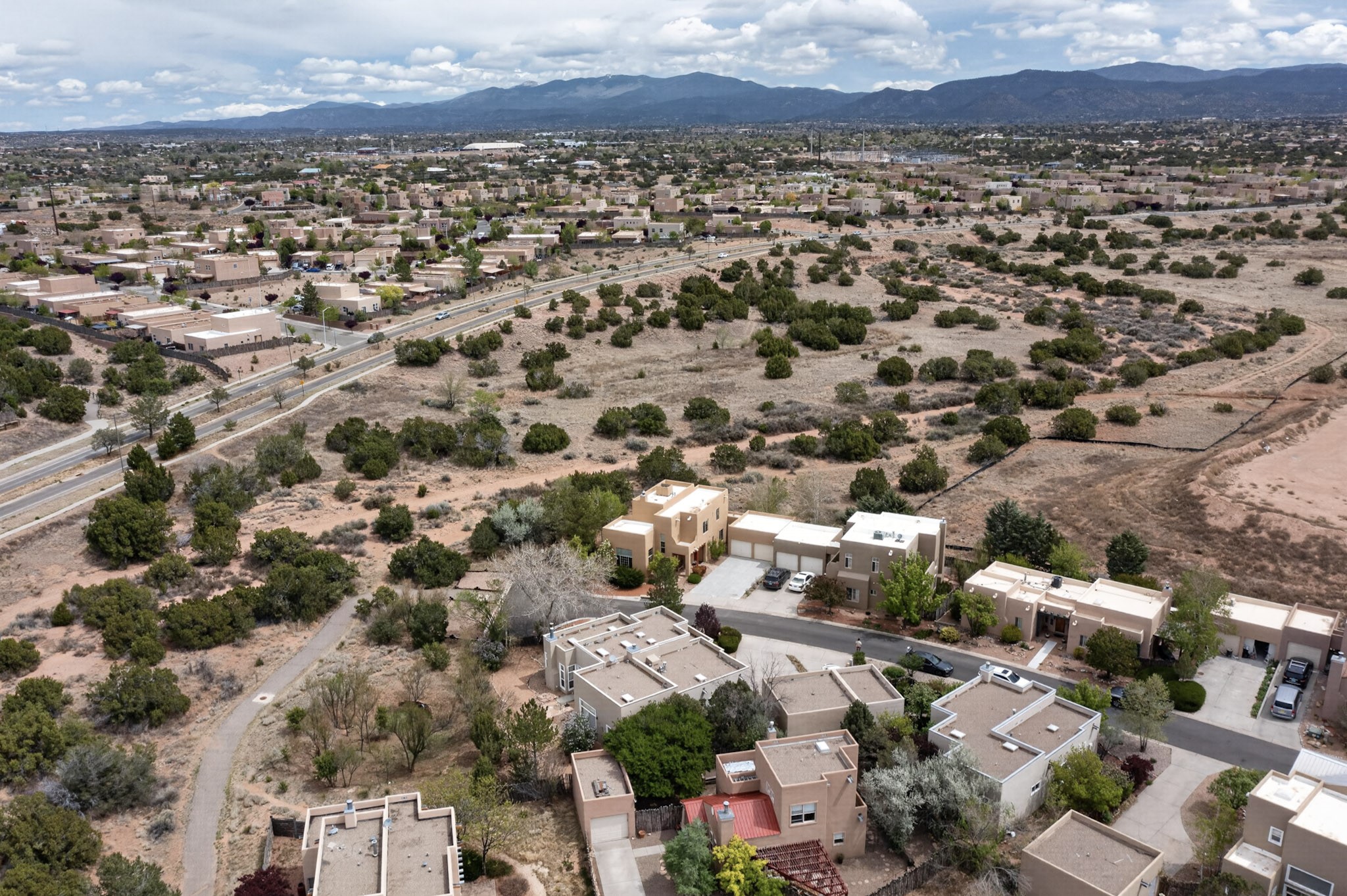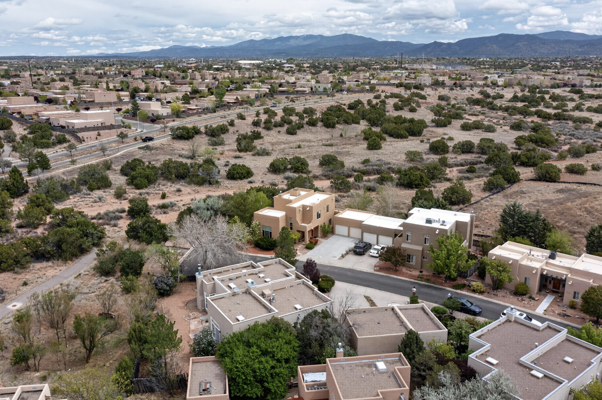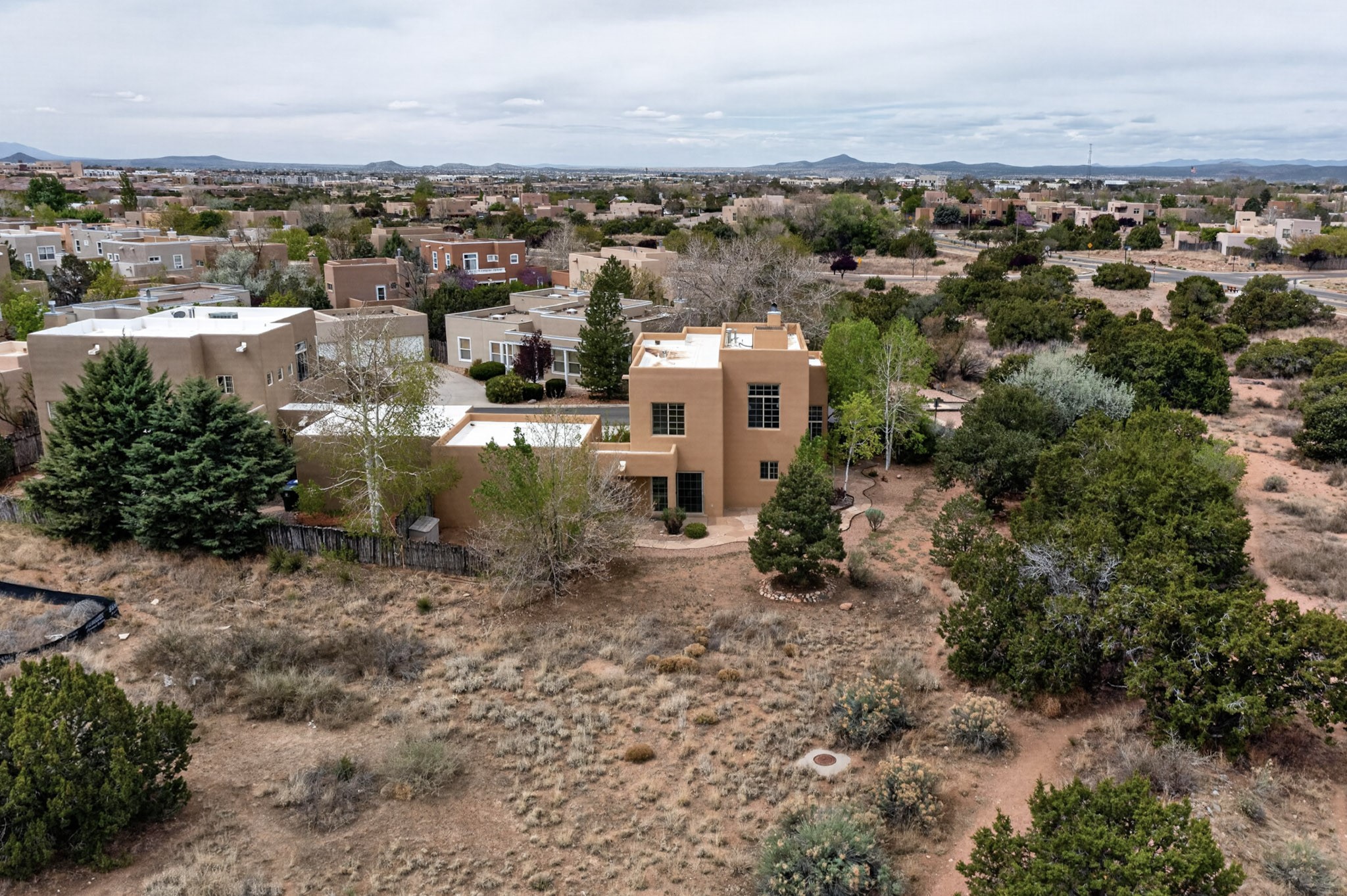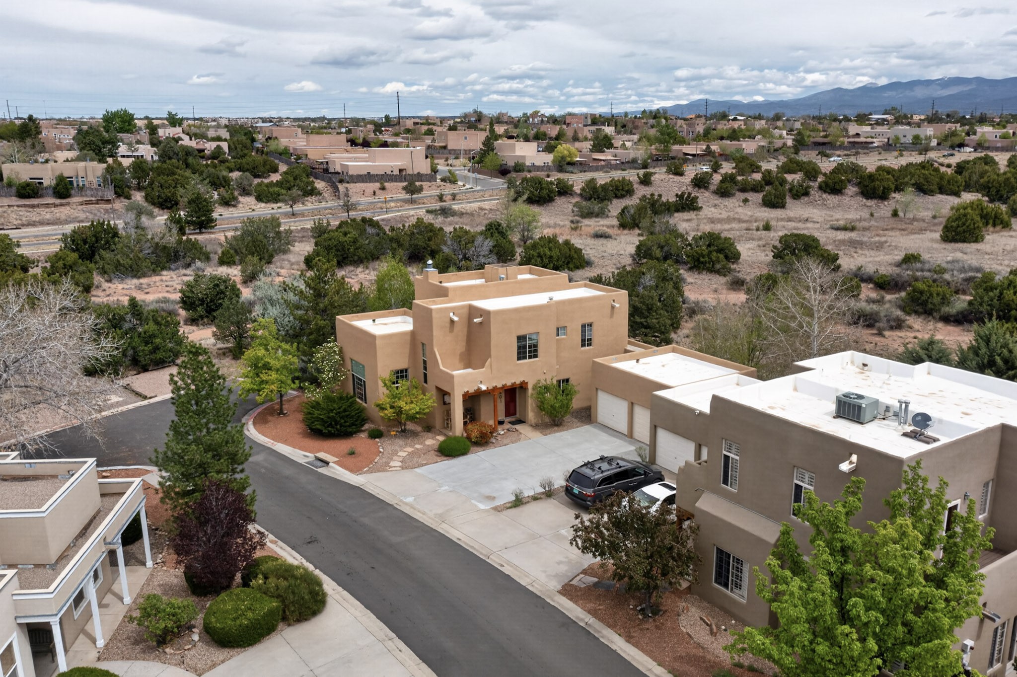Private, spacious, Nava Ade Gem with Mountain Views! Tucked away at the end of a quiet cul-de-sac & backing to some open space, this home provides tons of privacy, & access to Santa Fe's trail system. With appx 2,024 square feet of well-designed living space, this 3-bedroom + office (or 4th bedroom), 3-bathroom residence offers both flexibility & comfort. Step inside to a light-filled, two-story home to the living room featuring soaring ceiling with vigas & a two-sided gas (gas stub out has never been used-was added when home was built) & wood-burning fireplace shared w/ the dining area. The open-concept kitchen is ideal for entertaining, w/ granite countertops, an island, ample cabinetry, a pantry, & a water purification system at the sink. A standout feature is the versatile downstairs large office space--complete w/ a custom door & separate entrance from the kitchen & exterior--perfect for a studio, guest room, workout area, playroom, or 4th bedroom. Spacious primary suite w/ mountain views include an en-suite bath w/ dual vanity, a separate tub & shower, & a walk-in closet w/ built ins. 2 additional good-sized bedrooms & a full bath complete the upper level. Additional highlights include: Forced air heat w/ refrigerated air, washer/dryer, ceiling fans, track lighting, tile, carpet & NEW laminate flooring (2025) & NEW windows (2018-2019) on east, west, and south sides, NEW stucco (2020), NEW furnace/AC (+/- 2019), NEW refrigerator (+/- 2022), NEW garage door (2025), TPO roof, long driveway providing room for multiple cars, under-stair storage, drip irrigation & more. Enjoy peaceful mornings or evenings in the backyard from 2 patios, & open space offering a natural feel--yet you're only minutes from hospitals, restaurants, shopping, and schools. Nava Ade offers a clubhouse, pool, work-out room, hot tub & more in addition to a trail system connecting to the Arroyo Chamiso Trail, making it ideal for outdoor lovers.
