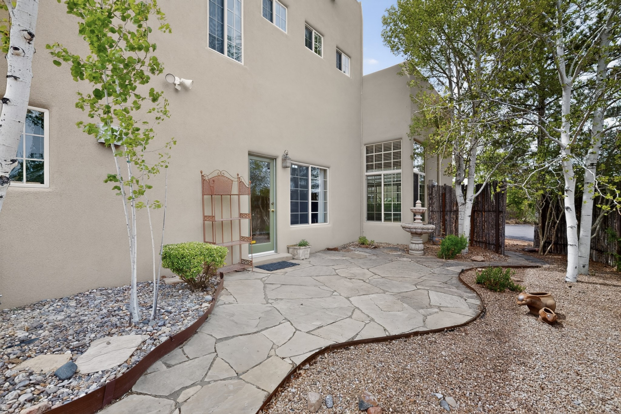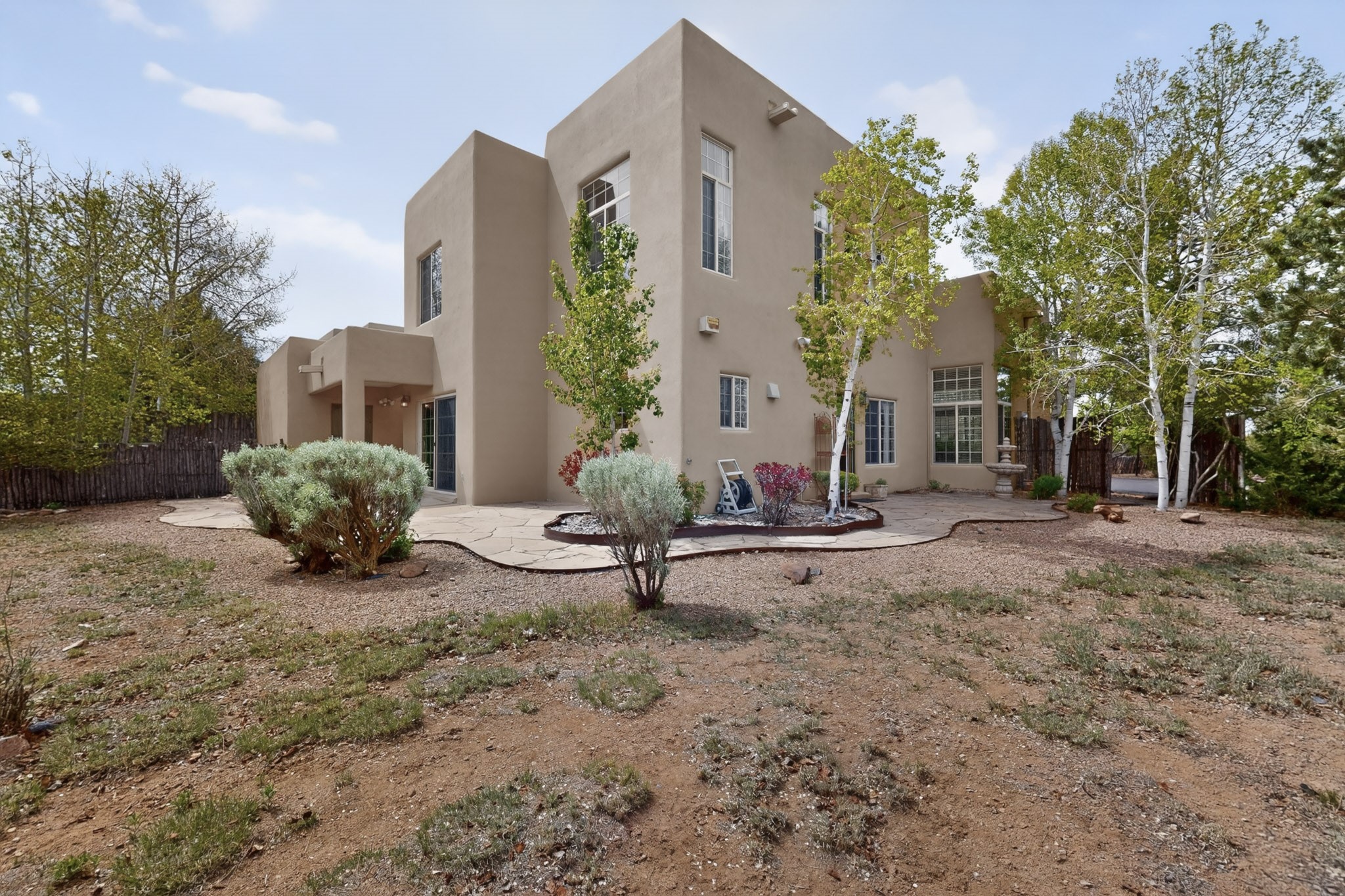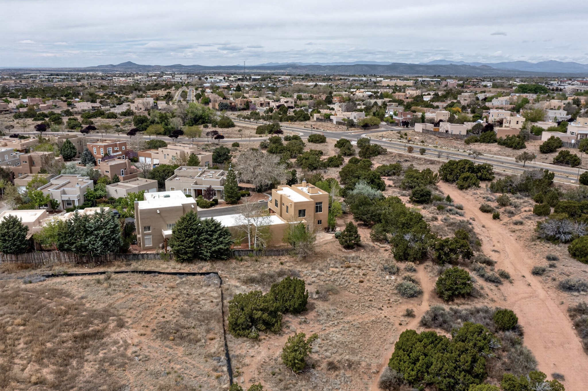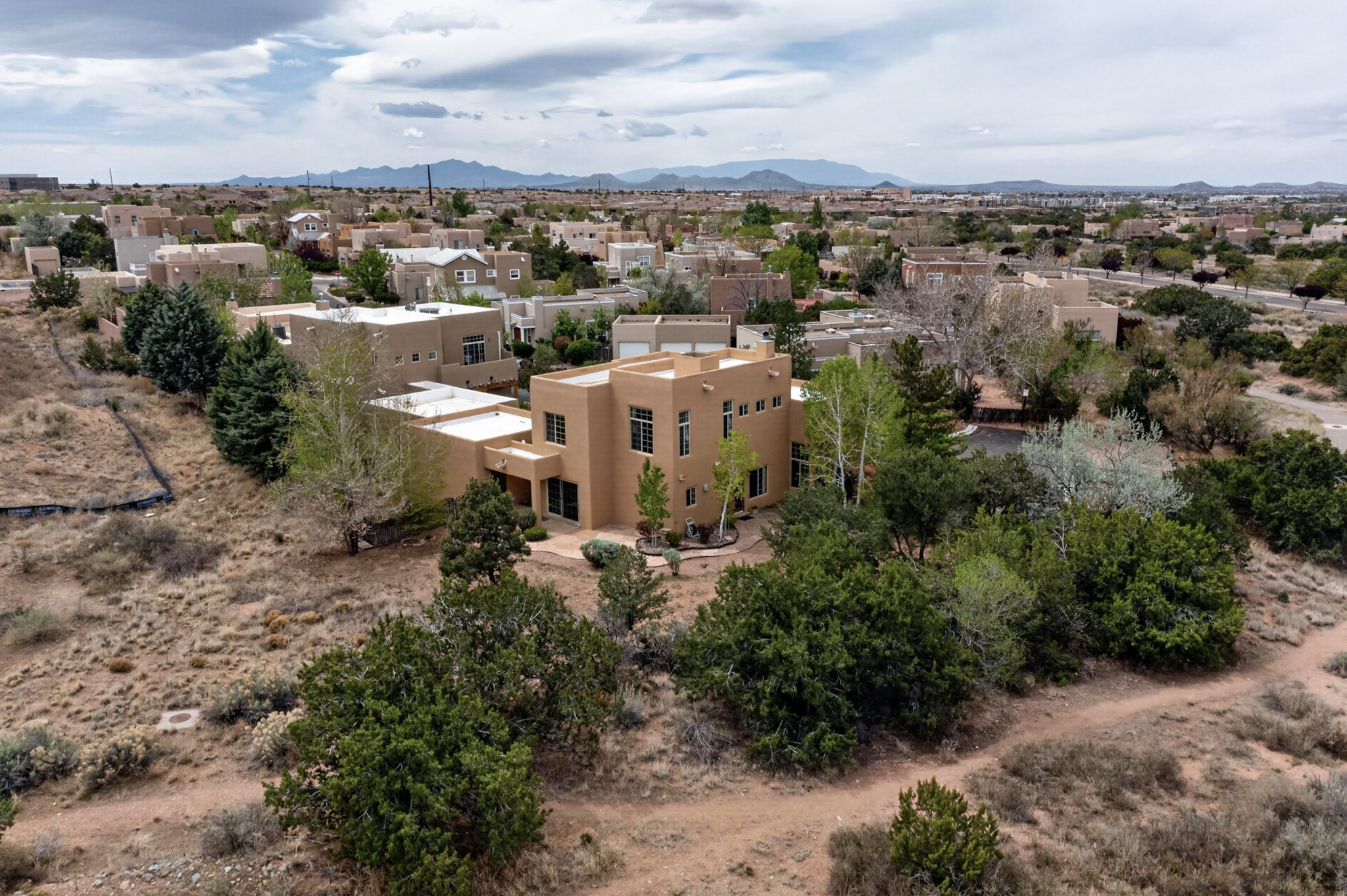 Private, spacious, Nava Ade Gem with Mountain Views! Tucked away at the end of a quiet cul-de-sac & backing to some open space, this home provides tons of privacy, & access to Santa Fe's trail system. With appx 2,024 square feet of well-designed living space, this 3-bedroom + office (or 4th bedroom), 3-bathroom residence offers both flexibility & comfort. Step inside to a light-filled, two-story home to the living room featuring soaring ceiling with vigas & a two-sided gas (gas stub out has never been used-was added when home was built) & wood-burning fireplace shared w/ the dining area. The open-concept kitchen is ideal for entertaining, w/ granite countertops, an island, ample cabinetry, a pantry, & a water purification system at the sink. A standout feature is the versatile downstairs large office space--complete w/ a custom door & separate entrance from the kitchen & exterior--perfect for a studio, guest room, workout area, playroom, or 4th bedroom. Spacious primary suite w/ mountain views include an en-suite bath w/ dual vanity, a separate tub & shower, & a walk-in closet w/ built ins. 2 additional good-sized bedrooms & a full bath complete the upper level. Additional highlights include: Forced air heat w/ refrigerated air, washer/dryer, ceiling fans, track lighting, tile, carpet & NEW laminate flooring (2025) & NEW windows (2018-2019) on east, west, and south sides, NEW stucco (2020), NEW furnace/AC (+/- 2019), NEW refrigerator (+/- 2022), NEW garage door (2025), TPO roof, long driveway providing room for multiple cars, under-stair storage, drip irrigation & more. Enjoy peaceful mornings or evenings in the backyard from 2 patios, & open space offering a natural feel--yet you're only minutes from hospitals, restaurants, shopping, and schools. Nava Ade offers a clubhouse, pool, work-out room, hot tub & more in addition to a trail system connecting to the Arroyo Chamiso Trail, making it ideal for outdoor lovers.