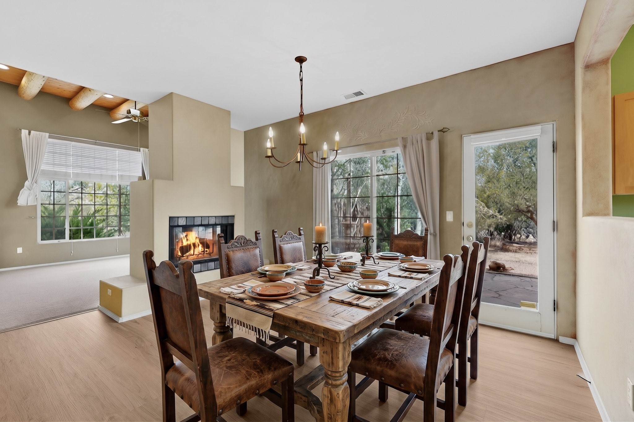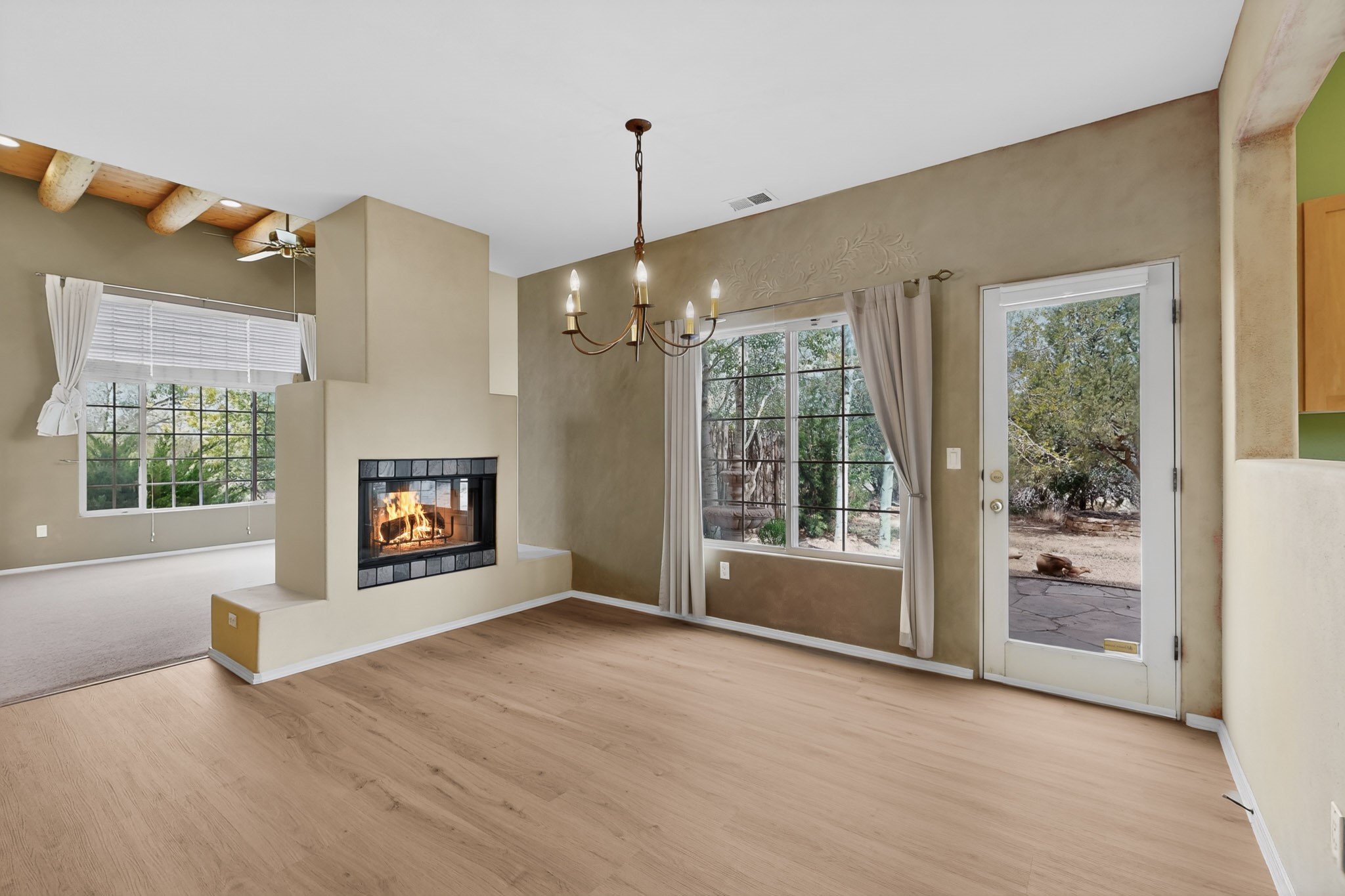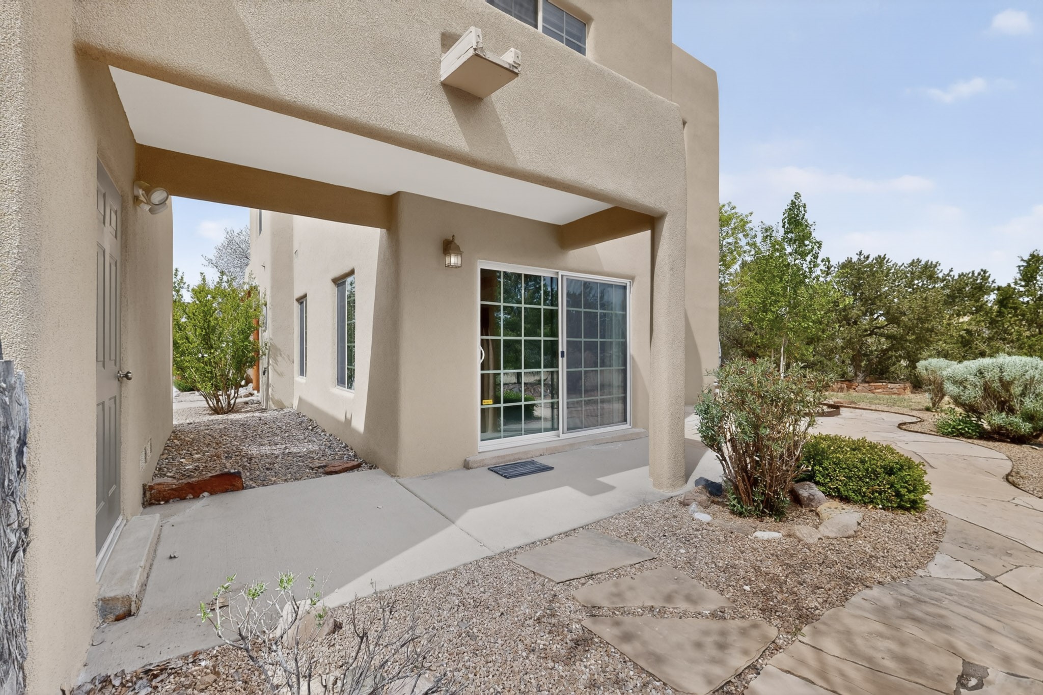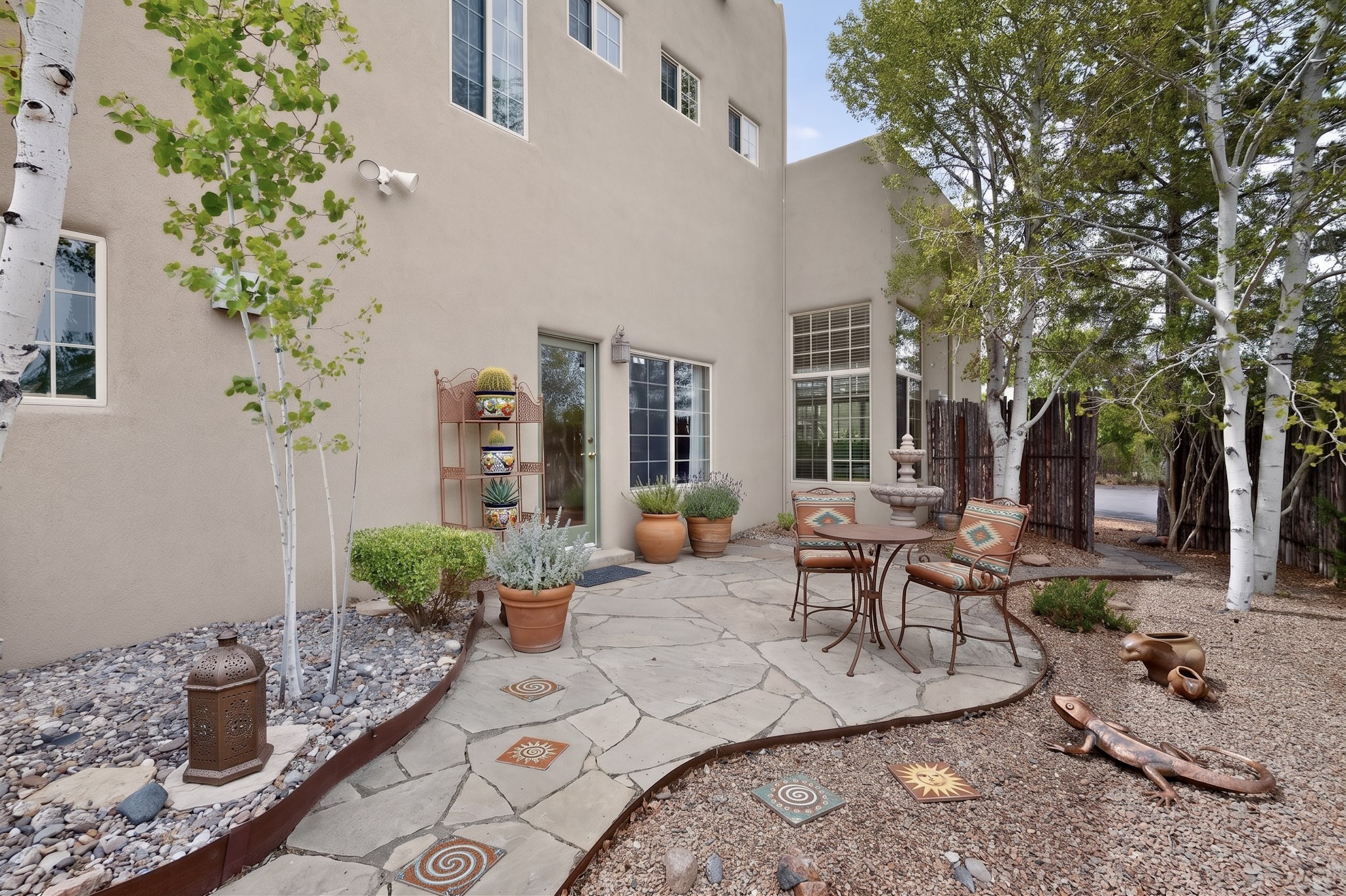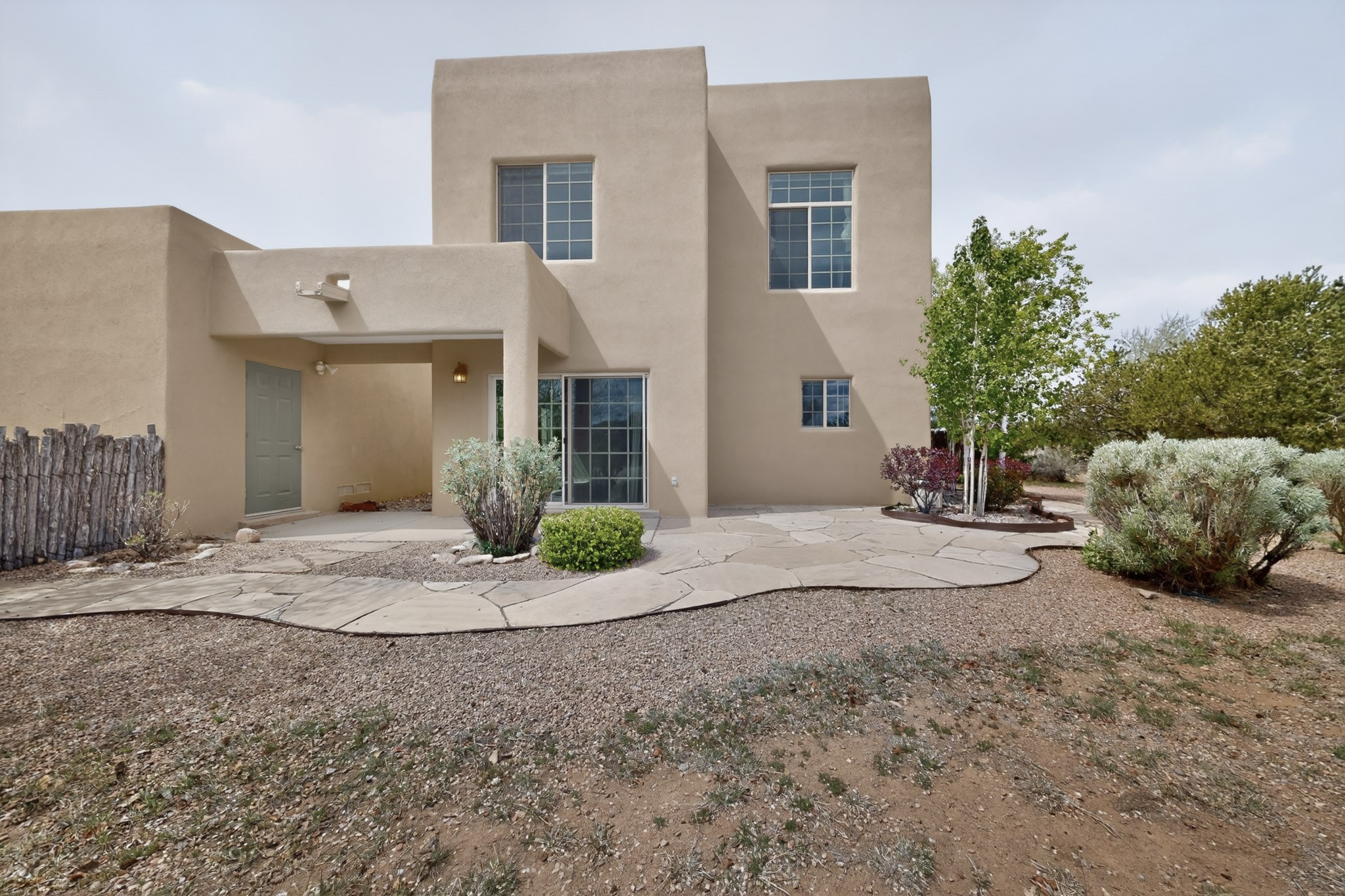 Private, spacious, Nava Ade Gem with Mountain Views! Tucked away at the end of a quiet cul-de-sac & backing to some open space, this home provides tons of privacy, & access to Santa Fe's trail system. With appx 2,024 square feet of well-designed living space, this 3-bedroom + office (or 4th bedroom), 3-bathroom residence offers both flexibility & comfort. Step inside to a light-filled, two-story home to the living room featuring soaring ceiling with vigas & a two-sided gas (gas stub out has never been used-was added when home was built) & wood-burning fireplace shared w/ the dining area. The open-concept kitchen is ideal for entertaining, w/ granite countertops, an island, ample cabinetry, a pantry, & a water purification system at the sink. A standout feature is the versatile downstairs large office space--complete w/ a custom door & separate entrance from the kitchen & exterior--perfect for a studio, guest room, workout area, playroom, or 4th bedroom. Spacious primary suite w/ mountain views include an en-suite bath w/ dual vanity, a separate tub & shower, & a walk-in closet w/ built ins. 2 additional good-sized bedrooms & a full bath complete the upper level. Additional highlights include: Forced air heat w/ refrigerated air, washer/dryer, ceiling fans, track lighting, tile, carpet & NEW laminate flooring (2025) & NEW windows (2018-2019) on east, west, and south sides, NEW stucco (2020), NEW furnace/AC (+/- 2019), NEW refrigerator (+/- 2022), NEW garage door (2025), TPO roof, long driveway providing room for multiple cars, under-stair storage, drip irrigation & more. Enjoy peaceful mornings or evenings in the backyard from 2 patios, & open space offering a natural feel--yet you're only minutes from hospitals, restaurants, shopping, and schools. Nava Ade offers a clubhouse, pool, work-out room, hot tub & more in addition to a trail system connecting to the Arroyo Chamiso Trail, making it ideal for outdoor lovers.