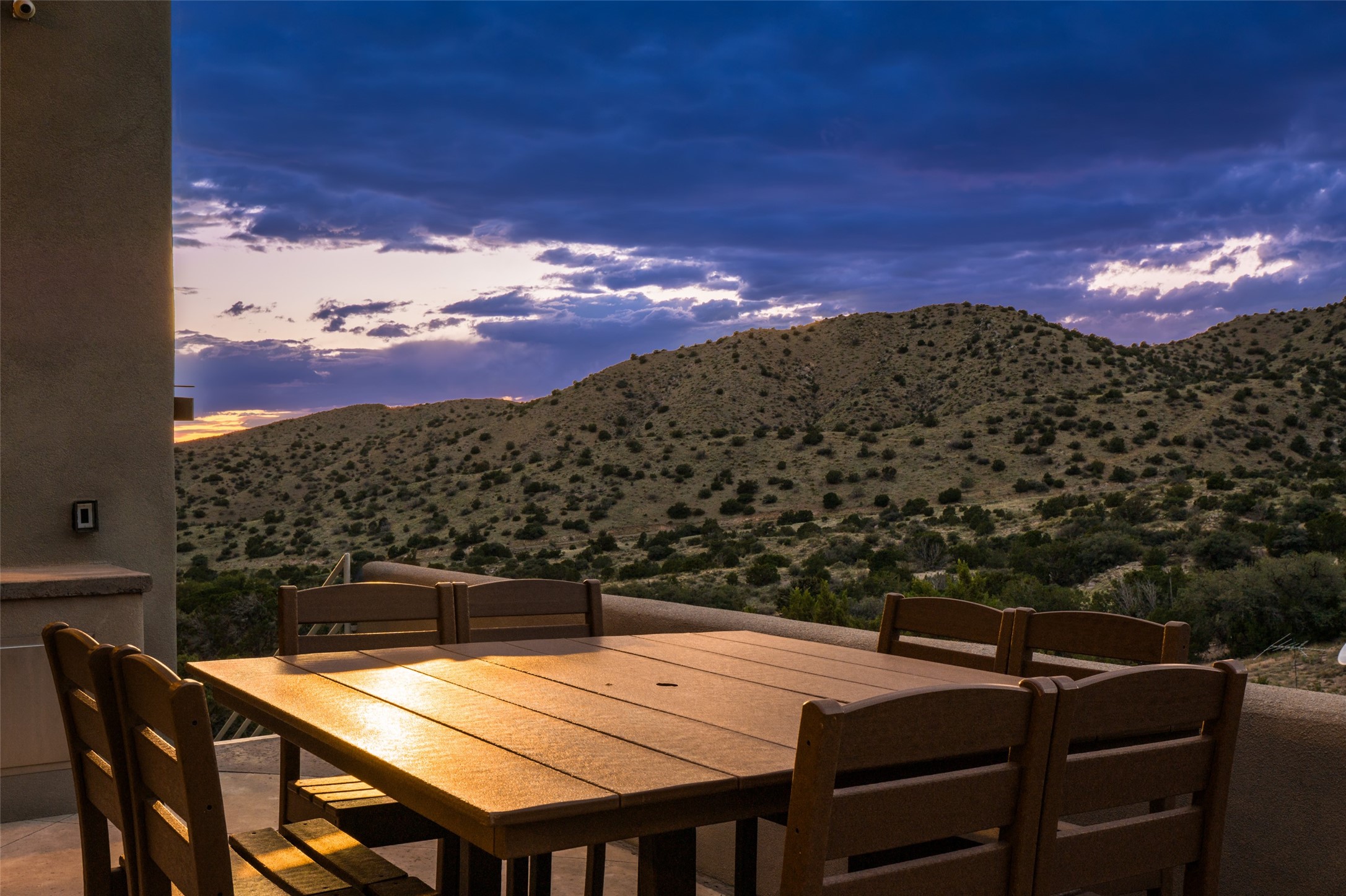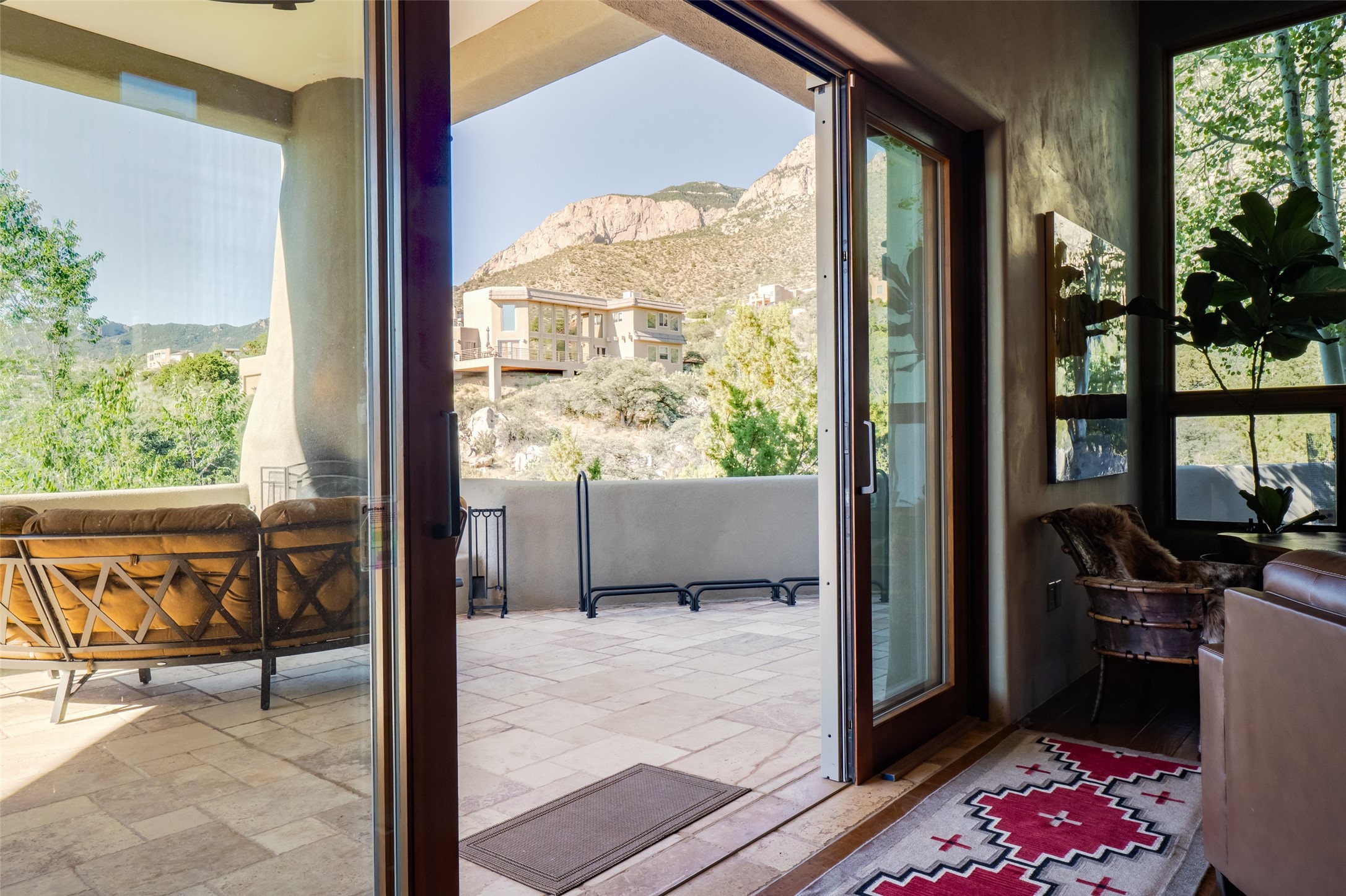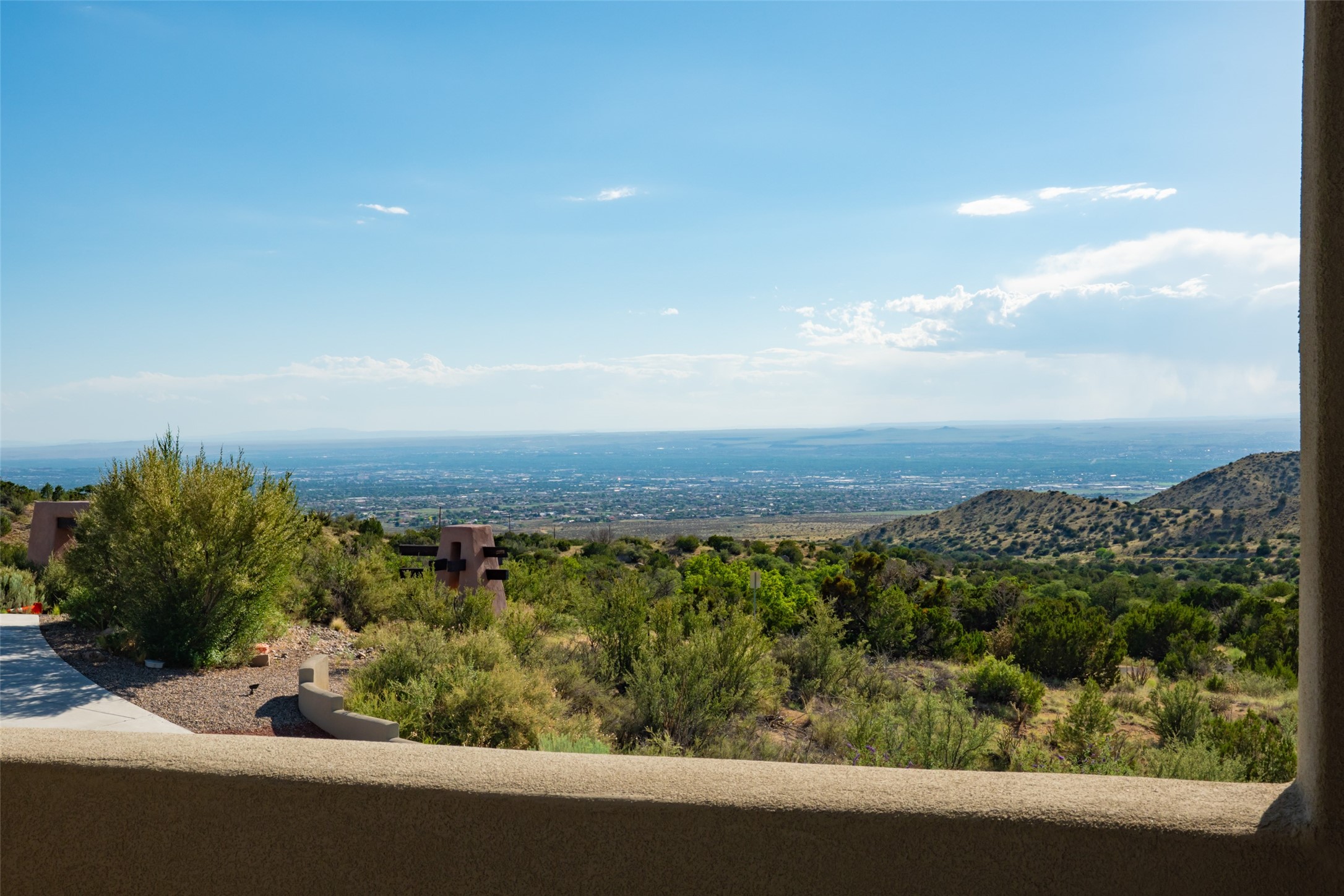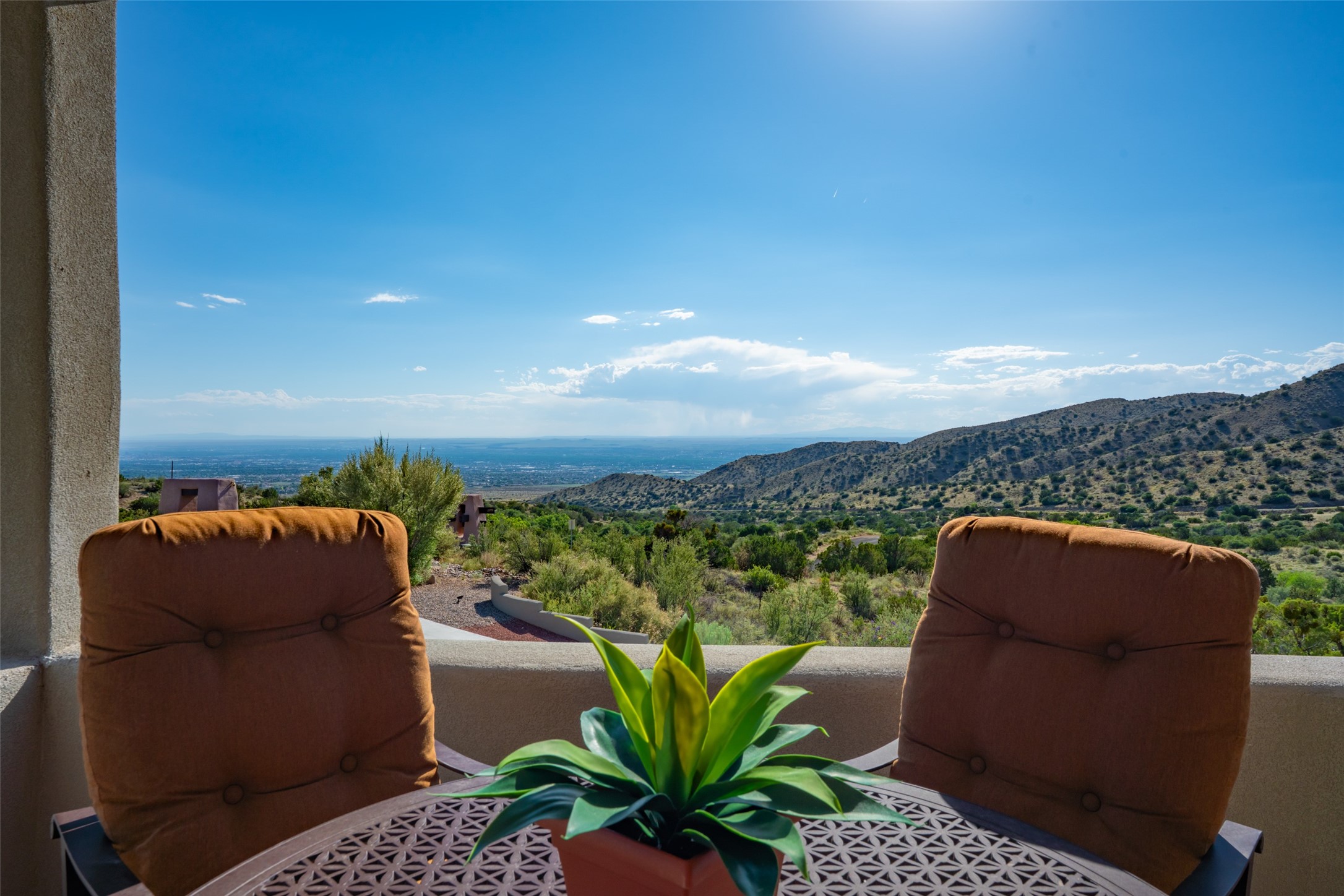 Bordered on the front by National Forest land with sunsets, city lights & Monsoon storms rolling out before you endlessly and with our beautiful Sandias on the back side, this home is superbly located to bring nature and all its glory into your daily life. Views of something special from most every room. Easy hiking access. 1.19 acre. Quality throughout - in the materials, design, and presentation. Designed in wings for absolute privacy, find 3 different bedroom wings. A luxurious primary on main floor including a sitting room/workout room/office, elegant walk-in closet with built-ins, spacious sleeping space with patio access and gas fireplace, spa like bath with huge shower, steam shower, soaking tub, double sinks, access to two patios - one with a hot tub to enjoy the starry nights. Main floor guest room with private bath and sitting room could be an excellent in-law suite with no step shower. Center of home features great room bordered on each side with wonderful patio spaces, one with a kiva fireplace. This homes welcomes the outside in! Hand scraped wood floors, wood burning fireplace, plaster walls and beautiful built-ins. Formal dining currently has a pool table in it showing the flexibility of the space. The kitchen enjoys expansive views, and includes a large island, multiple sinks and prep areas, warming drawer, gas stove, double ovens and walk-in pantry with dumb waiter. Opposite side of home and up a few steps find another private bedroom with balcony to enjoy the forever views. Beside this room is a wonderful flex space with wet bar. Currently used as a TV rm but could be office, playroom, or bedroom if closet added. City lights twinkle below from this room. Oversized 3 car garage with charger. Owned solar. This home is very special .