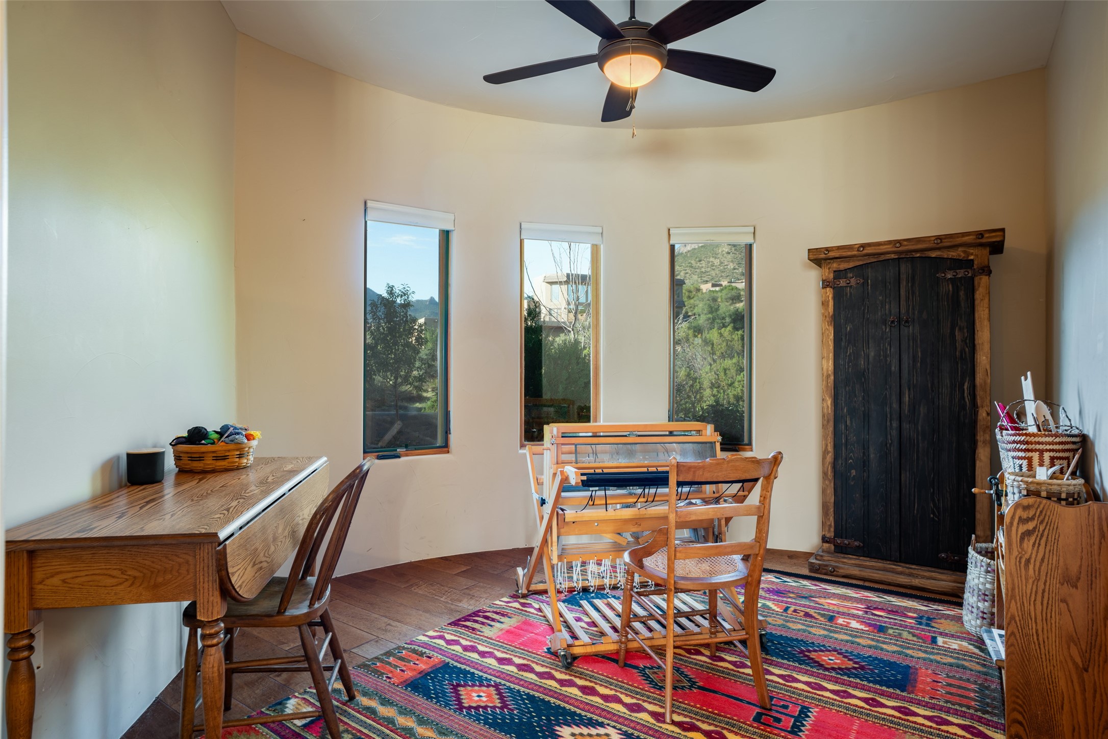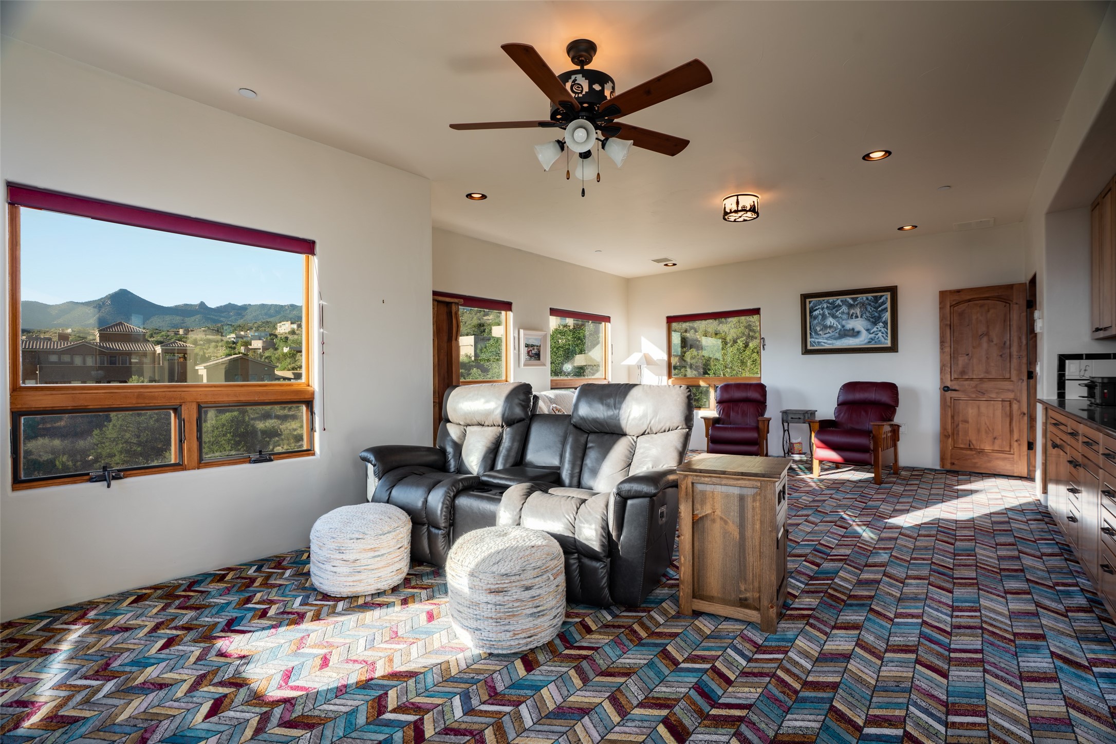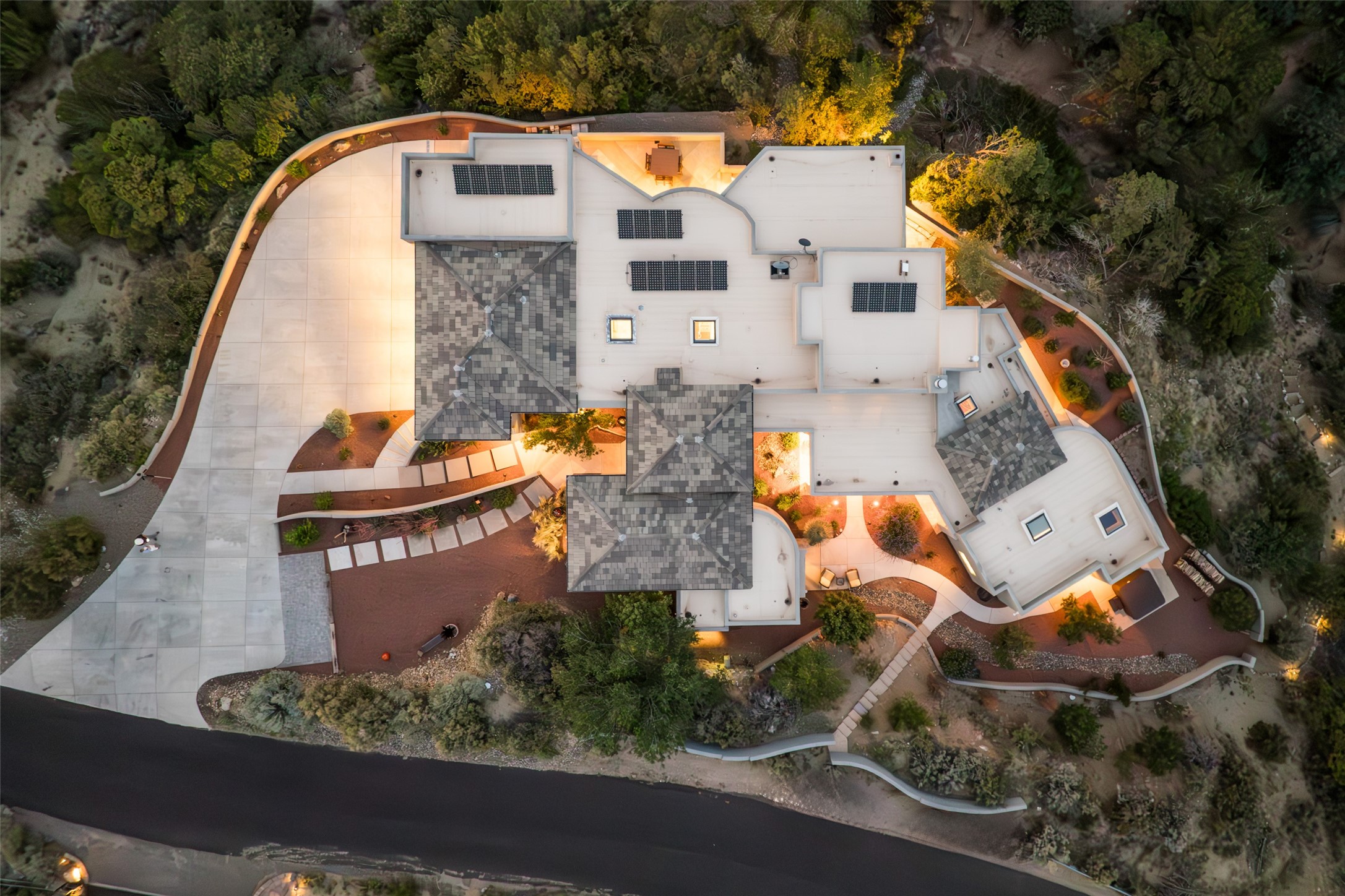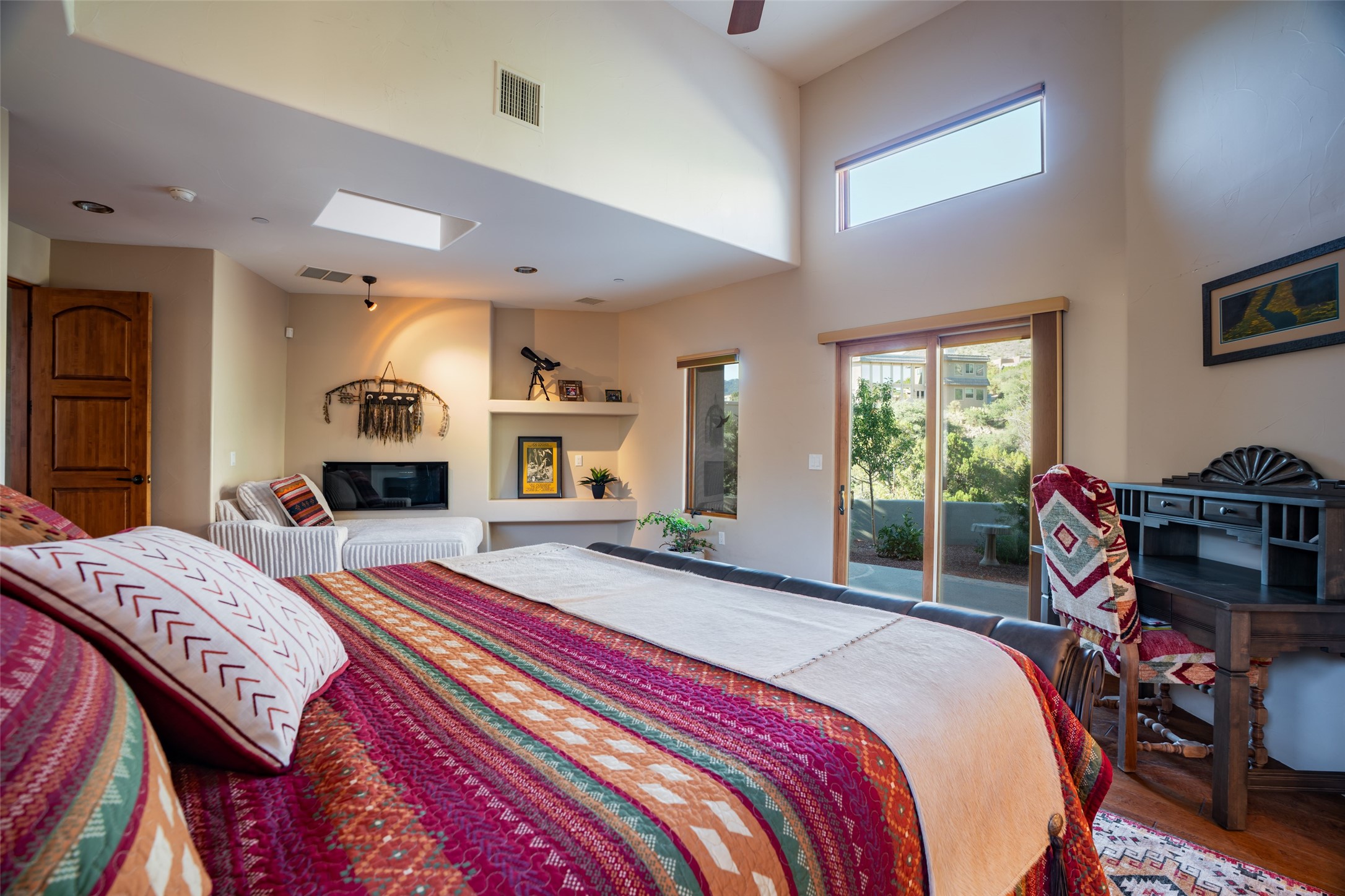 Bordered on the front by National Forest land with sunsets, city lights & Monsoon storms rolling out before you endlessly and with our beautiful Sandias on the back side, this home is superbly located to bring nature and all its glory into your daily life. Views of something special from most every room. Easy hiking access. 1.19 acre. Quality throughout - in the materials, design, and presentation. Designed in wings for absolute privacy, find 3 different bedroom wings. A luxurious primary on main floor including a sitting room/workout room/office, elegant walk-in closet with built-ins, spacious sleeping space with patio access and gas fireplace, spa like bath with huge shower, steam shower, soaking tub, double sinks, access to two patios - one with a hot tub to enjoy the starry nights. Main floor guest room with private bath and sitting room could be an excellent in-law suite with no step shower. Center of home features great room bordered on each side with wonderful patio spaces, one with a kiva fireplace. This homes welcomes the outside in! Hand scraped wood floors, wood burning fireplace, plaster walls and beautiful built-ins. Formal dining currently has a pool table in it showing the flexibility of the space. The kitchen enjoys expansive views, and includes a large island, multiple sinks and prep areas, warming drawer, gas stove, double ovens and walk-in pantry with dumb waiter. Opposite side of home and up a few steps find another private bedroom with balcony to enjoy the forever views. Beside this room is a wonderful flex space with wet bar. Currently used as a TV rm but could be office, playroom, or bedroom if closet added. City lights twinkle below from this room. Oversized 3 car garage with charger. Owned solar. This home is very special .