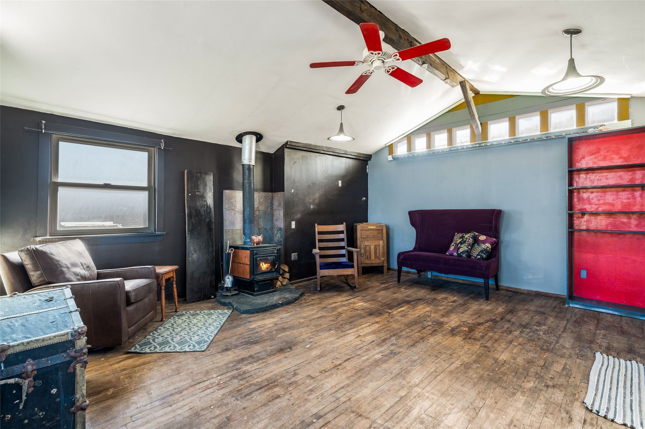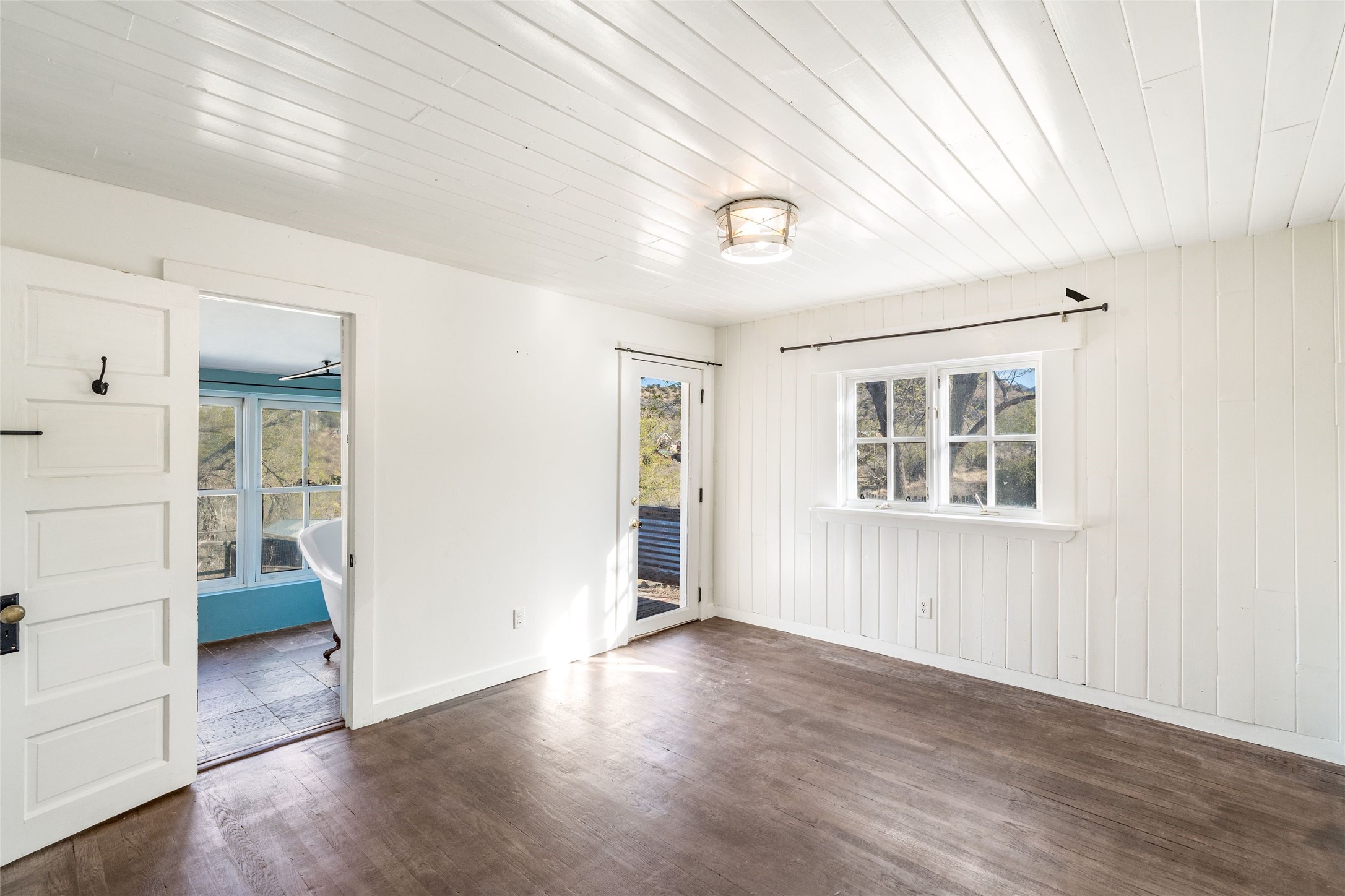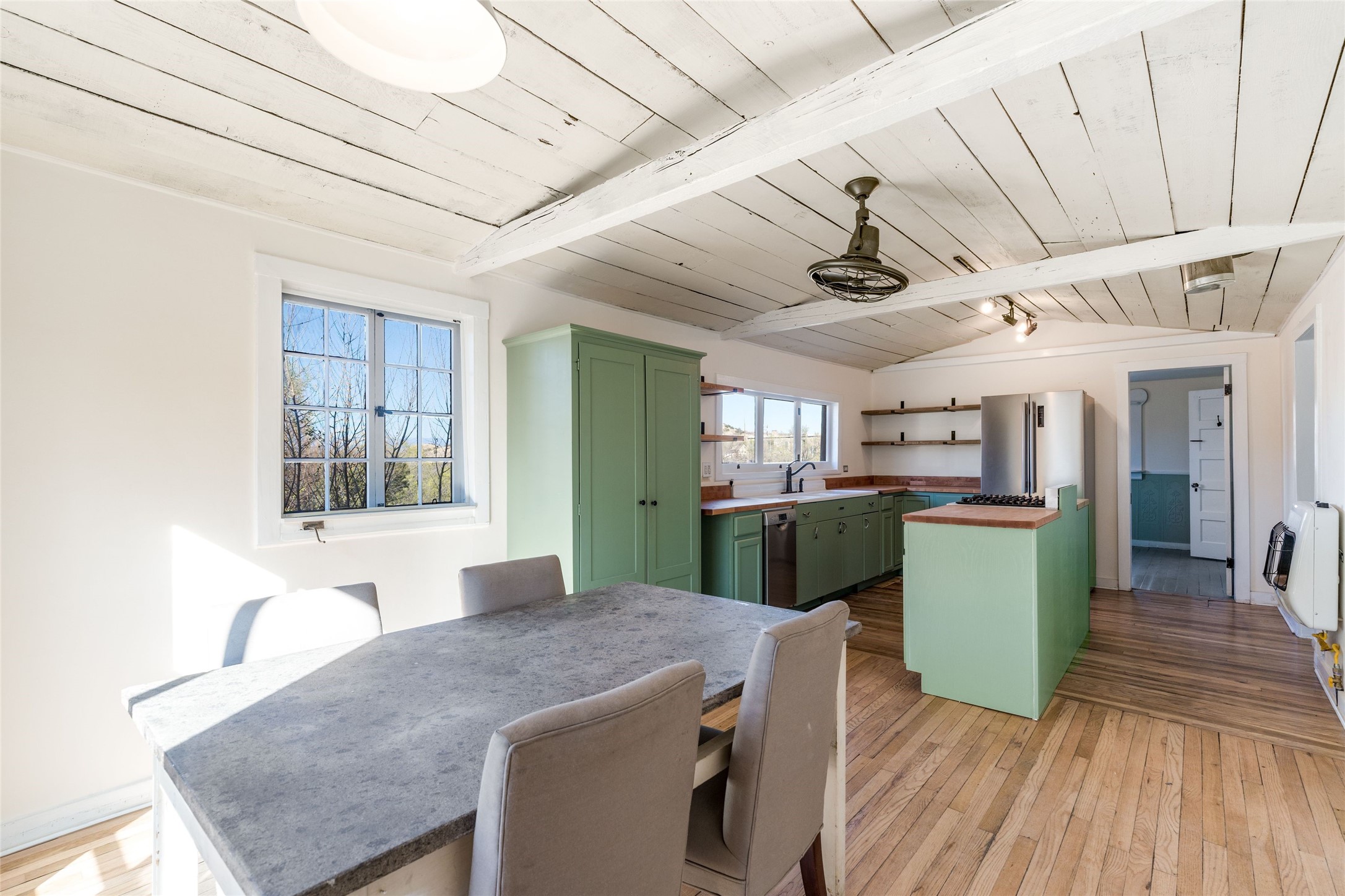 Nestled on an oversized lot bordering the town greenbelt, this beautifully updated Madrid cabin blends historic character with thoughtful modern enhancements. The expanded country kitchen is a true centerpiece, featuring open shelving, butcher-block counters, and a generous center island ideal for gourmet cooking and entertaining. The updated bathroom offers a luxurious soaking tub, and much of the home's original hardwood flooring has been lovingly preserved. A heated sunroom provides a bright, welcoming living space, while one of the bedrooms showcases classic English wainscoting that adds to the home's timeless charm. The main bedroom opens onto a private porch overlooking the greenbelt--an ideal spot for morning coffee or evening relaxation. The property also includes a versatile detached studio complete with a sink, woodstove, private porch, and an additional bathroom ready for activation. Perfect for artists, guests, or a home office. Outside, enjoy views of the Sangre de Cristo Mountains from the landscaped yard, with direct access to the greenbelt leading to a 40-acre county open space--perfect for hiking and exploring. Residents of Madrid also share ownership of the historic Madrid Ballpark, the first lighted ballpark in North America and still a vibrant hub for community events and tournaments. Located within easy walking distance of Madrid's general store, restaurants, coffee shop, and galleries, this home offers a rare blend of privacy, character, and walkable village living. Convenient access to both Albuquerque and Santa Fe completes the package, making this a truly special opportunity in the heart of Madrid.