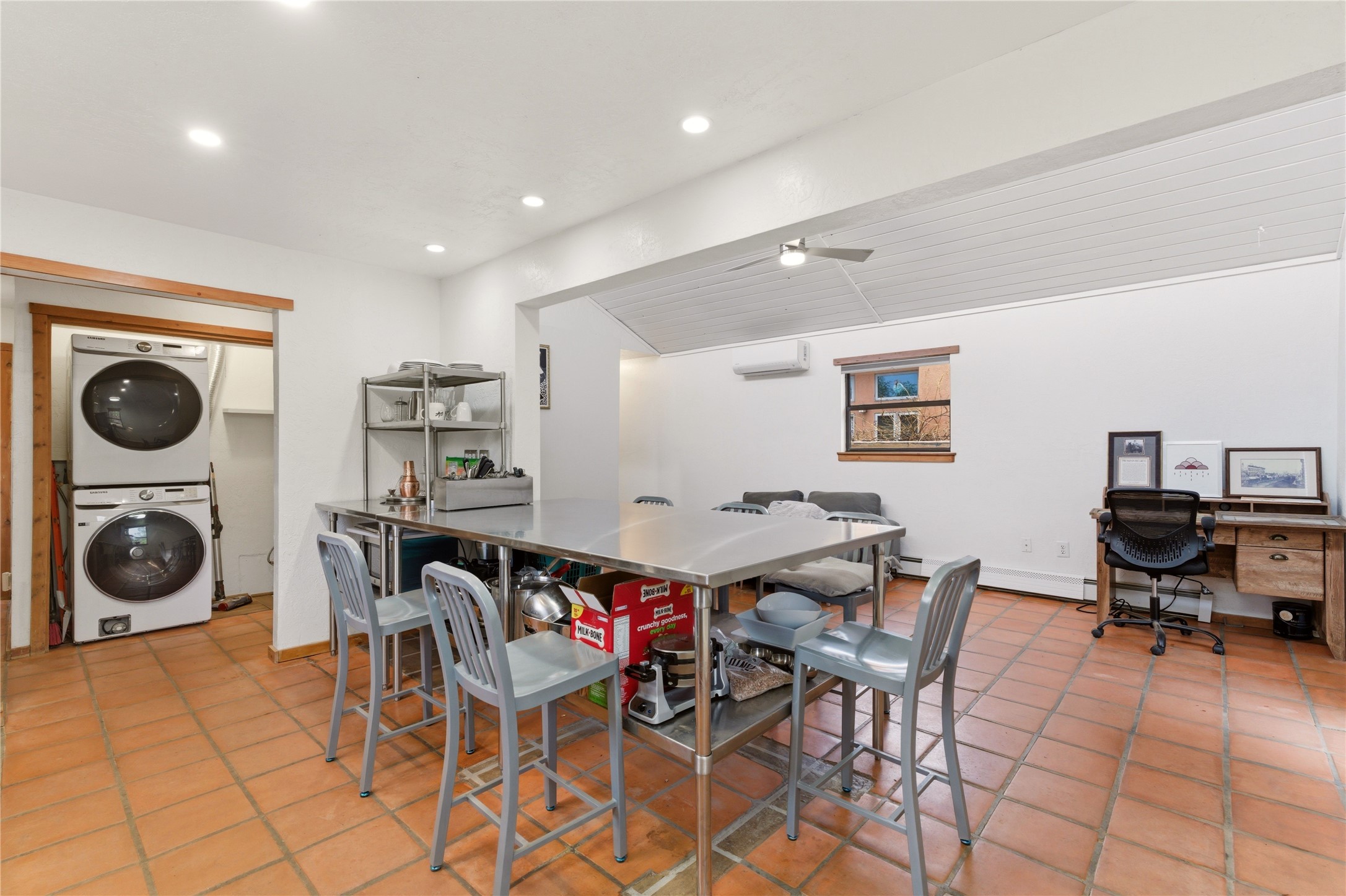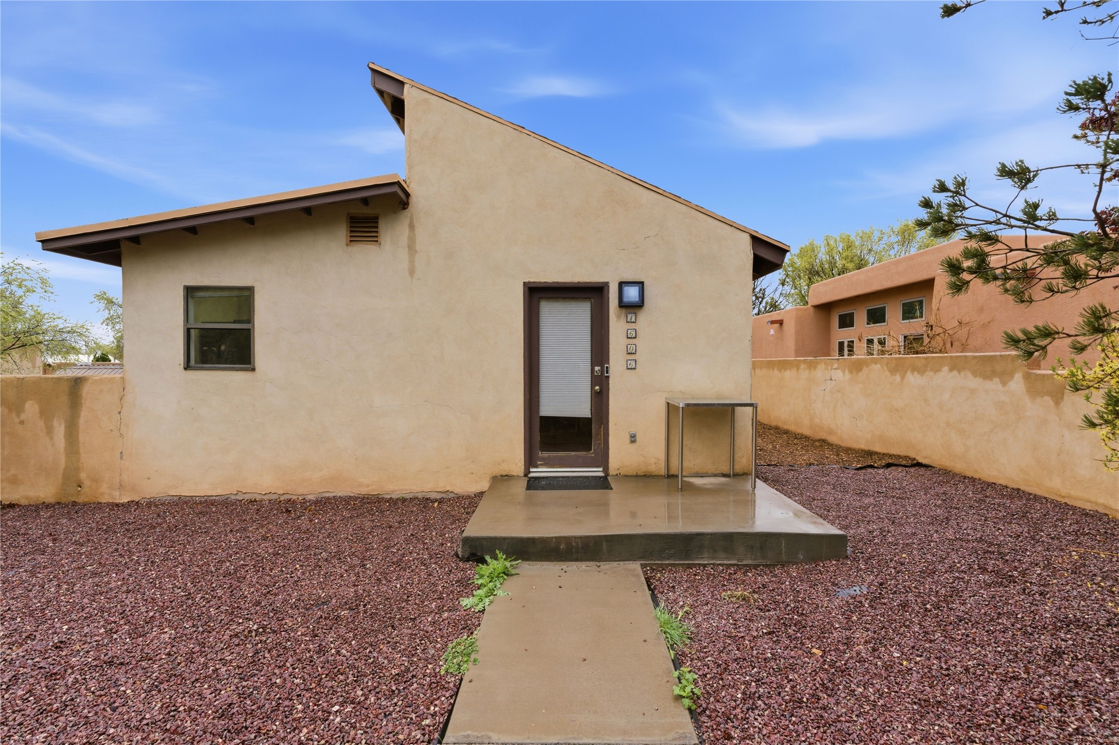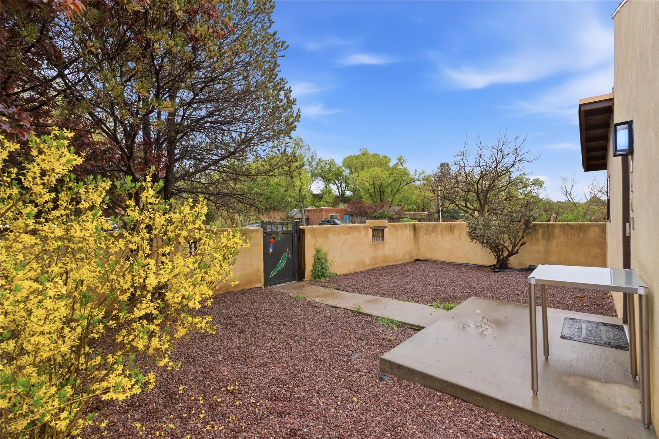 Set behind a walled front courtyard, this 2-bedroom, 2-bath home offers a clean, straightforward layout with a mix of traditional Santa Fe elements and more modern updates. The main living area is open with good natural light, higher ceilings, and clerestory windows that help the space feel larger than the footprint suggests. The kitchen is simple and functional with stainless steel counters, open shelving, and a commercial-style sink. It connects easily to the living area, making the space flexible for day-to-day use. Both bedrooms are well-sized with updated flooring, and the bathrooms have been refreshed with a clean, minimal finish. Heating and cooling are handled by mini-splits, along with baseboard hot water heat. Outside, there's a private front courtyard and a larger fenced backyard with room to expand, garden, or just leave as is. Off-street parking and low-maintenance landscaping keep things easy. The location offers quick access to downtown Santa Fe and surrounding areas, making it a practical option for a primary residence, second home, or investment.