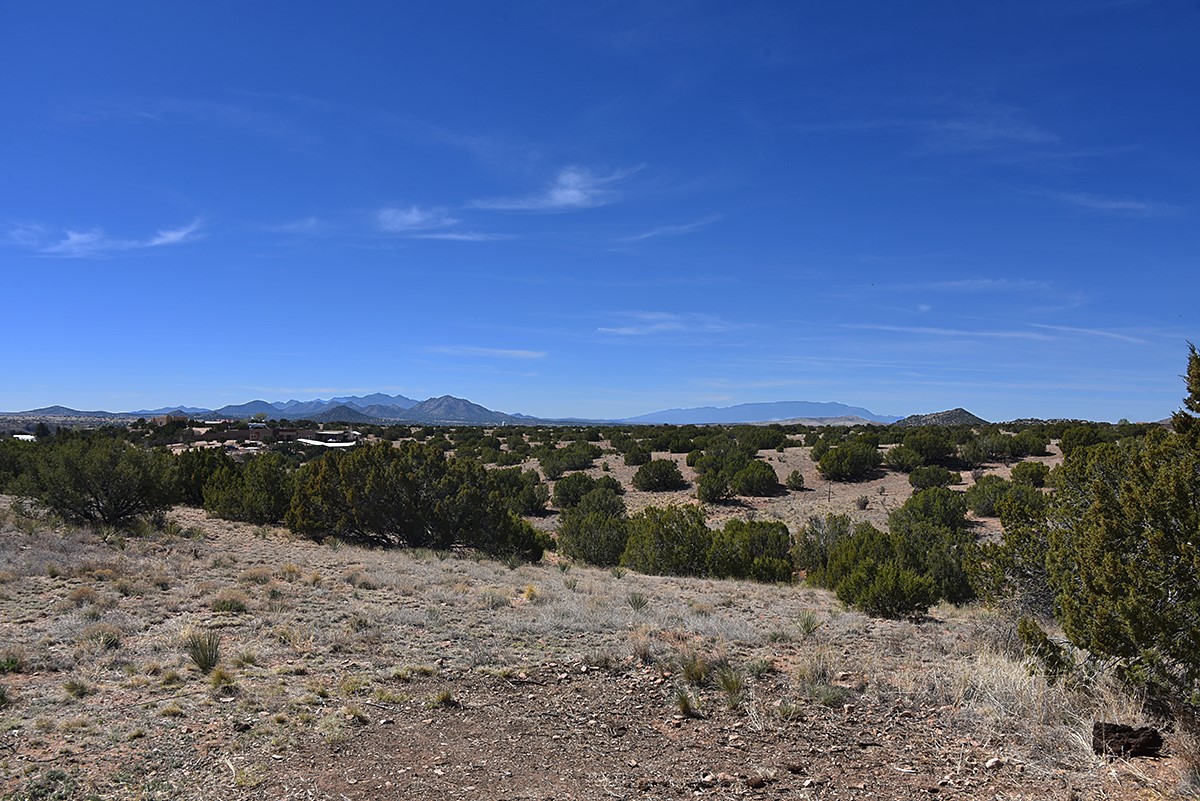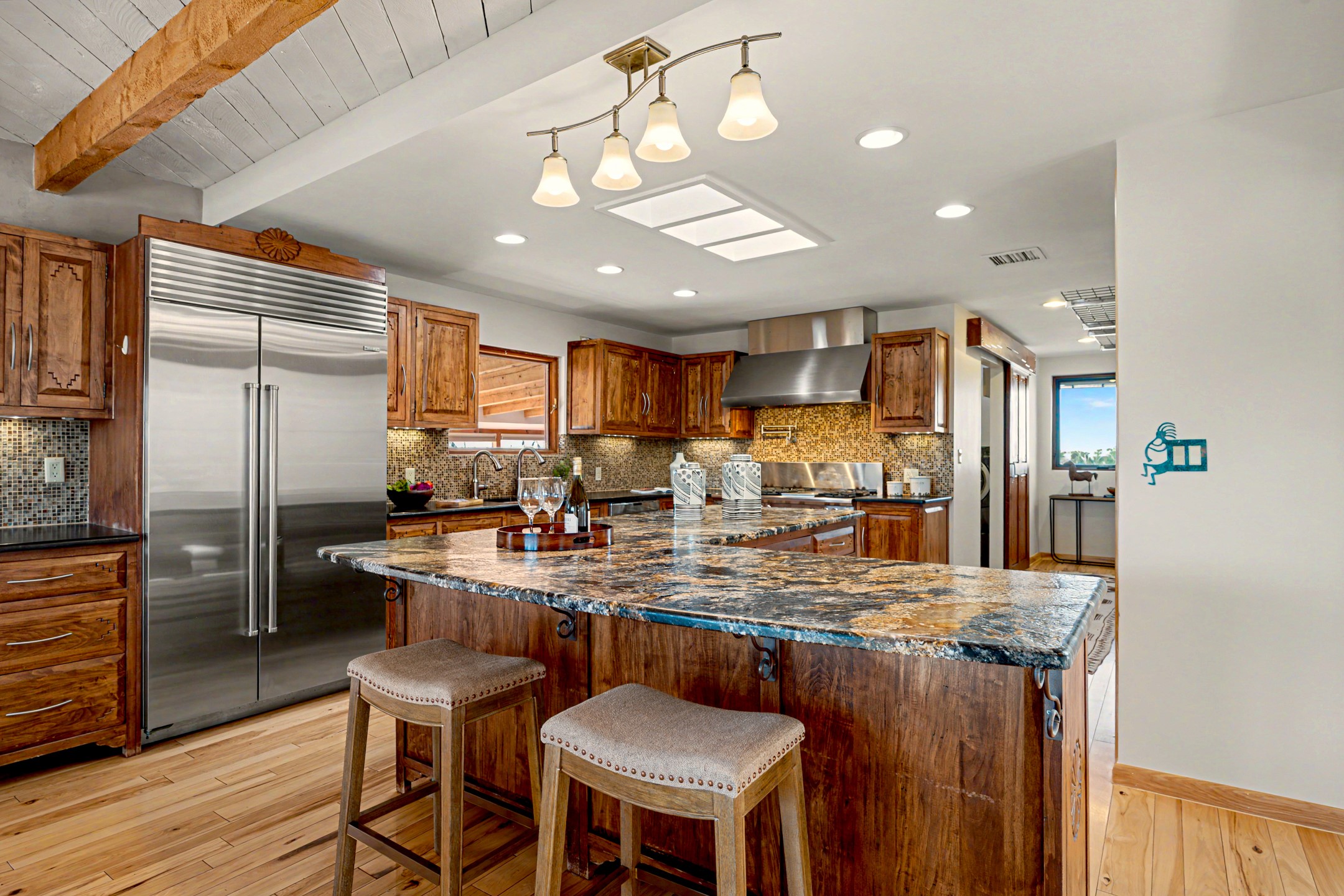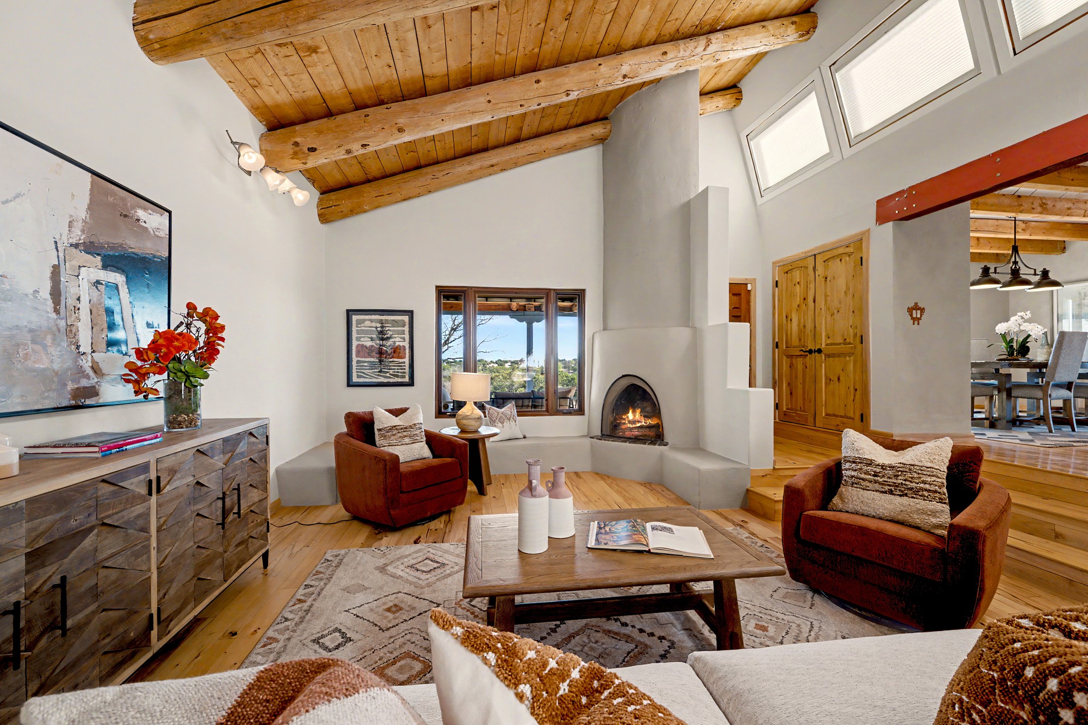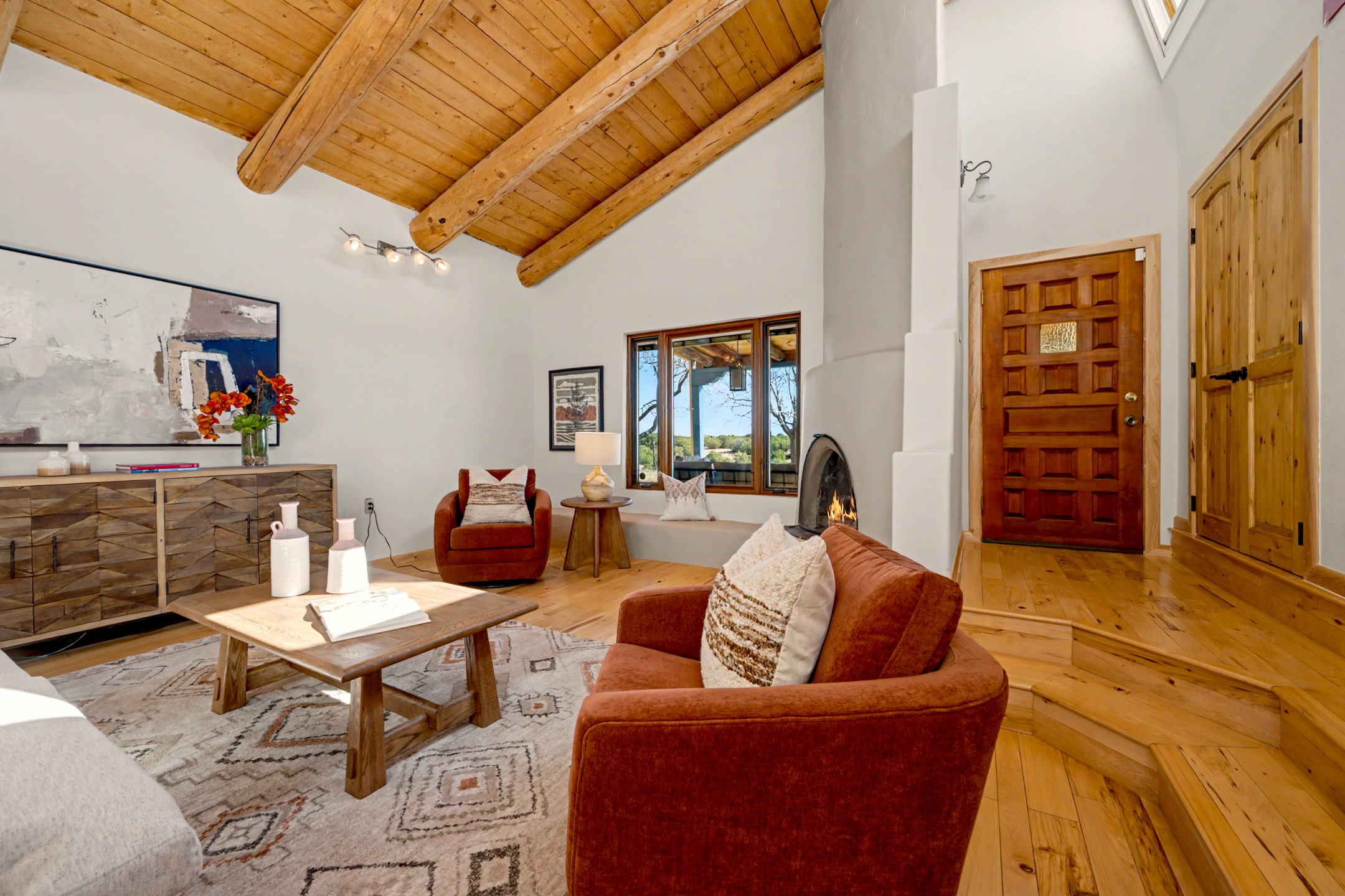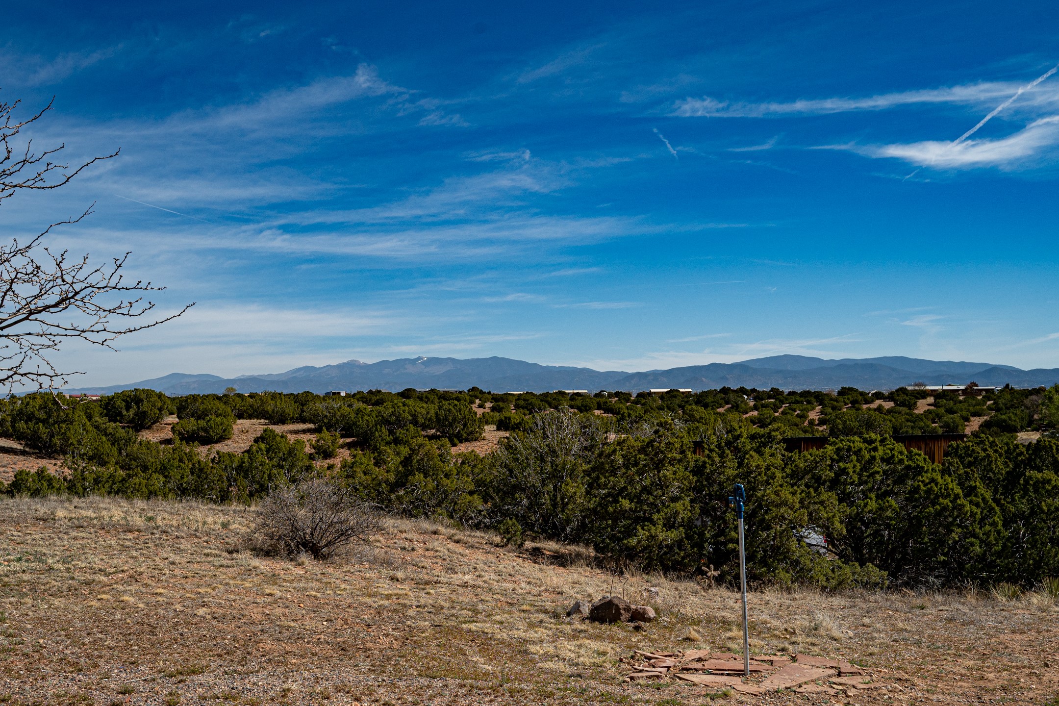Set on 5 acres and just 20 minutes to downtown Santa Fe, this exceptional property offers breathtaking 360-degree mountain views and an ideal blend of comfort, versatility, and New Mexico charm. The 3-bedroom, 2-bath home includes a dedicated office, large sunroom flanked by a walled courtyard and is extensively renovated, showcasing quality, craftsmanship and thoughtful upgrades. Beyond the main residence, the property features a 1000 sq. ft. two-story studio, perfect for creative pursuits or a home business. Additionally, a 2,500 square foot outbuilding for a tradesman or large workshop with ample parking. For the horseman, rancher or privacy seeker, there is a contiguous, transferable, fenced 40-acre land lease from the NM Land Commissioner at a $50 yearly rent. Horses can run free to graze. The beautifully updated kitchen features custom maple wood cabinetry, copper sink, large center island with seating, granite countertops, and premium appliances: a six burner 42" Wolf gas stove with grill and double oven along with Sub-Zero. The spacious primary suite offers a luxurious bath complete with dual steam/shower for two, jetted tub with granite surround, travertine tile walls, vanity with granite-top and updated fixtures plus a custom solid hardwood closet system. Additional improvements include hickory wood flooring throughout, Pella triple-pane windows, solid alder wood interior doors, and an upgraded laundry room with maple cabinetry, granite counter and slate tile flooring. This home has underground electric and natural gas, a newer septic, private well with 3-acre feet of water registered with NM State Engineer, newer bitumen roof and two-zoned forced heat/refrigerated air for year-round comfort & instant tankless water heater. Permission for future stables or other structures on the leasehold can be had with the investment cost returnable. This property offers a rare opportunity to enjoy peaceful rural living with easy access to Santa Fe's amenities