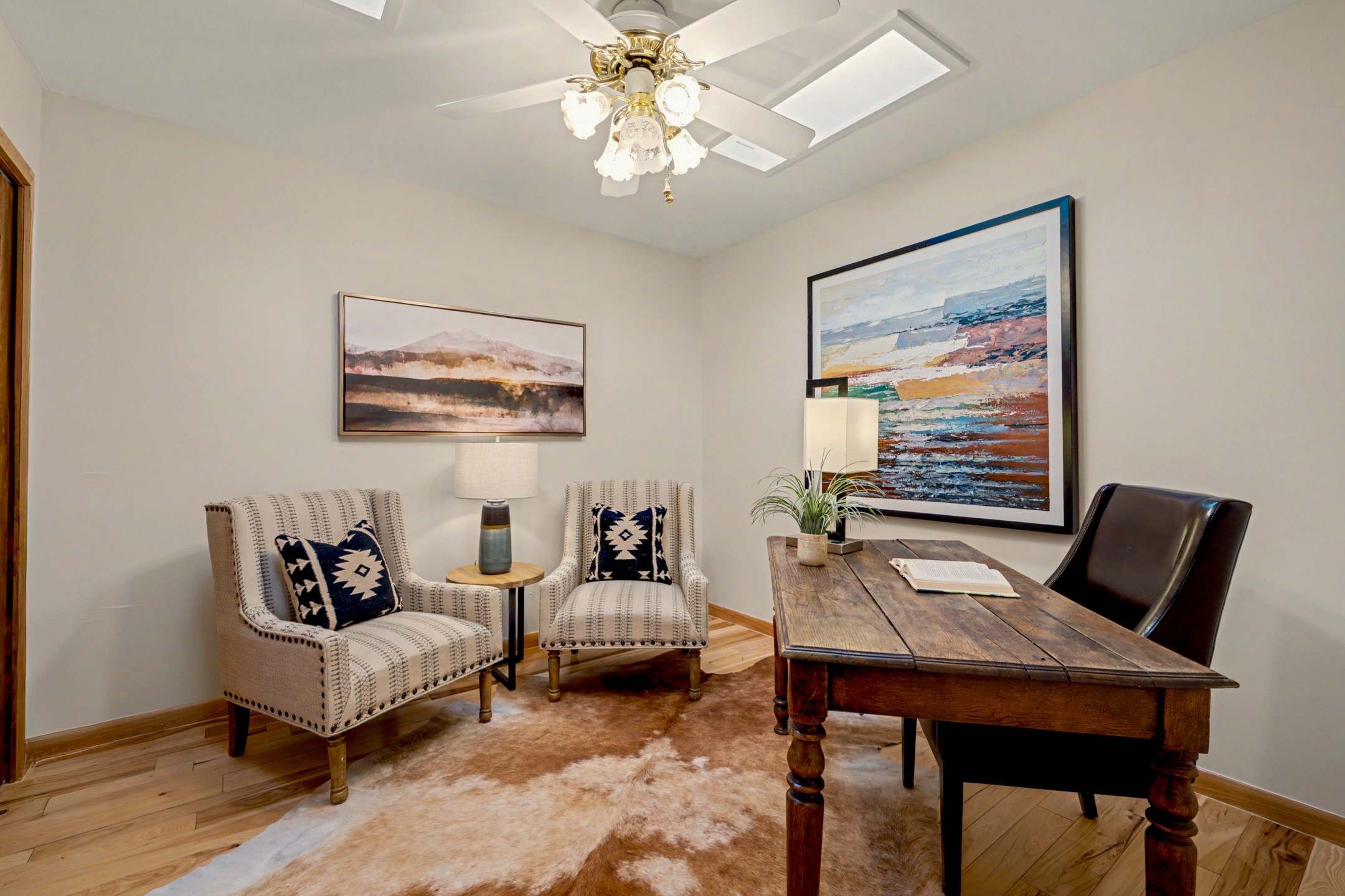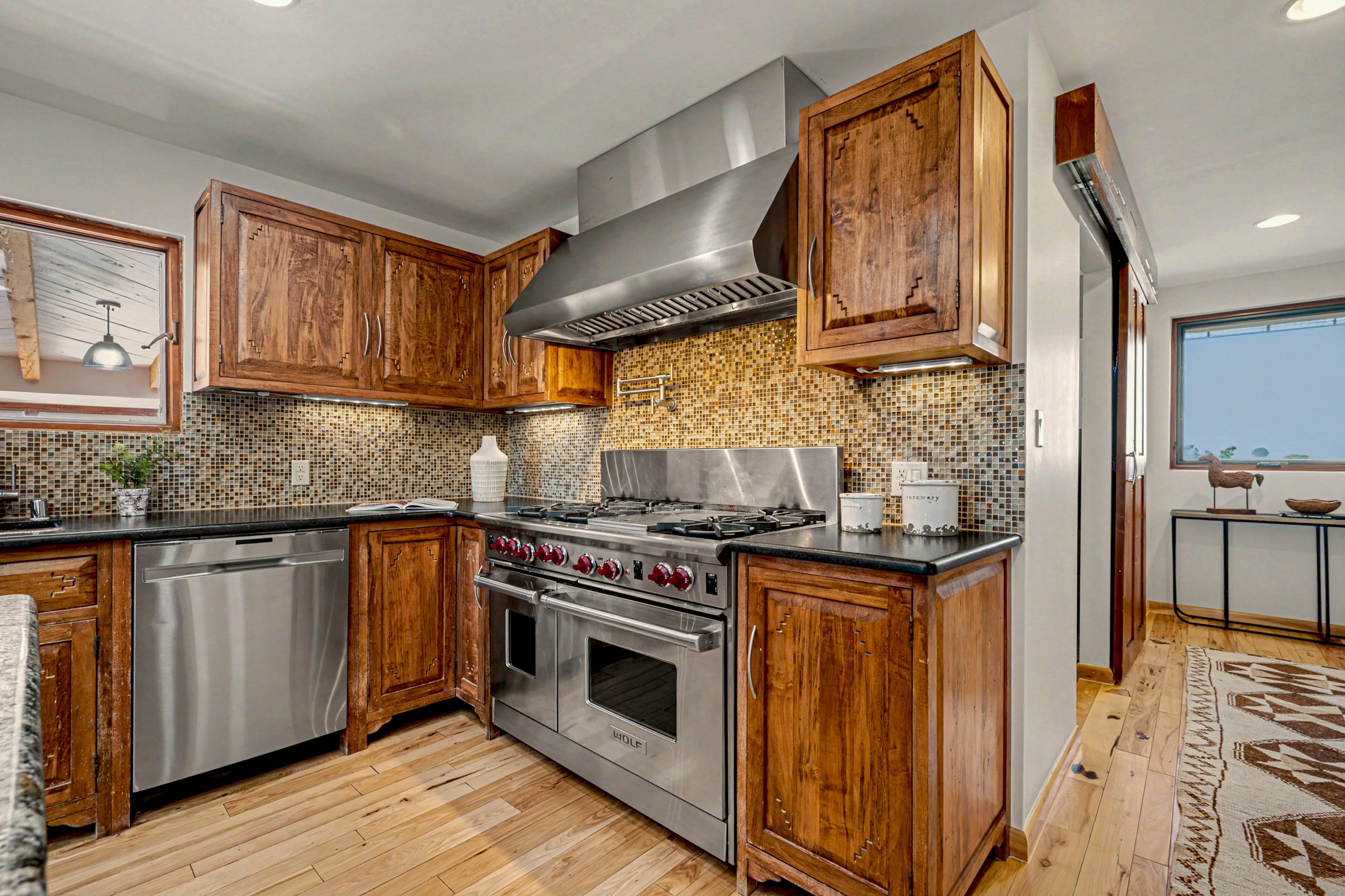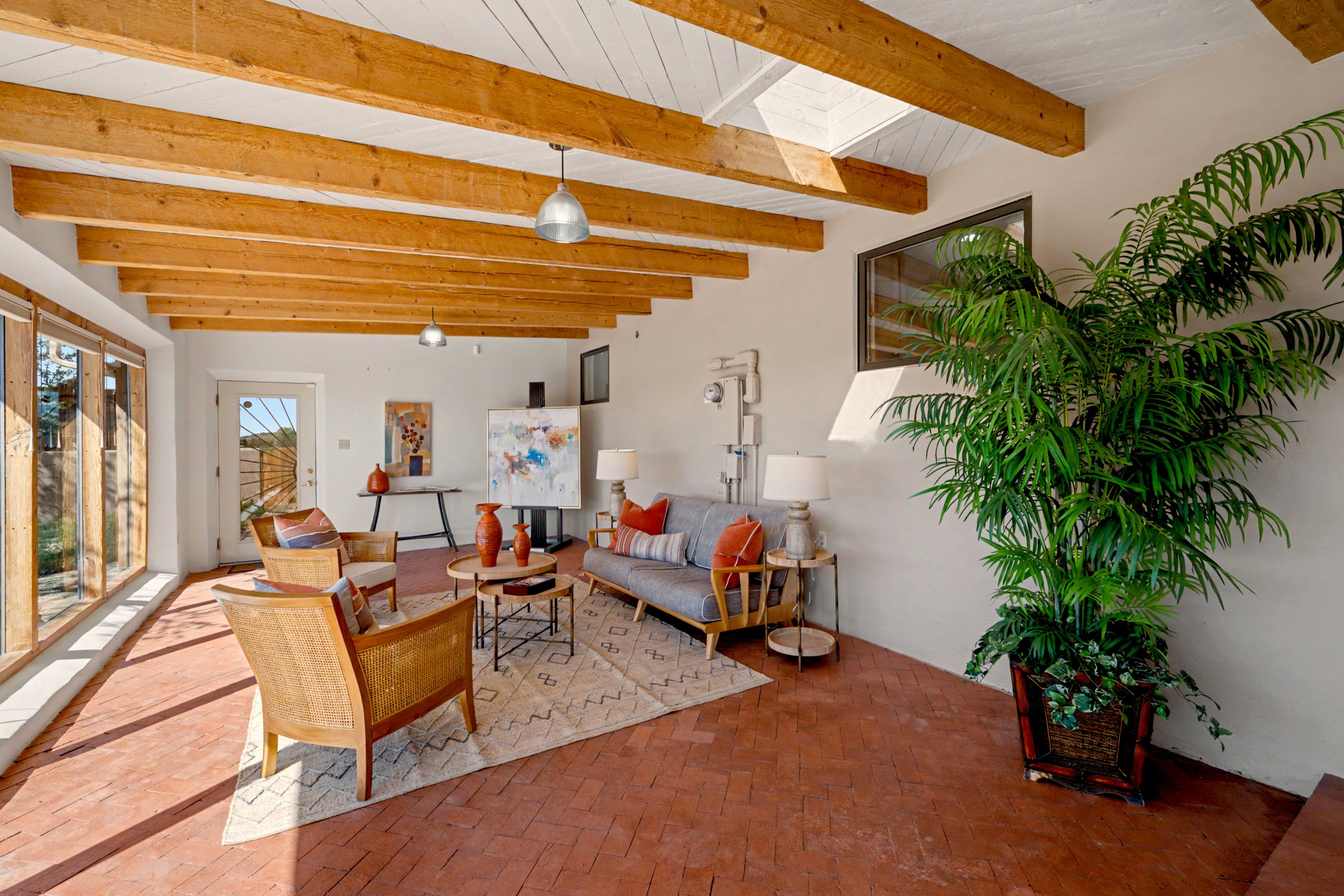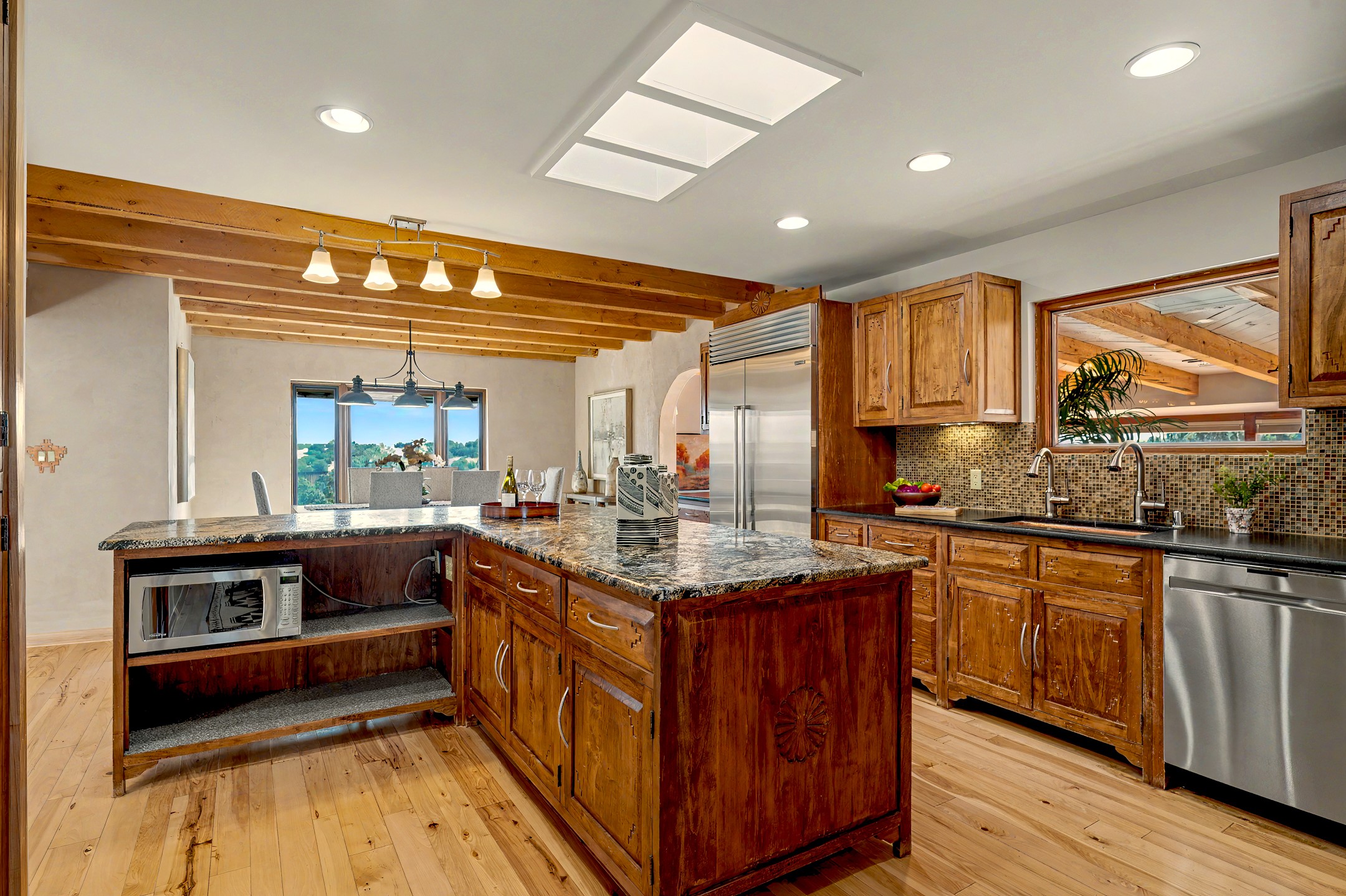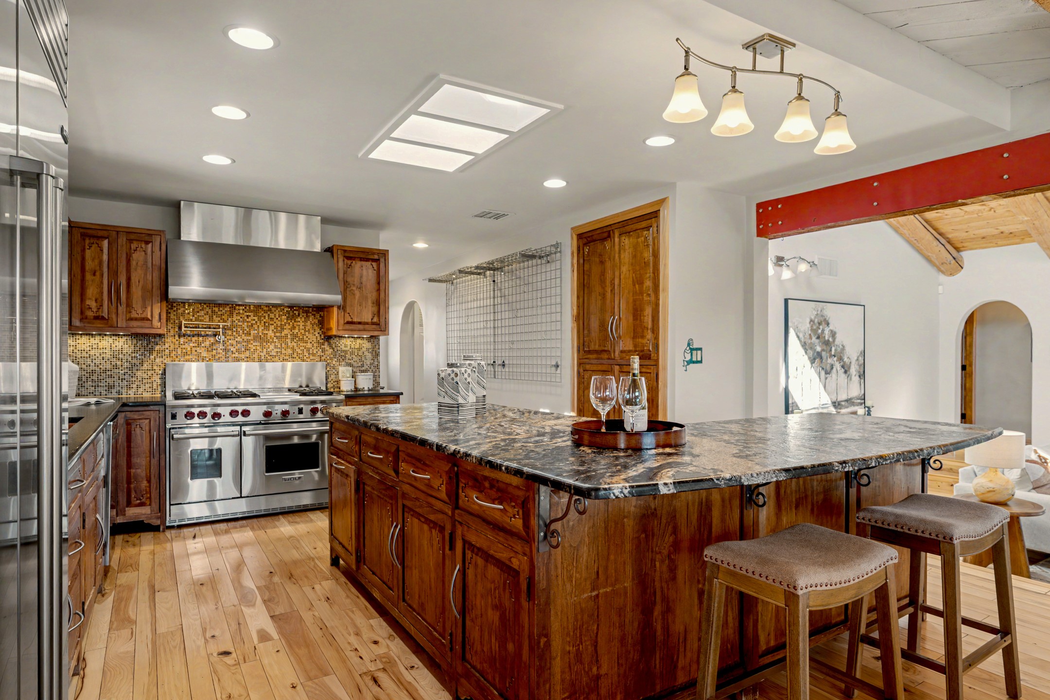Set on 5 acres and just 20 minutes to downtown Santa Fe, this exceptional property offers breathtaking 360-degree mountain views and an ideal blend of comfort, versatility, and New Mexico charm. The 3-bedroom, 2-bath home includes a dedicated office, large sunroom flanked by a walled courtyard and is extensively renovated, showcasing quality, craftsmanship and thoughtful upgrades. Beyond the main residence, the property features a 1000 sq. ft. two-story studio, perfect for creative pursuits or a home business. Additionally, a 2,500 square foot outbuilding for a tradesman or large workshop with ample parking. For the horseman, rancher or privacy seeker, there is a contiguous, transferable, fenced 40-acre land lease from the NM Land Commissioner at a $50 yearly rent. Horses can run free to graze. The beautifully updated kitchen features custom maple wood cabinetry, copper sink, large center island with seating, granite countertops, and premium appliances: a six burner 42" Wolf gas stove with grill and double oven along with Sub-Zero. The spacious primary suite offers a luxurious bath complete with dual steam/shower for two, jetted tub with granite surround, travertine tile walls, vanity with granite-top and updated fixtures plus a custom solid hardwood closet system. Additional improvements include hickory wood flooring throughout, Pella triple-pane windows, solid alder wood interior doors, and an upgraded laundry room with maple cabinetry, granite counter and slate tile flooring. This home has underground electric and natural gas, a newer septic, private well with 3-acre feet of water registered with NM State Engineer, newer bitumen roof and two-zoned forced heat/refrigerated air for year-round comfort & instant tankless water heater. Permission for future stables or other structures on the leasehold can be had with the investment cost returnable. This property offers a rare opportunity to enjoy peaceful rural living with easy access to Santa Fe's amenities