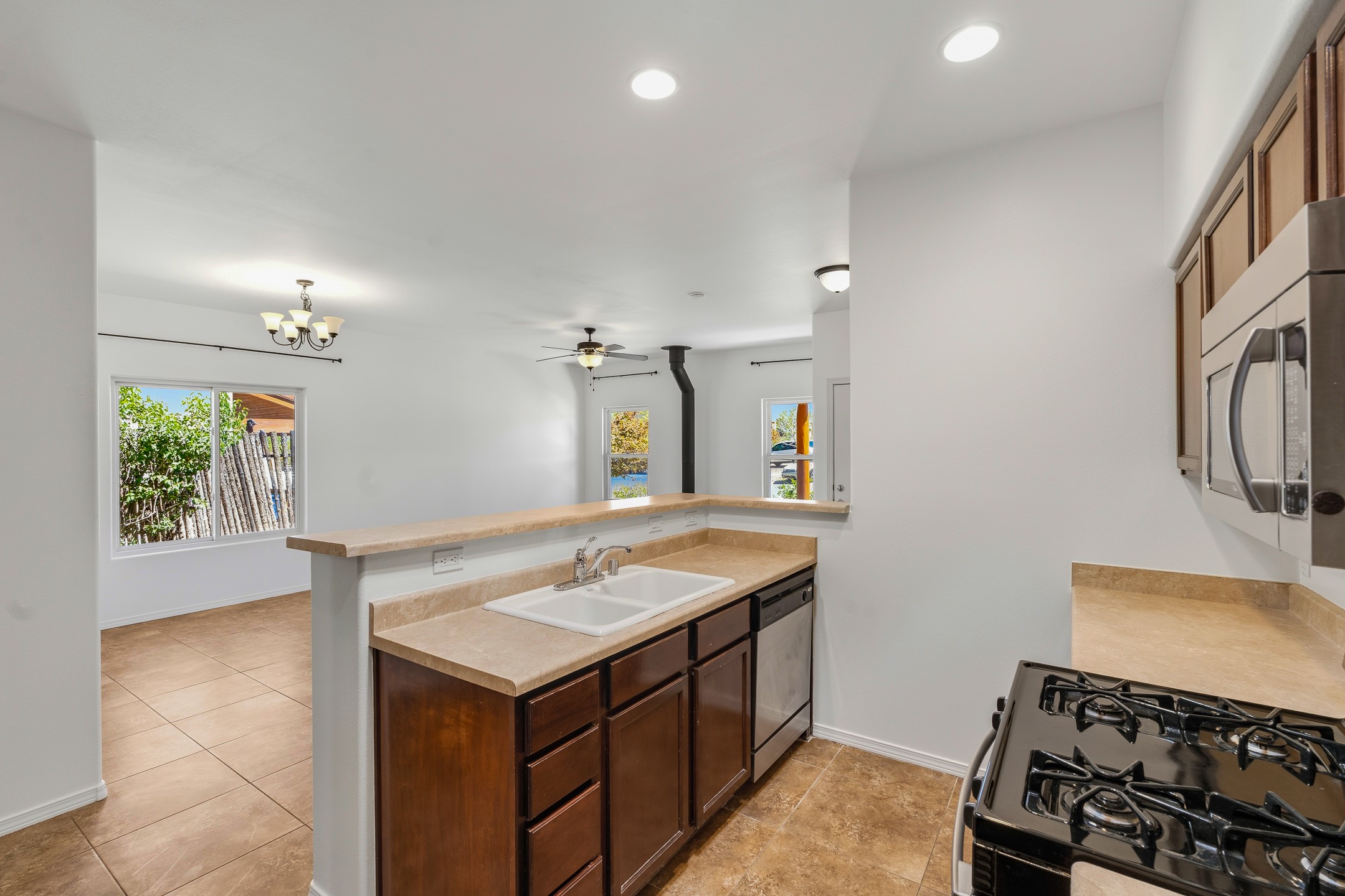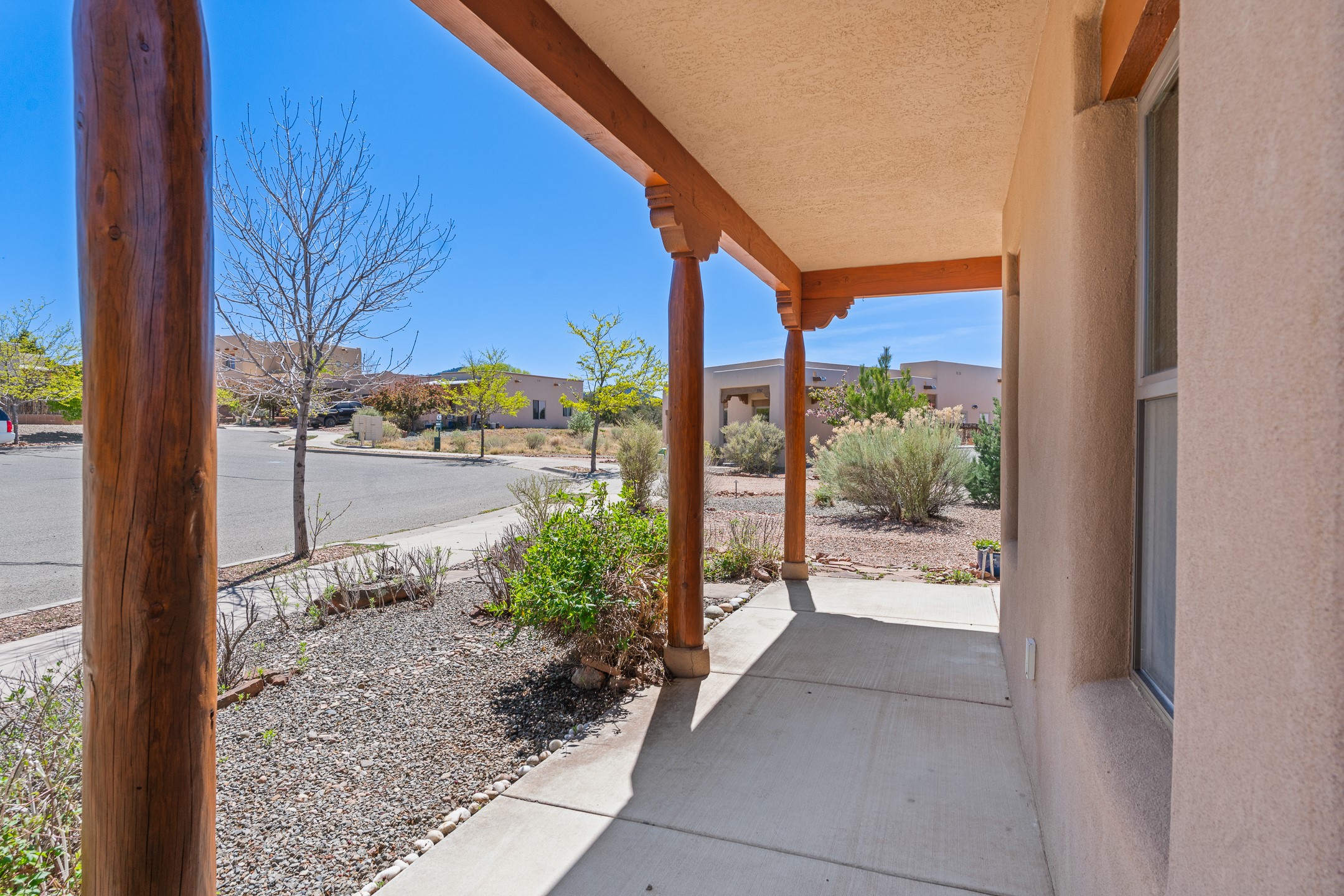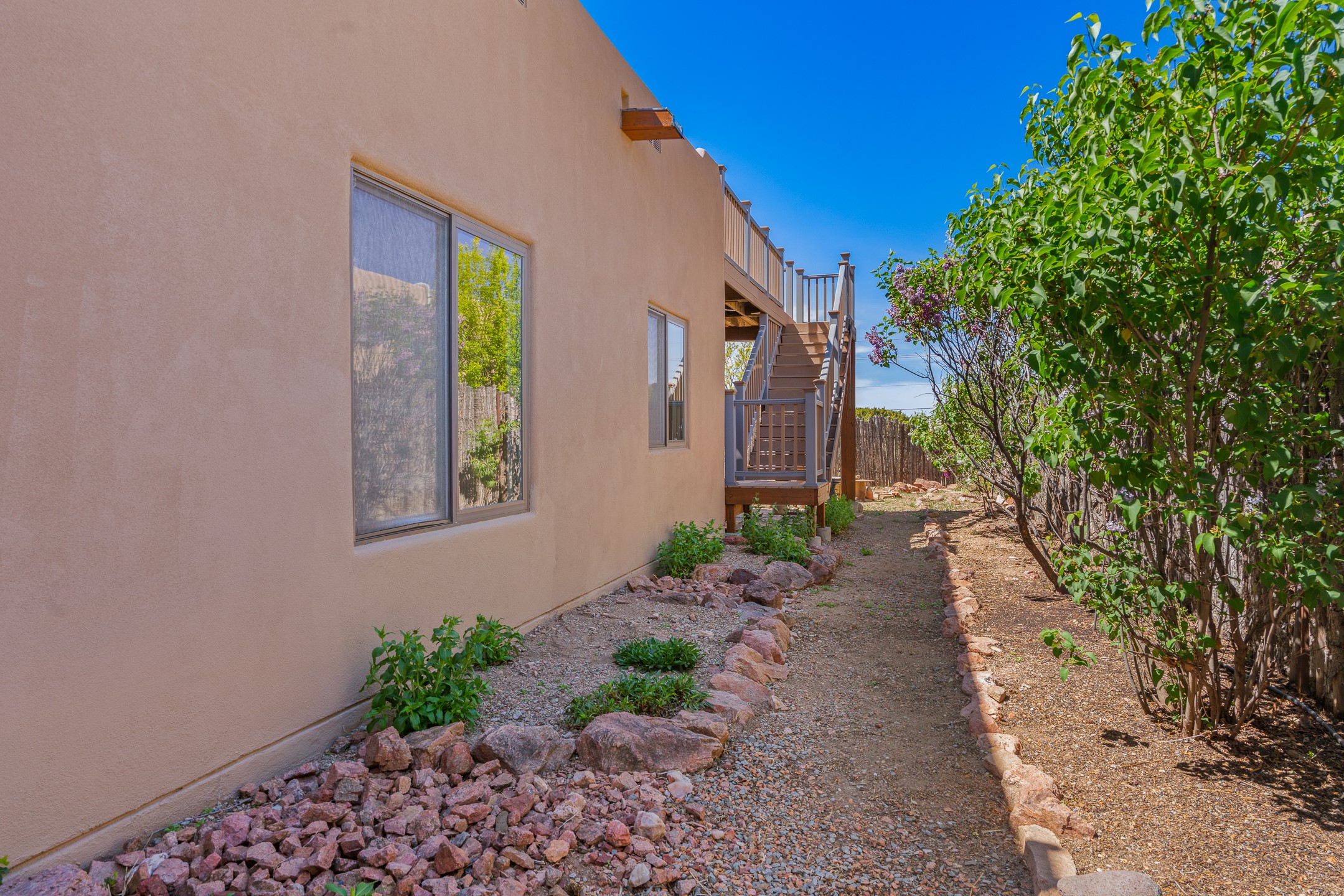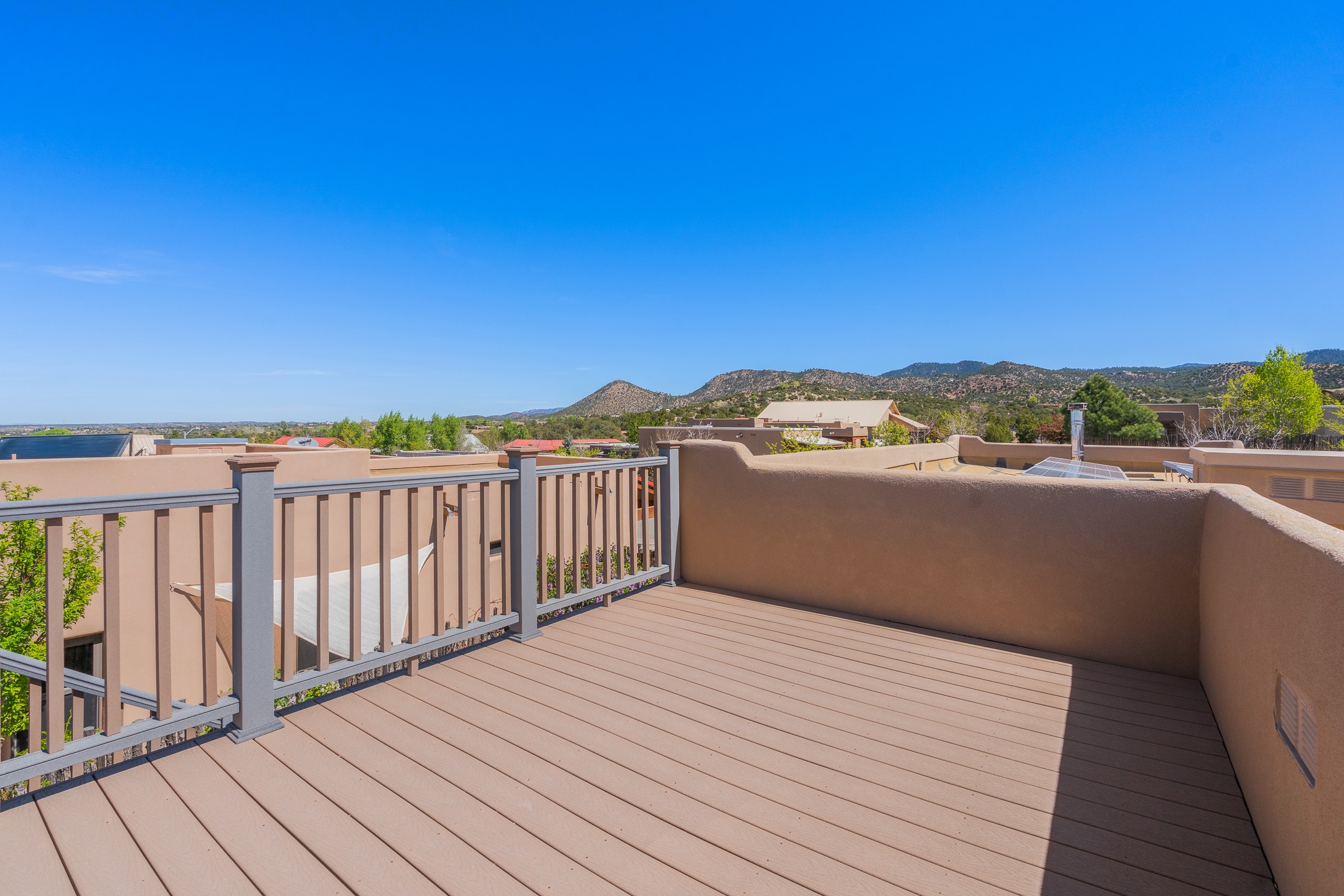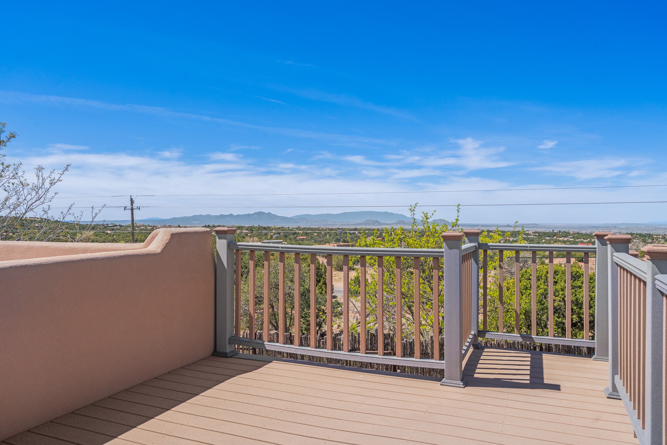 Experience the magic of Santa Fe living in this meticulously maintained, solar-powered home in the desirable Wood Gormley school district. Relax on your private rooftop deck, taking in breathtaking mountain views and iconic New Mexico sunsets. The fully fenced backyard, complete with circulating pond, provides an oasis for relaxation. Inside, enjoy a bright, open-concept design featuring 9-foot ceilings, fresh paint, new flooring, and a brand-new furnace for in-floor radiant heating. This award-winning, energy-efficient home combines premium efficiency with comfort, all on a quiet cul-de-sac perfectly positioned for easy access to downtown, shopping, and I-25.