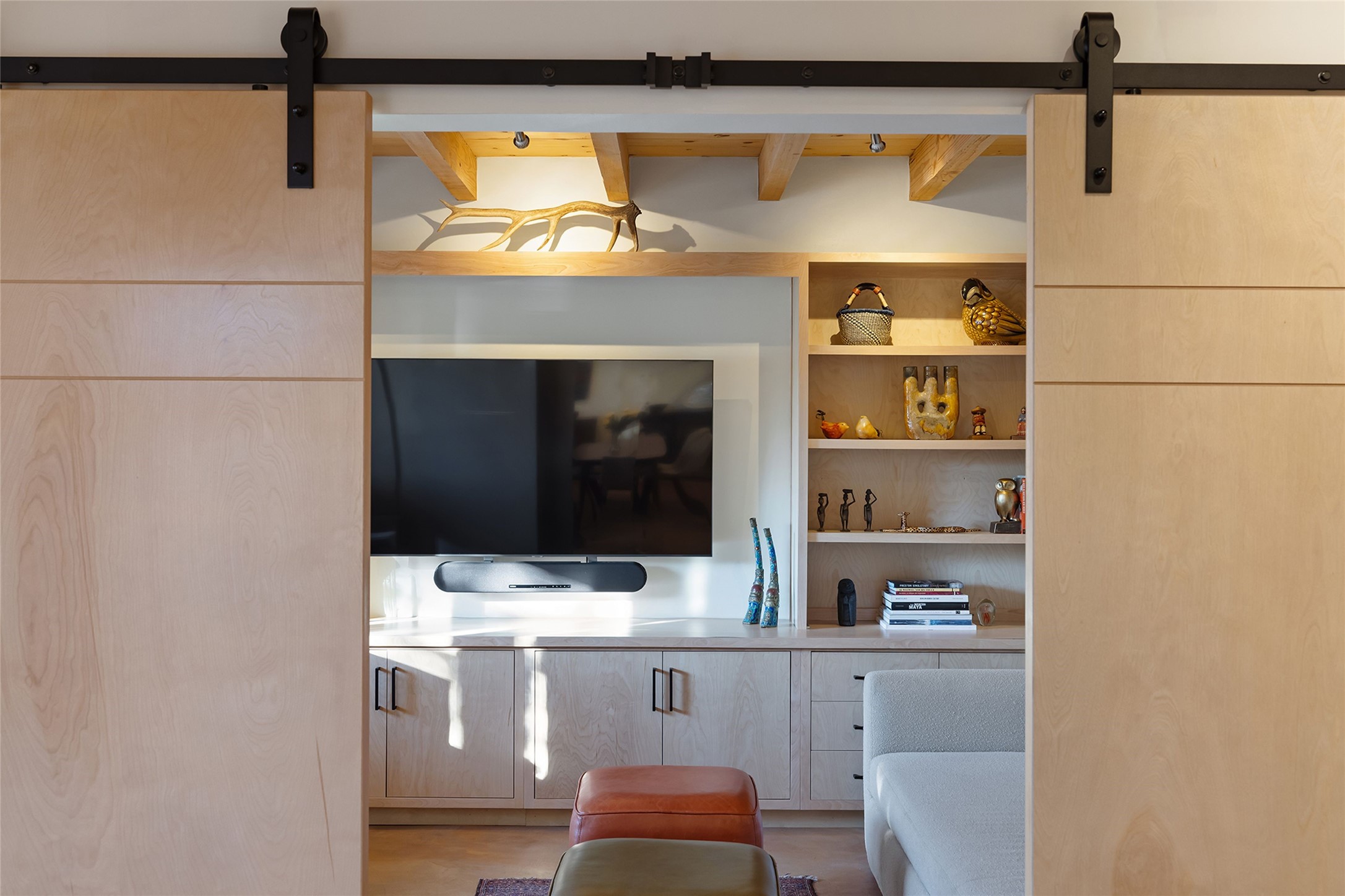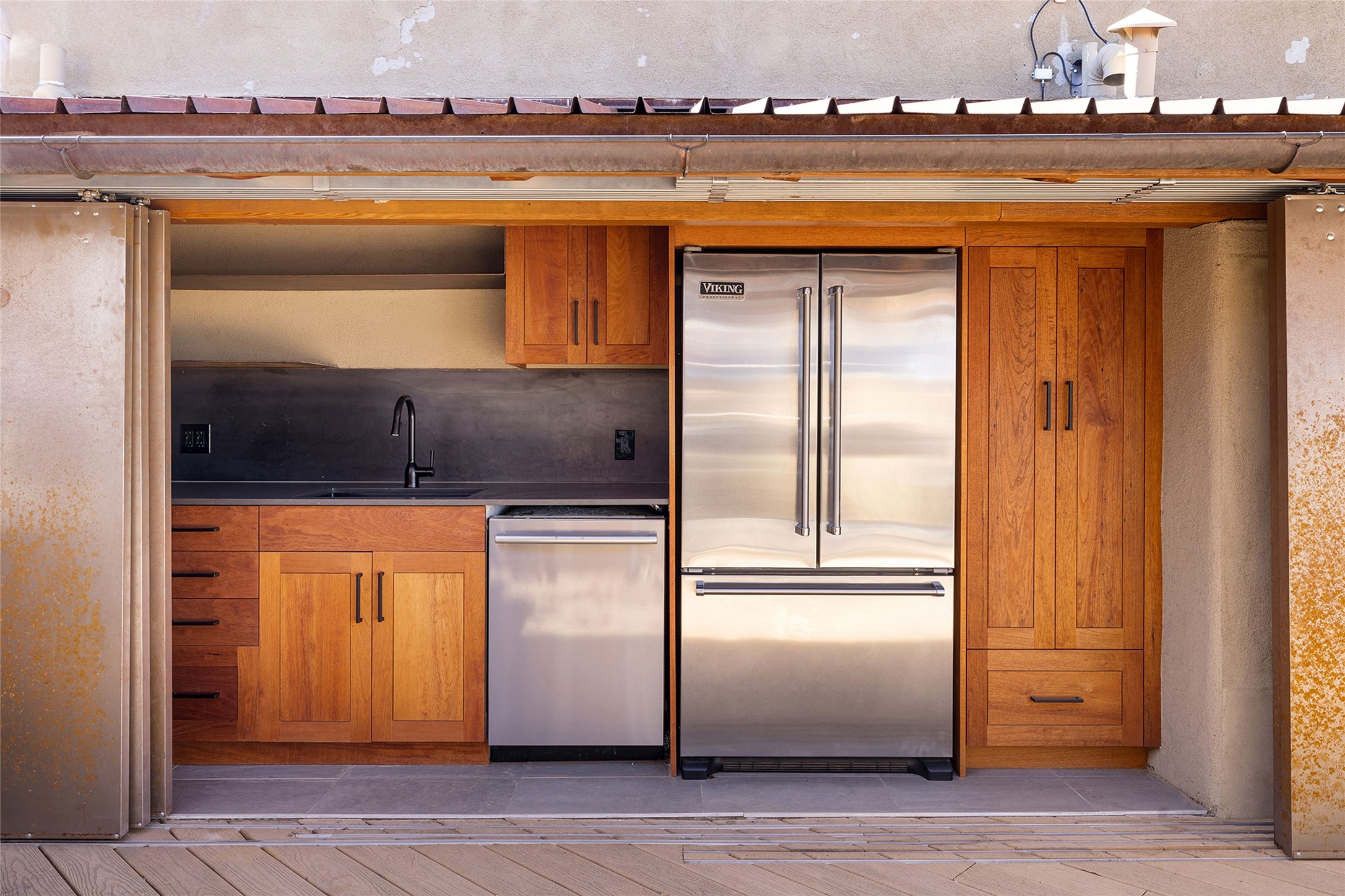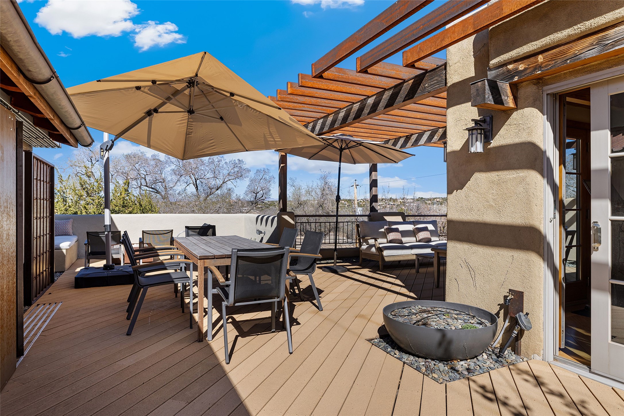 Just four blocks from the Santa Fe Plaza, near the intersection of Bishop's Lodge Road and Artist Road, this contemporary multi-level residence offers refined in-town living within an intimate four-home condo community on the edge of the Historic District. The thoughtfully designed floor plan features two bedrooms, three baths, and a flexible study with double sliding doors and built-in bookcases. The dramatic main living space is defined by soaring two-story ceilings perfect for an art collection, a wood-burning fireplace, and an open flow between the dining area and updated kitchen with entertaining peninsula bar and stainless-steel appliances. Wood beamed ceilings, niches, concrete and wood floors add warmth and modern character throughout. A ground level private walled courtyard with a mature apricot tree offers a peaceful outdoor retreat. The versatile study and nearby hall bath allow the space to function easily as a home office, guest room, or additional sleeping area. Upstairs, the primary suite welcomes gentle morning light and features an updated bath with access to the rear courtyard. A second bedroom suite provides comfort and privacy for guests. The third-level landing offers flexible space ideal for a desk, reading area, or exercise equipment. Crowning the home is a spectacular rooftop terrace designed for unforgettable gatherings. The outdoor kitchen includes a Viking grill, Viking refrigerator, sink, and dishwasher, complemented by sculptural steel arbors and built-in daybeds. From this elevated vantage point enjoy sweeping 360-degree views of the Sangre de Cristo and Jemez Mountains along with Santa Fe's legendary sunsets. A few blocks away, the year-round activities of Fort Marcy Park provide recreation and cultural events including concerts, the celebrated Santa Fe Wine & Chile Fiesta, and the iconic Zozobra.