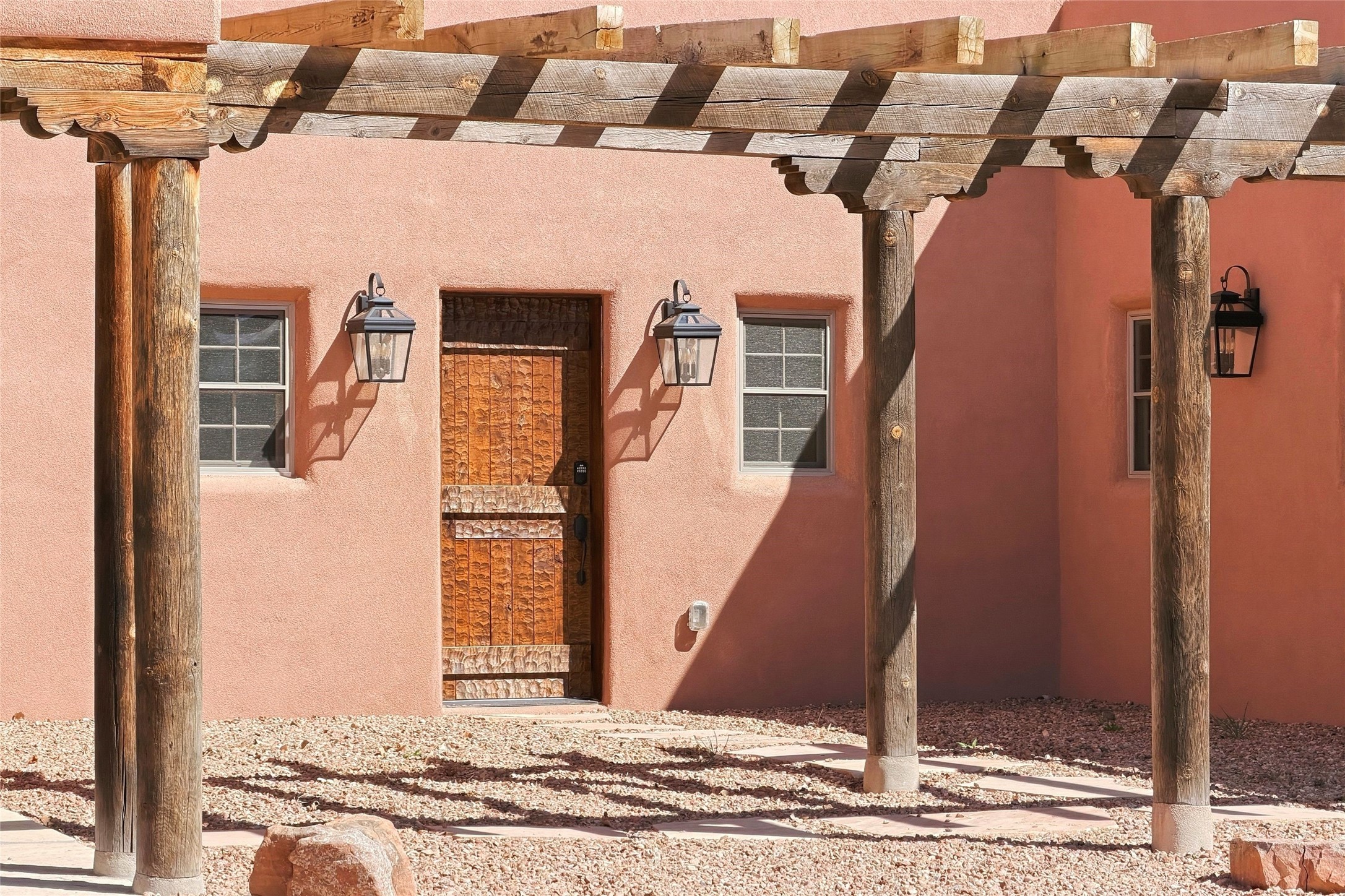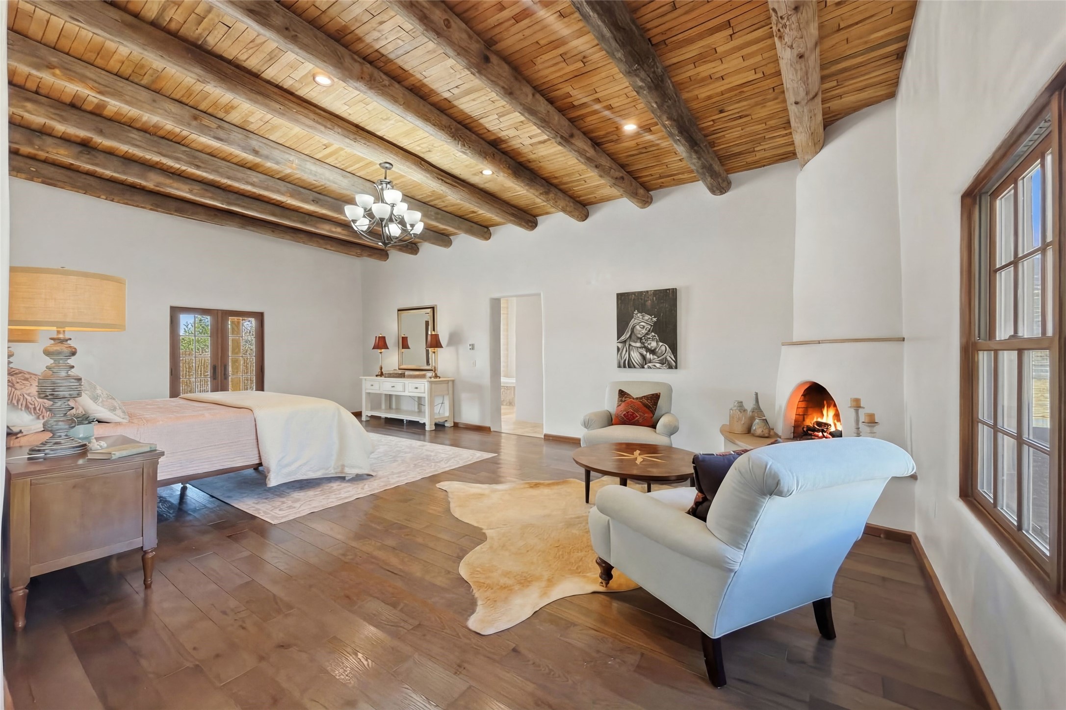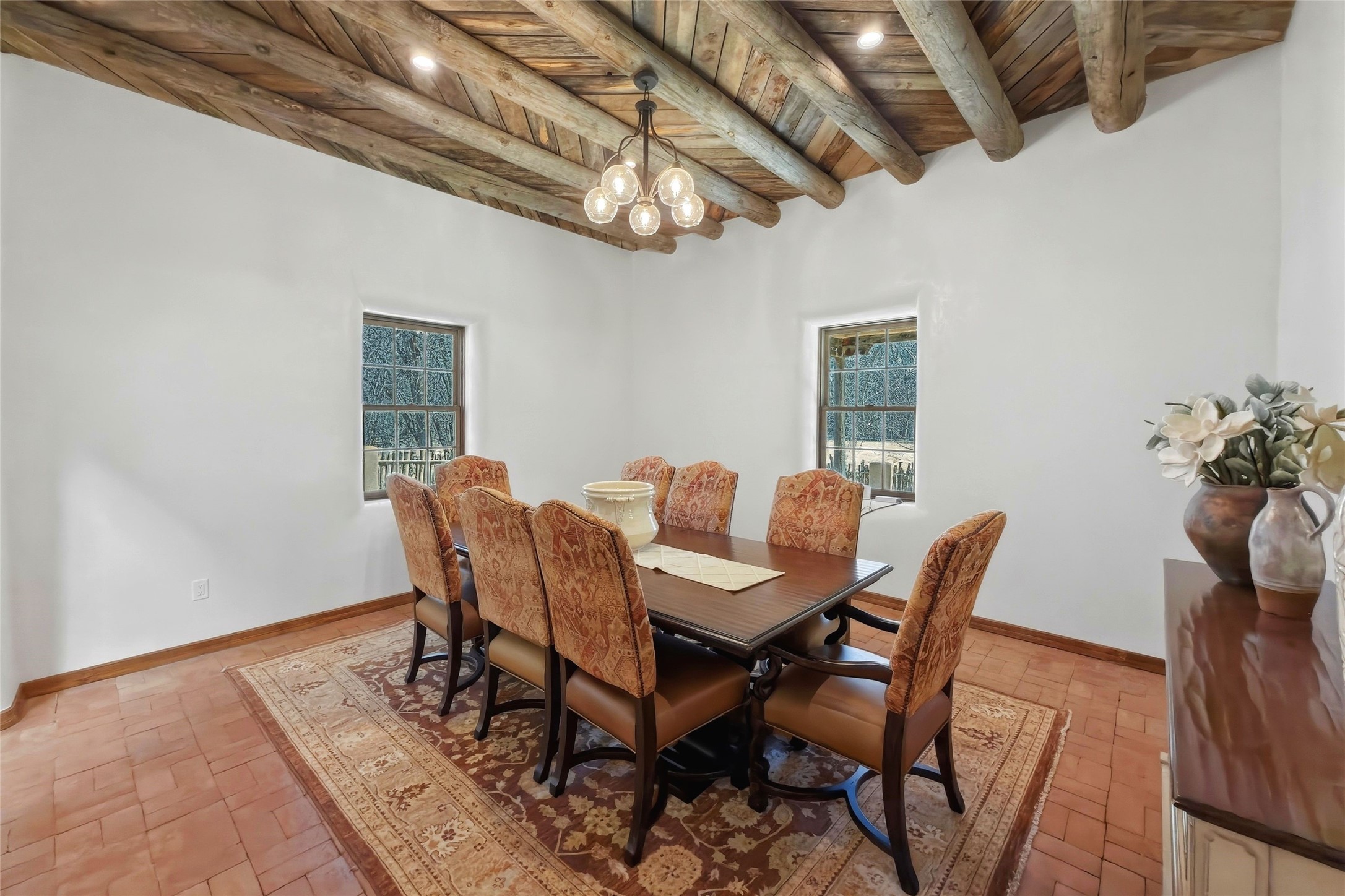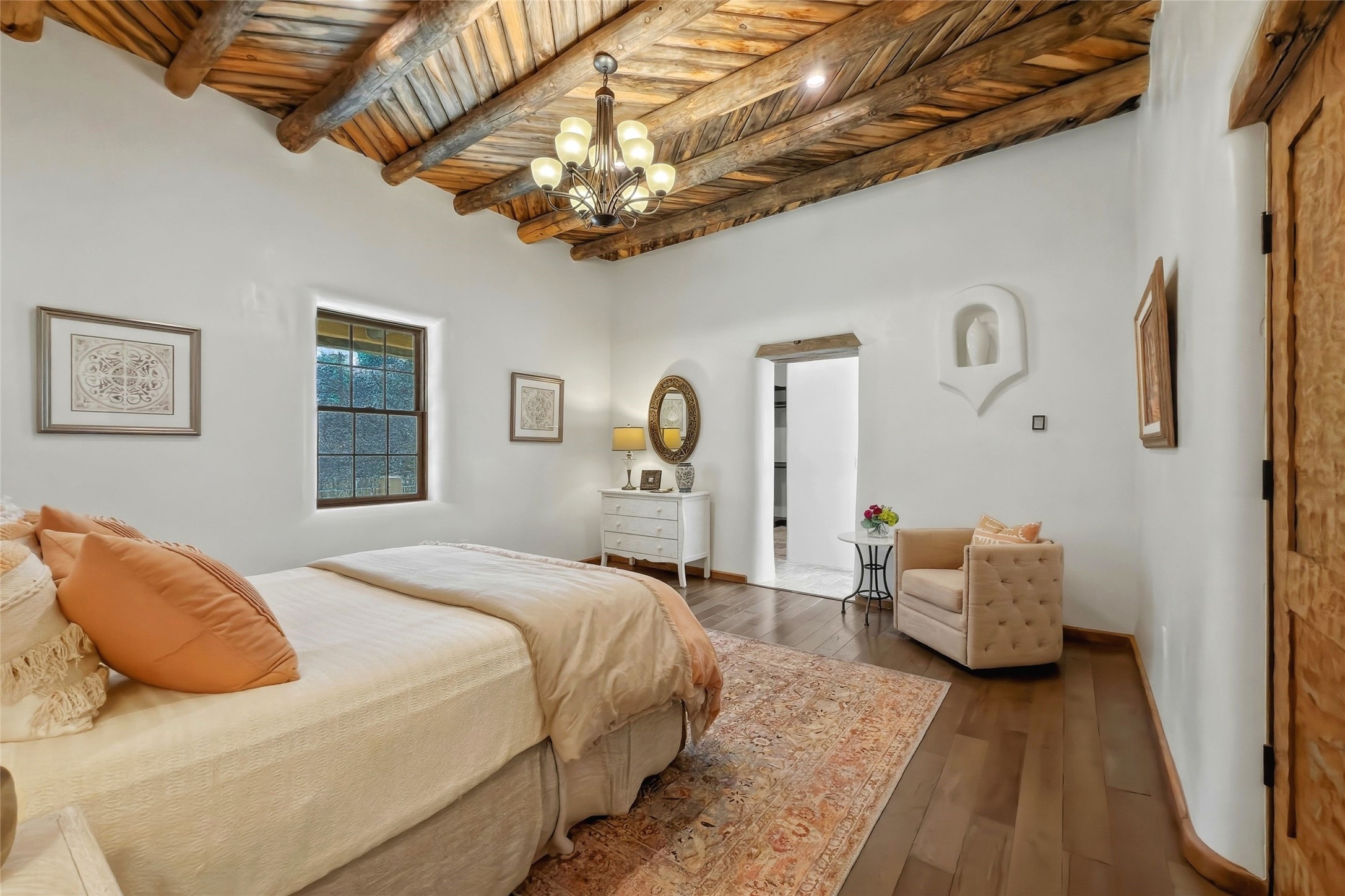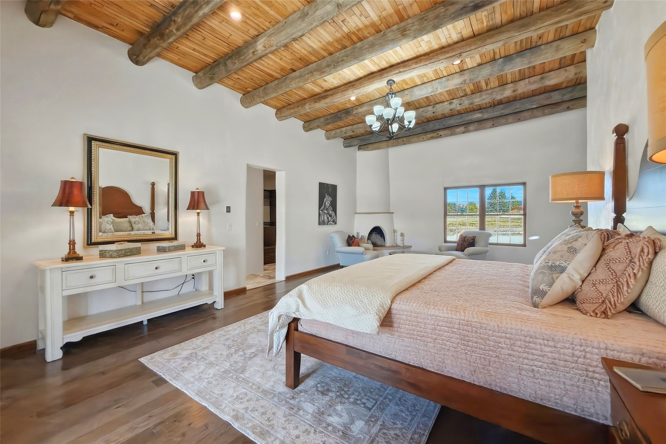 Nestled in the lush and picturesque Nambe Valley, this extraordinary traditional hacienda adobe estate offers a rare blend of historic charm, authentic Southwestern craftsmanship, and modern comfort--all just a scenic 20-minute drive from the heart of Santa Fe Plaza. This Parade of Homes Heritage Award-winning property (2024) is set on three contiguous lots totaling approximately 4 acres, the property provides exceptional privacy and flexibility.The residence features 3 bedrooms and 5 bathrooms. Beautifully integrated with thoughtful modern upgrades, it showcases authentic Southwestern architecture, including aged beams, reclaimed lumber ceilings, and diamond plaster walls, creating a warm and timeless aesthetic throughout.Designed for comfort and efficiency, the home includes: 9-zone radiant heating and cooling, HVAC system controllable via smartphone, R-40 insulated walls, Foam and TPO roofing, Anderson windows, Three kitchen sinks, ideal for entertaining or multi-cook kitchens.Additional highlights include a private well with 3 acre-feet of water rights and access to a historic acequia, enhancing both the property's functionality and connection to the region's heritage.Surrounded by the natural beauty of Northern New Mexico, this one-of-a-kind estate offers a rare opportunity to own a piece of living history while enjoying modern luxury in one of the area's most serene valley settings. Please note, some photos have been digitally enhanced.