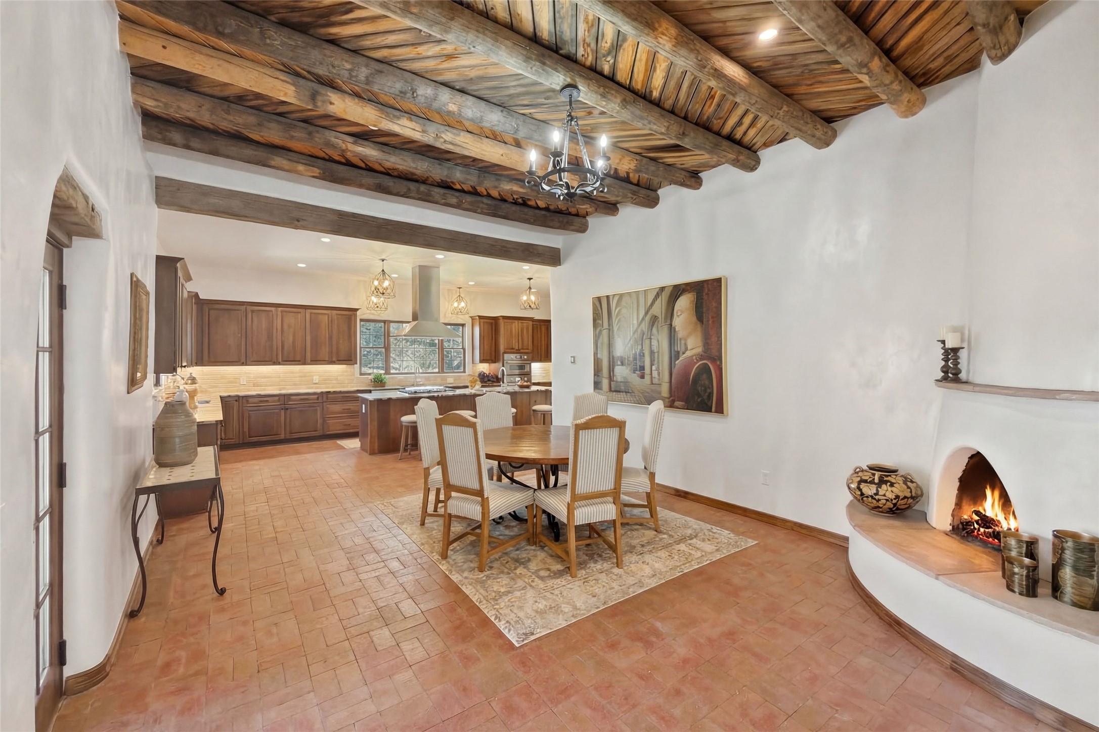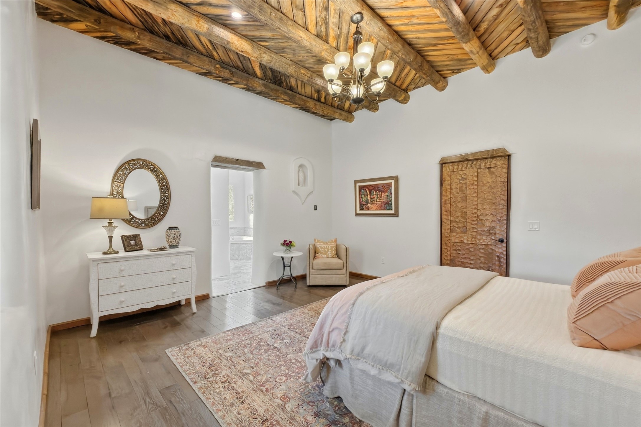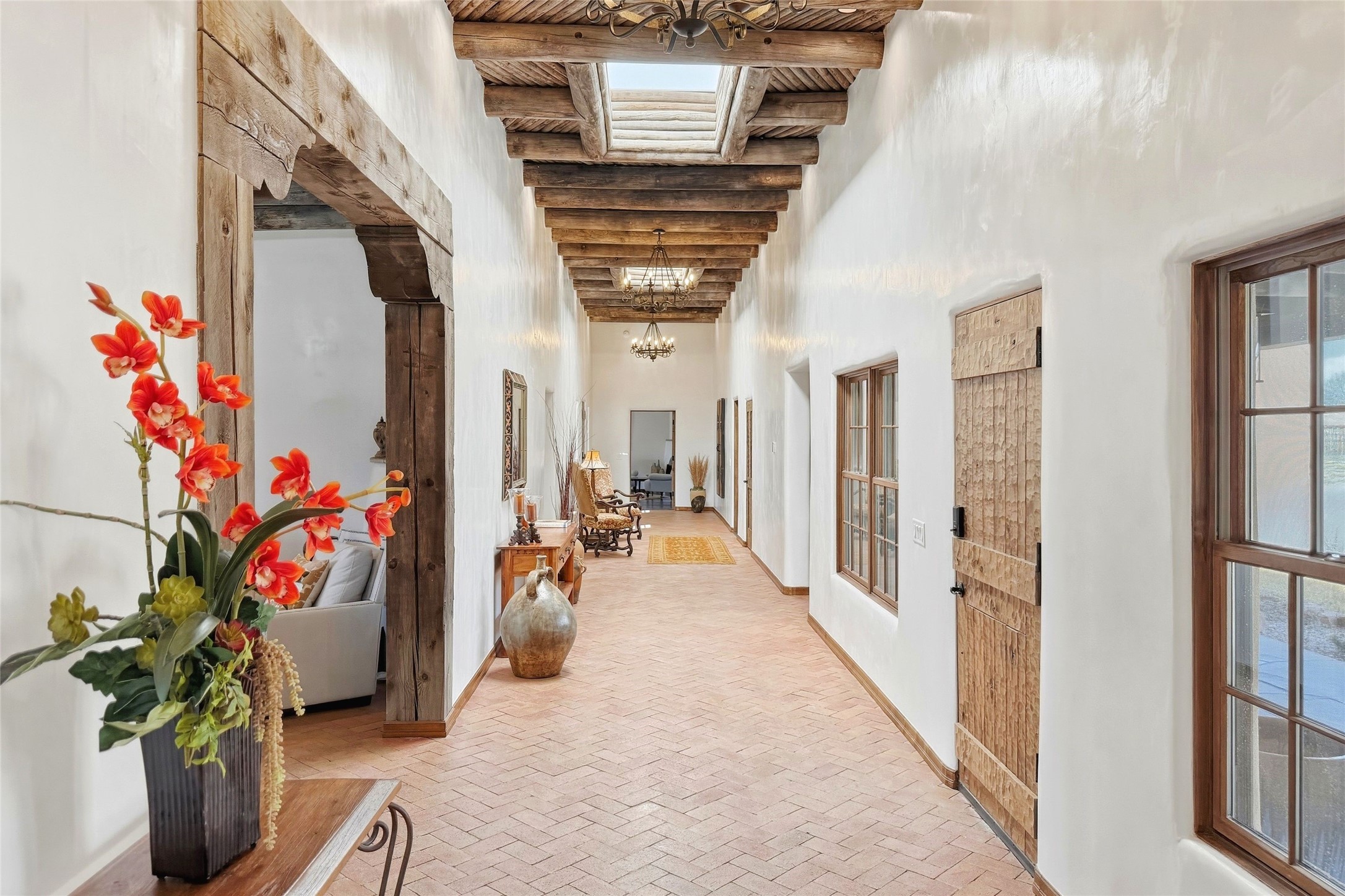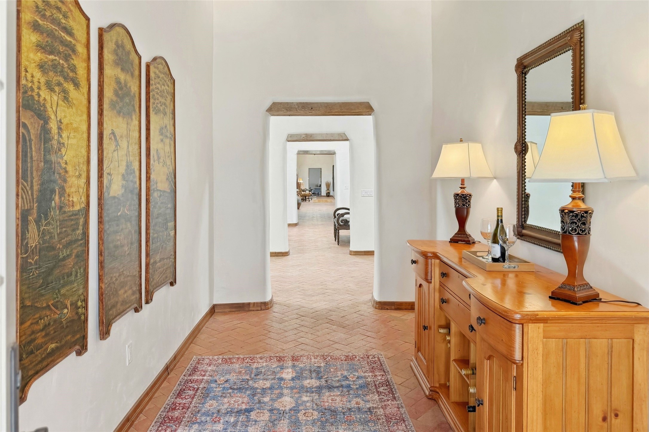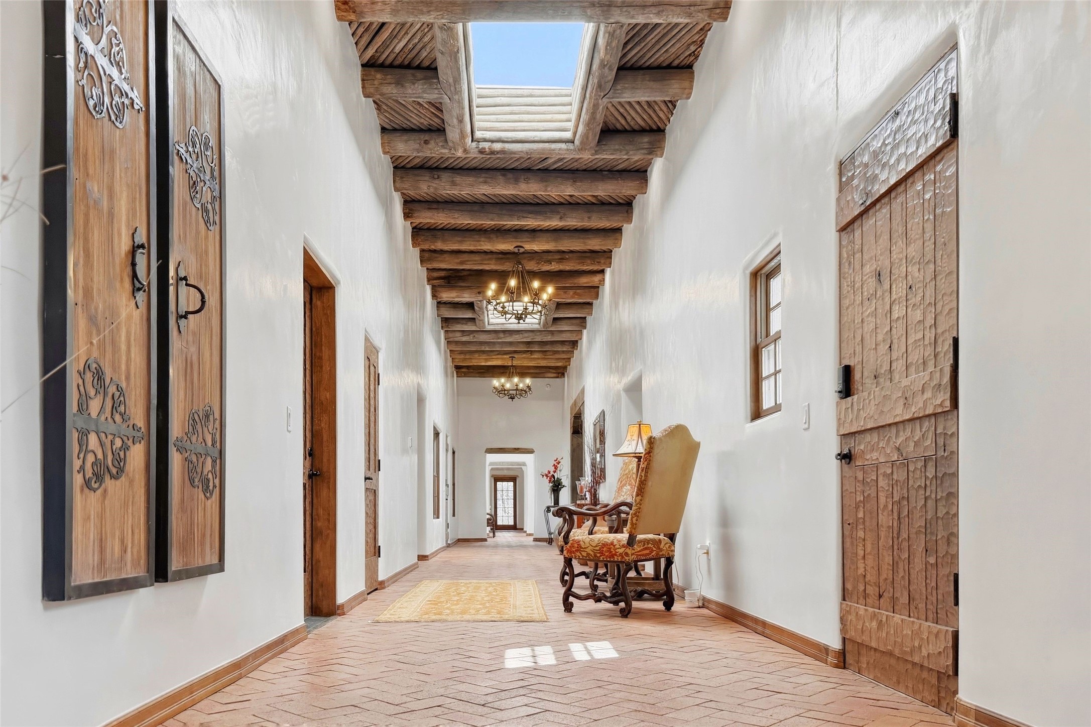 Nestled in the lush and picturesque Nambe Valley, this extraordinary traditional hacienda adobe estate offers a rare blend of historic charm, authentic Southwestern craftsmanship, and modern comfort--all just a scenic 20-minute drive from the heart of Santa Fe Plaza. This Parade of Homes Heritage Award-winning property (2024) is set on three contiguous lots totaling approximately 4 acres, the property provides exceptional privacy and flexibility.The residence features 3 bedrooms and 5 bathrooms. Beautifully integrated with thoughtful modern upgrades, it showcases authentic Southwestern architecture, including aged beams, reclaimed lumber ceilings, and diamond plaster walls, creating a warm and timeless aesthetic throughout.Designed for comfort and efficiency, the home includes: 9-zone radiant heating and cooling, HVAC system controllable via smartphone, R-40 insulated walls, Foam and TPO roofing, Anderson windows, Three kitchen sinks, ideal for entertaining or multi-cook kitchens.Additional highlights include a private well with 3 acre-feet of water rights and access to a historic acequia, enhancing both the property's functionality and connection to the region's heritage.Surrounded by the natural beauty of Northern New Mexico, this one-of-a-kind estate offers a rare opportunity to own a piece of living history while enjoying modern luxury in one of the area's most serene valley settings. Please note, some photos have been digitally enhanced.