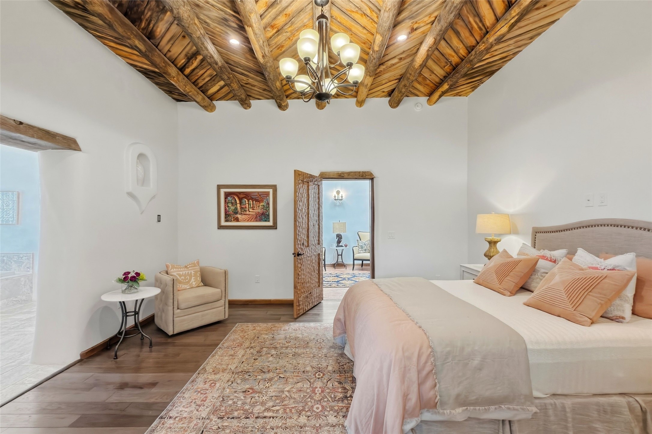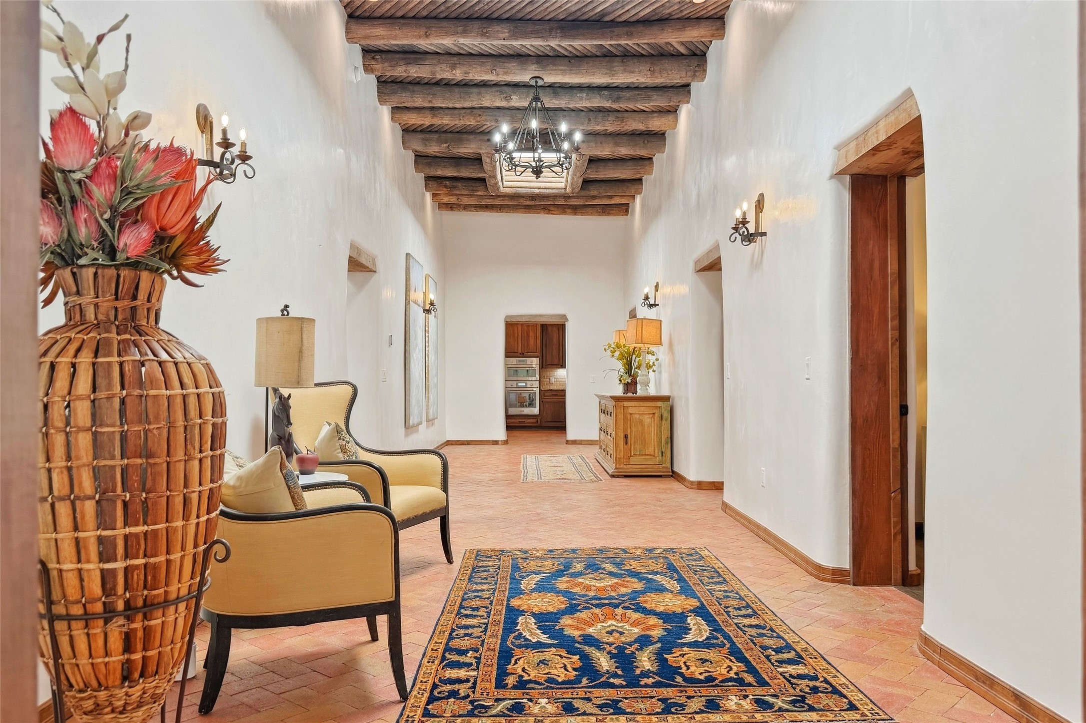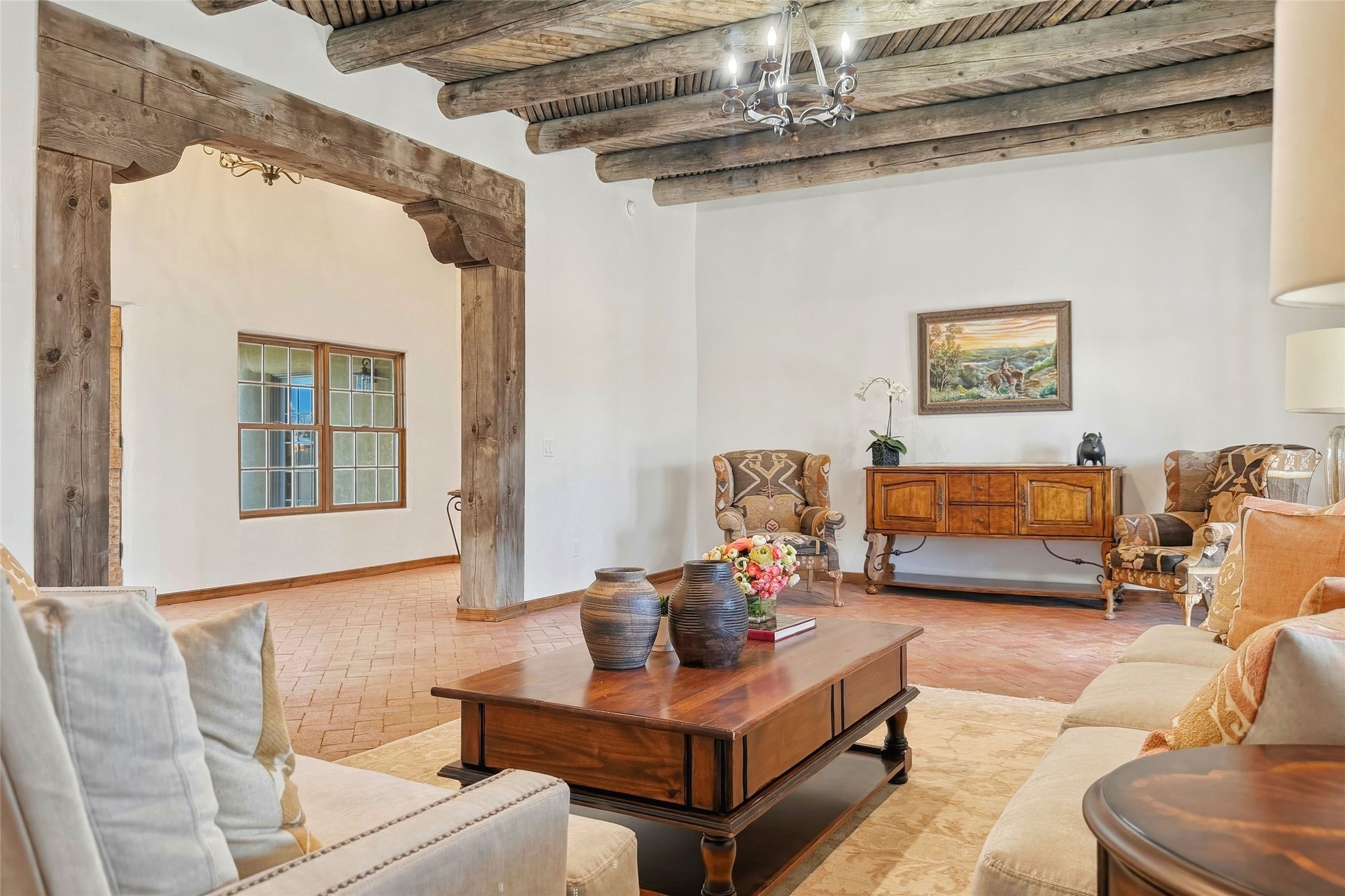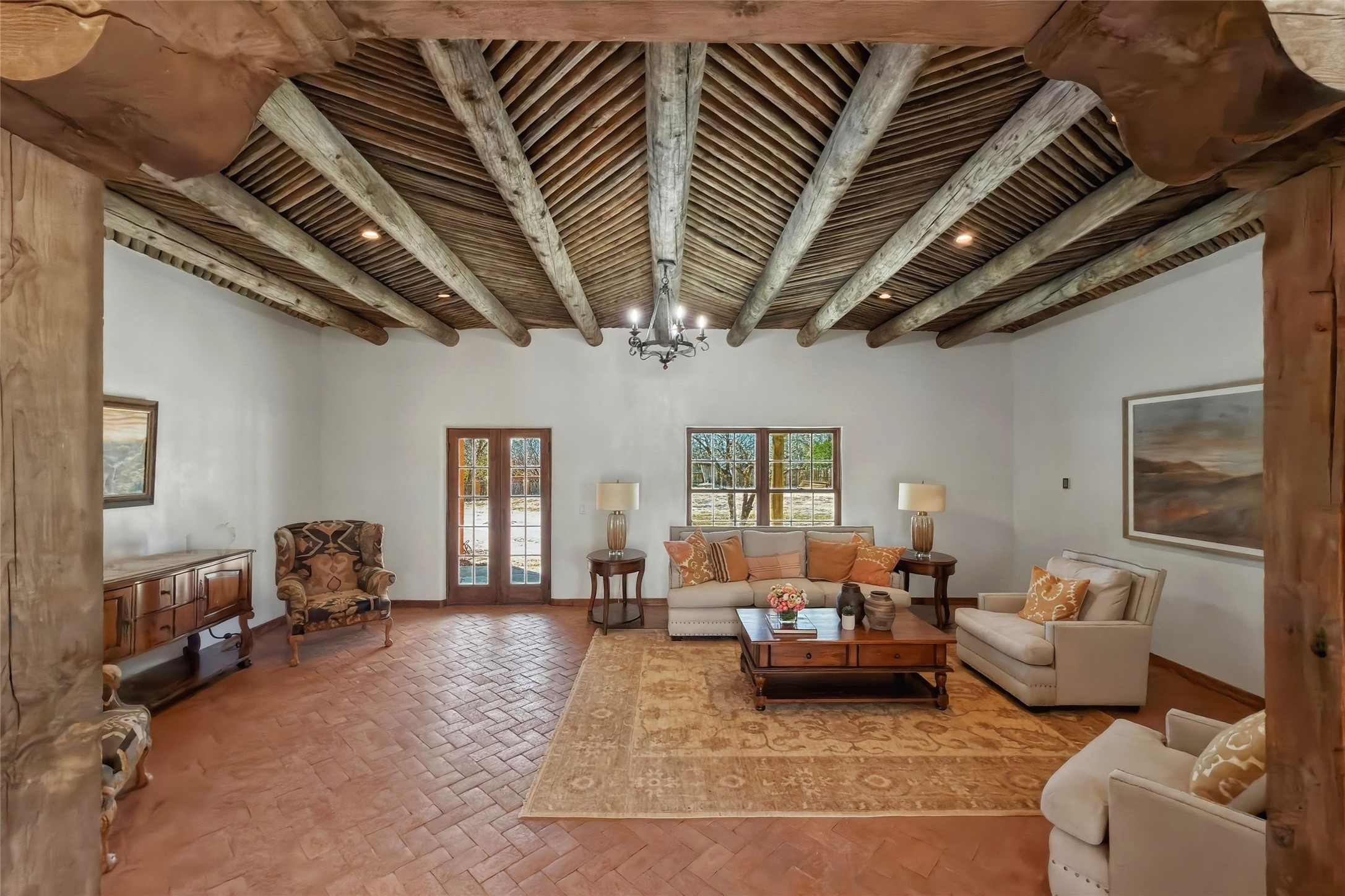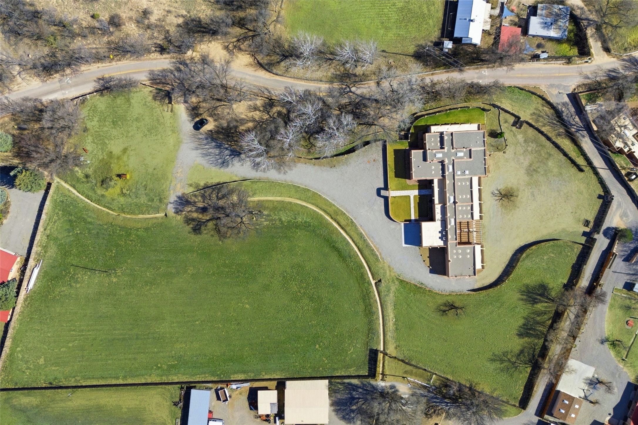 Nestled in the lush and picturesque Nambe Valley, this extraordinary traditional hacienda adobe estate offers a rare blend of historic charm, authentic Southwestern craftsmanship, and modern comfort--all just a scenic 20-minute drive from the heart of Santa Fe Plaza. This Parade of Homes Heritage Award-winning property (2024) is set on three contiguous lots totaling approximately 4 acres, the property provides exceptional privacy and flexibility.The residence features 3 bedrooms and 5 bathrooms. Beautifully integrated with thoughtful modern upgrades, it showcases authentic Southwestern architecture, including aged beams, reclaimed lumber ceilings, and diamond plaster walls, creating a warm and timeless aesthetic throughout.Designed for comfort and efficiency, the home includes: 9-zone radiant heating and cooling, HVAC system controllable via smartphone, R-40 insulated walls, Foam and TPO roofing, Anderson windows, Three kitchen sinks, ideal for entertaining or multi-cook kitchens.Additional highlights include a private well with 3 acre-feet of water rights and access to a historic acequia, enhancing both the property's functionality and connection to the region's heritage.Surrounded by the natural beauty of Northern New Mexico, this one-of-a-kind estate offers a rare opportunity to own a piece of living history while enjoying modern luxury in one of the area's most serene valley settings. Please note, some photos have been digitally enhanced.