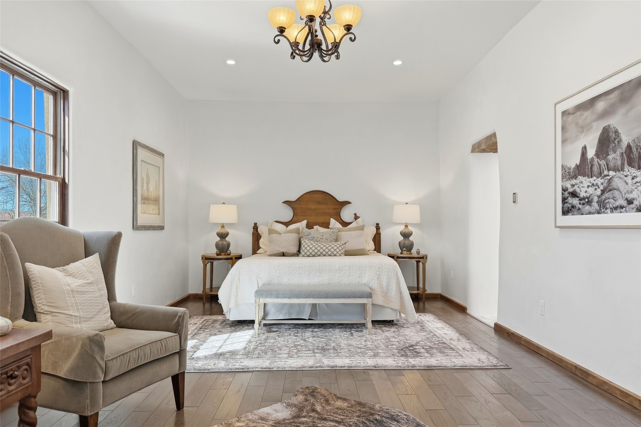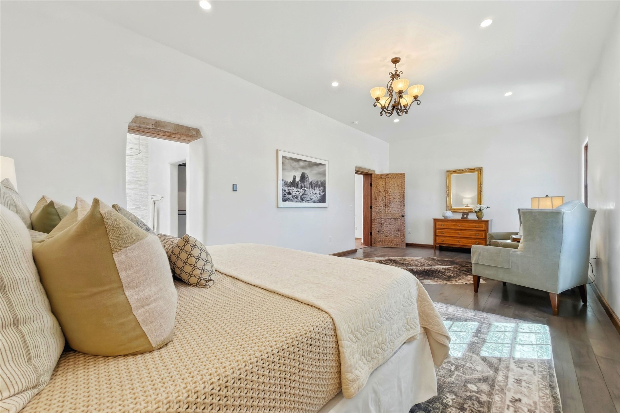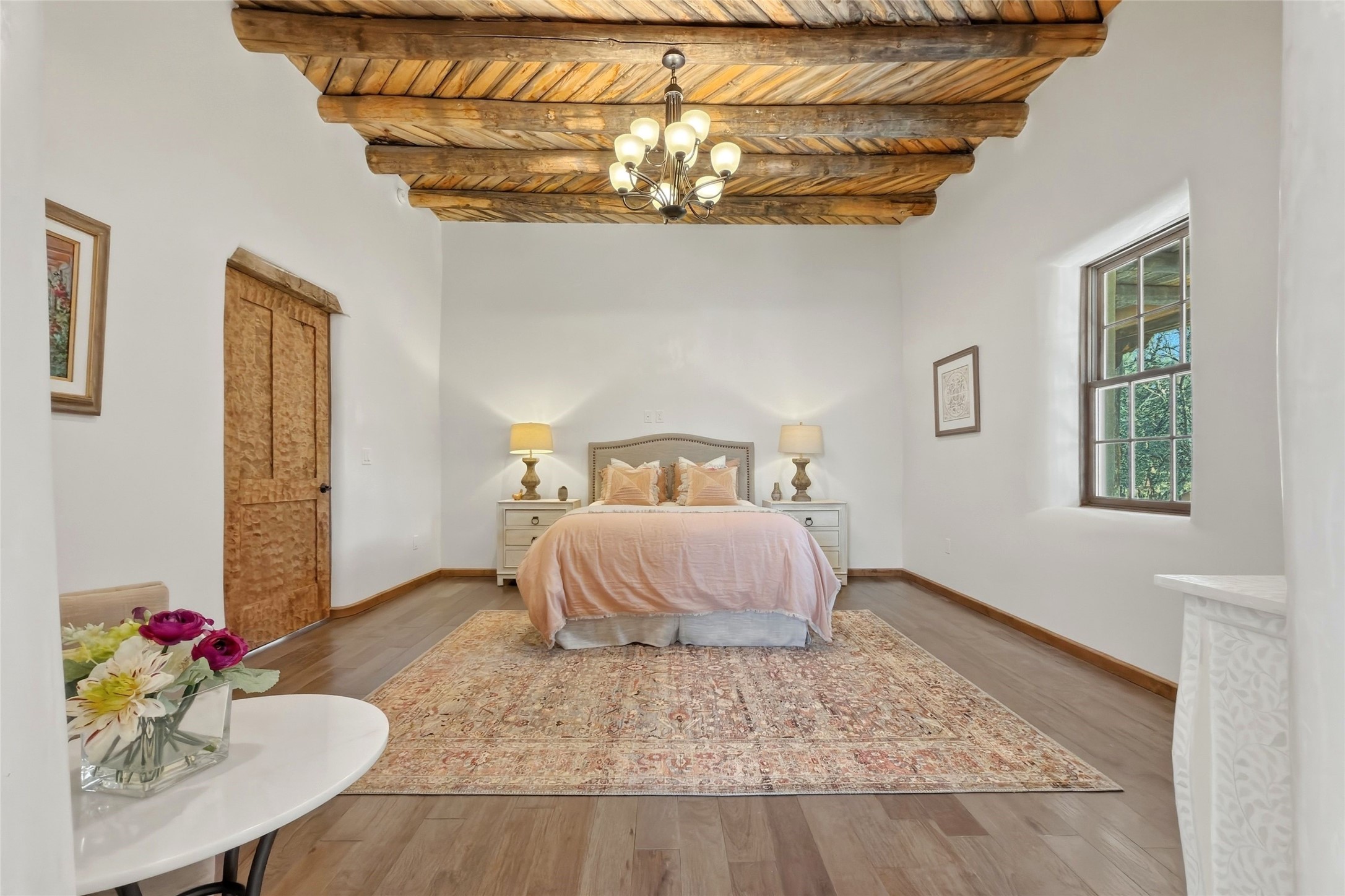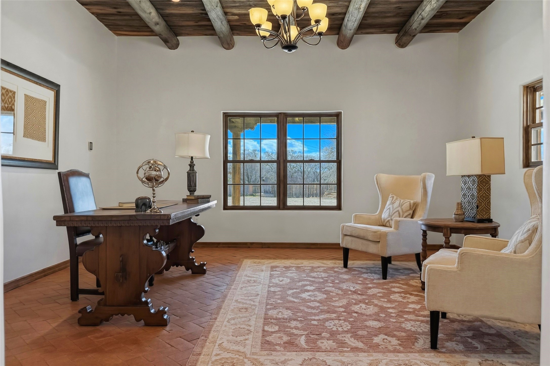 Nestled in the lush and picturesque Nambe Valley, this extraordinary traditional hacienda adobe estate offers a rare blend of historic charm, authentic Southwestern craftsmanship, and modern comfort--all just a scenic 20-minute drive from the heart of Santa Fe Plaza. This Parade of Homes Heritage Award-winning property (2024) is set on three contiguous lots totaling approximately 4 acres, the property provides exceptional privacy and flexibility.The residence features 3 bedrooms and 5 bathrooms. Beautifully integrated with thoughtful modern upgrades, it showcases authentic Southwestern architecture, including aged beams, reclaimed lumber ceilings, and diamond plaster walls, creating a warm and timeless aesthetic throughout.Designed for comfort and efficiency, the home includes: 9-zone radiant heating and cooling, HVAC system controllable via smartphone, R-40 insulated walls, Foam and TPO roofing, Anderson windows, Three kitchen sinks, ideal for entertaining or multi-cook kitchens.Additional highlights include a private well with 3 acre-feet of water rights and access to a historic acequia, enhancing both the property's functionality and connection to the region's heritage.Surrounded by the natural beauty of Northern New Mexico, this one-of-a-kind estate offers a rare opportunity to own a piece of living history while enjoying modern luxury in one of the area's most serene valley settings. Please note, some photos have been digitally enhanced.