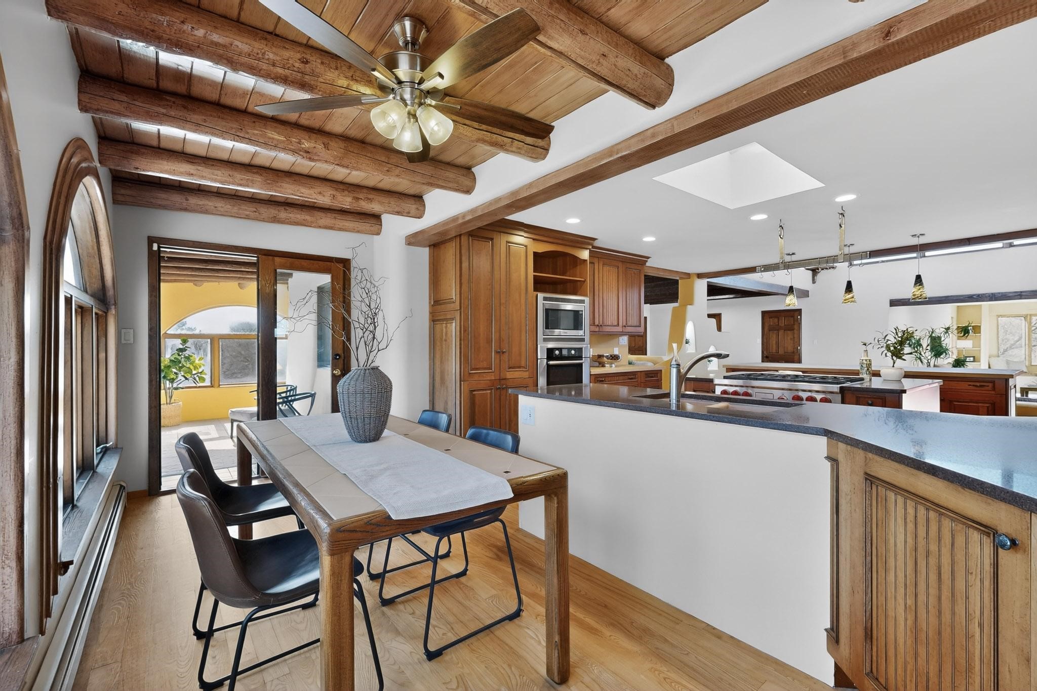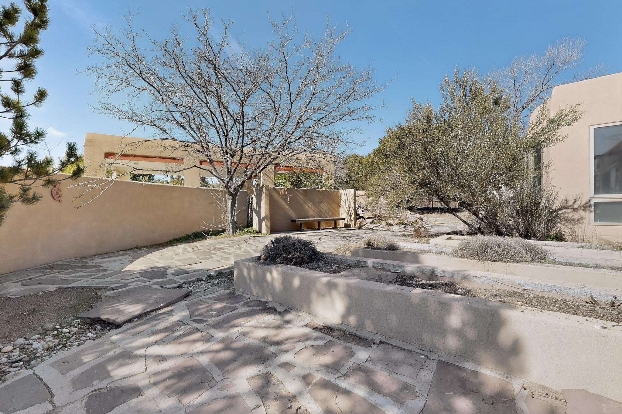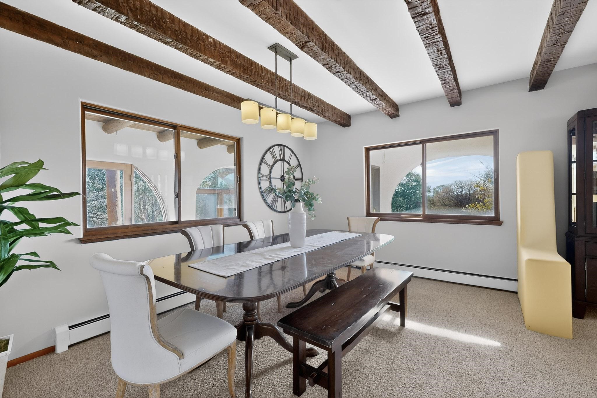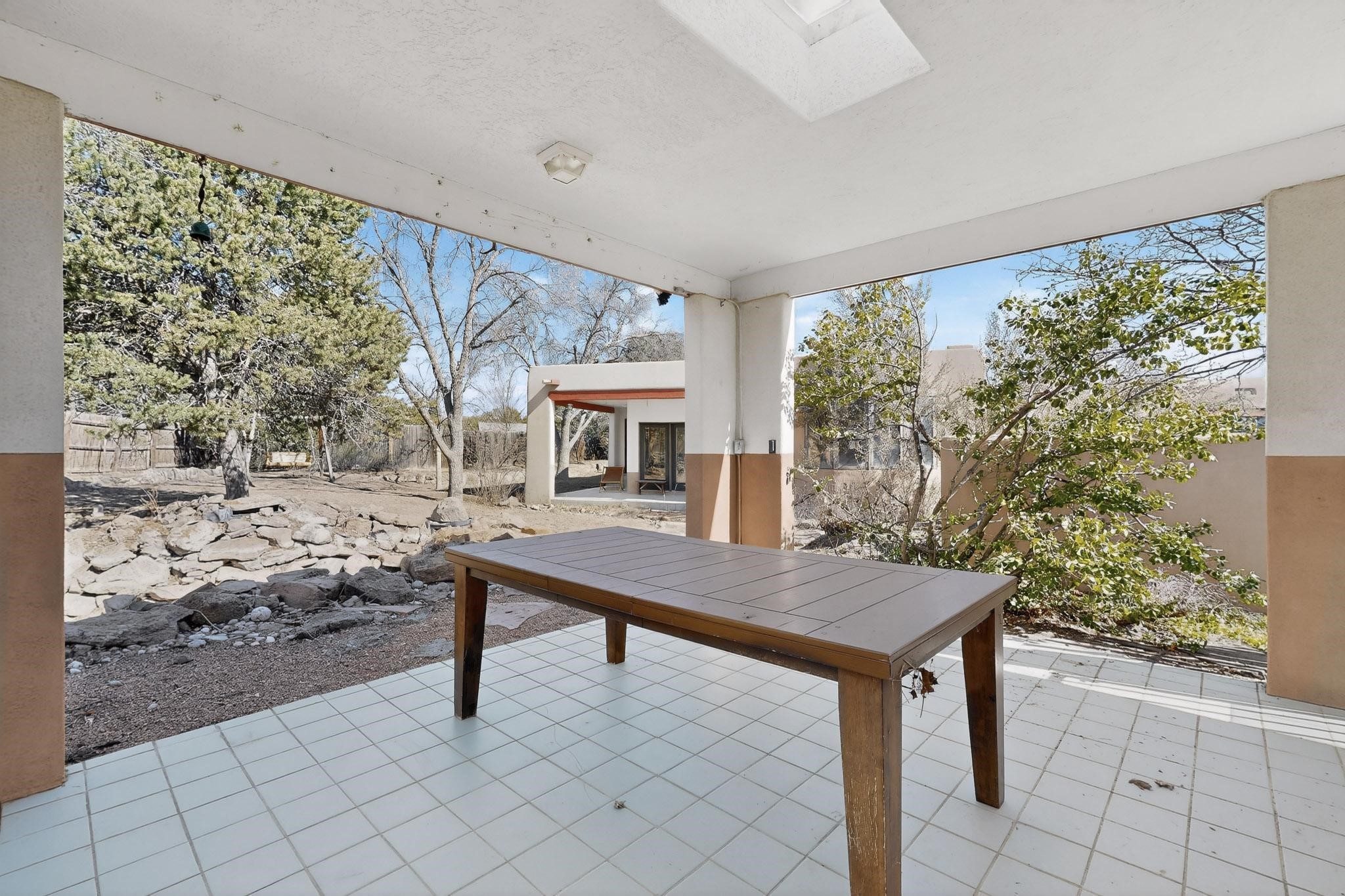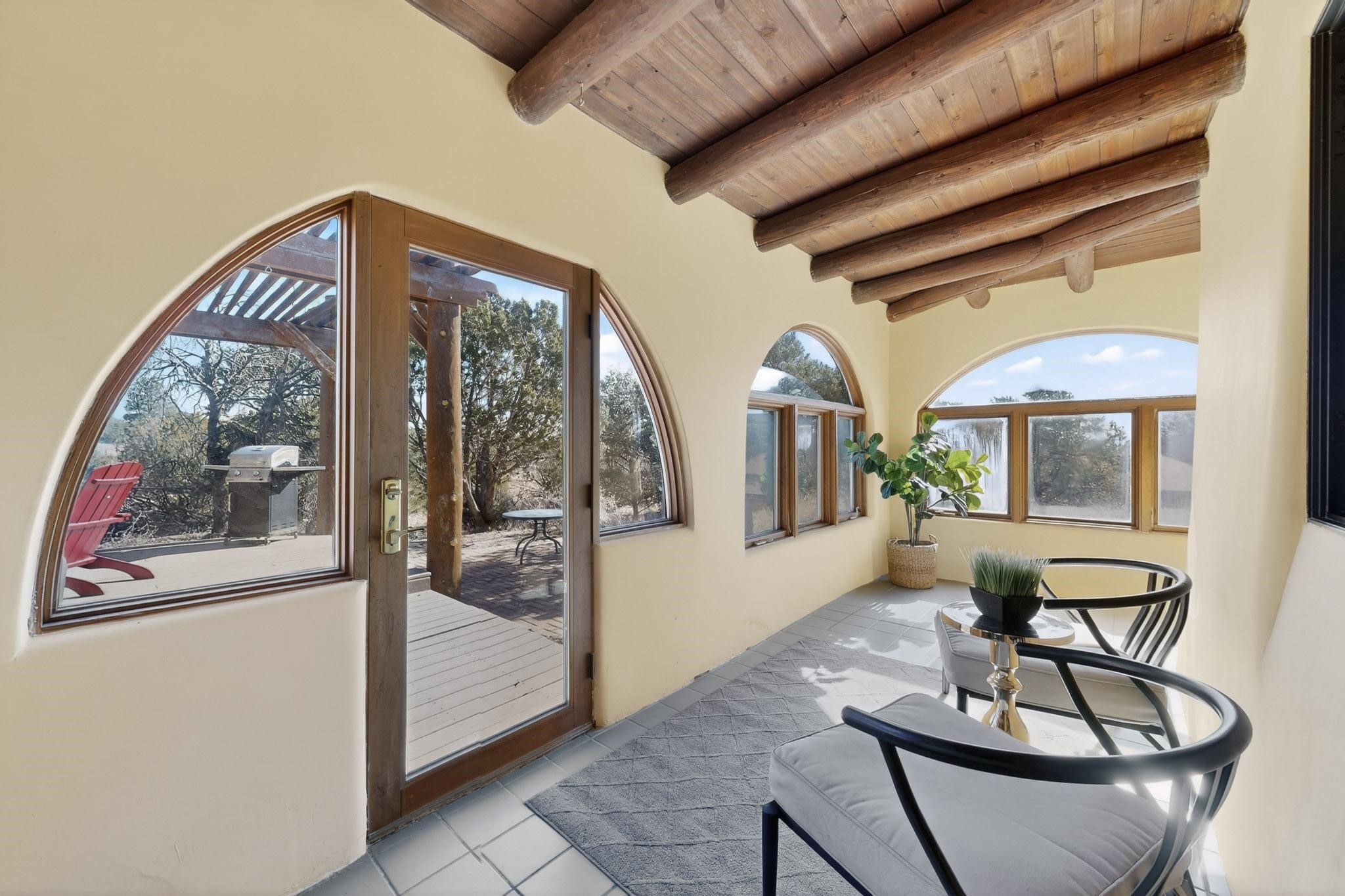 Set on 2.18 horse-zoned acres in the peaceful La Senda community, this Northern New Mexico style home offers space, privacy, and timeless Southwestern character. Designed by Nona Stone and formerly owned by a past Los Alamos National Laboratory Director, the home reflects thoughtful design and a quiet connection to local history.With more than 3,200 square feet, the residence features traditional vigas, a welcoming kiva fireplace, exposed adobe accents, tile floors, bancos, and nichos, and skylights that fill the interior with natural light. Multiple living areas provide comfortable spaces for gathering and everyday living.The spacious kitchen anchors the heart of the home with Brookhaven cabinetry, a Wolf six-burner range, Bosch wall oven and microwave, beverage refrigerator, dual pantries, and two islands designed for cooking and conversation.A bright sunroom expands the living space and works beautifully as a greenhouse, studio, or sitting room. The primary suite offers private portal access and a five-piece bath with jetted tub and walk-in shower beneath a skylight.Outdoor portals and entertaining areas invite quiet mornings and relaxed evenings surrounded by the pion and juniper landscape. The property also includes a two-car attached garage, detached RV carport, and direct access to neighborhood equine trails.Located just minutes from White Rock's village center and an easy drive to LANL, this distinctive home offers a rare combination of acreage, architectural character, and peaceful surroundings.