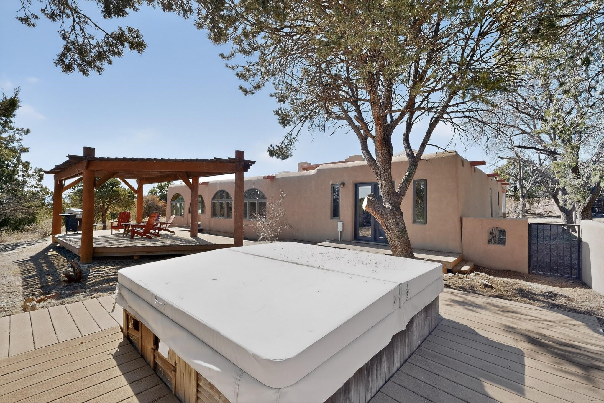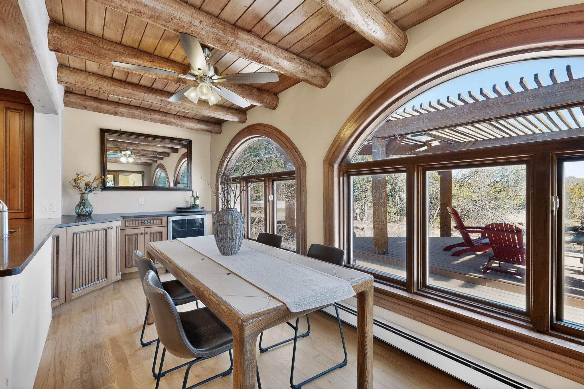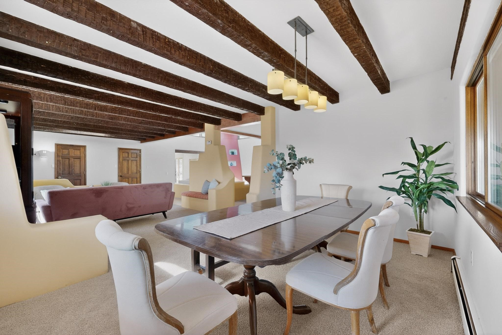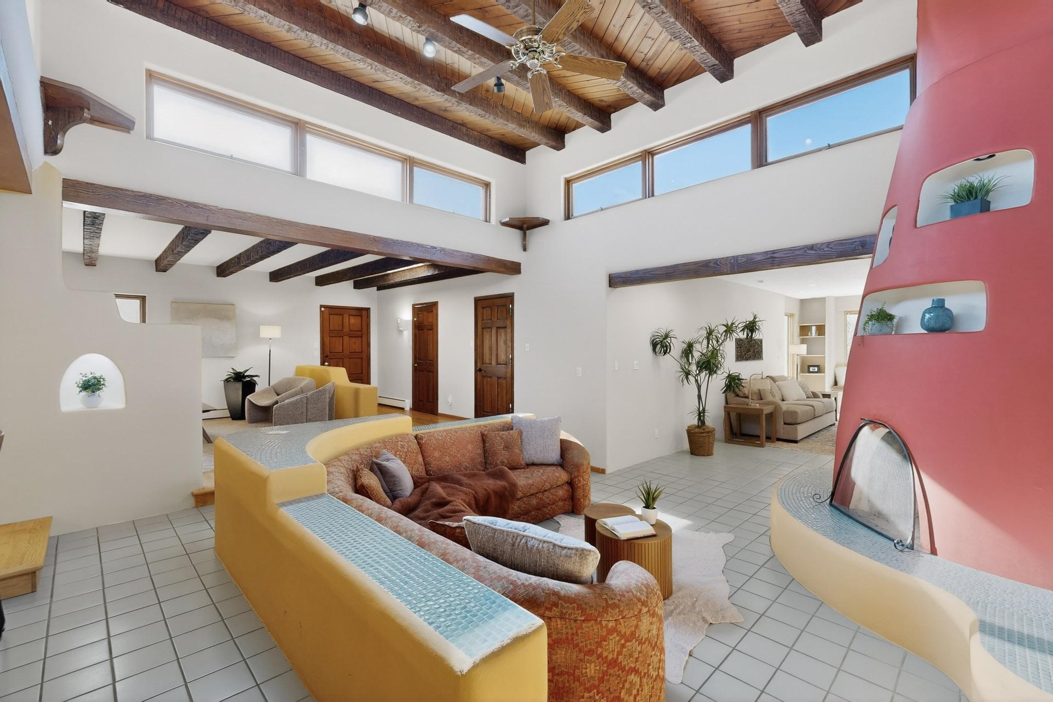 Set on 2.18 horse-zoned acres in the peaceful La Senda community, this Northern New Mexico style home offers space, privacy, and timeless Southwestern character. Designed by Nona Stone and formerly owned by a past Los Alamos National Laboratory Director, the home reflects thoughtful design and a quiet connection to local history.With more than 3,200 square feet, the residence features traditional vigas, a welcoming kiva fireplace, exposed adobe accents, tile floors, bancos, and nichos, and skylights that fill the interior with natural light. Multiple living areas provide comfortable spaces for gathering and everyday living.The spacious kitchen anchors the heart of the home with Brookhaven cabinetry, a Wolf six-burner range, Bosch wall oven and microwave, beverage refrigerator, dual pantries, and two islands designed for cooking and conversation.A bright sunroom expands the living space and works beautifully as a greenhouse, studio, or sitting room. The primary suite offers private portal access and a five-piece bath with jetted tub and walk-in shower beneath a skylight.Outdoor portals and entertaining areas invite quiet mornings and relaxed evenings surrounded by the pion and juniper landscape. The property also includes a two-car attached garage, detached RV carport, and direct access to neighborhood equine trails.Located just minutes from White Rock's village center and an easy drive to LANL, this distinctive home offers a rare combination of acreage, architectural character, and peaceful surroundings.