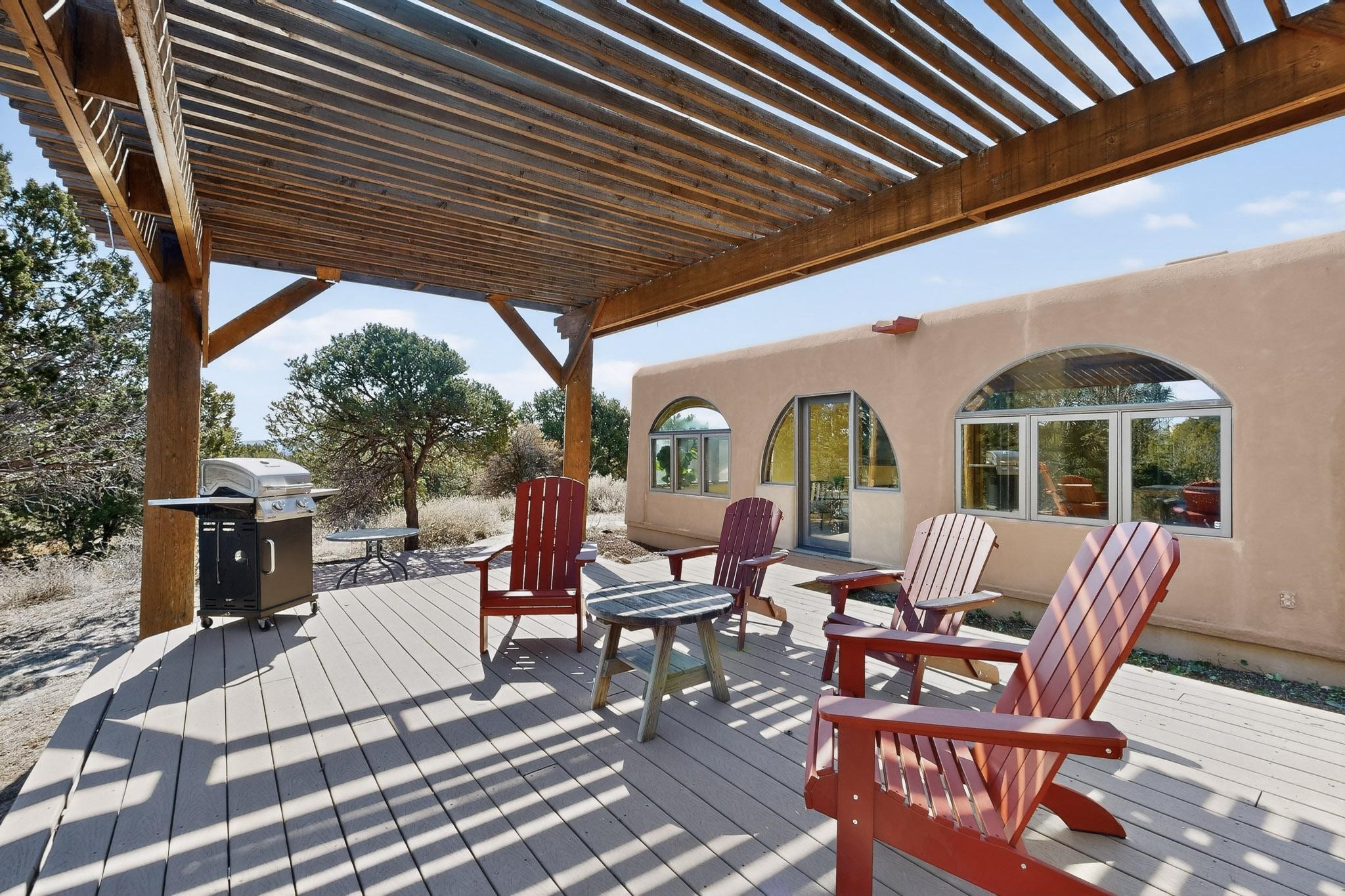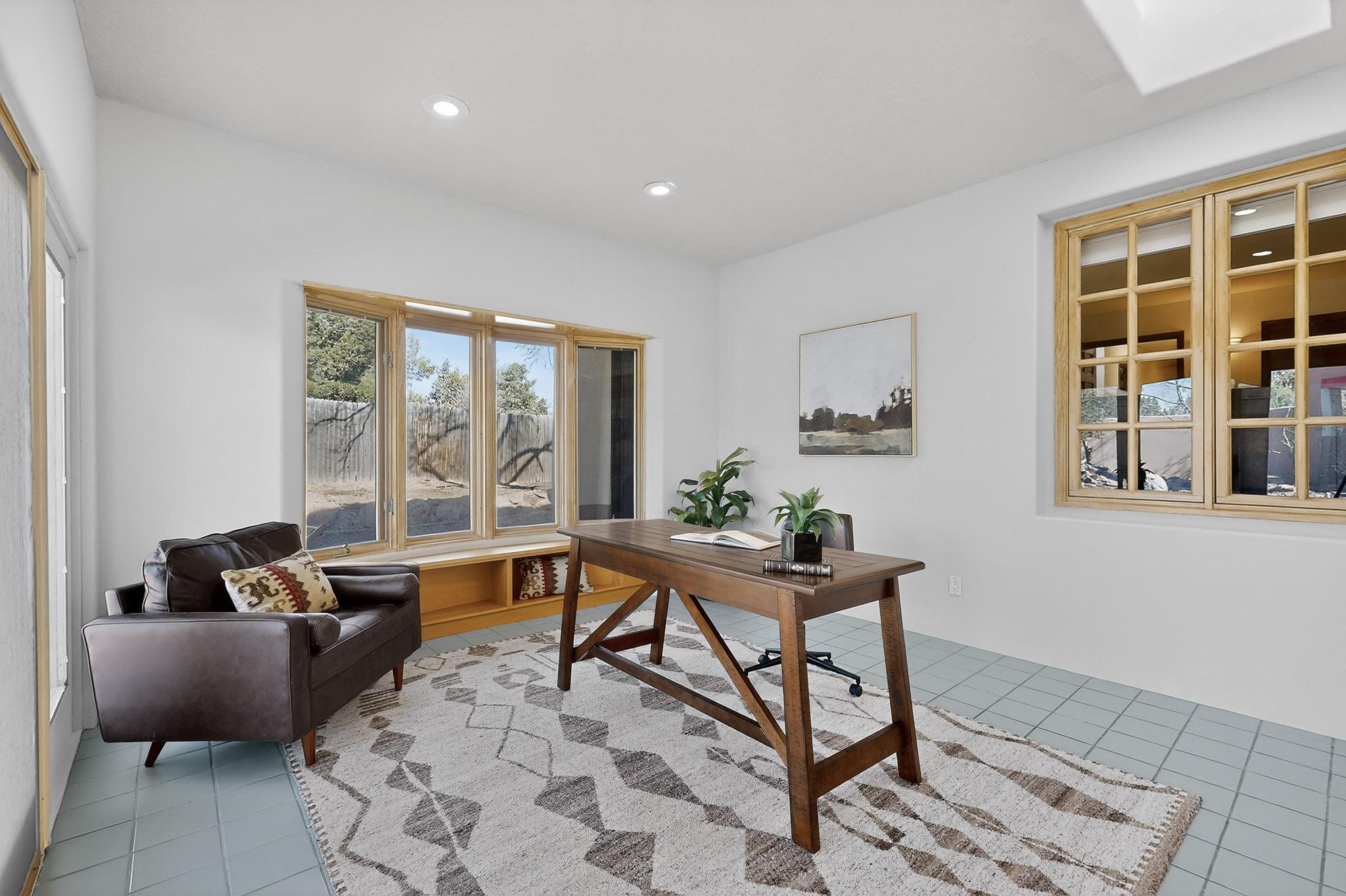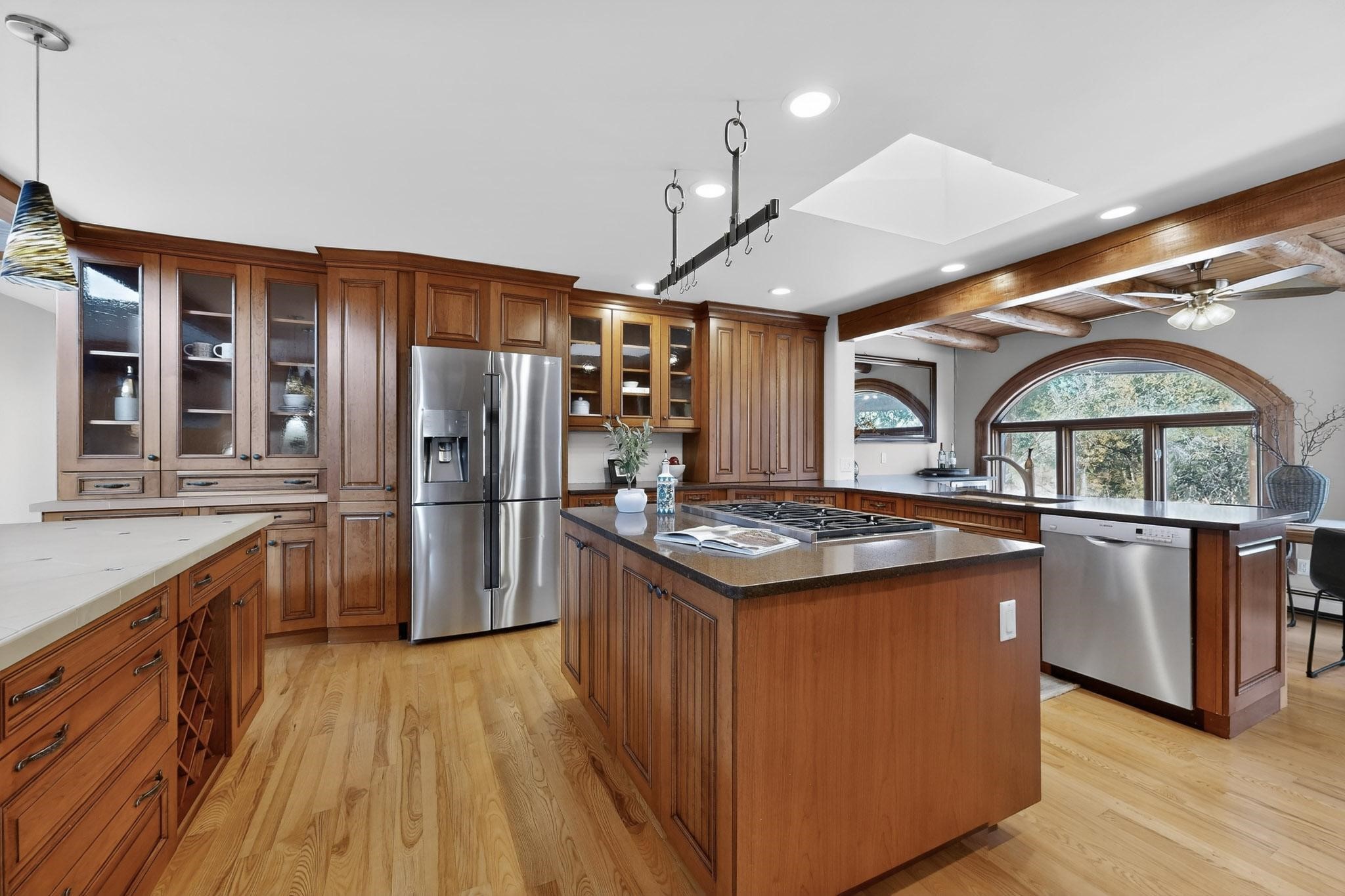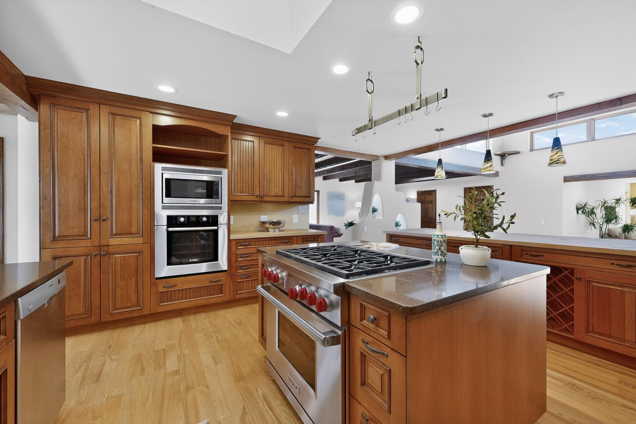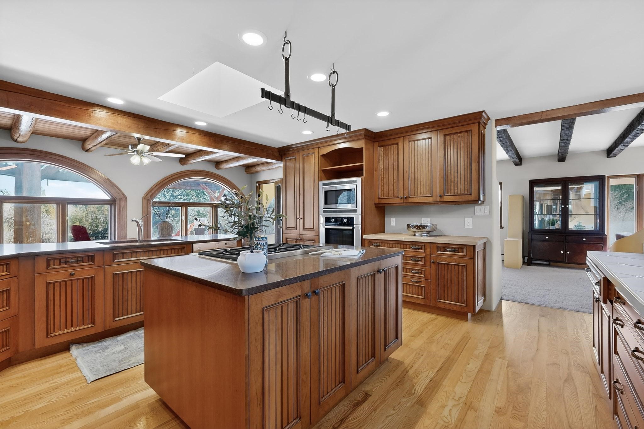 Set on 2.18 horse-zoned acres in the peaceful La Senda community, this Northern New Mexico style home offers space, privacy, and timeless Southwestern character. Designed by Nona Stone and formerly owned by a past Los Alamos National Laboratory Director, the home reflects thoughtful design and a quiet connection to local history.With more than 3,200 square feet, the residence features traditional vigas, a welcoming kiva fireplace, exposed adobe accents, tile floors, bancos, and nichos, and skylights that fill the interior with natural light. Multiple living areas provide comfortable spaces for gathering and everyday living.The spacious kitchen anchors the heart of the home with Brookhaven cabinetry, a Wolf six-burner range, Bosch wall oven and microwave, beverage refrigerator, dual pantries, and two islands designed for cooking and conversation.A bright sunroom expands the living space and works beautifully as a greenhouse, studio, or sitting room. The primary suite offers private portal access and a five-piece bath with jetted tub and walk-in shower beneath a skylight.Outdoor portals and entertaining areas invite quiet mornings and relaxed evenings surrounded by the pion and juniper landscape. The property also includes a two-car attached garage, detached RV carport, and direct access to neighborhood equine trails.Located just minutes from White Rock's village center and an easy drive to LANL, this distinctive home offers a rare combination of acreage, architectural character, and peaceful surroundings.