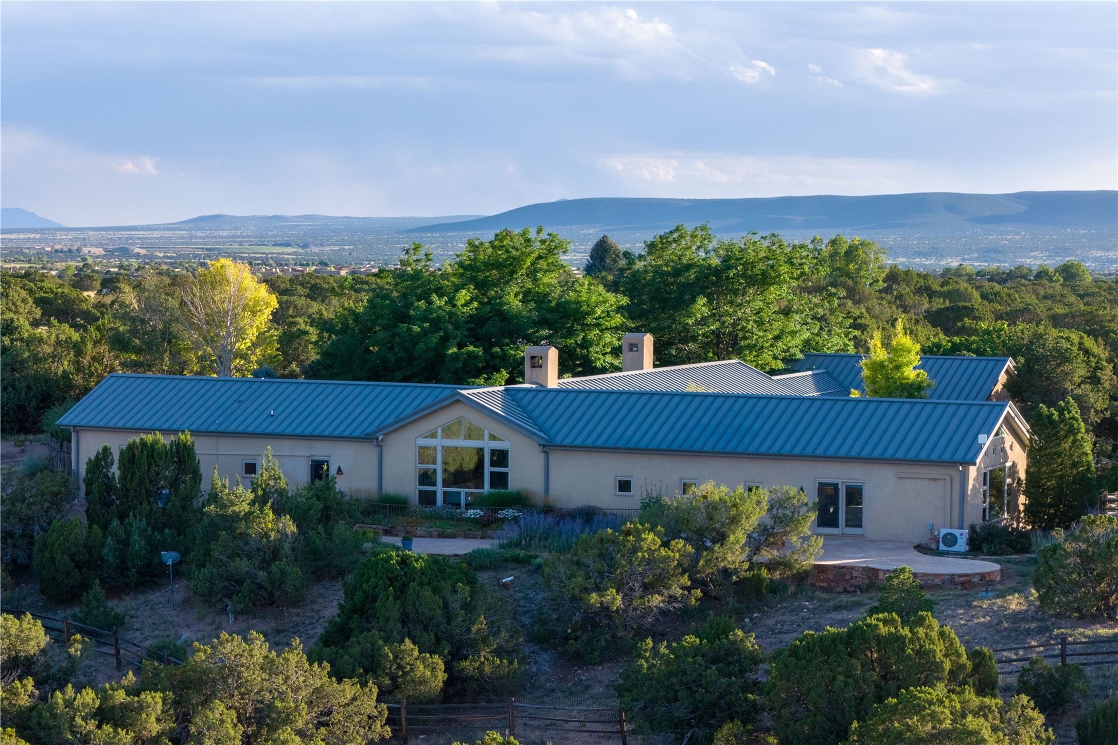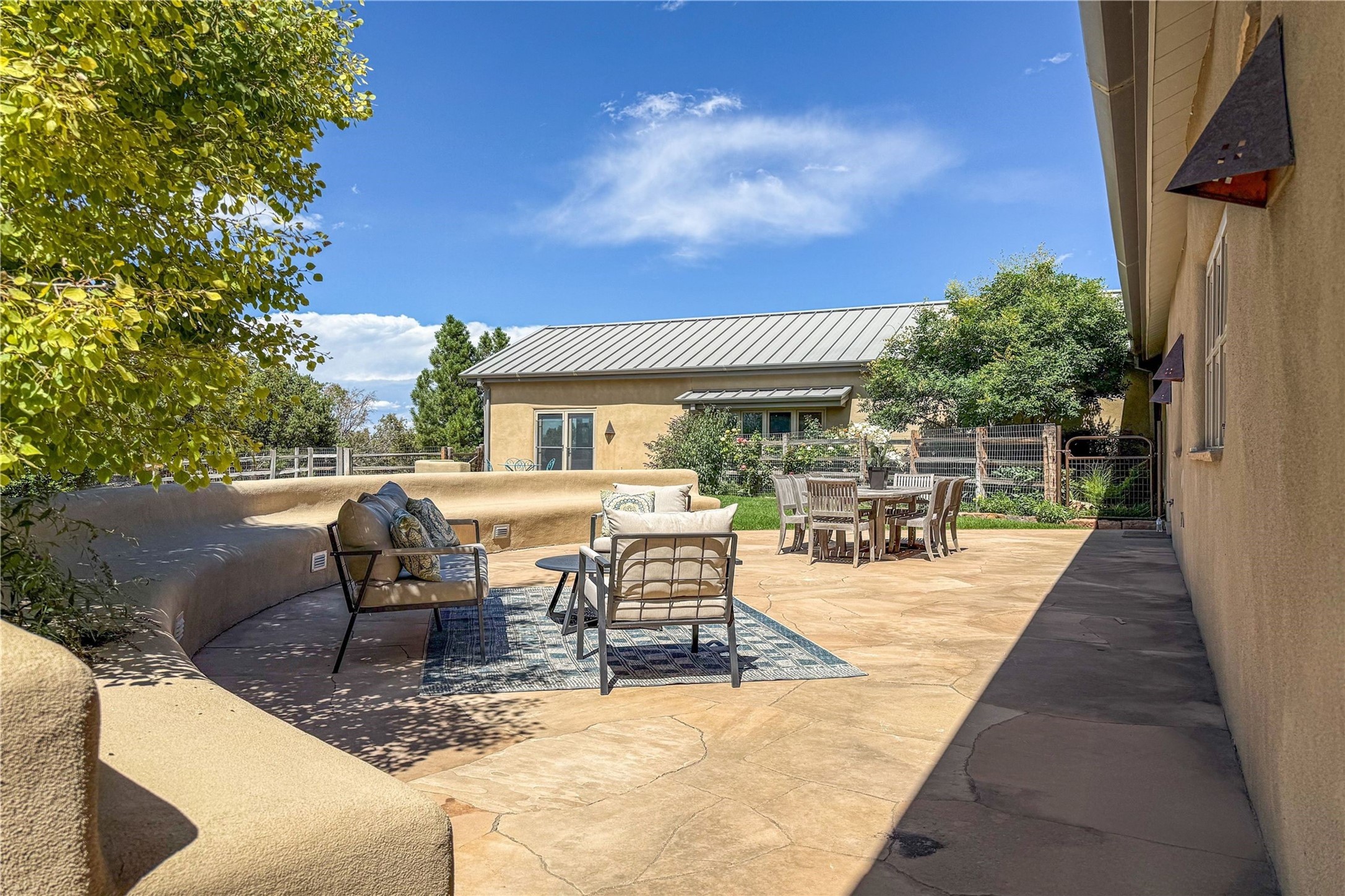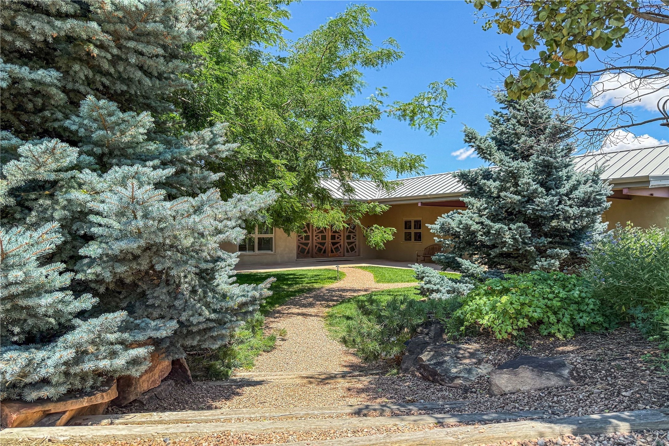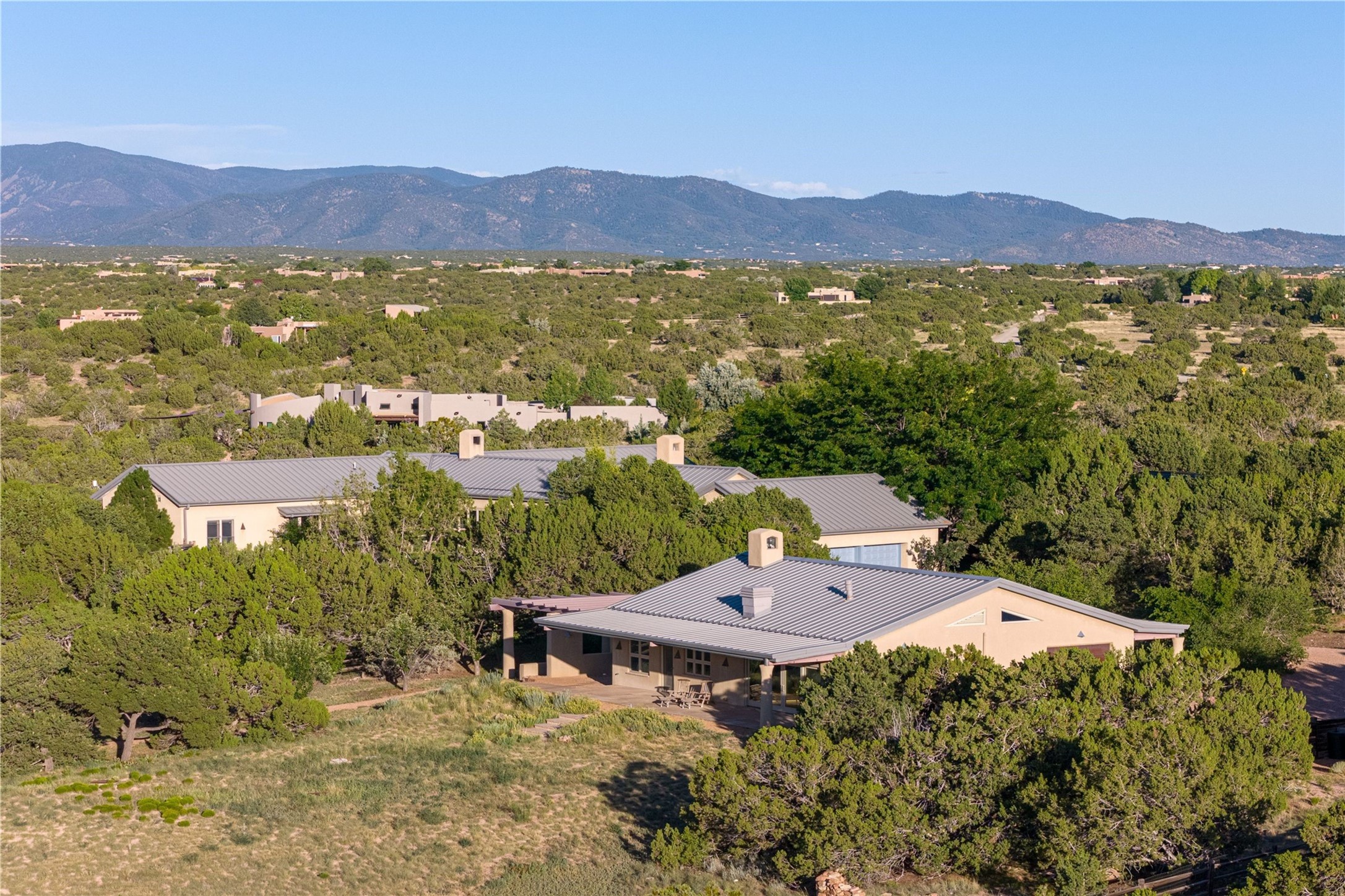 This serene La Tierra Nueva compound, with three distinct residences totaling 7,341 sq. feet of living space. Designed by renowned architect, Lila DeWindt, this lush oasis boasts mature landscaping in a serene, country-like setting with Sangre and Jemez mountain views, 11.85 acres, and vegetable and perennial gardens. The 3,982 sq. foot single level main residence features a blend of timeless Northern NM and modern design, a dramatic high-pitched roof, double-sided stone fireplace, copious natural light, and large windows that capture breathtaking Sangre views. With a casual sitting area open to the kitchen, a separate living room with a huge picture window facing the Sangres, a media room/library and bedrooms that also boast mountain views, this residence is truly stunning. The primary suite's tub overlooks a flower garden. An open-concept kitchen is centered around a large island, perfect for hosting. The home enjoys an expansive front portal and multiple patio spaces. The charming 1,334 sq. foot, two bedroom guest house includes a chef's kitchen, Saltillo tile flooring, a wood-burning stove, and wrap-around porch. The impressive 2,025 sq. foot modern 1-bedroom studio has an open living/dining/kitchen area, and portal. The adult rec-room, with built-in bar, is ideal as live/work space, artist studio/music room, car enthusiast or conversion to a barn, perfect for large gatherings and relaxing with sunset Jemez views. Beneath the studio, lays a remarkable walk-in wine cellar for approx. 5000 bottles with wine tasting area. The property also includes a generous fenced dog area and room for horses. A truly peaceful, secluded atmosphere just 18 minutes from the heart of Santa Fe or the airport, and 8 minutes to The Club at Las Campanas. La Tierra Nueva is a coveted, gated, equestrian-friendly community with access to over 60,000 acres BLM land, and tennis/pickleball court. Ideal for multigenerational living, wine lover, workshop, or patron of the arts. 7 Goodnight Trail West is a true hidden gem.