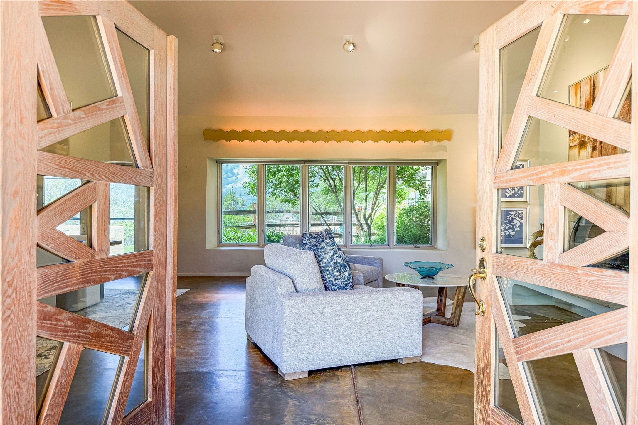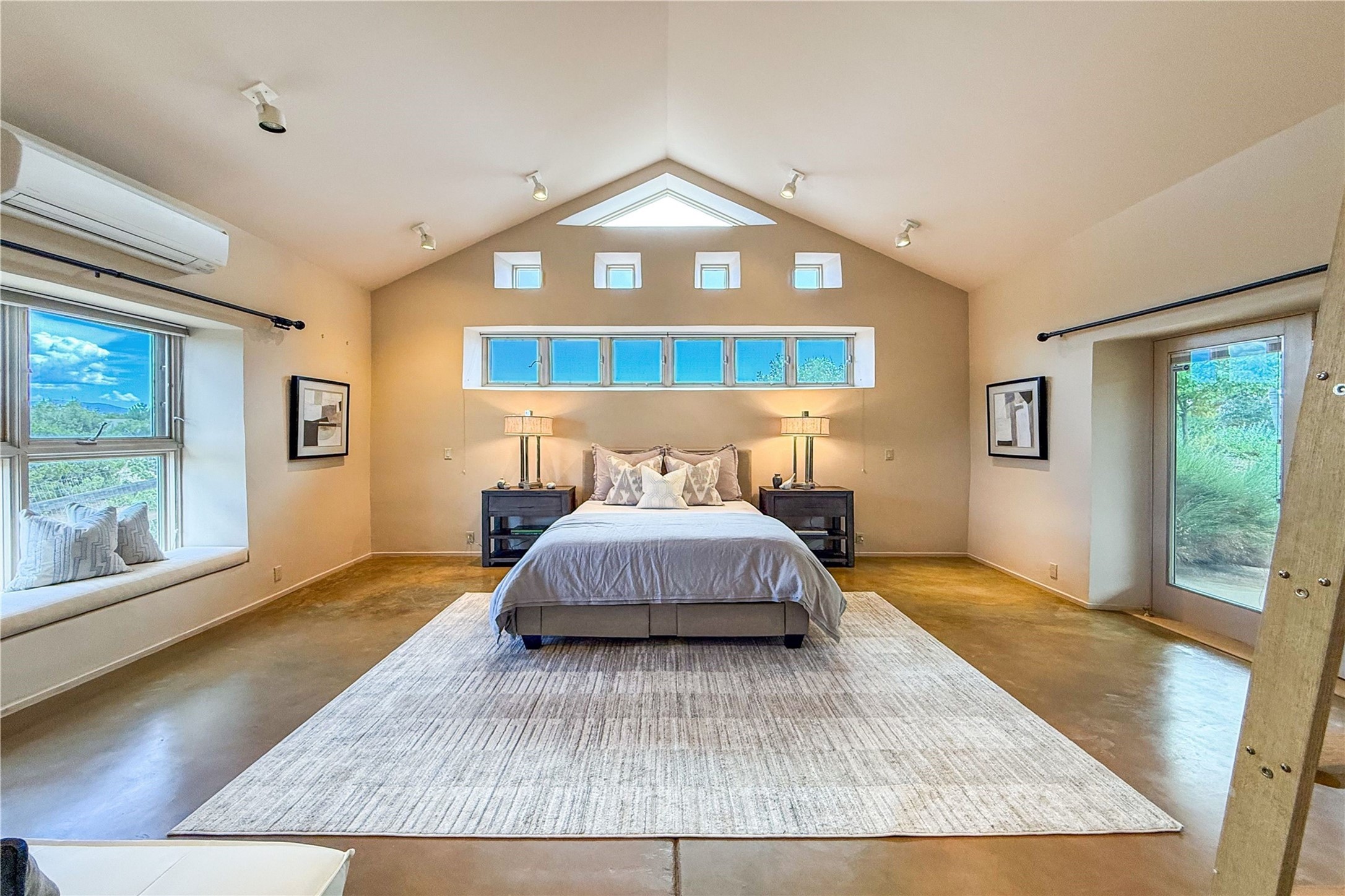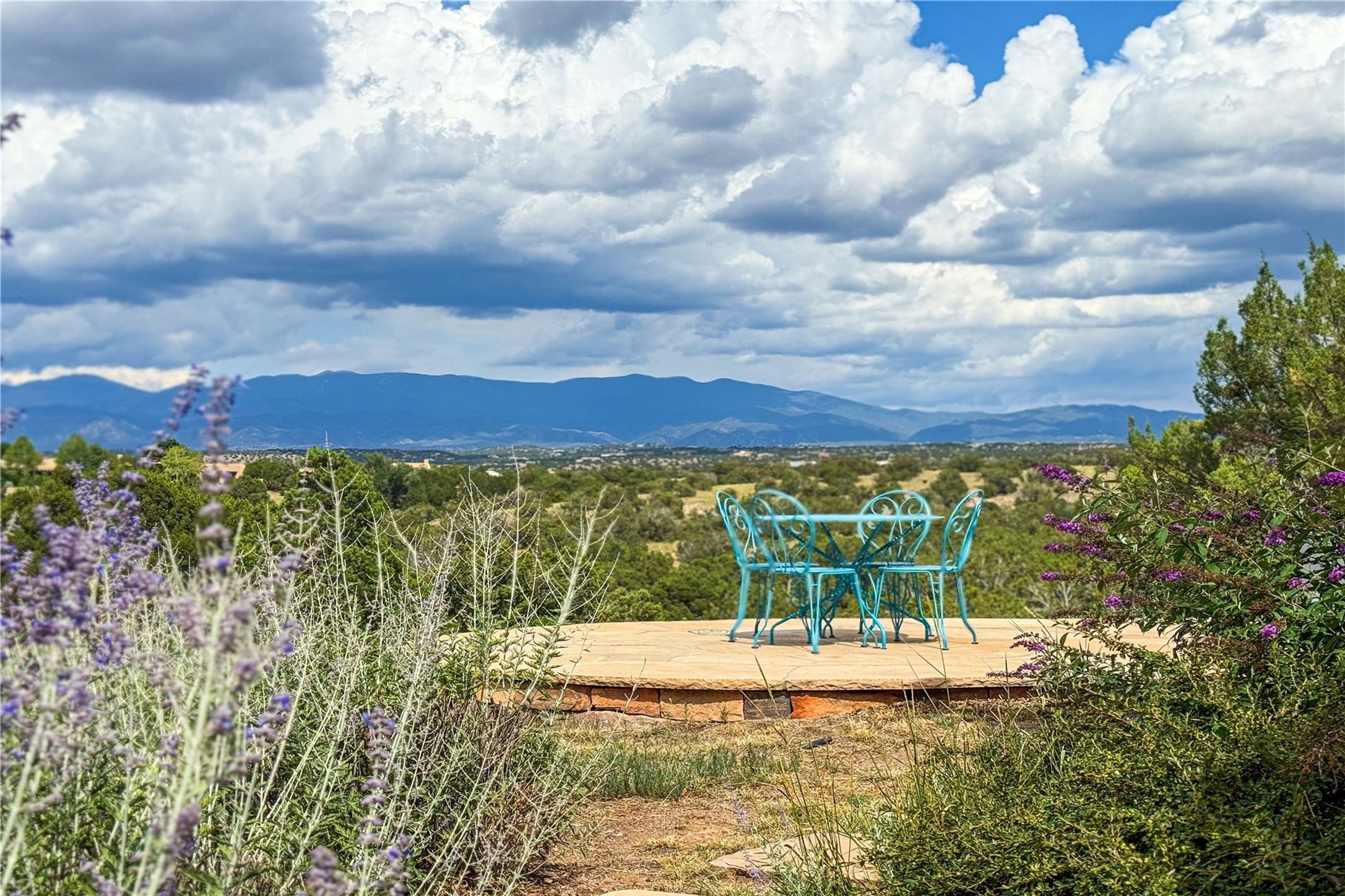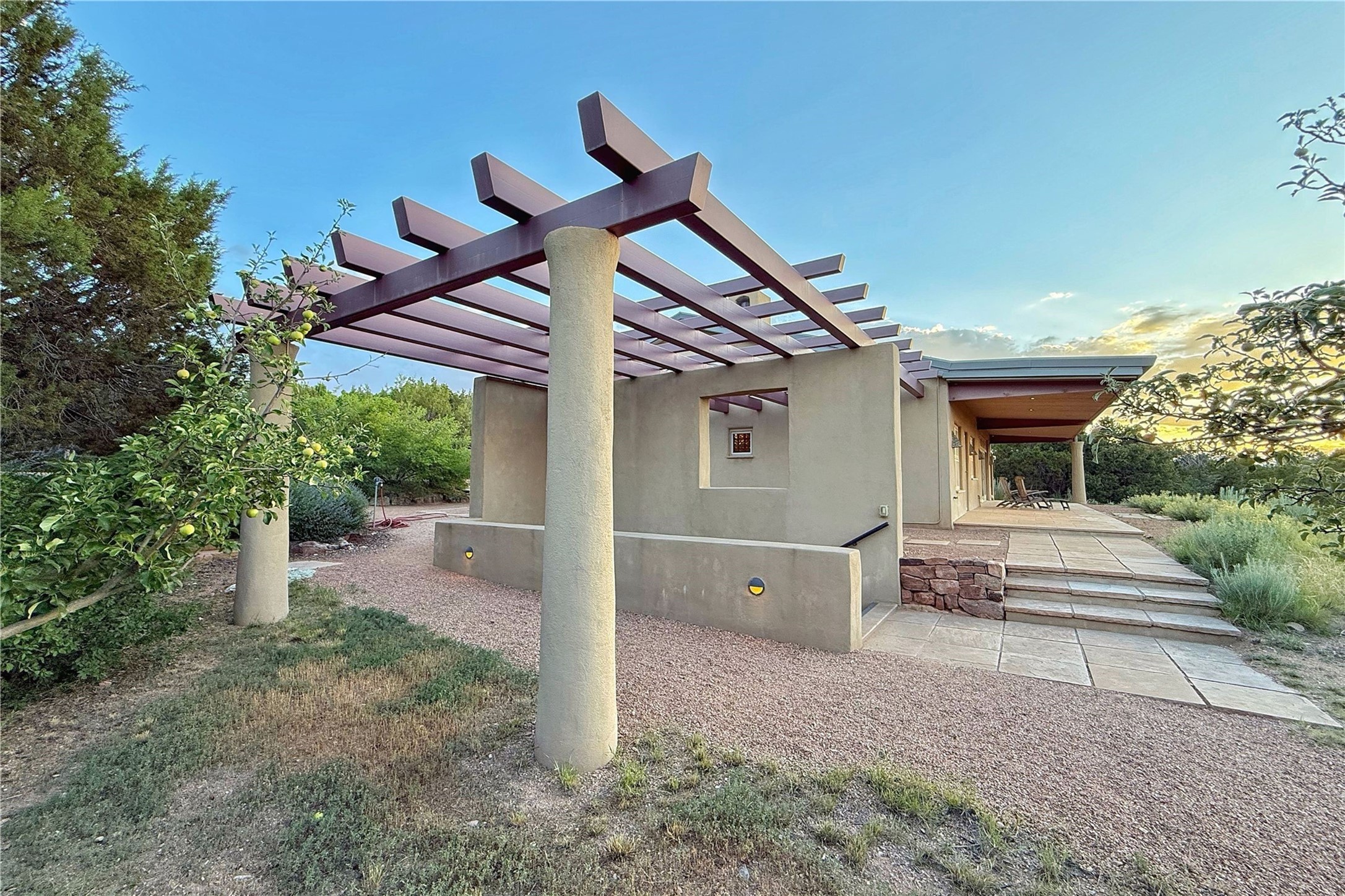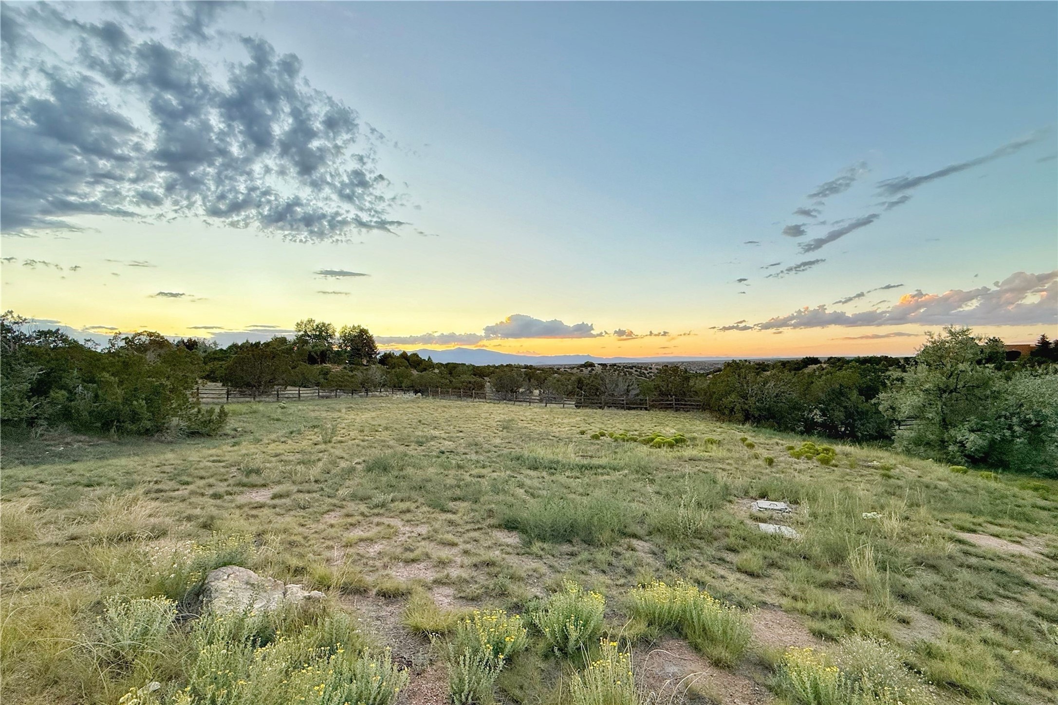 This serene La Tierra Nueva compound, with three distinct residences totaling 7,341 sq. feet of living space. Designed by renowned architect, Lila DeWindt, this lush oasis boasts mature landscaping in a serene, country-like setting with Sangre and Jemez mountain views, 11.85 acres, and vegetable and perennial gardens. The 3,982 sq. foot single level main residence features a blend of timeless Northern NM and modern design, a dramatic high-pitched roof, double-sided stone fireplace, copious natural light, and large windows that capture breathtaking Sangre views. With a casual sitting area open to the kitchen, a separate living room with a huge picture window facing the Sangres, a media room/library and bedrooms that also boast mountain views, this residence is truly stunning. The primary suite's tub overlooks a flower garden. An open-concept kitchen is centered around a large island, perfect for hosting. The home enjoys an expansive front portal and multiple patio spaces. The charming 1,334 sq. foot, two bedroom guest house includes a chef's kitchen, Saltillo tile flooring, a wood-burning stove, and wrap-around porch. The impressive 2,025 sq. foot modern 1-bedroom studio has an open living/dining/kitchen area, and portal. The adult rec-room, with built-in bar, is ideal as live/work space, artist studio/music room, car enthusiast or conversion to a barn, perfect for large gatherings and relaxing with sunset Jemez views. Beneath the studio, lays a remarkable walk-in wine cellar for approx. 5000 bottles with wine tasting area. The property also includes a generous fenced dog area and room for horses. A truly peaceful, secluded atmosphere just 18 minutes from the heart of Santa Fe or the airport, and 8 minutes to The Club at Las Campanas. La Tierra Nueva is a coveted, gated, equestrian-friendly community with access to over 60,000 acres BLM land, and tennis/pickleball court. Ideal for multigenerational living, wine lover, workshop, or patron of the arts. 7 Goodnight Trail West is a true hidden gem.
