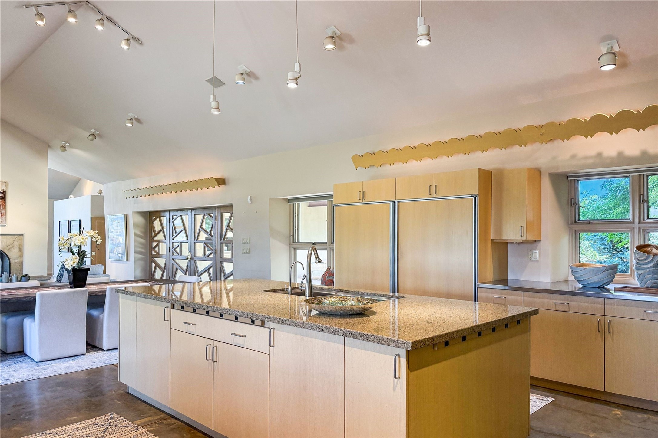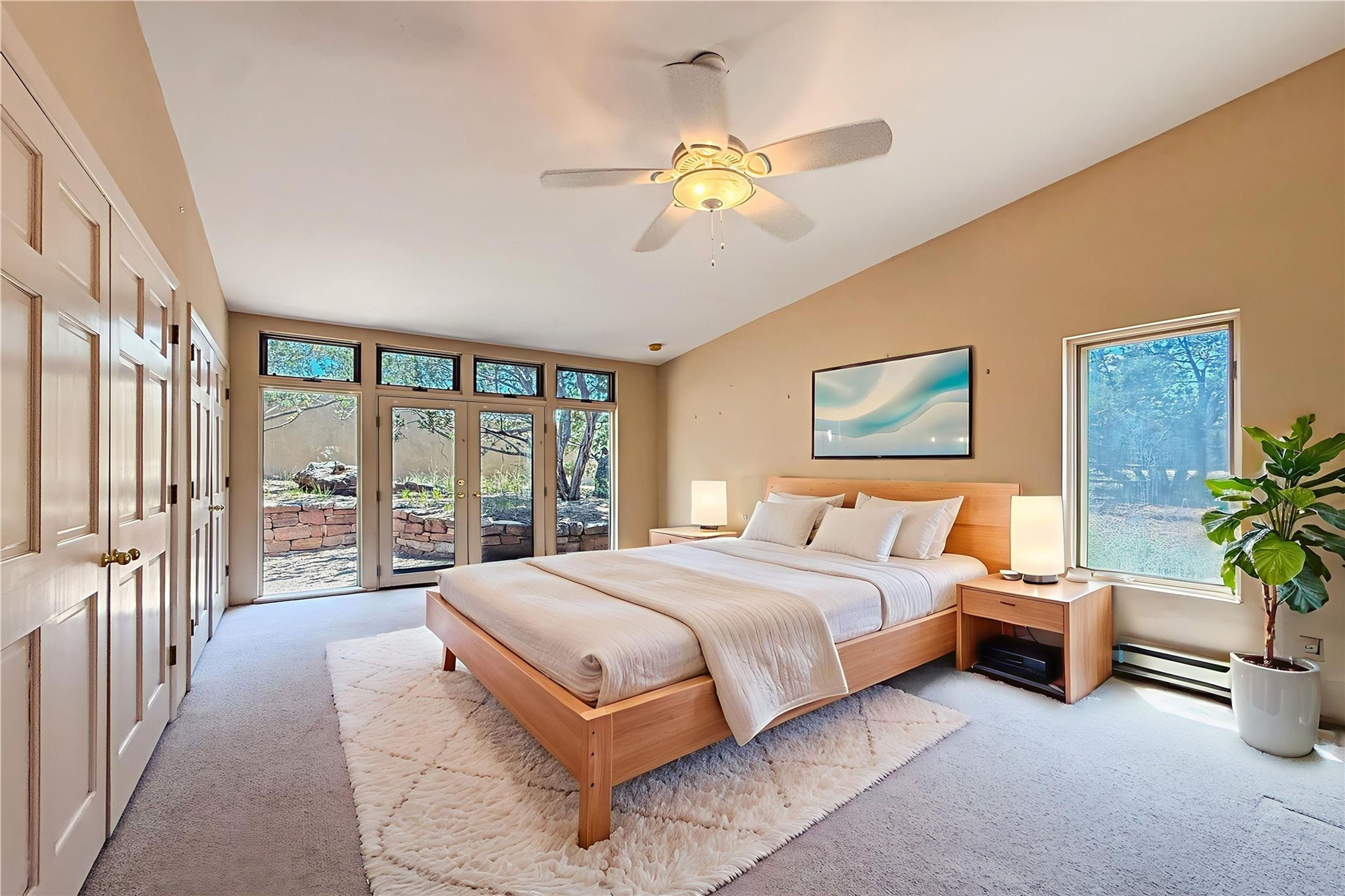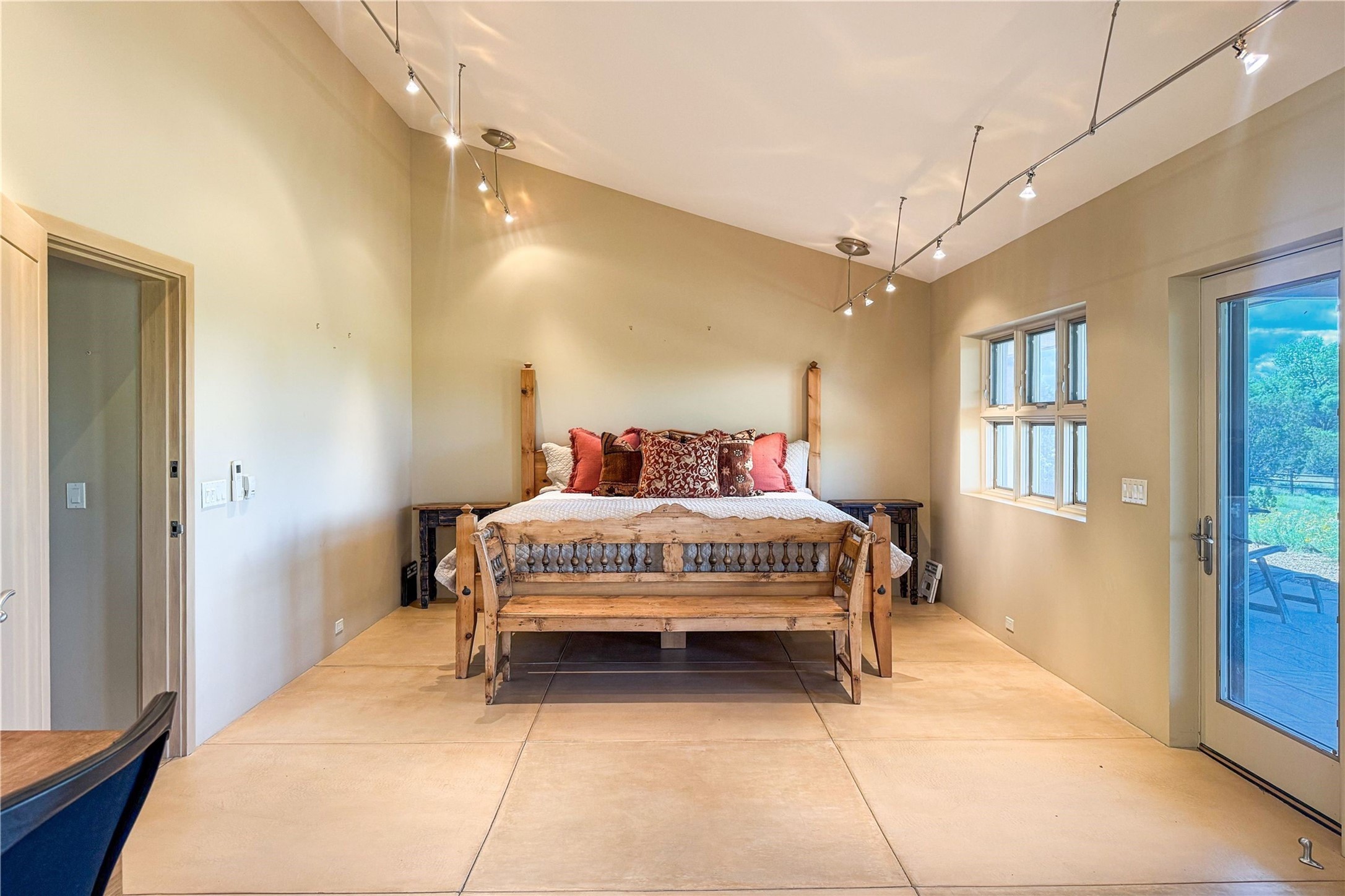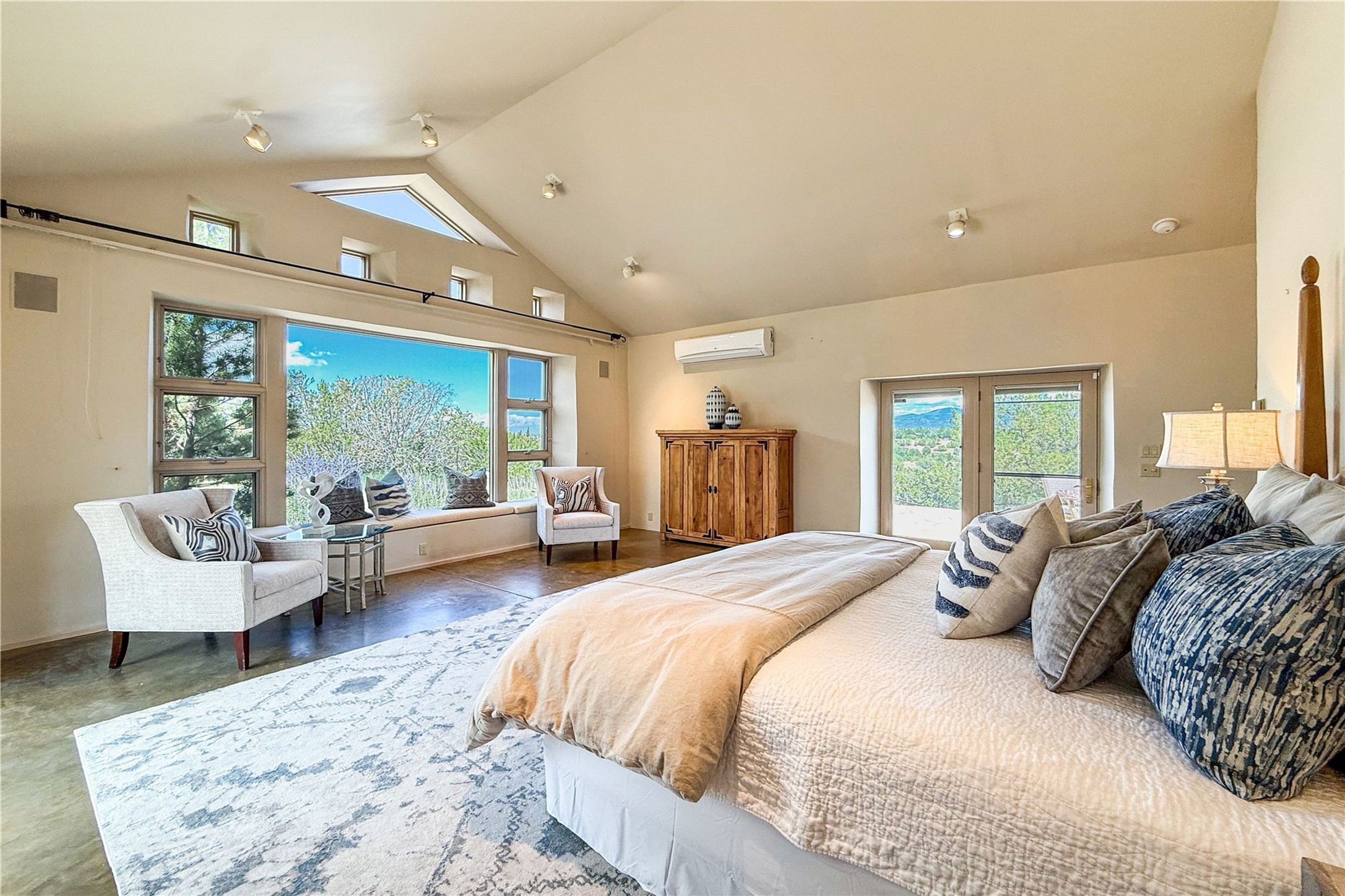 This serene La Tierra Nueva compound, with three distinct residences totaling 7,341 sq. feet of living space. Designed by renowned architect, Lila DeWindt, this lush oasis boasts mature landscaping in a serene, country-like setting with Sangre and Jemez mountain views, 11.85 acres, and vegetable and perennial gardens. The 3,982 sq. foot single level main residence features a blend of timeless Northern NM and modern design, a dramatic high-pitched roof, double-sided stone fireplace, copious natural light, and large windows that capture breathtaking Sangre views. With a casual sitting area open to the kitchen, a separate living room with a huge picture window facing the Sangres, a media room/library and bedrooms that also boast mountain views, this residence is truly stunning. The primary suite's tub overlooks a flower garden. An open-concept kitchen is centered around a large island, perfect for hosting. The home enjoys an expansive front portal and multiple patio spaces. The charming 1,334 sq. foot, two bedroom guest house includes a chef's kitchen, Saltillo tile flooring, a wood-burning stove, and wrap-around porch. The impressive 2,025 sq. foot modern 1-bedroom studio has an open living/dining/kitchen area, and portal. The adult rec-room, with built-in bar, is ideal as live/work space, artist studio/music room, car enthusiast or conversion to a barn, perfect for large gatherings and relaxing with sunset Jemez views. Beneath the studio, lays a remarkable walk-in wine cellar for approx. 5000 bottles with wine tasting area. The property also includes a generous fenced dog area and room for horses. A truly peaceful, secluded atmosphere just 18 minutes from the heart of Santa Fe or the airport, and 8 minutes to The Club at Las Campanas. La Tierra Nueva is a coveted, gated, equestrian-friendly community with access to over 60,000 acres BLM land, and tennis/pickleball court. Ideal for multigenerational living, wine lover, workshop, or patron of the arts. 7 Goodnight Trail West is a true hidden gem.