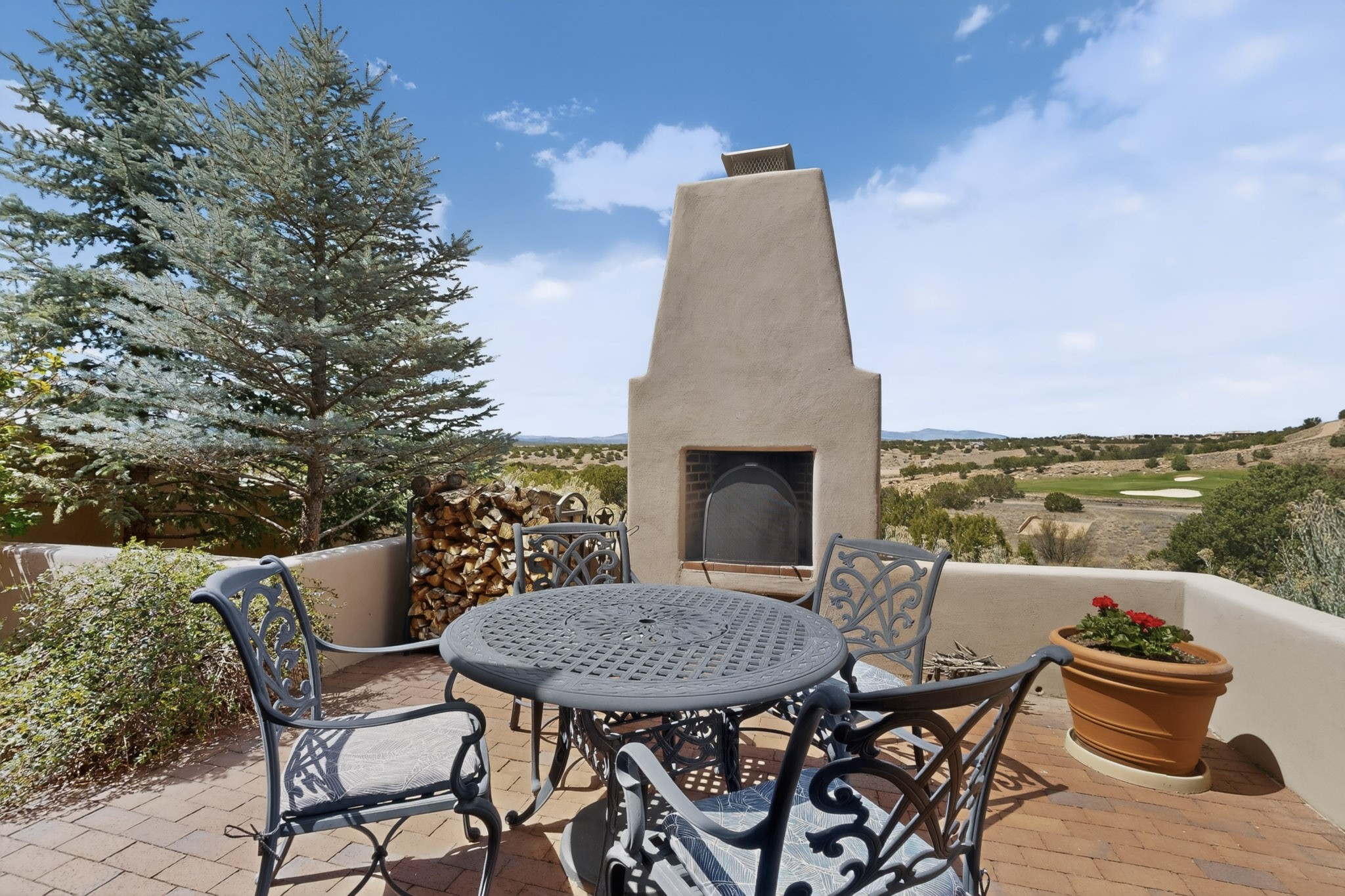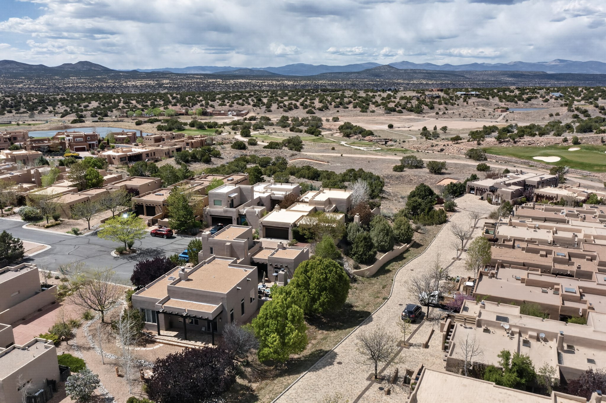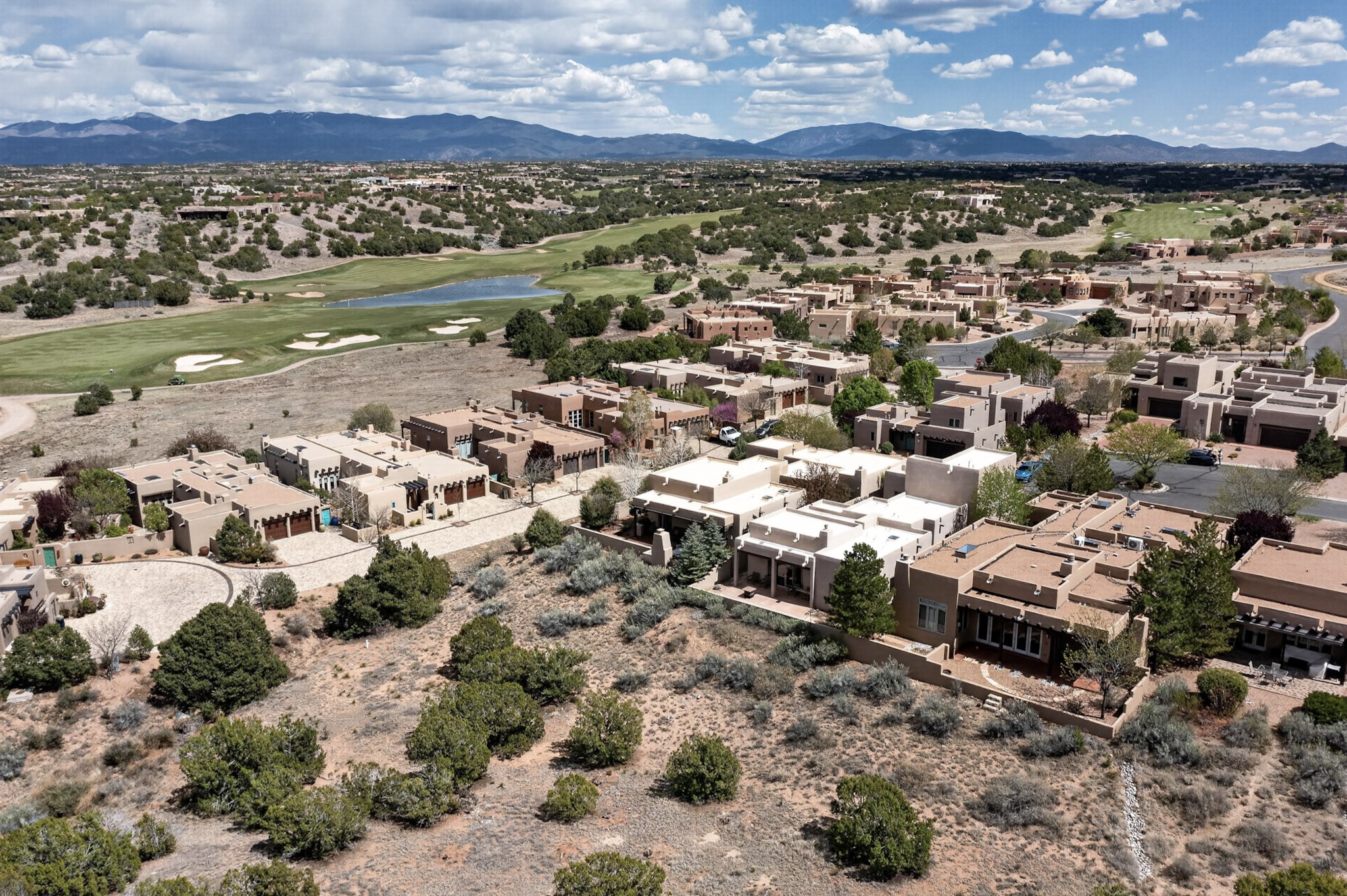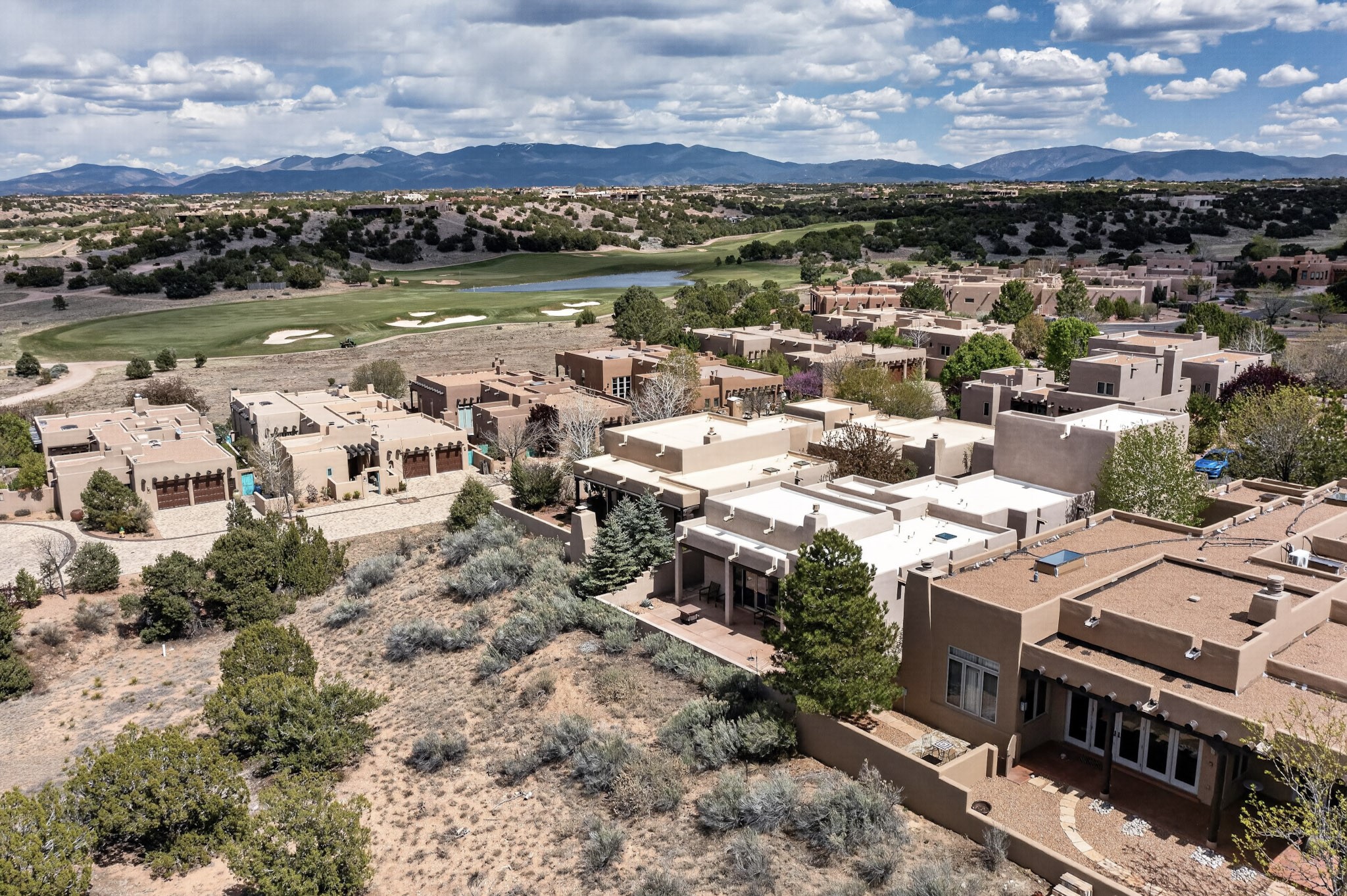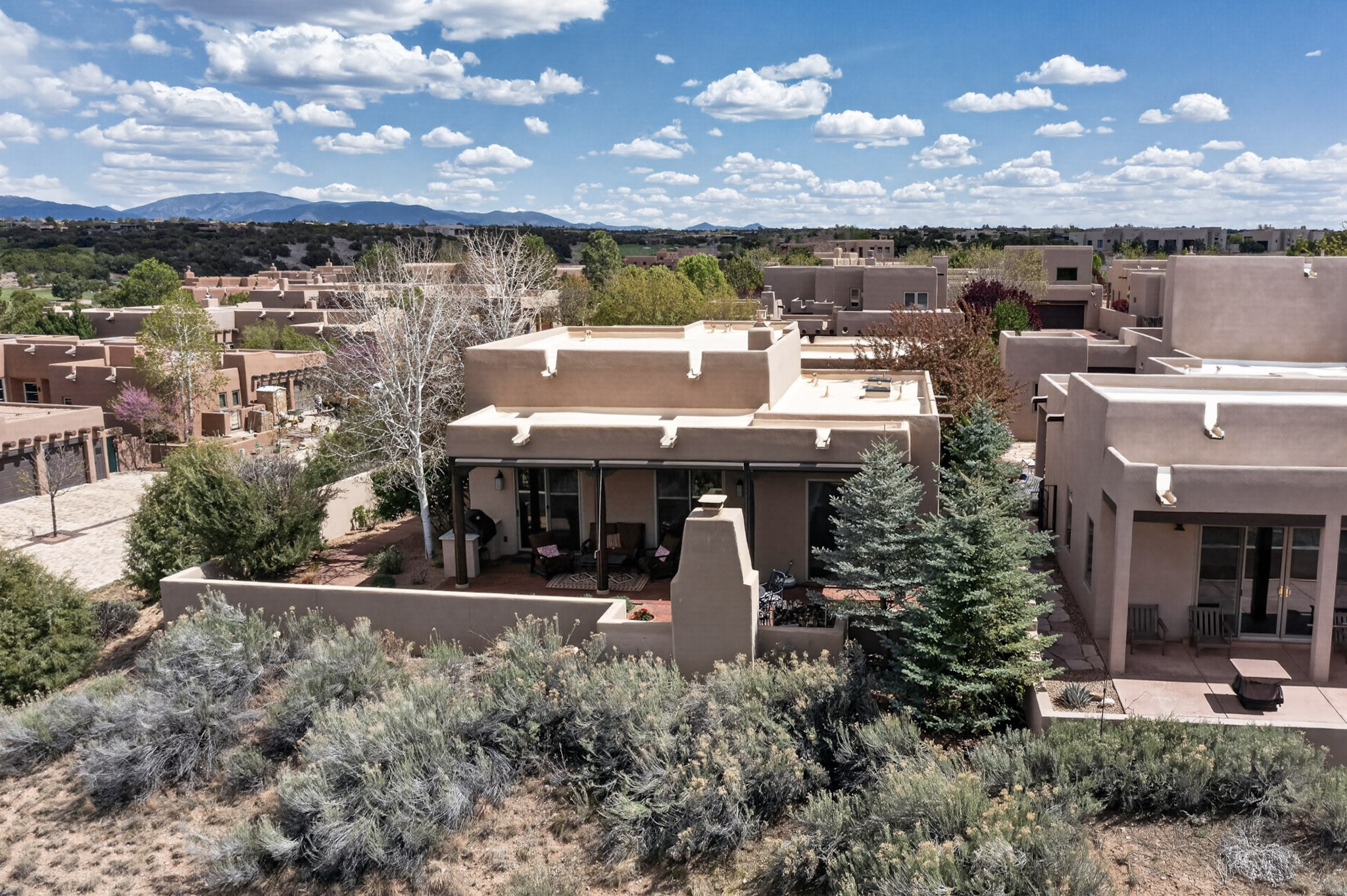 Experience refined living in this stunning three bedroom three bath residence with a private Casita perfectly positioned along the golf course at Las Campanas and showcasing sweeping elevated views of the Jemez and Sangre de Cristo mountains. Designed for both comfort and elegance this home features beautiful outdoor living spaces with classic brick flooring mature plants and trees with flagstone pathways and two outdoor wood-burning fireplaces creating the perfect setting for relaxing evenings or entertaining while taking in the breathtaking scenery. Enter through the striking double doors into a warm and inviting interior. The spacious primary suite offers a peaceful retreat with a walk in closet a generous en suite bath and a private patio ideal for enjoying tranquil surroundings. The open concept kitchen flows effortlessly into the dining and living areas where large windows frame the picturesque golf course views and fill the home with natural light. Recent upgrades add modern conveniences including new tankless water heaters, a new kitchen vent hood, epoxy flooring in the garage, instant hot water faucet at kitchen sink, and a new EV charger. This exceptional "Lock & Leave" Las Campanas property blends luxury, comfort, and spectacular views offering the perfect Santa Fe lifestyle both indoors and out.